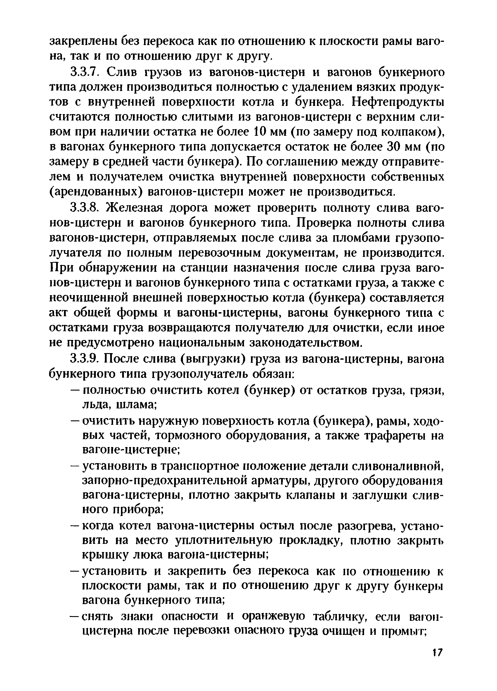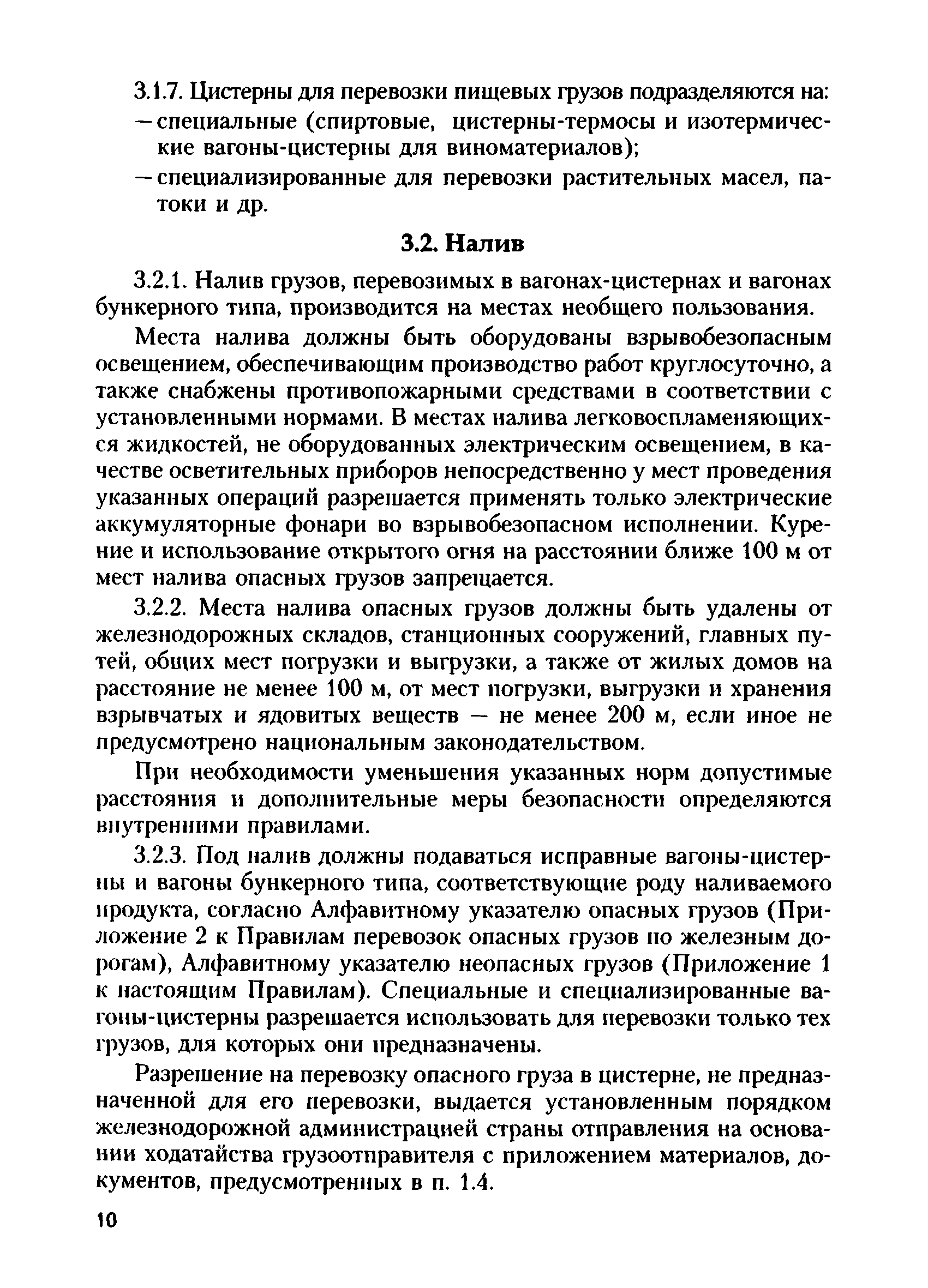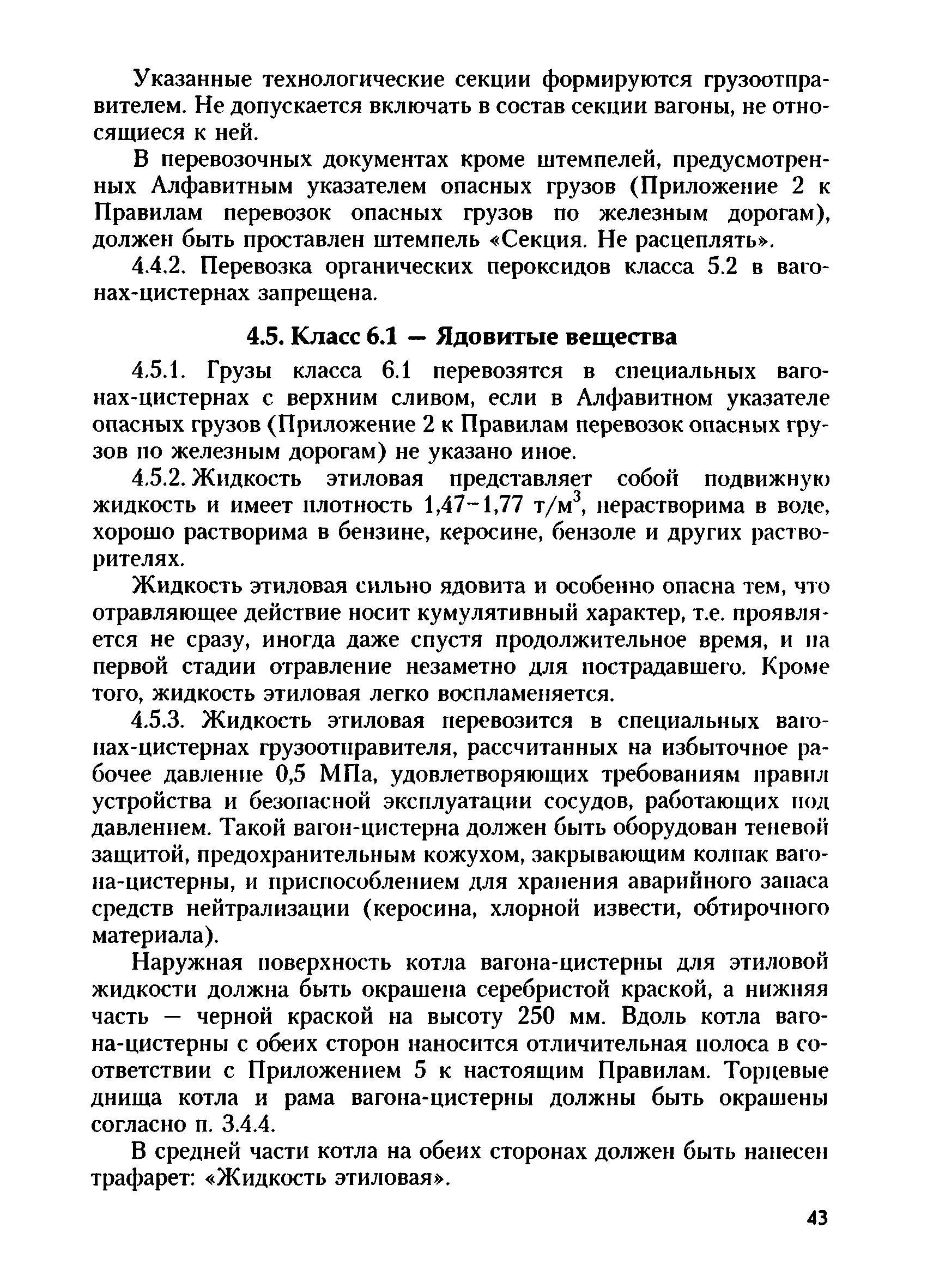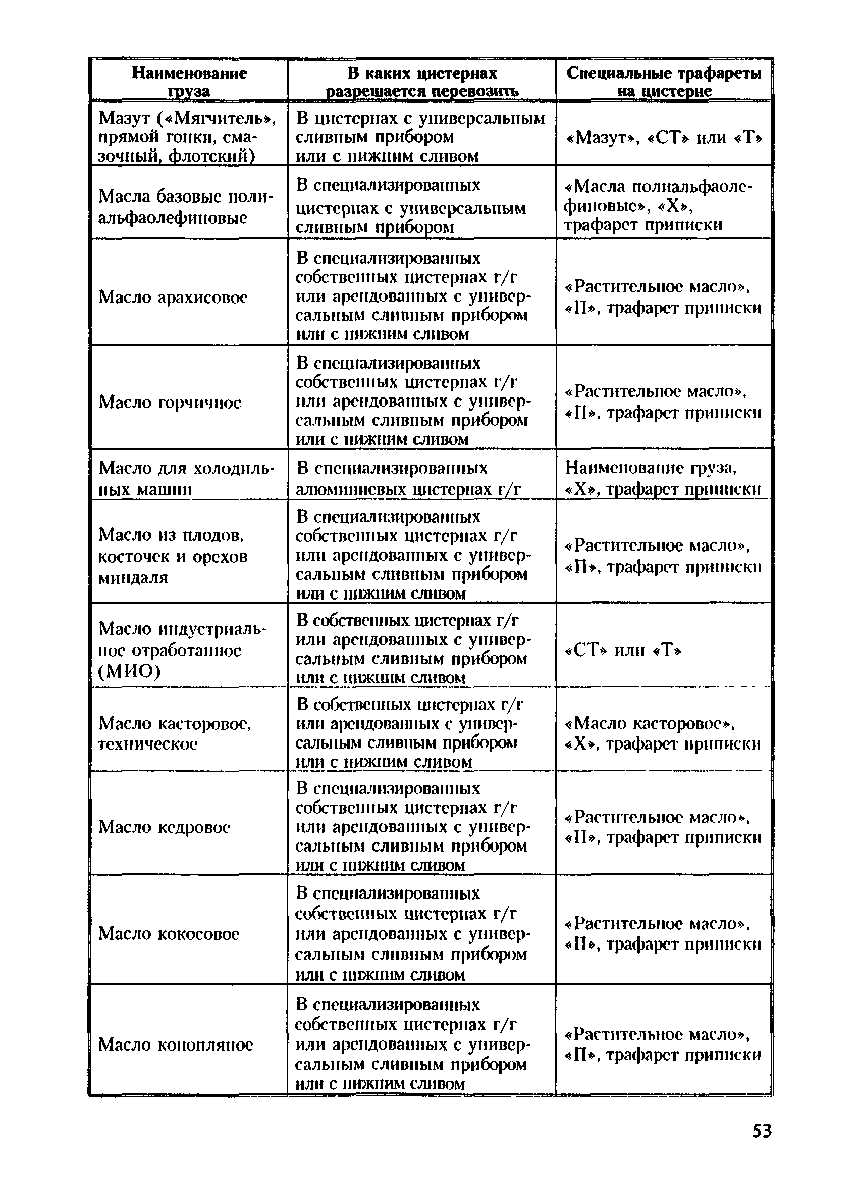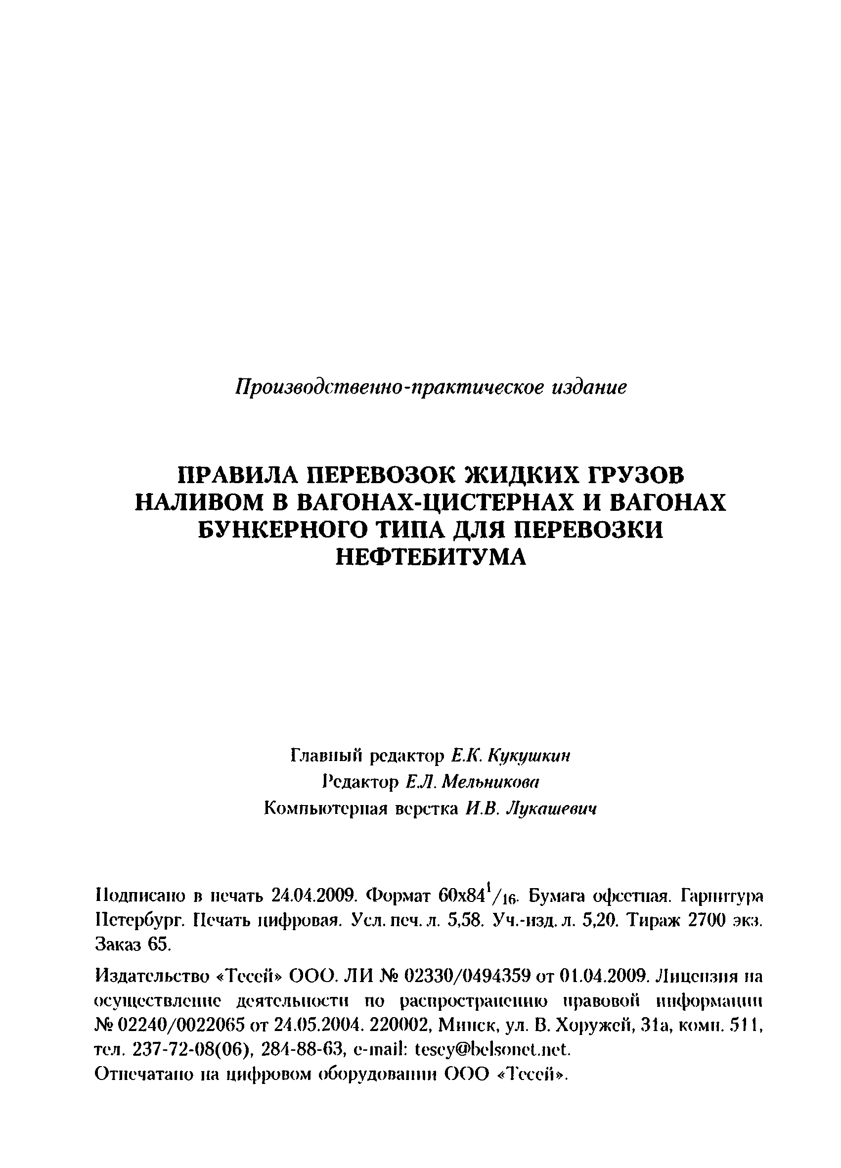 | Оглавление: | 1. Общие положения 2. Требования к вагонам-цистернам и вагонам бункерного типа для перевозки нефтебитума 3. Предписания по эксплуатации 3.1. Использование вагонов-цистерн и вагонов бункерного типа 3.2. Налив 3.3. Слив 3.4. Маркировка 3.5. Оформление перевозочных документов 4. Специальные условия перевозок опасных грузов наливом в вагонах-цистернах 4.1. Класс 2 - Газы 4.2. Класс 3 - Легковоспламеняющиеся жидкости 4.3. Класс 4.1 - Легковоспламеняющиеся твердые вещества 4.3. Класс 4.2 - Самовозгорающиеся вещества 4.3. Класс 4.3 - Вещества, выделяющие воспламеняющиеся газы при взаимодействии с водой 4.4. Класс 5.1 - Окисляющие вещества 4.4. Класс 5.2 - Органические пероксиды 4.5. Класс 6.1 - Ядовитые вещества 4.6. Класс 8 - Едкие и коррозионные вещества 4.7. Класс 9 - Прочие и опасные грузы 5. Порядок действий при обнаружении неисправности вагонов-цистерн 6. Дополнительные условия перевозки пищевых грузов наливом в вагонах-цистернах Приложение 1. Алфавитный указатель неопасных грузов, допущенных к перевозке наливом в вагонах-цистернах и вагонах бункерного типа Приложение 2. Свидетельство о техническом состоянии вагона-цистерны для перевозки опасного груза Приложение 3. Требования ГОСТ 1510-84 «Нефть и нефтепродукты. Маркировка, упаковка, транспортирование и хранение» к подготовке вагонов-цистерн под налив нефтепродуктов Приложение 4. Порядок определения массы нефти и нефтепродуктов в вагонах-цистернах расчетным способом Приложение 5. Отличительные полосы, наносимые на вагоны-цистерны Приложение 6. Формы пересылочных накладных ГУ-27дс, ГУ-27дт Приложение 7. Порядок проверки сохранности и определения размера недостачи спирта этилового ректификованного |