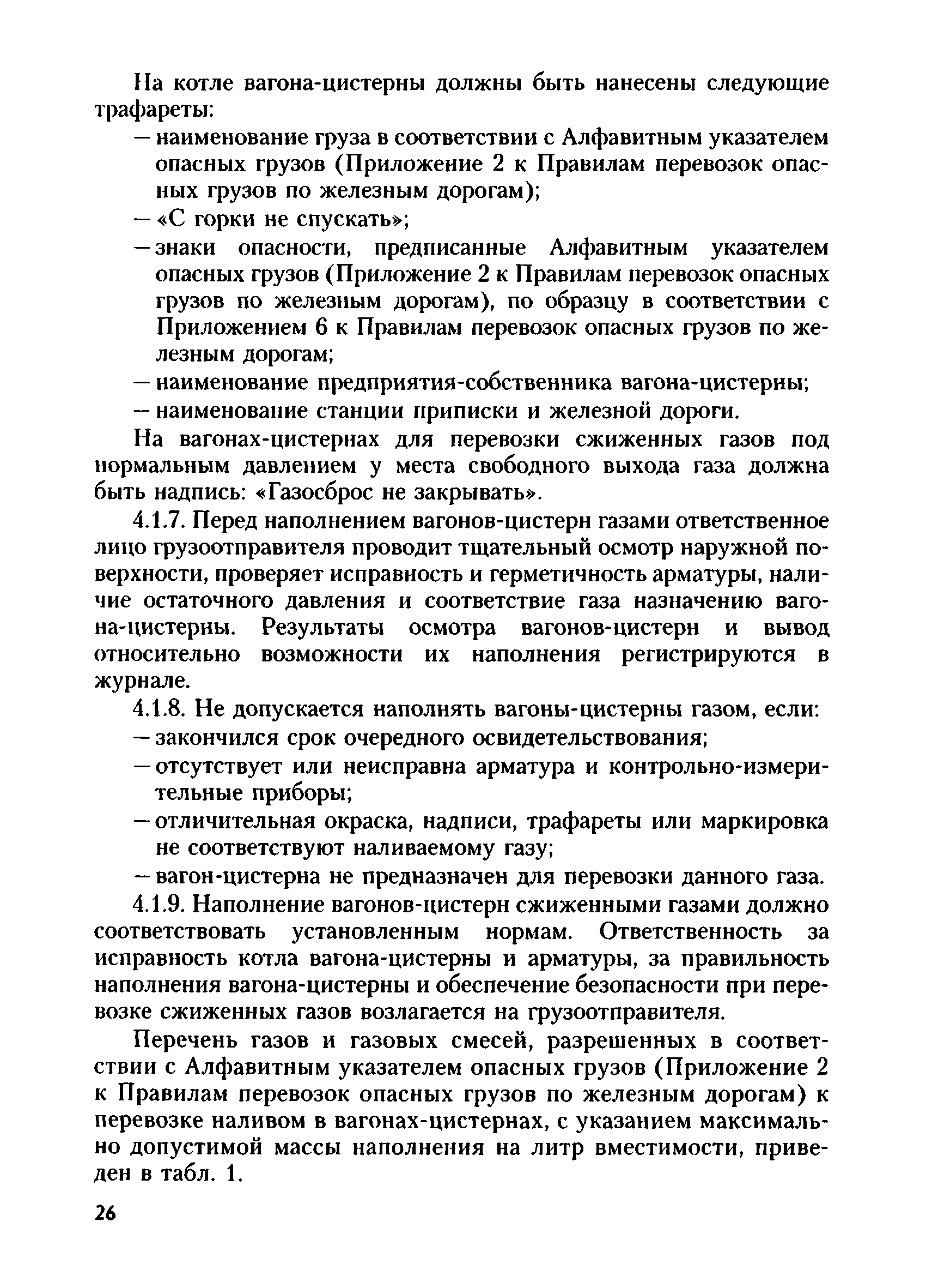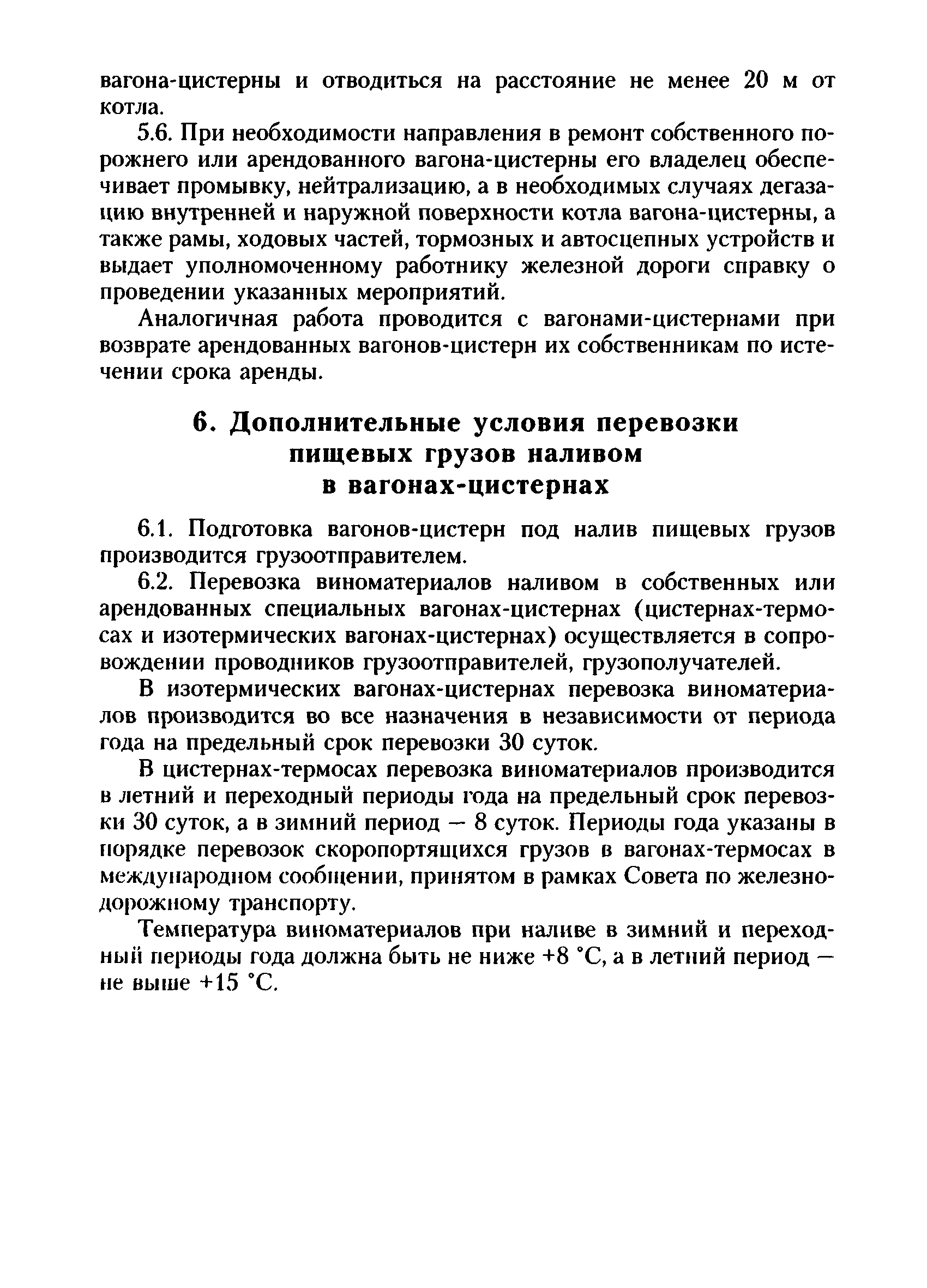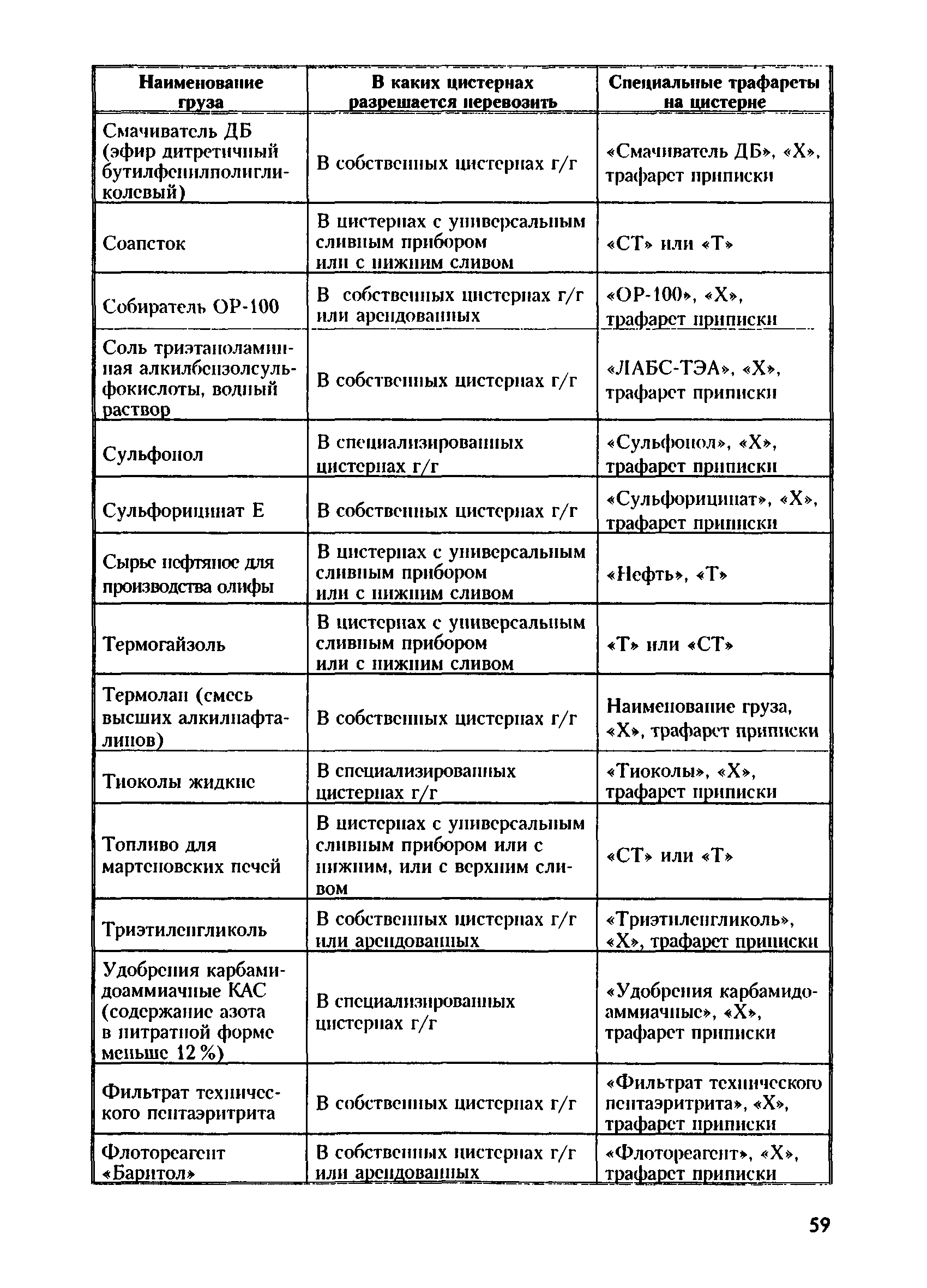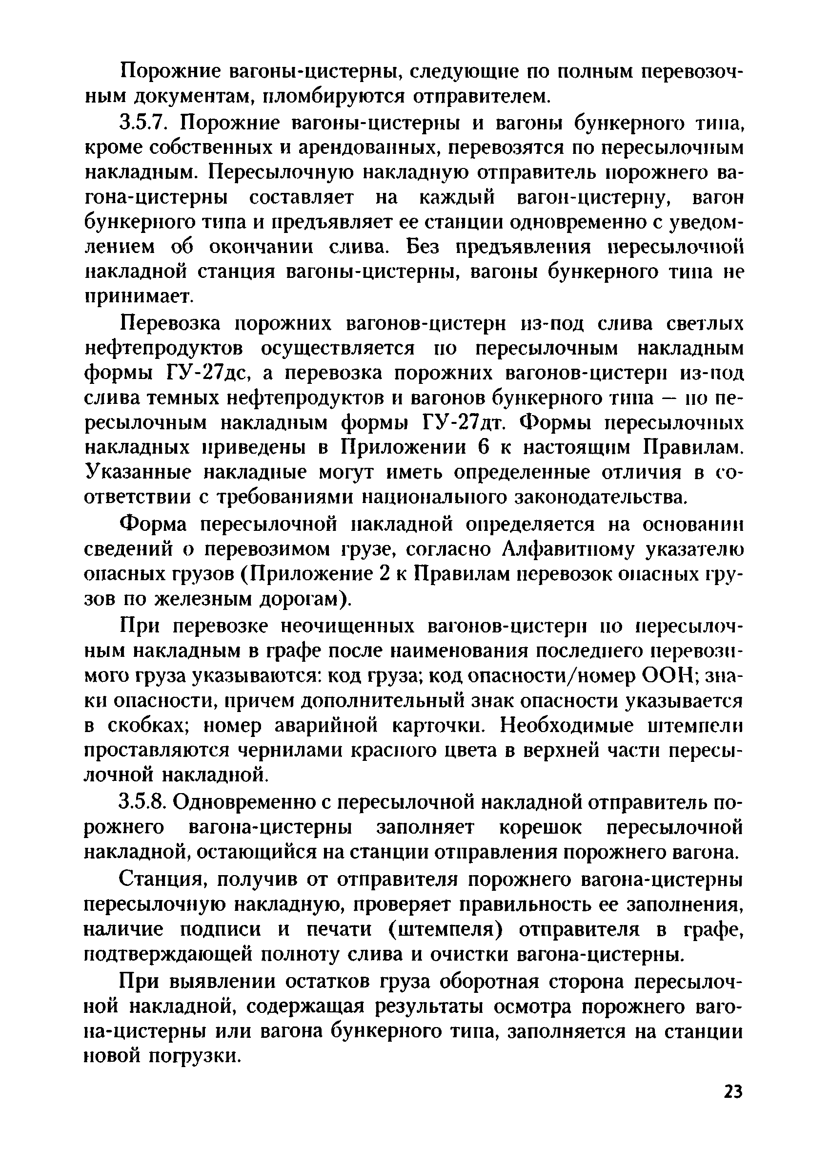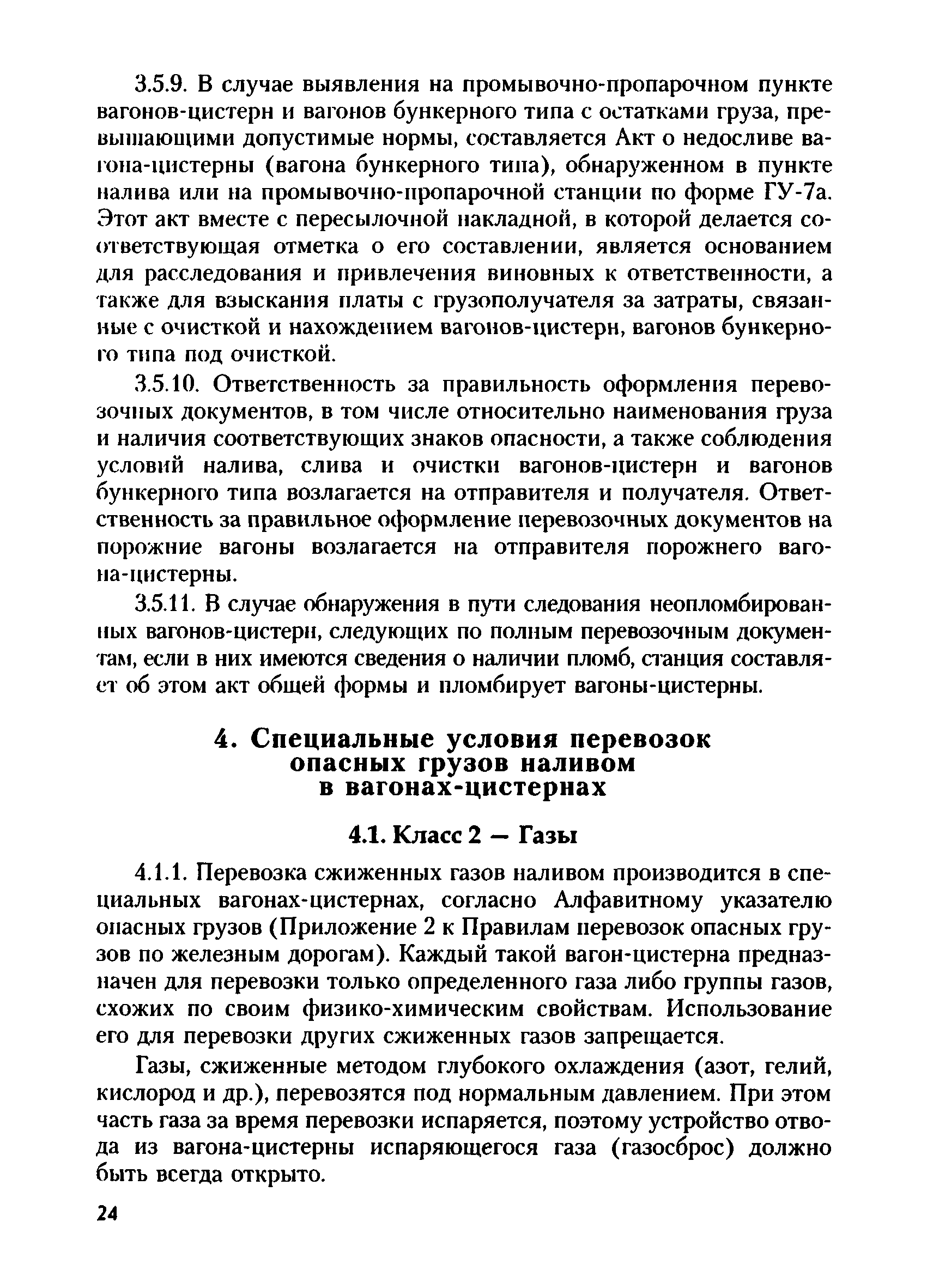 | Оглавление: | 1. Общие положения 2. Требования к вагонам-цистернам и вагонам бункерного типа для перевозки нефтебитума 3. Предписания по эксплуатации 3.1. Использование вагонов-цистерн и вагонов бункерного типа 3.2. Налив 3.3. Слив 3.4. Маркировка 3.5. Оформление перевозочных документов 4. Специальные условия перевозок опасных грузов наливом в вагонах-цистернах 4.1. Класс 2 - Газы 4.2. Класс 3 - Легковоспламеняющиеся жидкости 4.3. Класс 4.1 - Легковоспламеняющиеся твердые вещества 4.3. Класс 4.2 - Самовозгорающиеся вещества 4.3. Класс 4.3 - Вещества, выделяющие воспламеняющиеся газы при взаимодействии с водой 4.4. Класс 5.1 - Окисляющие вещества 4.4. Класс 5.2 - Органические пероксиды 4.5. Класс 6.1 - Ядовитые вещества 4.6. Класс 8 - Едкие и коррозионные вещества 4.7. Класс 9 - Прочие и опасные грузы 5. Порядок действий при обнаружении неисправности вагонов-цистерн 6. Дополнительные условия перевозки пищевых грузов наливом в вагонах-цистернах Приложение 1. Алфавитный указатель неопасных грузов, допущенных к перевозке наливом в вагонах-цистернах и вагонах бункерного типа Приложение 2. Свидетельство о техническом состоянии вагона-цистерны для перевозки опасного груза Приложение 3. Требования ГОСТ 1510-84 «Нефть и нефтепродукты. Маркировка, упаковка, транспортирование и хранение» к подготовке вагонов-цистерн под налив нефтепродуктов Приложение 4. Порядок определения массы нефти и нефтепродуктов в вагонах-цистернах расчетным способом Приложение 5. Отличительные полосы, наносимые на вагоны-цистерны Приложение 6. Формы пересылочных накладных ГУ-27дс, ГУ-27дт Приложение 7. Порядок проверки сохранности и определения размера недостачи спирта этилового ректификованного |