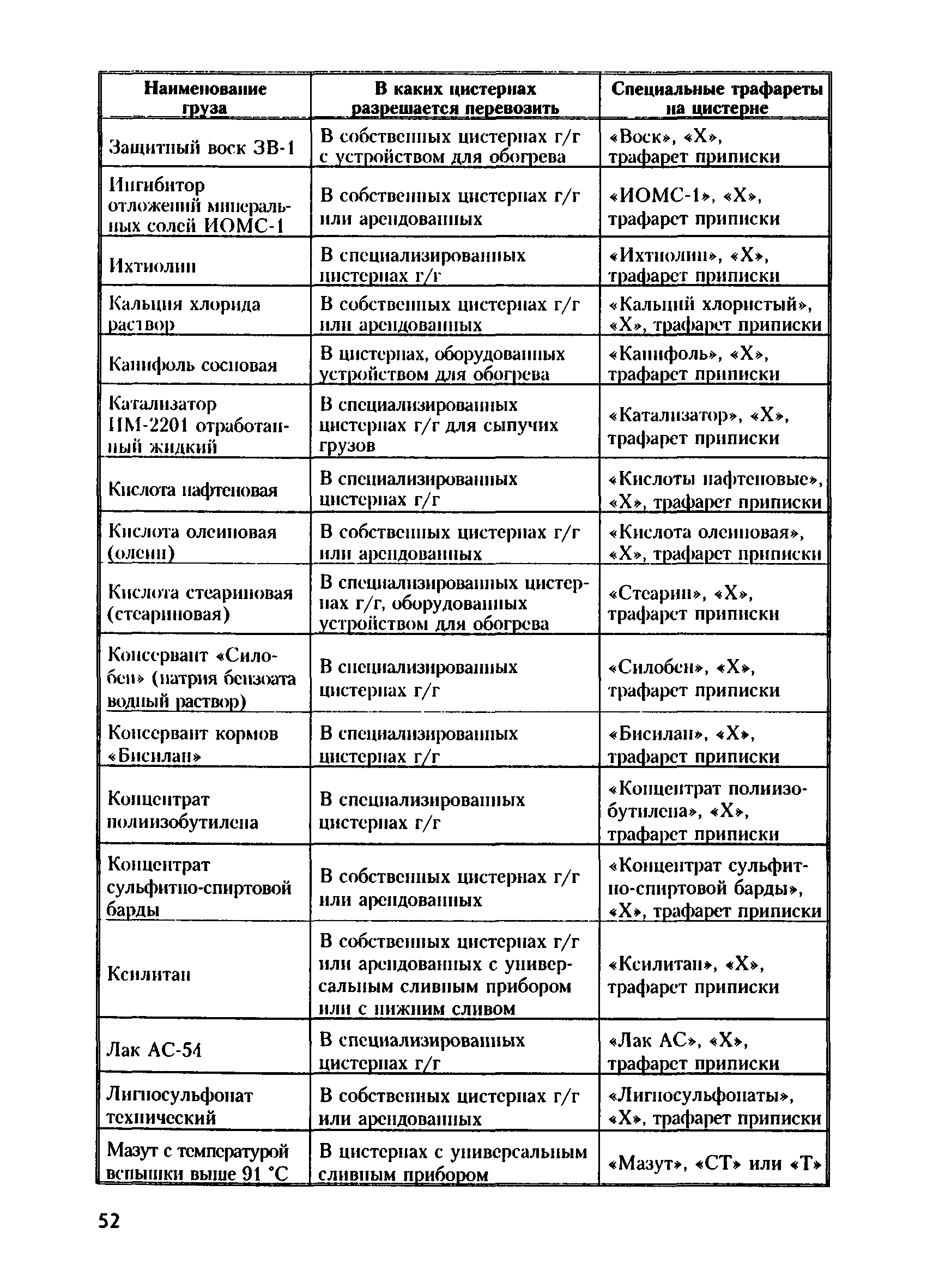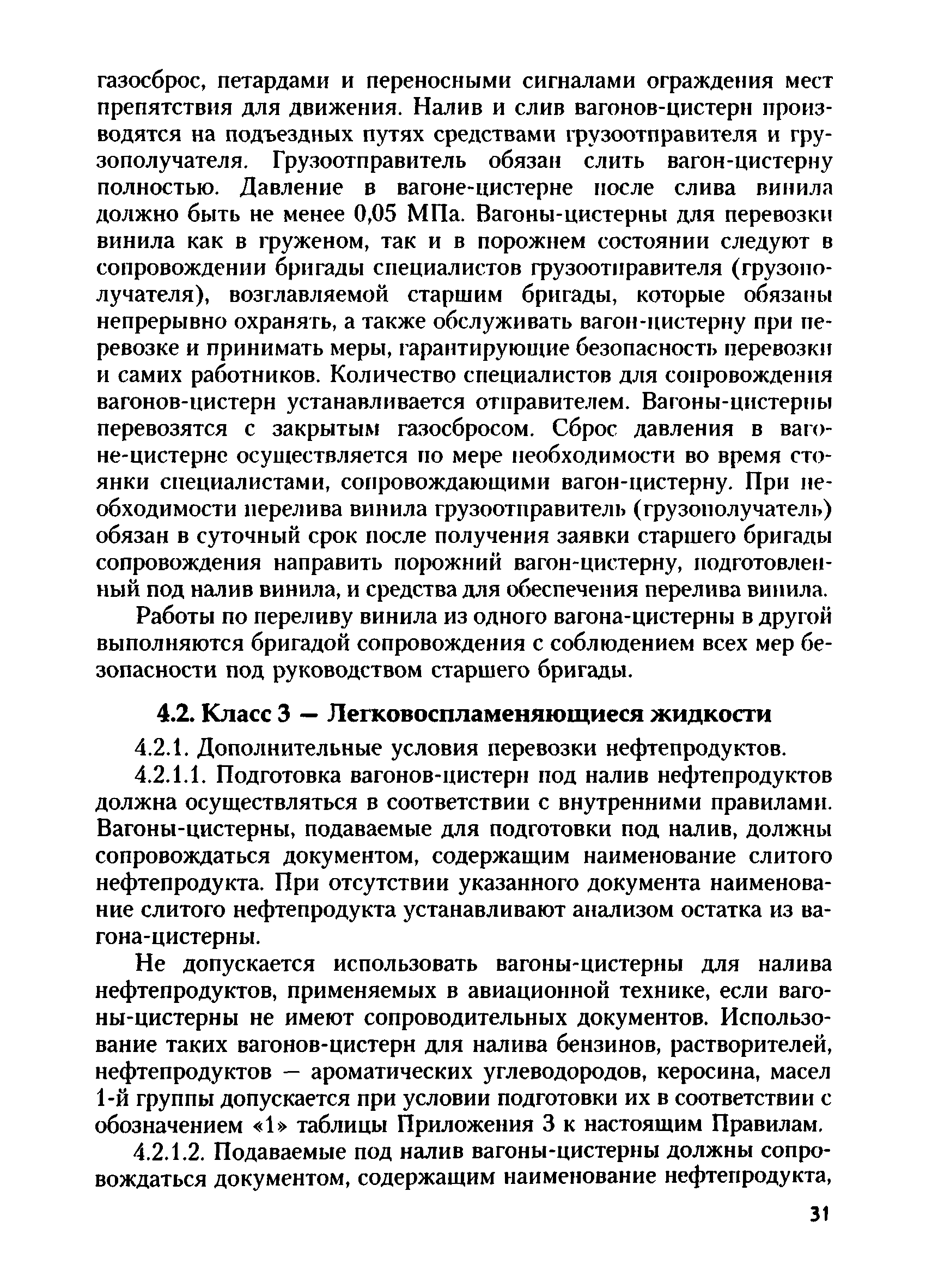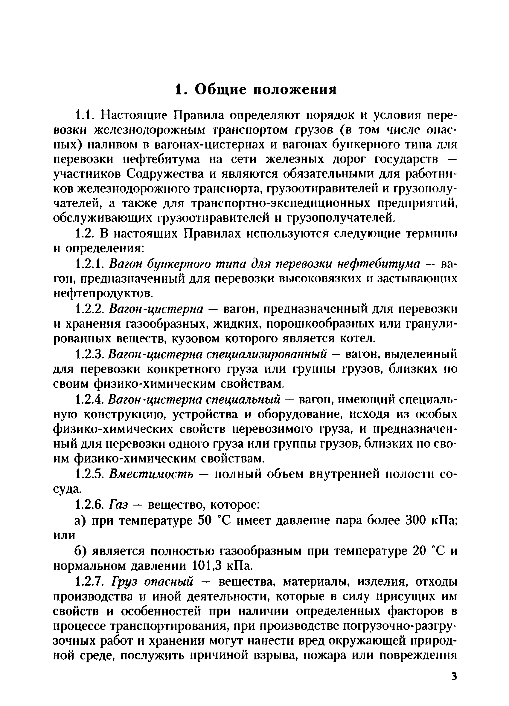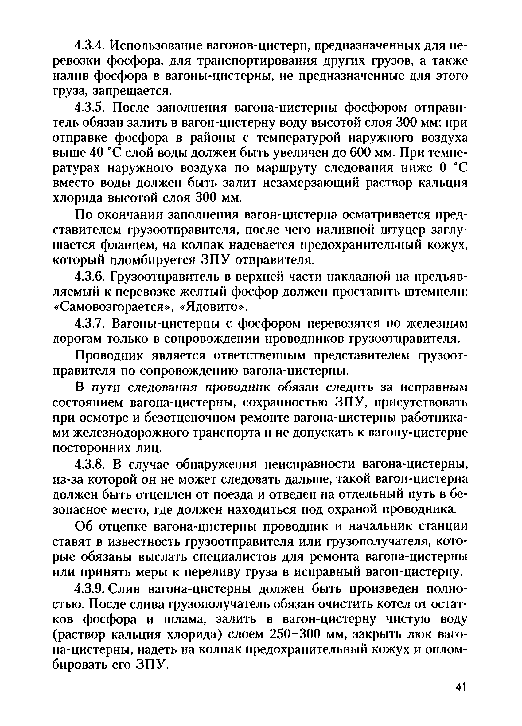 | Оглавление: | 1. Общие положения 2. Требования к вагонам-цистернам и вагонам бункерного типа для перевозки нефтебитума 3. Предписания по эксплуатации 3.1. Использование вагонов-цистерн и вагонов бункерного типа 3.2. Налив 3.3. Слив 3.4. Маркировка 3.5. Оформление перевозочных документов 4. Специальные условия перевозок опасных грузов наливом в вагонах-цистернах 4.1. Класс 2 - Газы 4.2. Класс 3 - Легковоспламеняющиеся жидкости 4.3. Класс 4.1 - Легковоспламеняющиеся твердые вещества 4.3. Класс 4.2 - Самовозгорающиеся вещества 4.3. Класс 4.3 - Вещества, выделяющие воспламеняющиеся газы при взаимодействии с водой 4.4. Класс 5.1 - Окисляющие вещества 4.4. Класс 5.2 - Органические пероксиды 4.5. Класс 6.1 - Ядовитые вещества 4.6. Класс 8 - Едкие и коррозионные вещества 4.7. Класс 9 - Прочие и опасные грузы 5. Порядок действий при обнаружении неисправности вагонов-цистерн 6. Дополнительные условия перевозки пищевых грузов наливом в вагонах-цистернах Приложение 1. Алфавитный указатель неопасных грузов, допущенных к перевозке наливом в вагонах-цистернах и вагонах бункерного типа Приложение 2. Свидетельство о техническом состоянии вагона-цистерны для перевозки опасного груза Приложение 3. Требования ГОСТ 1510-84 «Нефть и нефтепродукты. Маркировка, упаковка, транспортирование и хранение» к подготовке вагонов-цистерн под налив нефтепродуктов Приложение 4. Порядок определения массы нефти и нефтепродуктов в вагонах-цистернах расчетным способом Приложение 5. Отличительные полосы, наносимые на вагоны-цистерны Приложение 6. Формы пересылочных накладных ГУ-27дс, ГУ-27дт Приложение 7. Порядок проверки сохранности и определения размера недостачи спирта этилового ректификованного |