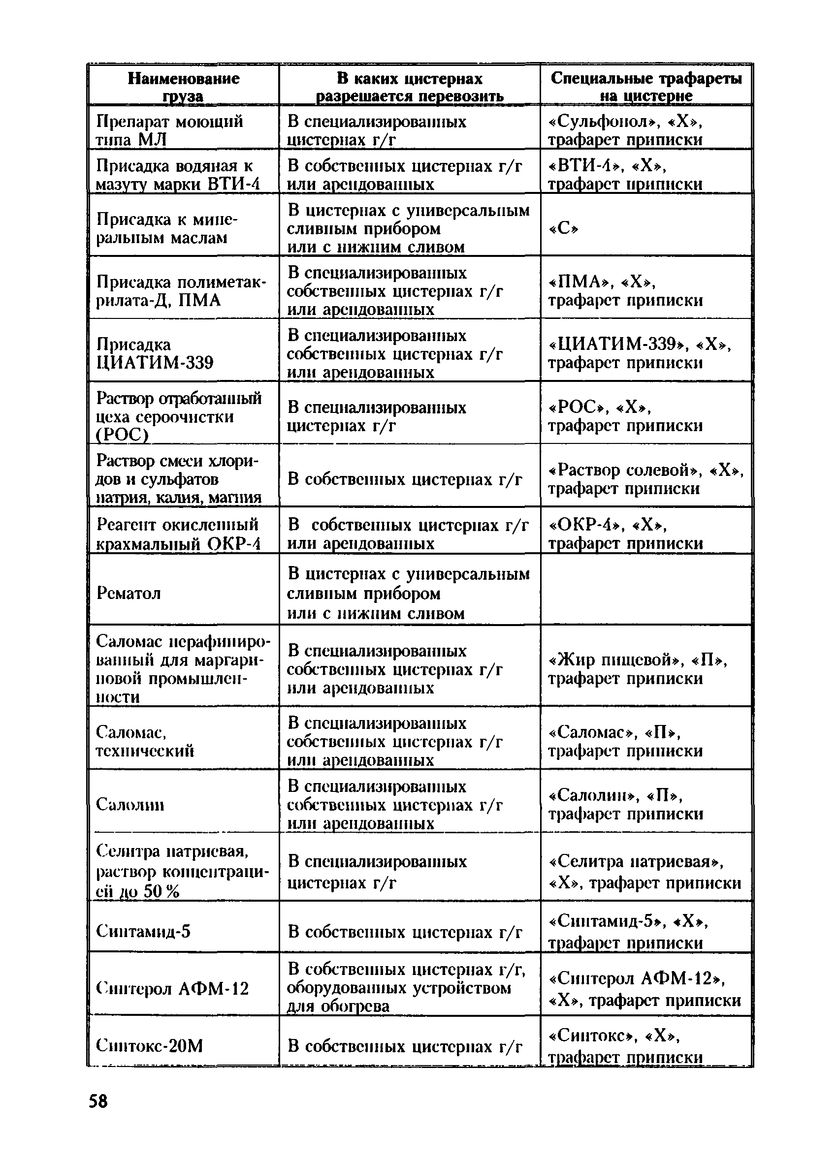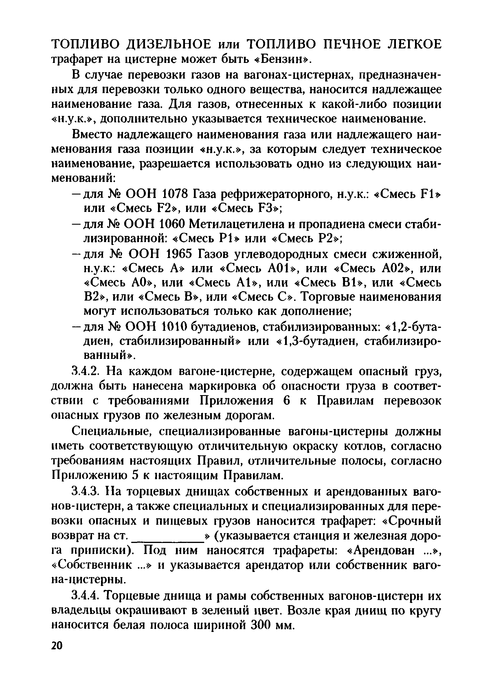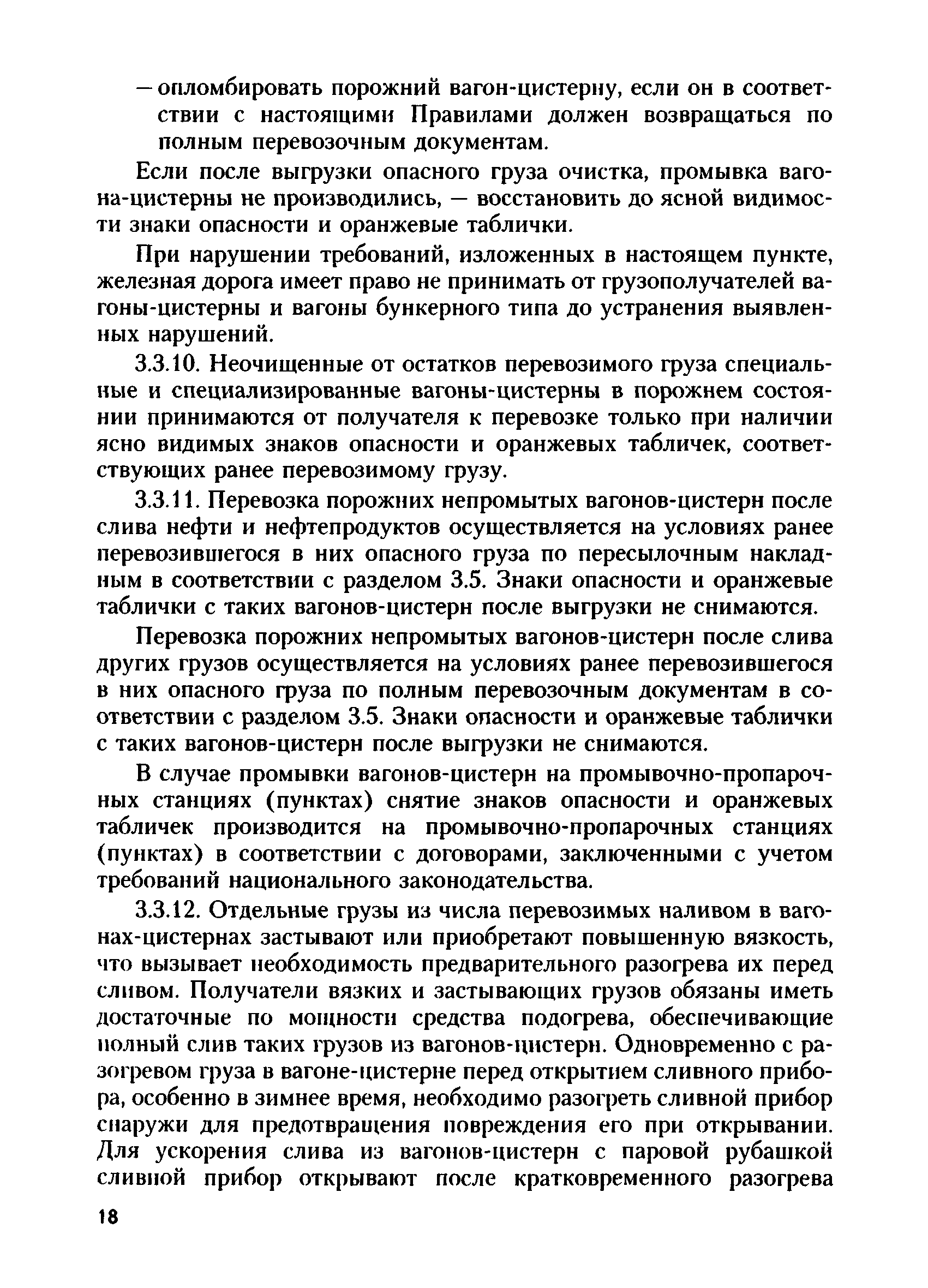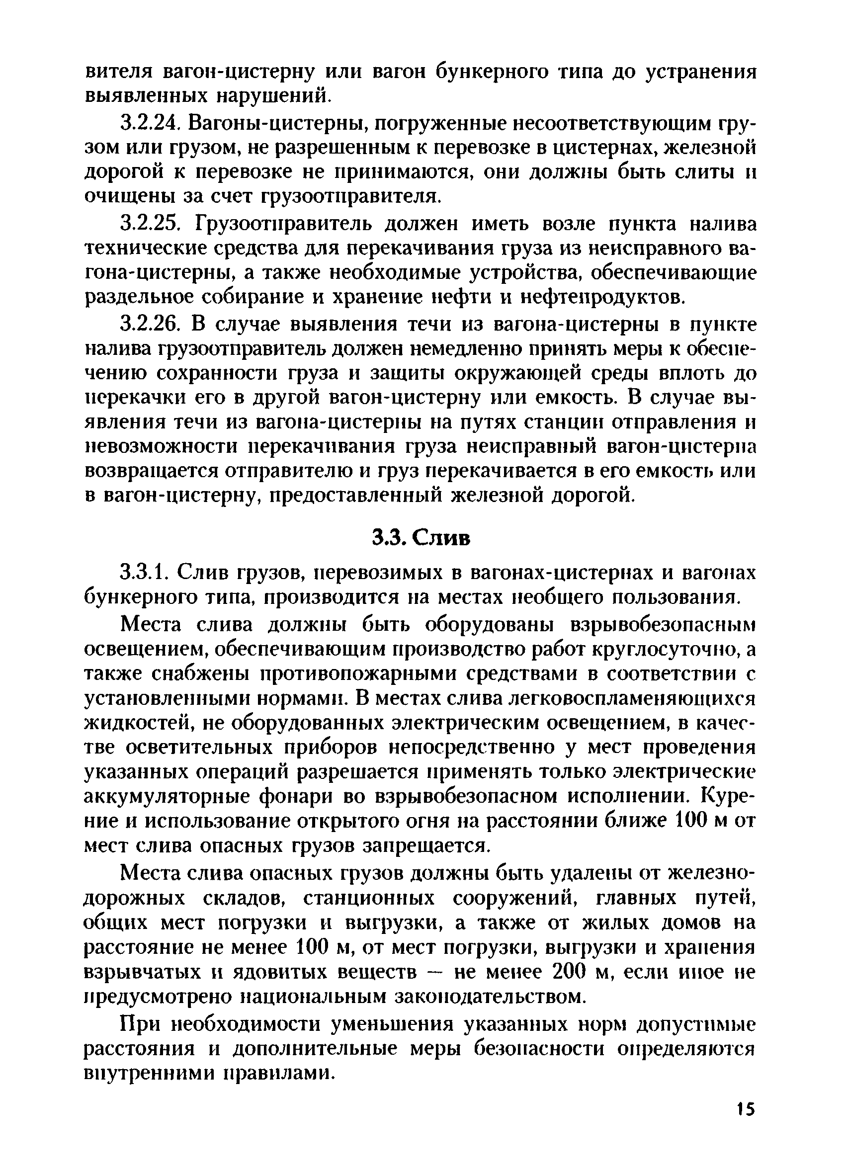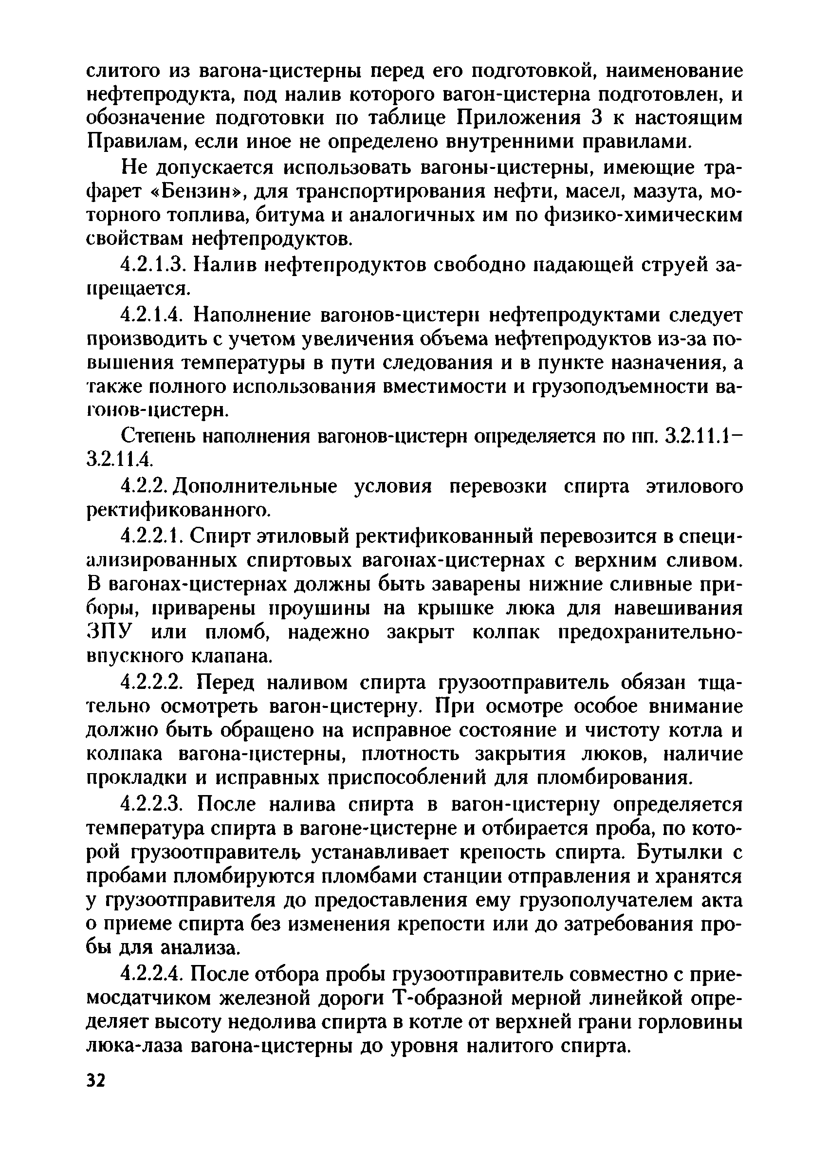 | Оглавление: | 1. Общие положения 2. Требования к вагонам-цистернам и вагонам бункерного типа для перевозки нефтебитума 3. Предписания по эксплуатации 3.1. Использование вагонов-цистерн и вагонов бункерного типа 3.2. Налив 3.3. Слив 3.4. Маркировка 3.5. Оформление перевозочных документов 4. Специальные условия перевозок опасных грузов наливом в вагонах-цистернах 4.1. Класс 2 - Газы 4.2. Класс 3 - Легковоспламеняющиеся жидкости 4.3. Класс 4.1 - Легковоспламеняющиеся твердые вещества 4.3. Класс 4.2 - Самовозгорающиеся вещества 4.3. Класс 4.3 - Вещества, выделяющие воспламеняющиеся газы при взаимодействии с водой 4.4. Класс 5.1 - Окисляющие вещества 4.4. Класс 5.2 - Органические пероксиды 4.5. Класс 6.1 - Ядовитые вещества 4.6. Класс 8 - Едкие и коррозионные вещества 4.7. Класс 9 - Прочие и опасные грузы 5. Порядок действий при обнаружении неисправности вагонов-цистерн 6. Дополнительные условия перевозки пищевых грузов наливом в вагонах-цистернах Приложение 1. Алфавитный указатель неопасных грузов, допущенных к перевозке наливом в вагонах-цистернах и вагонах бункерного типа Приложение 2. Свидетельство о техническом состоянии вагона-цистерны для перевозки опасного груза Приложение 3. Требования ГОСТ 1510-84 «Нефть и нефтепродукты. Маркировка, упаковка, транспортирование и хранение» к подготовке вагонов-цистерн под налив нефтепродуктов Приложение 4. Порядок определения массы нефти и нефтепродуктов в вагонах-цистернах расчетным способом Приложение 5. Отличительные полосы, наносимые на вагоны-цистерны Приложение 6. Формы пересылочных накладных ГУ-27дс, ГУ-27дт Приложение 7. Порядок проверки сохранности и определения размера недостачи спирта этилового ректификованного |