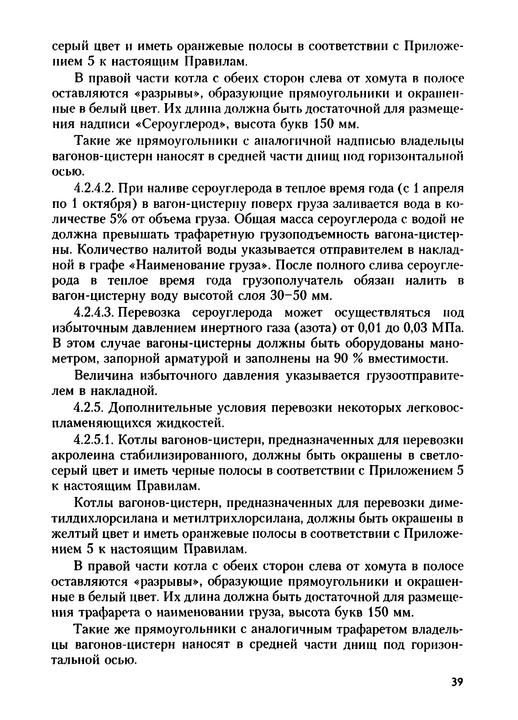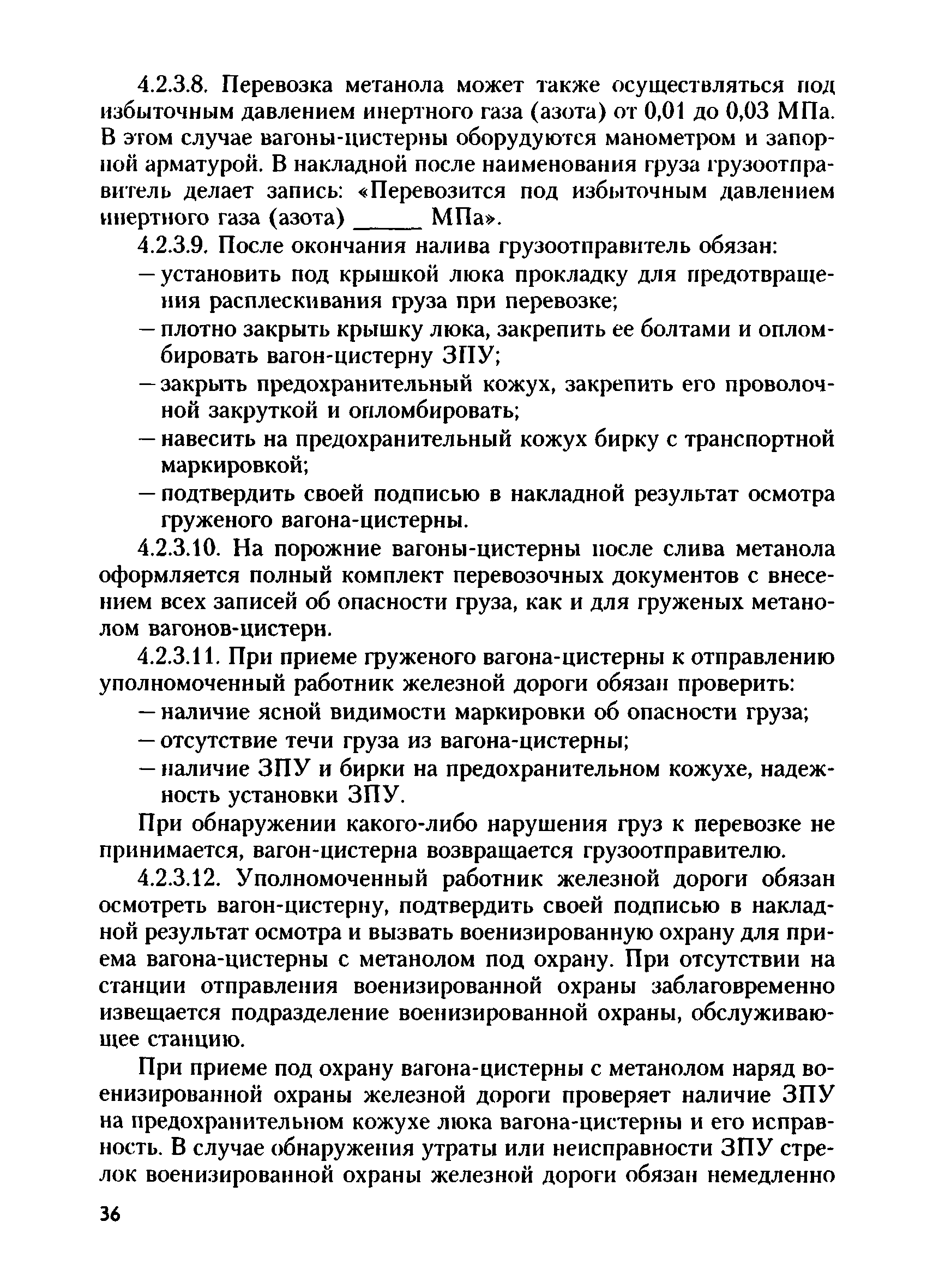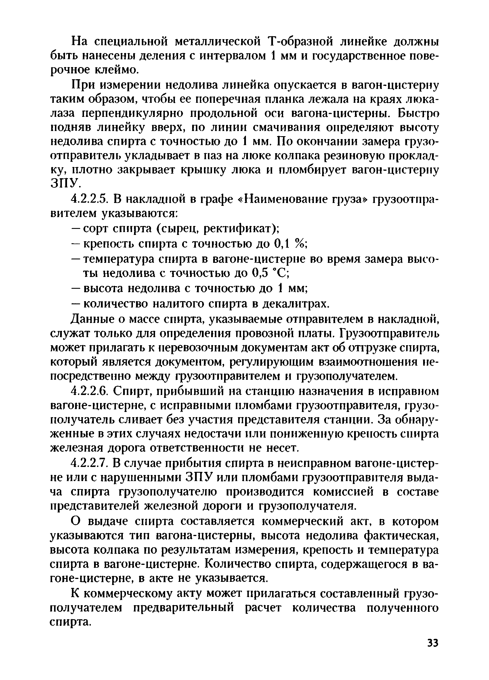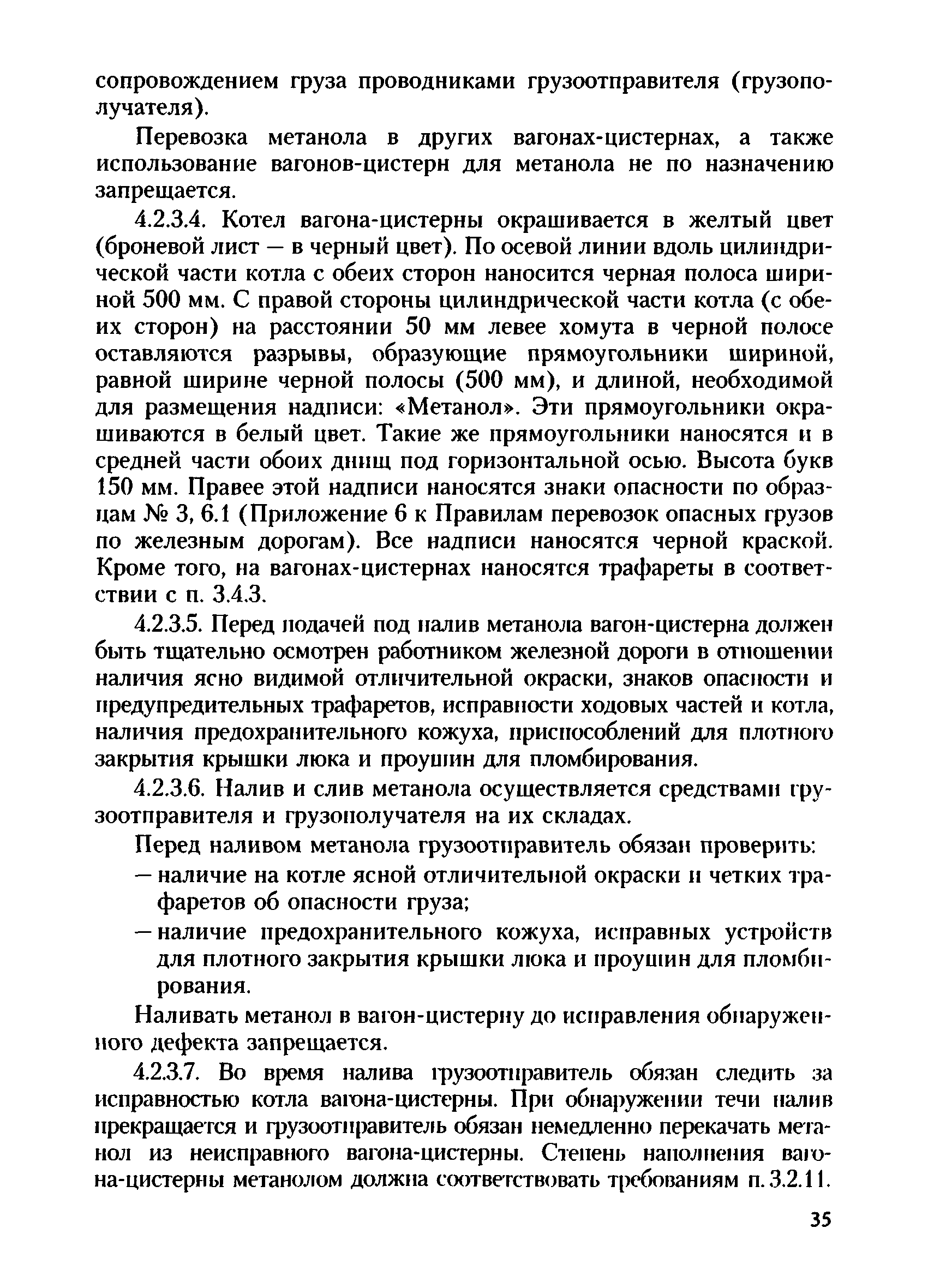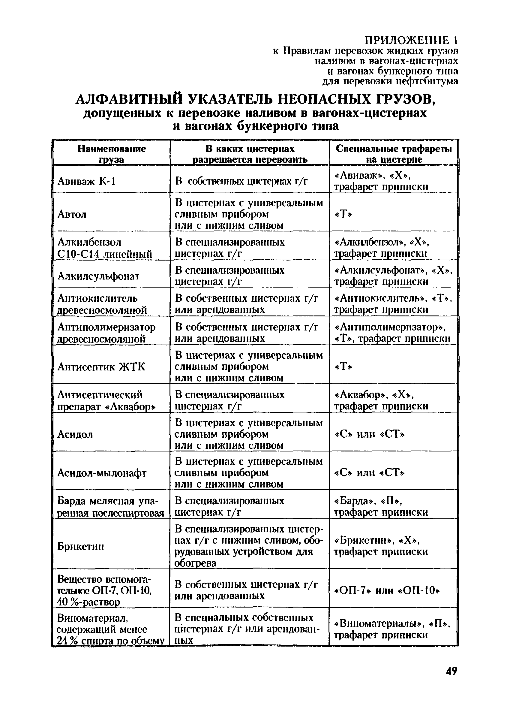 | Оглавление: | 1. Общие положения 2. Требования к вагонам-цистернам и вагонам бункерного типа для перевозки нефтебитума 3. Предписания по эксплуатации 3.1. Использование вагонов-цистерн и вагонов бункерного типа 3.2. Налив 3.3. Слив 3.4. Маркировка 3.5. Оформление перевозочных документов 4. Специальные условия перевозок опасных грузов наливом в вагонах-цистернах 4.1. Класс 2 - Газы 4.2. Класс 3 - Легковоспламеняющиеся жидкости 4.3. Класс 4.1 - Легковоспламеняющиеся твердые вещества 4.3. Класс 4.2 - Самовозгорающиеся вещества 4.3. Класс 4.3 - Вещества, выделяющие воспламеняющиеся газы при взаимодействии с водой 4.4. Класс 5.1 - Окисляющие вещества 4.4. Класс 5.2 - Органические пероксиды 4.5. Класс 6.1 - Ядовитые вещества 4.6. Класс 8 - Едкие и коррозионные вещества 4.7. Класс 9 - Прочие и опасные грузы 5. Порядок действий при обнаружении неисправности вагонов-цистерн 6. Дополнительные условия перевозки пищевых грузов наливом в вагонах-цистернах Приложение 1. Алфавитный указатель неопасных грузов, допущенных к перевозке наливом в вагонах-цистернах и вагонах бункерного типа Приложение 2. Свидетельство о техническом состоянии вагона-цистерны для перевозки опасного груза Приложение 3. Требования ГОСТ 1510-84 «Нефть и нефтепродукты. Маркировка, упаковка, транспортирование и хранение» к подготовке вагонов-цистерн под налив нефтепродуктов Приложение 4. Порядок определения массы нефти и нефтепродуктов в вагонах-цистернах расчетным способом Приложение 5. Отличительные полосы, наносимые на вагоны-цистерны Приложение 6. Формы пересылочных накладных ГУ-27дс, ГУ-27дт Приложение 7. Порядок проверки сохранности и определения размера недостачи спирта этилового ректификованного |