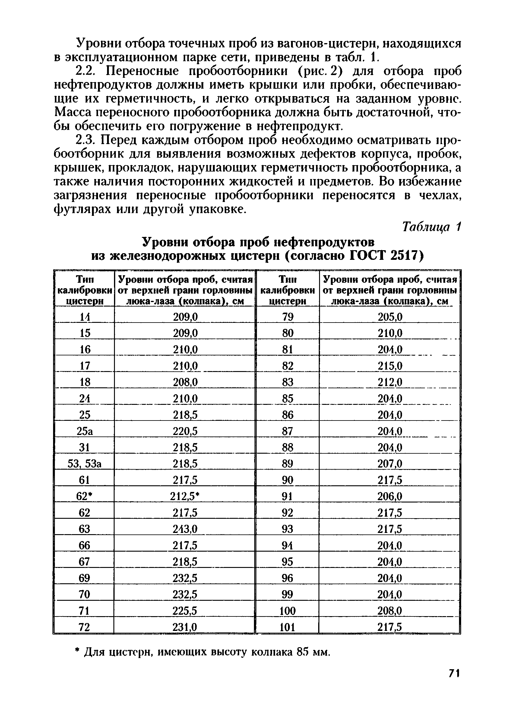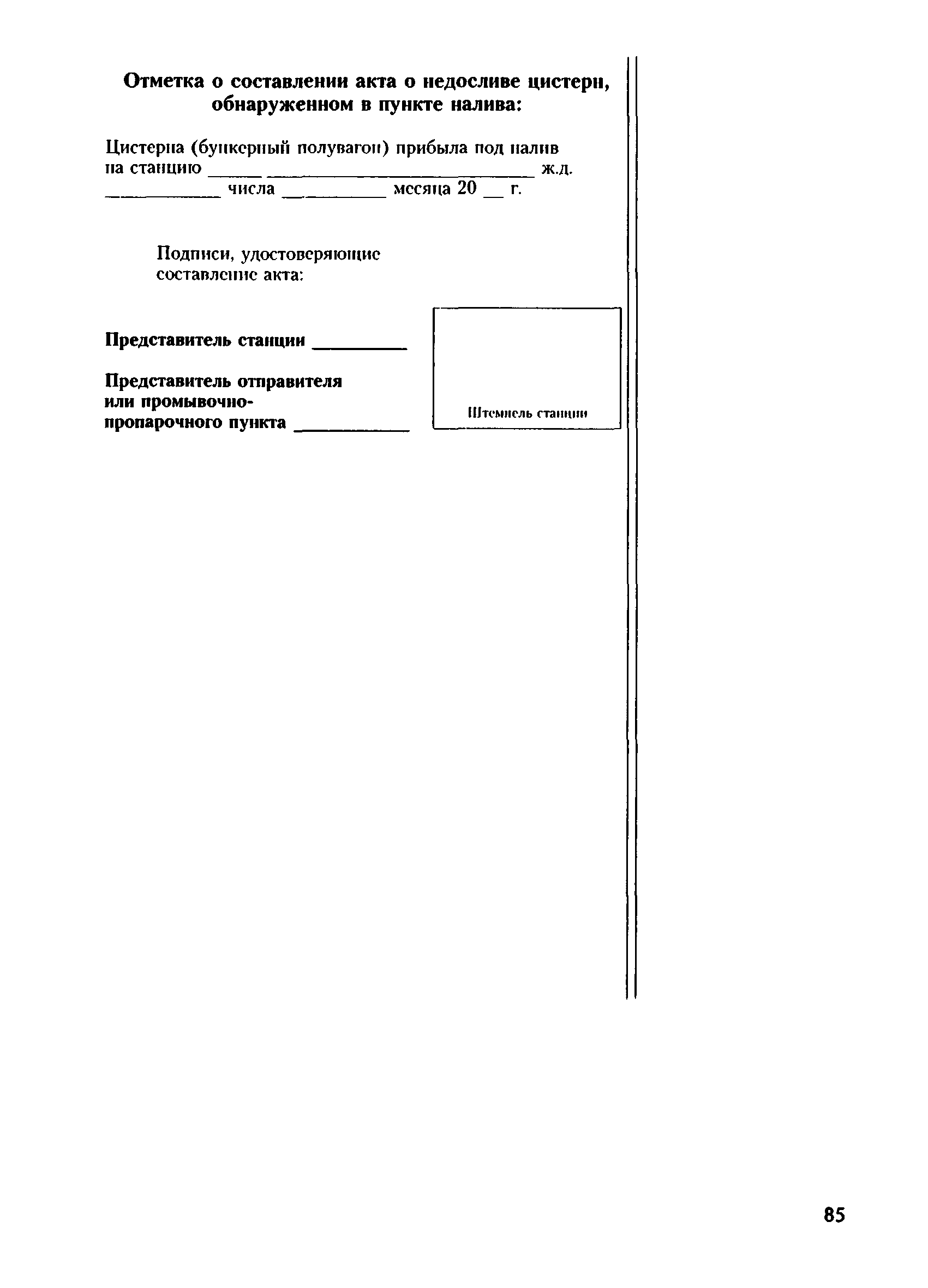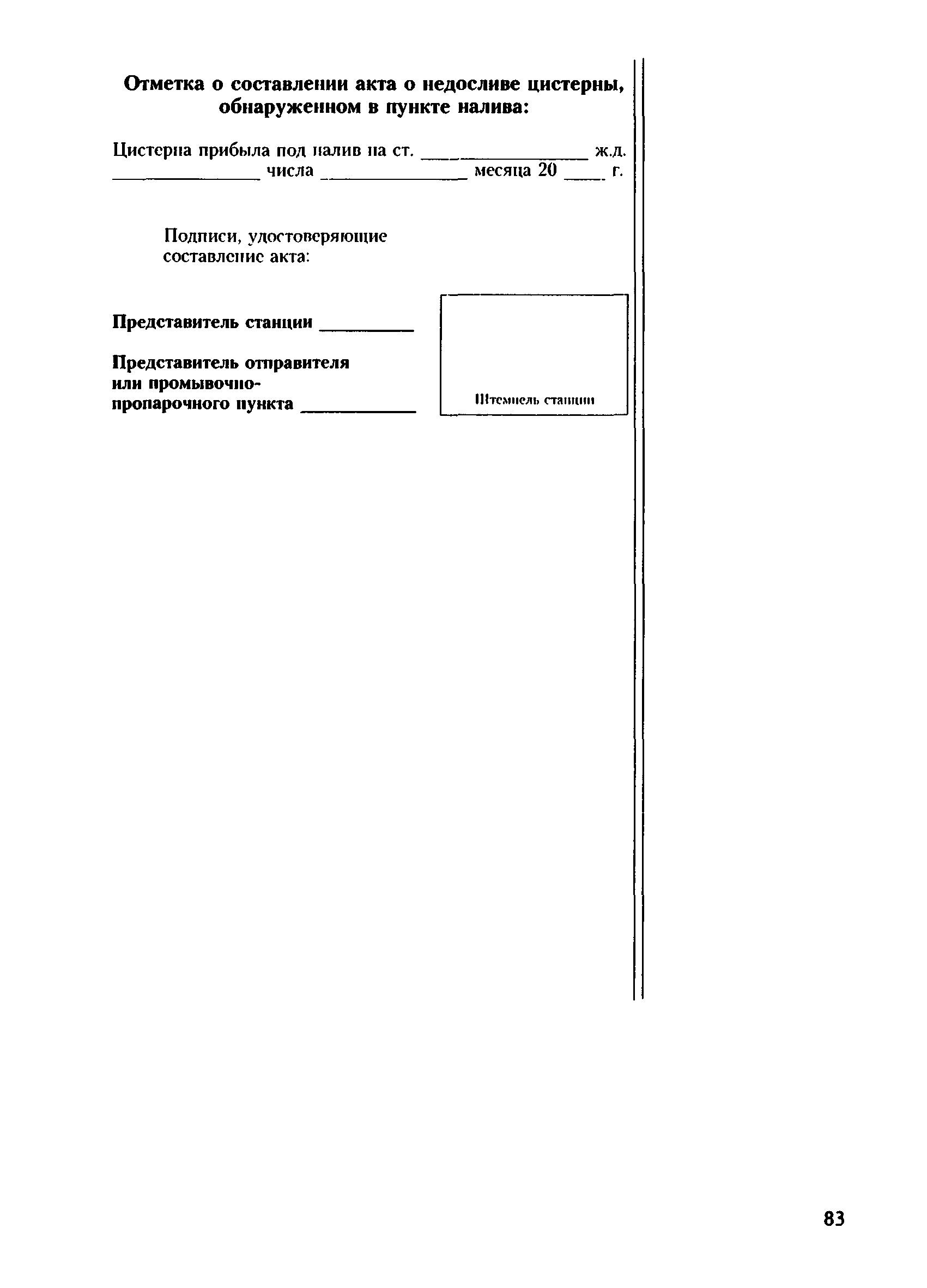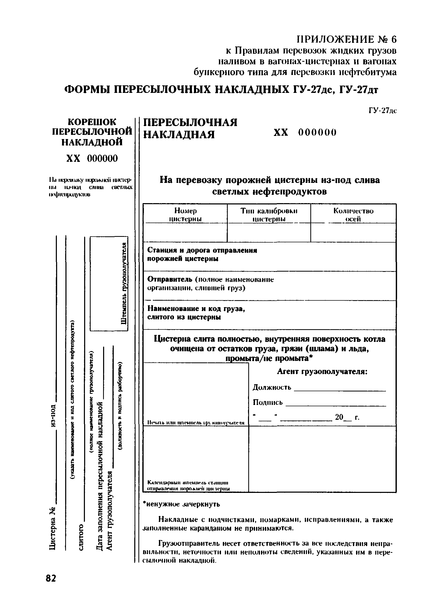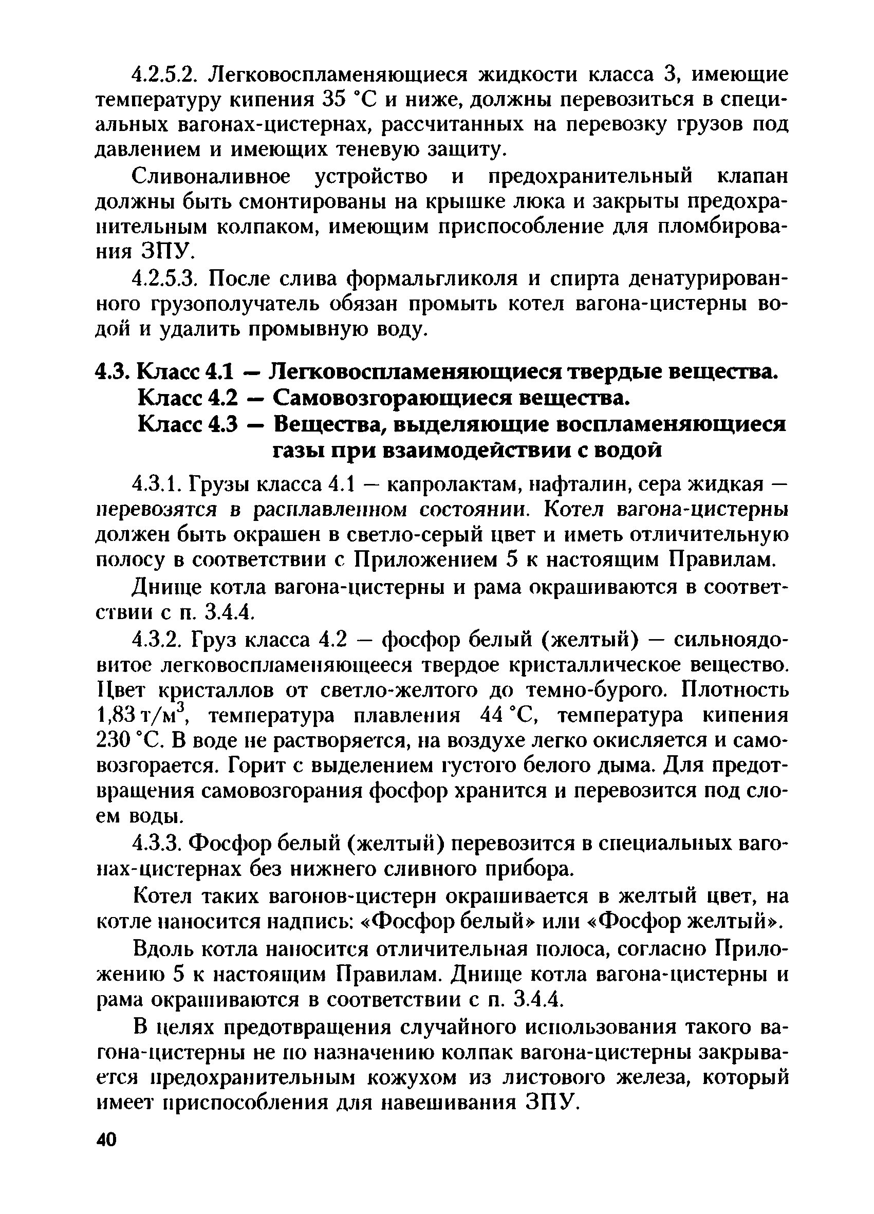 | Оглавление: | 1. Общие положения 2. Требования к вагонам-цистернам и вагонам бункерного типа для перевозки нефтебитума 3. Предписания по эксплуатации 3.1. Использование вагонов-цистерн и вагонов бункерного типа 3.2. Налив 3.3. Слив 3.4. Маркировка 3.5. Оформление перевозочных документов 4. Специальные условия перевозок опасных грузов наливом в вагонах-цистернах 4.1. Класс 2 - Газы 4.2. Класс 3 - Легковоспламеняющиеся жидкости 4.3. Класс 4.1 - Легковоспламеняющиеся твердые вещества 4.3. Класс 4.2 - Самовозгорающиеся вещества 4.3. Класс 4.3 - Вещества, выделяющие воспламеняющиеся газы при взаимодействии с водой 4.4. Класс 5.1 - Окисляющие вещества 4.4. Класс 5.2 - Органические пероксиды 4.5. Класс 6.1 - Ядовитые вещества 4.6. Класс 8 - Едкие и коррозионные вещества 4.7. Класс 9 - Прочие и опасные грузы 5. Порядок действий при обнаружении неисправности вагонов-цистерн 6. Дополнительные условия перевозки пищевых грузов наливом в вагонах-цистернах Приложение 1. Алфавитный указатель неопасных грузов, допущенных к перевозке наливом в вагонах-цистернах и вагонах бункерного типа Приложение 2. Свидетельство о техническом состоянии вагона-цистерны для перевозки опасного груза Приложение 3. Требования ГОСТ 1510-84 «Нефть и нефтепродукты. Маркировка, упаковка, транспортирование и хранение» к подготовке вагонов-цистерн под налив нефтепродуктов Приложение 4. Порядок определения массы нефти и нефтепродуктов в вагонах-цистернах расчетным способом Приложение 5. Отличительные полосы, наносимые на вагоны-цистерны Приложение 6. Формы пересылочных накладных ГУ-27дс, ГУ-27дт Приложение 7. Порядок проверки сохранности и определения размера недостачи спирта этилового ректификованного |