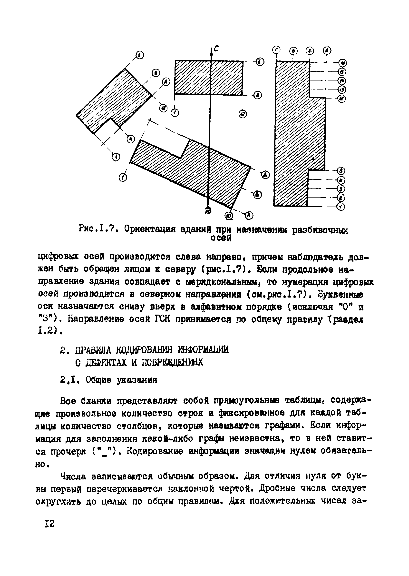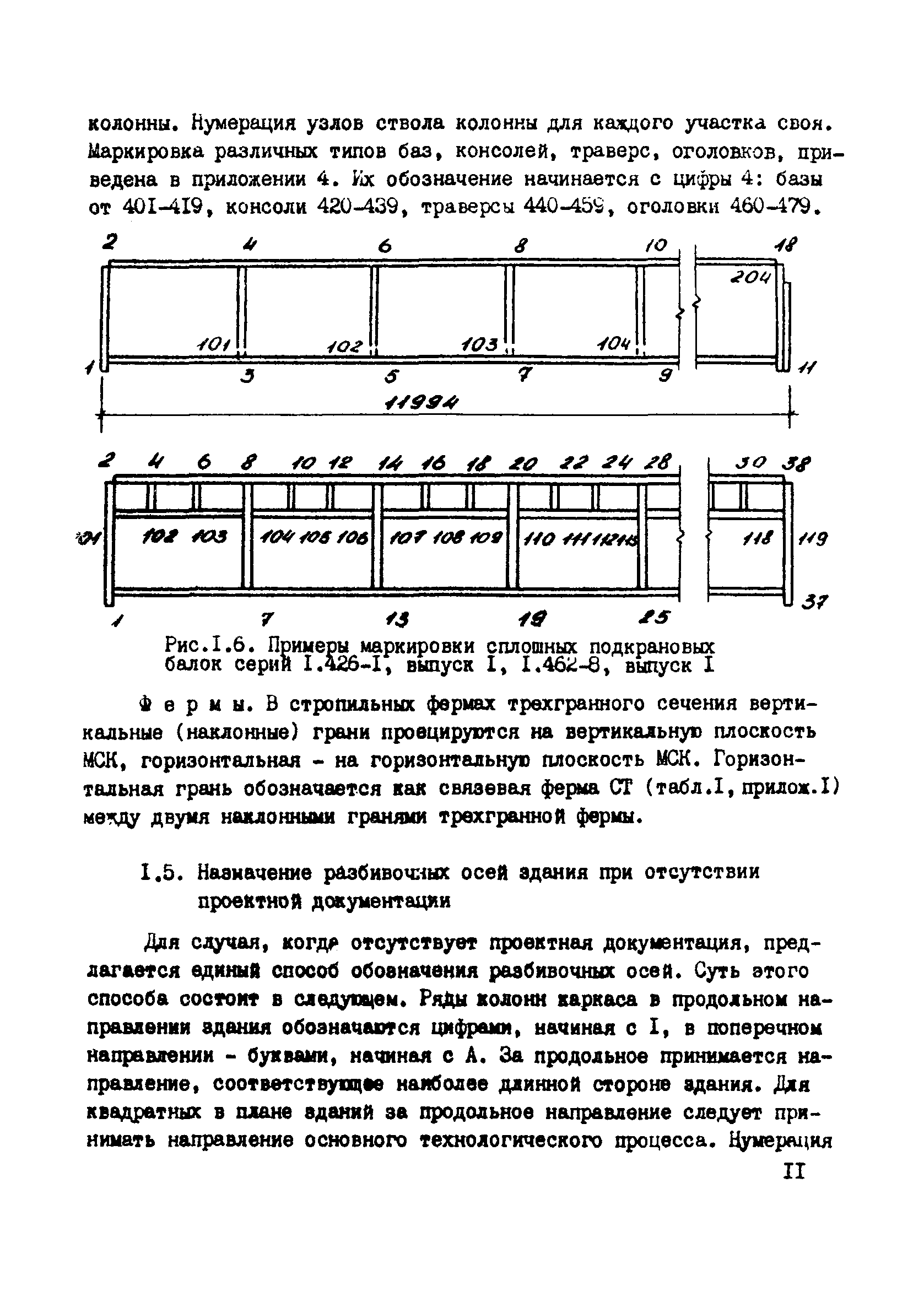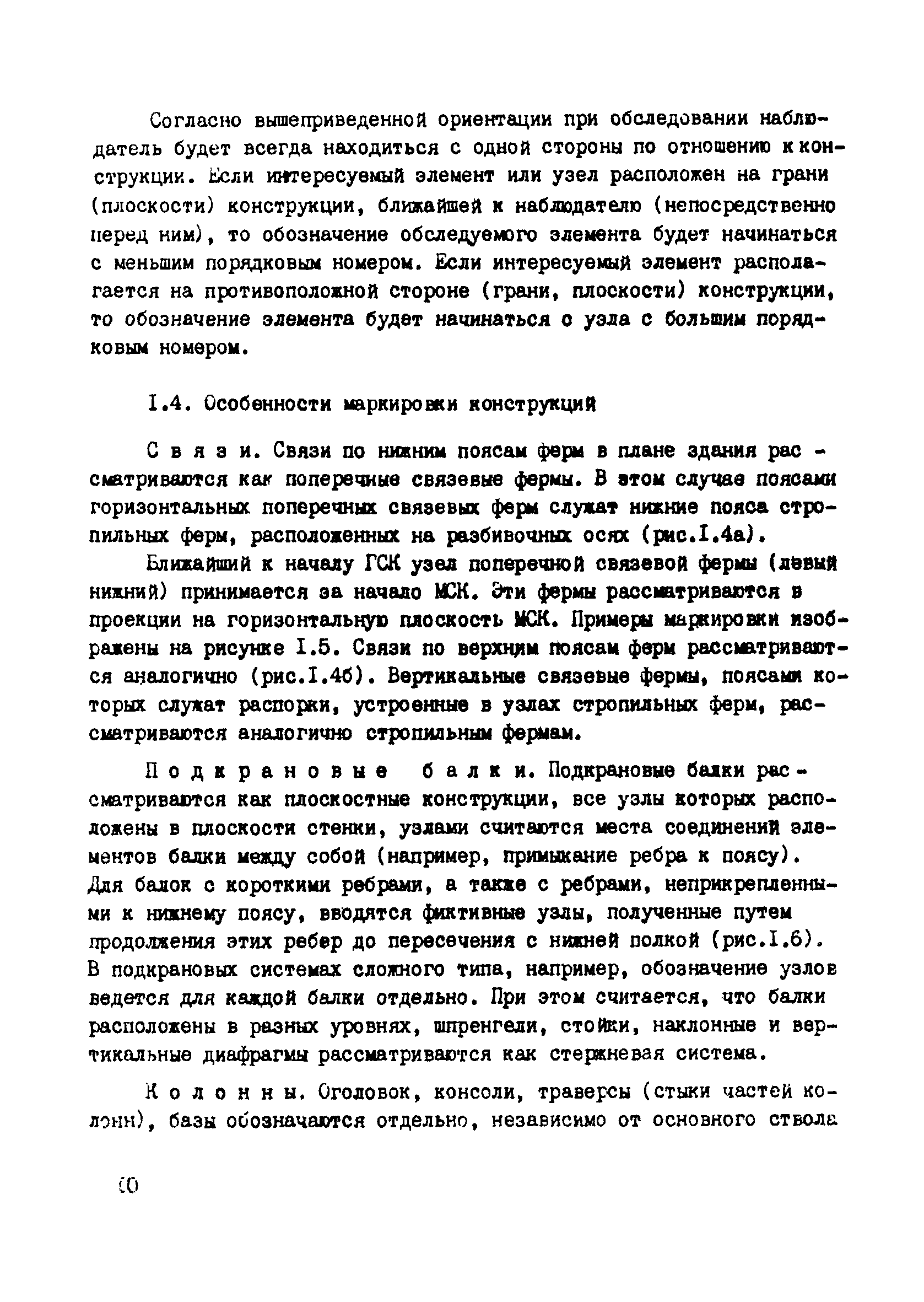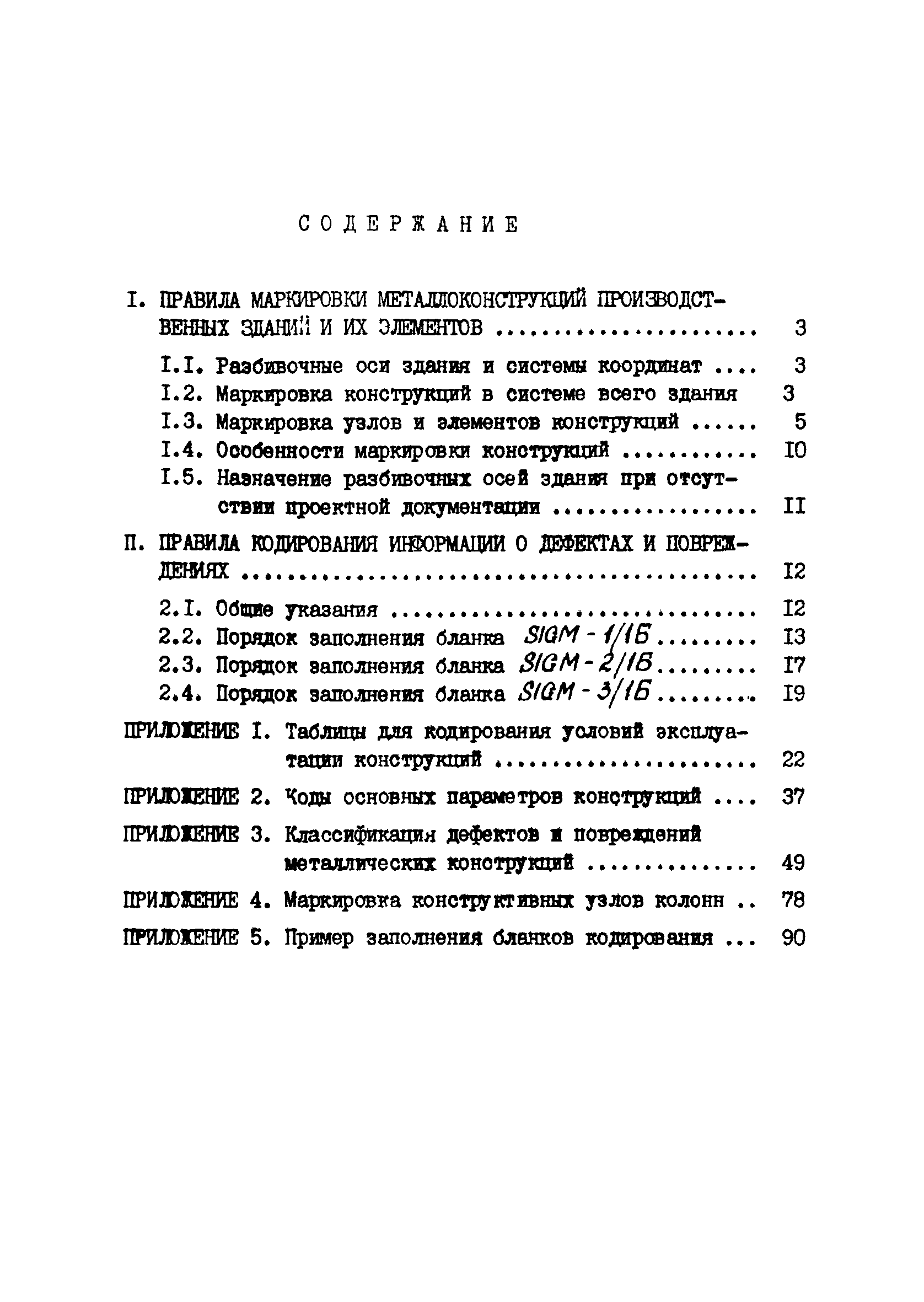 | Оглавление: | I Правила маркировки металлоконструкций производственных зданий и их элементов 1.1 Разбивочные оси здания и системы координат 1.2 Маркировка конструкций в системе всего здания 1.3 Маркировка узлов и элементов конструкций 1.4 Особенности маркировки конструкций 1.5 Назначение разбивочных осей здания при отсутствии проектной документации II Правила кодирования информации о дефектах и повреждениях 2.1 Общие указания 2.2 Порядок заполнения бланка SIGM - 1/1Б 2.3 Порядок выполнения бланка SIGM - 2/1Б 2.4 Порядок заполнения бланка SIGM - 3/1Б Приложение 1. Таблицы для кодирования условий эксплуатации конструкций Приложение 2. Коды основных параметров конструкций Приложение 3. Классификация дефектов и повреждений металлических конструкций Приложение 4. Маркировка конструктивных узлов колонн приложение 5. Пример заполнения бланков кодирования |