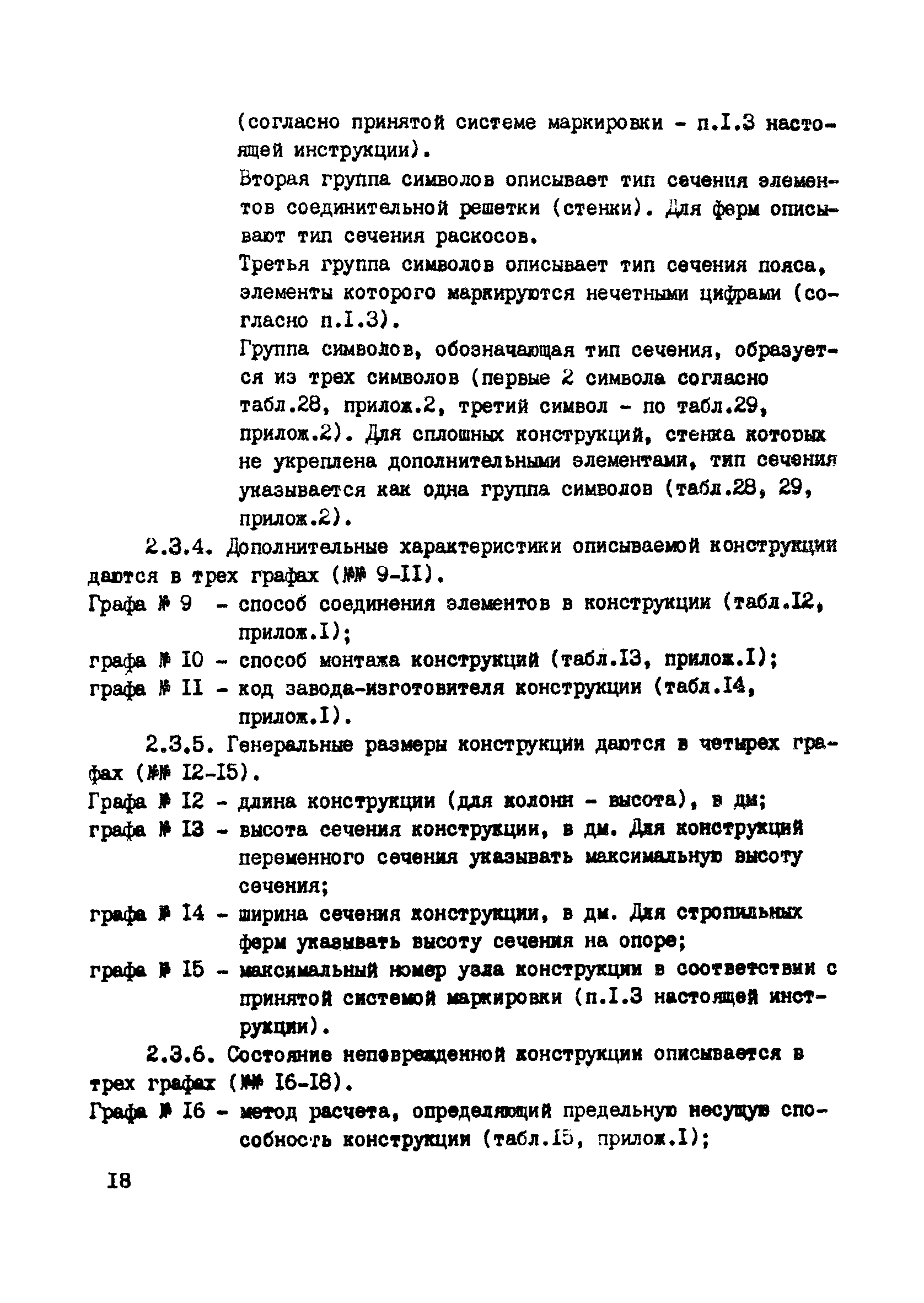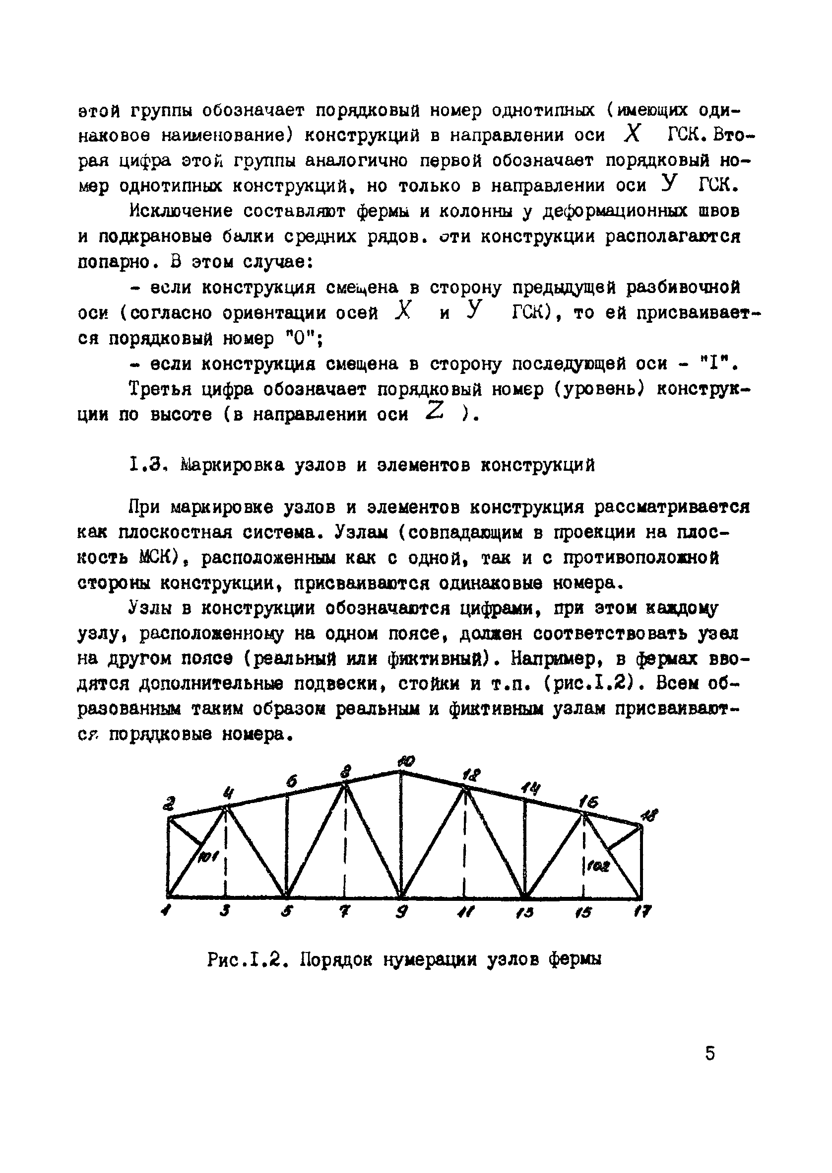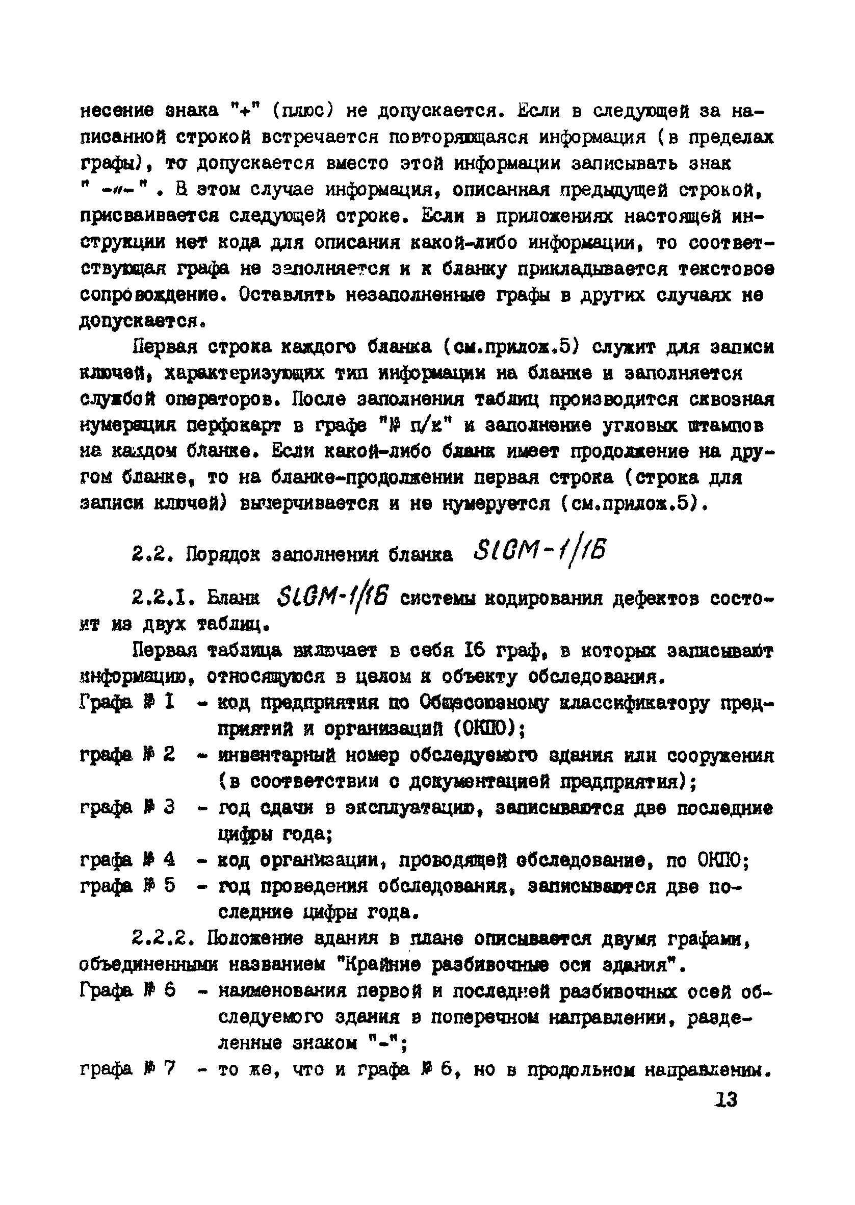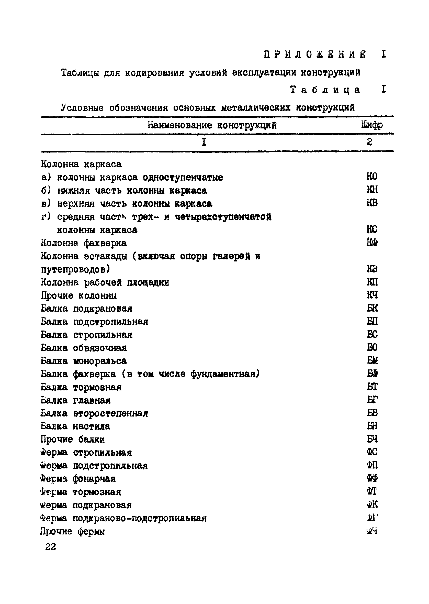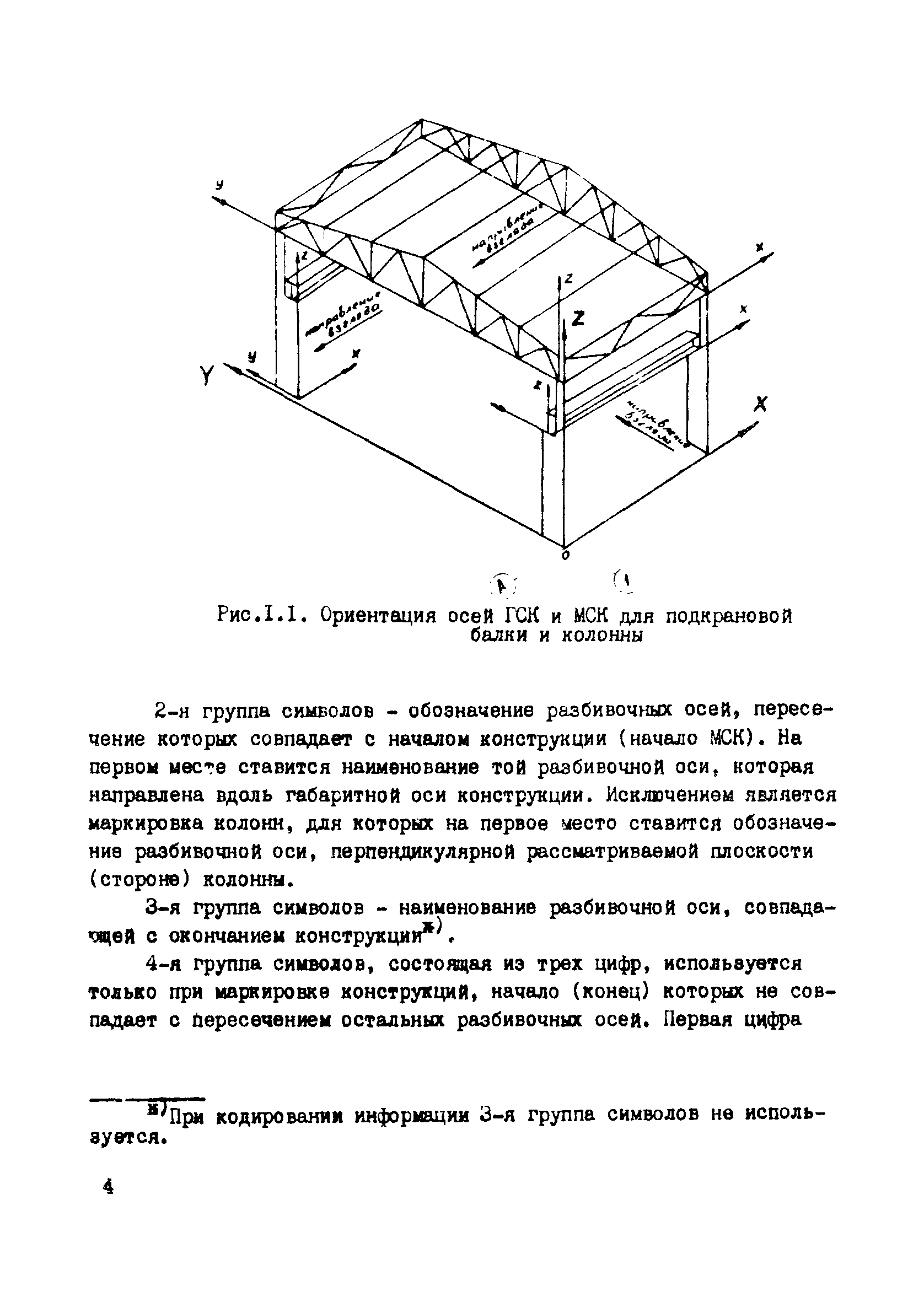 | Оглавление: | I Правила маркировки металлоконструкций производственных зданий и их элементов 1.1 Разбивочные оси здания и системы координат 1.2 Маркировка конструкций в системе всего здания 1.3 Маркировка узлов и элементов конструкций 1.4 Особенности маркировки конструкций 1.5 Назначение разбивочных осей здания при отсутствии проектной документации II Правила кодирования информации о дефектах и повреждениях 2.1 Общие указания 2.2 Порядок заполнения бланка SIGM - 1/1Б 2.3 Порядок выполнения бланка SIGM - 2/1Б 2.4 Порядок заполнения бланка SIGM - 3/1Б Приложение 1. Таблицы для кодирования условий эксплуатации конструкций Приложение 2. Коды основных параметров конструкций Приложение 3. Классификация дефектов и повреждений металлических конструкций Приложение 4. Маркировка конструктивных узлов колонн приложение 5. Пример заполнения бланков кодирования |