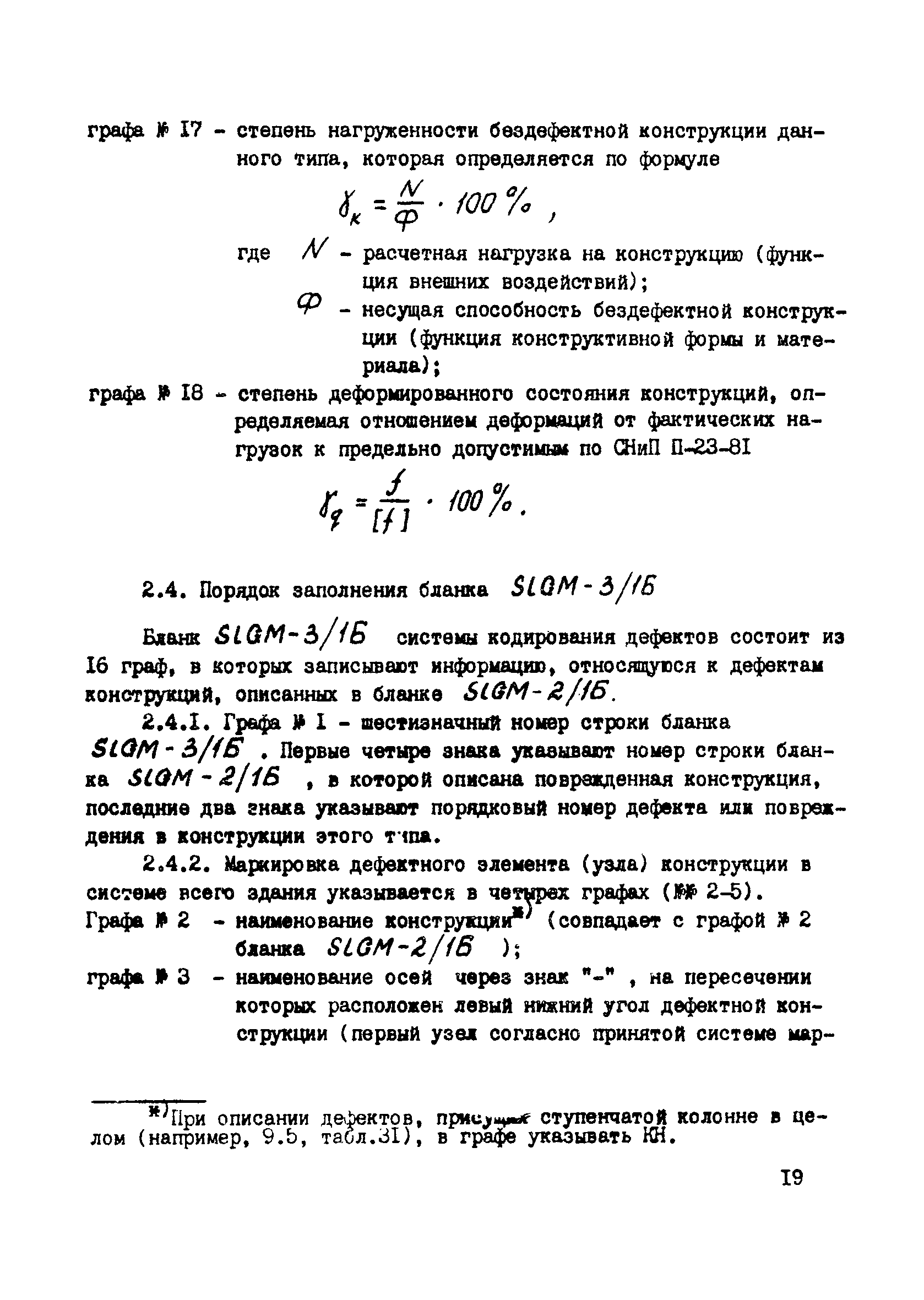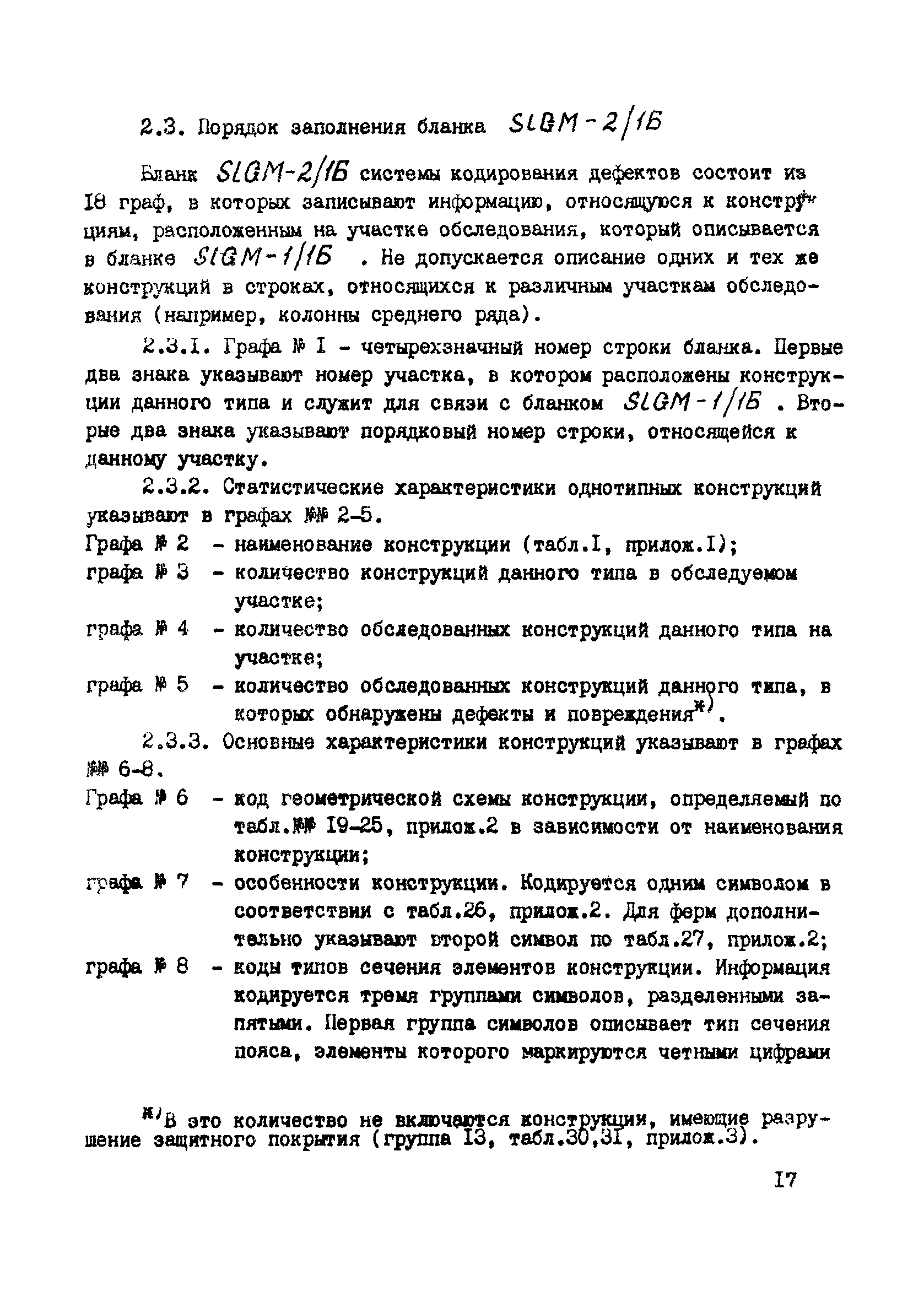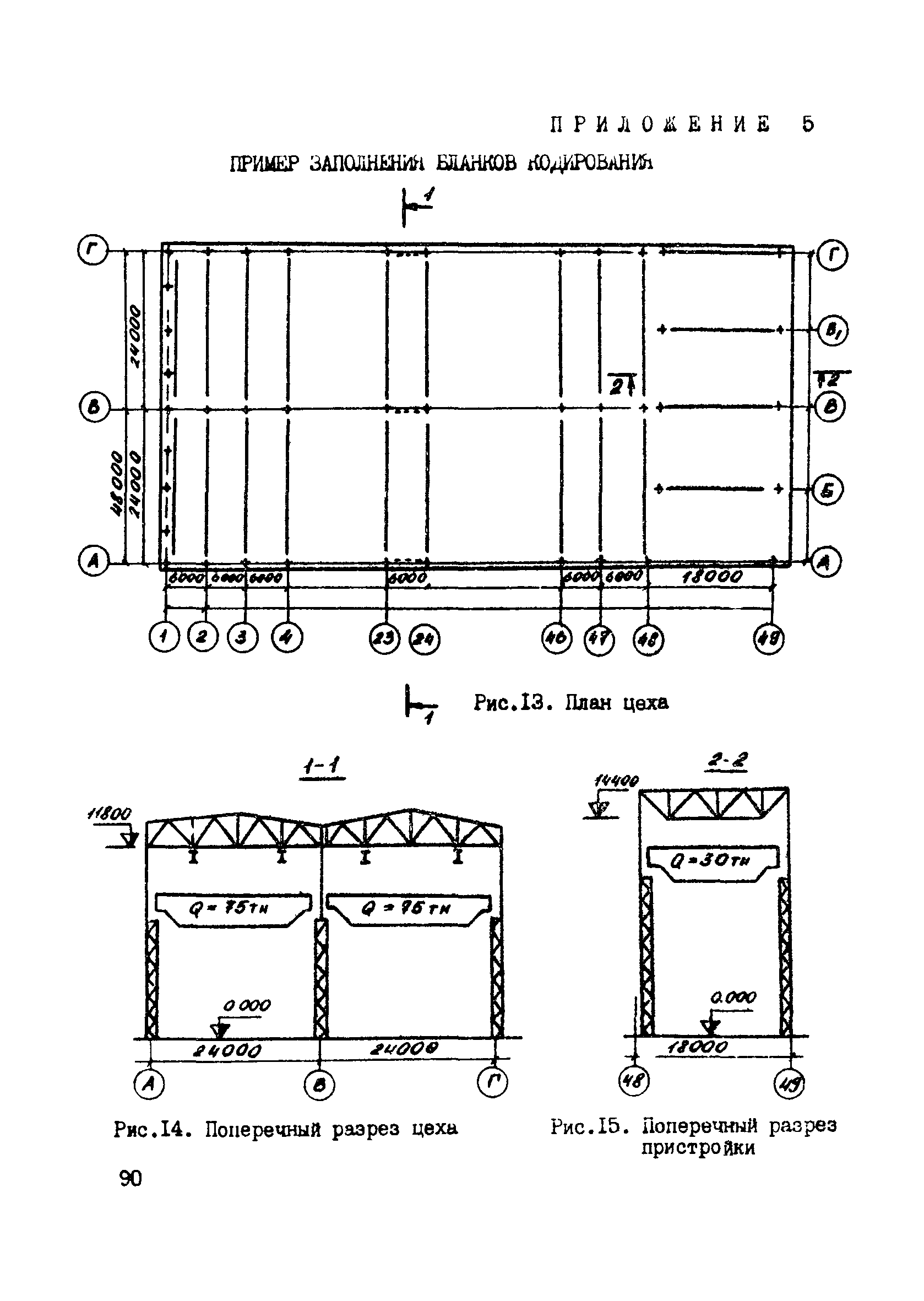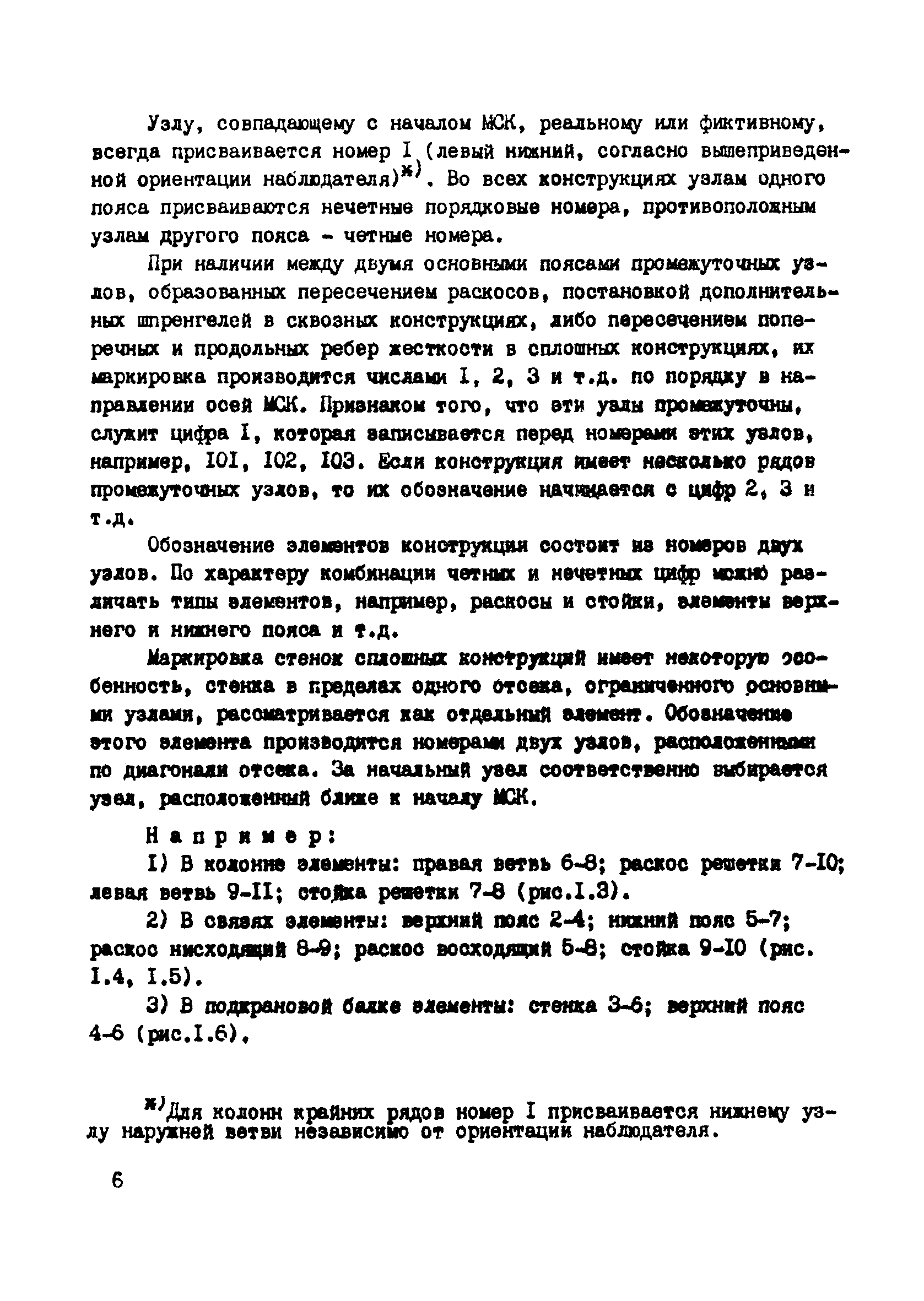 | Оглавление: | I Правила маркировки металлоконструкций производственных зданий и их элементов 1.1 Разбивочные оси здания и системы координат 1.2 Маркировка конструкций в системе всего здания 1.3 Маркировка узлов и элементов конструкций 1.4 Особенности маркировки конструкций 1.5 Назначение разбивочных осей здания при отсутствии проектной документации II Правила кодирования информации о дефектах и повреждениях 2.1 Общие указания 2.2 Порядок заполнения бланка SIGM - 1/1Б 2.3 Порядок выполнения бланка SIGM - 2/1Б 2.4 Порядок заполнения бланка SIGM - 3/1Б Приложение 1. Таблицы для кодирования условий эксплуатации конструкций Приложение 2. Коды основных параметров конструкций Приложение 3. Классификация дефектов и повреждений металлических конструкций Приложение 4. Маркировка конструктивных узлов колонн приложение 5. Пример заполнения бланков кодирования |