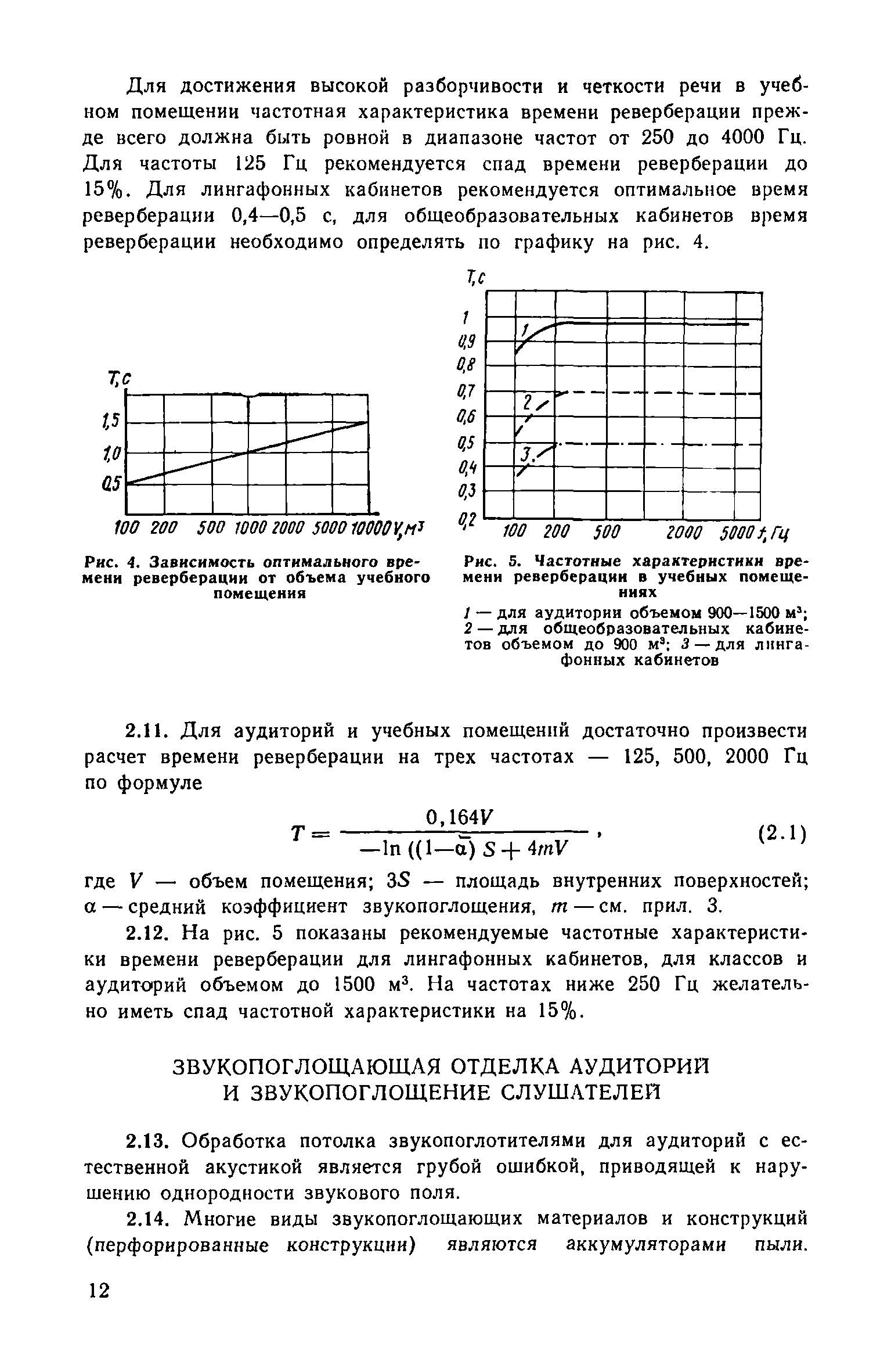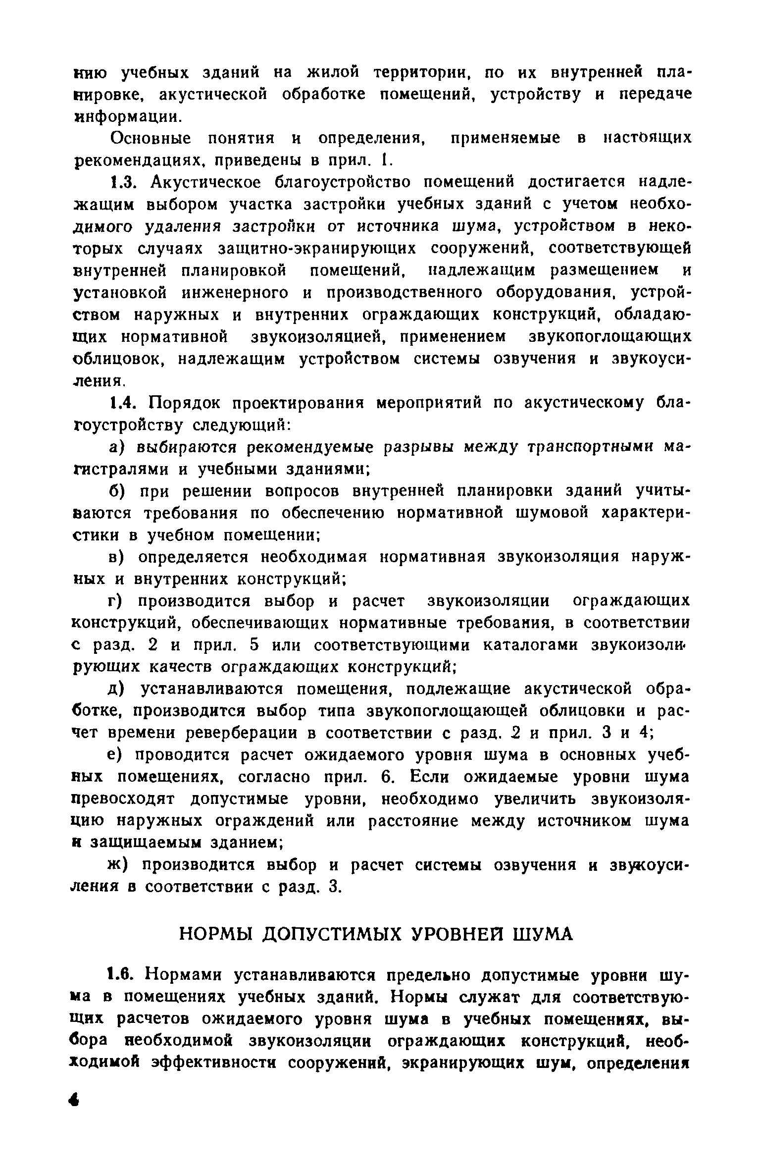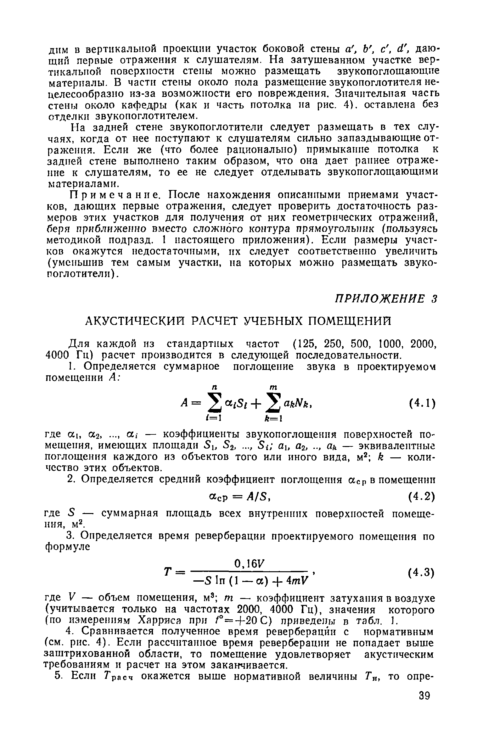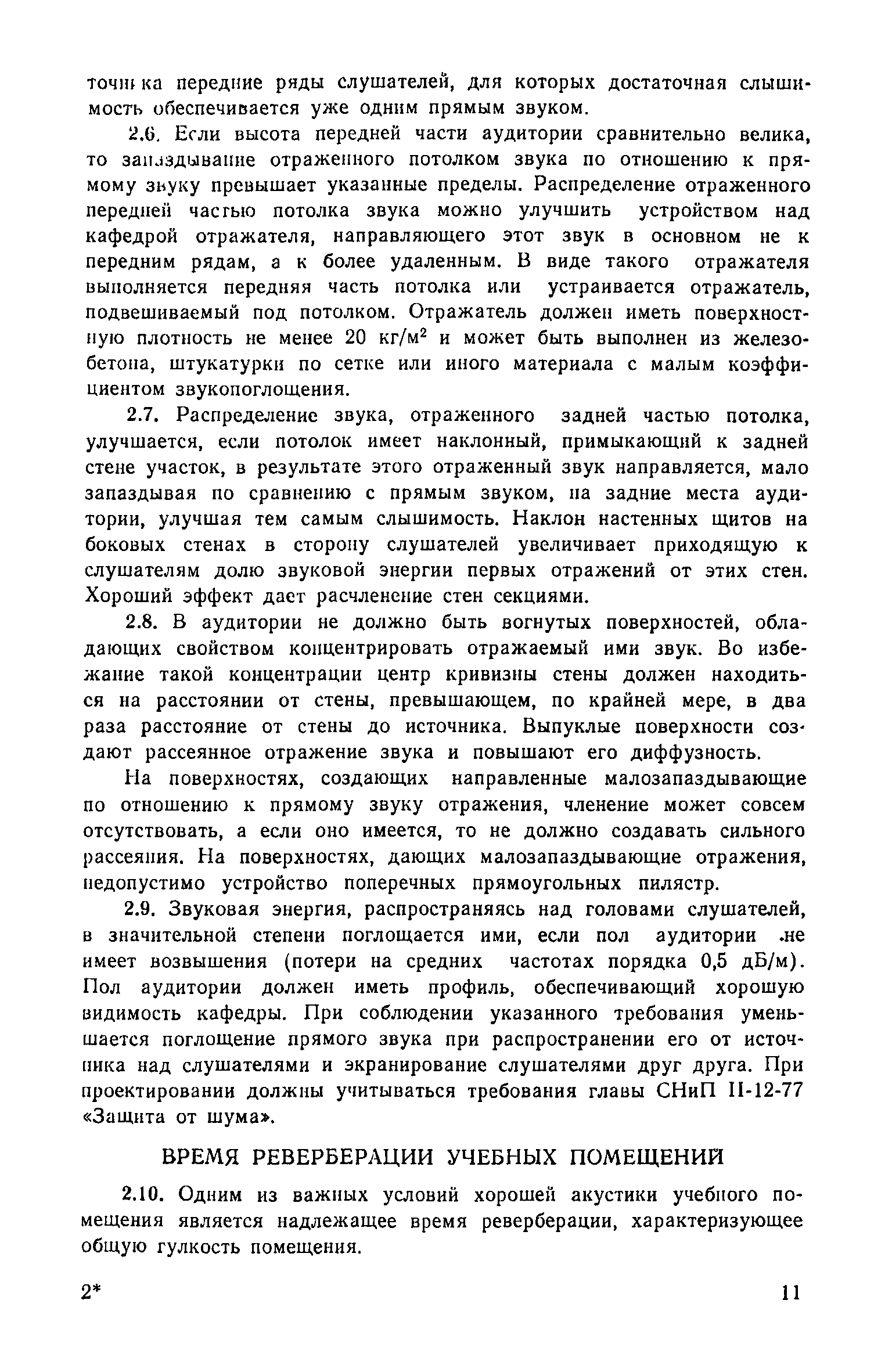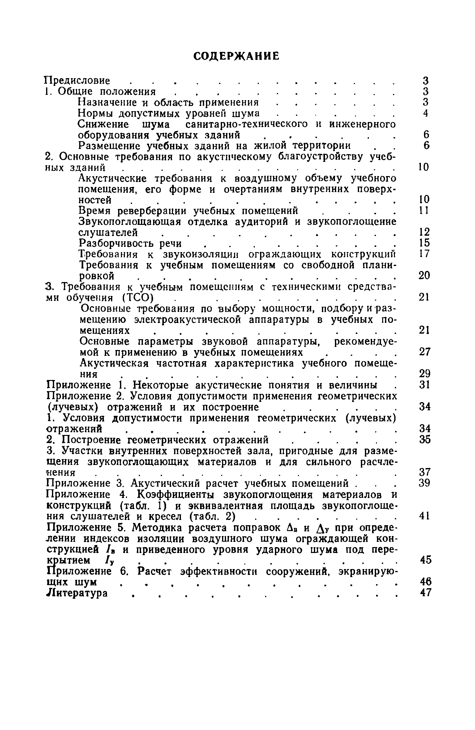 | Оглавление: | Предисловие 1. Общие положения Назначение и область применения Нормы допустимых уровней шума Снижение шума санитарно-технического и инженерного оборудования учебных зданий Размещение учебных зданий на жилой территории . 2. Основные требования по акустическому благоустройству учебных зданий Акустические требования к воздушному объему учебного помещения, его форме и очертаниям внутренних поверхностей Время реверберации учебных помещений Звукопоглощающая отделка аудиторий и звукопоглощение слушателей Разборчивость речи Требования к звукоизоляции ограждающих конструкций Требования к учебным помещениям со свободной планировкой 3. Требования к учебным помещениям с техническими средствами обучения (ТСО) Основные требования по выбору мощности, подбору и размещению электроакустической аппаратуры в учебных помещениях Основные параметры звуковой аппаратуры, рекомендуемой к применению в учебных помещениях Акустическая частотная характеристика учебного помещения Приложение 1. Некоторые акустические понятия и величины Приложение 2. Условия допустимости применения геометрических (лучевых) отражений и их построение 1. Условия допустимости применения геометрических (лучевых) отражений 2. Построение геометрических отражений 3. Участки внутренних поверхностей зала, пригодные для размещения звукопоглощающих материалов и для сильного расчленения Приложение 3. Акустический расчет учебных помещений Приложение 4. Коэффициенты звукопоглощения материалов и конструкций (табл. 1) и эквивалентная площадь звукопоглощения слушателей и кресел (табл. 2) Приложение 5. Методика расчета поправок при определении индексов изоляции воздушного шума ограждающей конструкцией и приведенного уровня ударного шума под перекрытием Приложение 6. Расчет эффективности сооружений, экранирующих шум Литература |