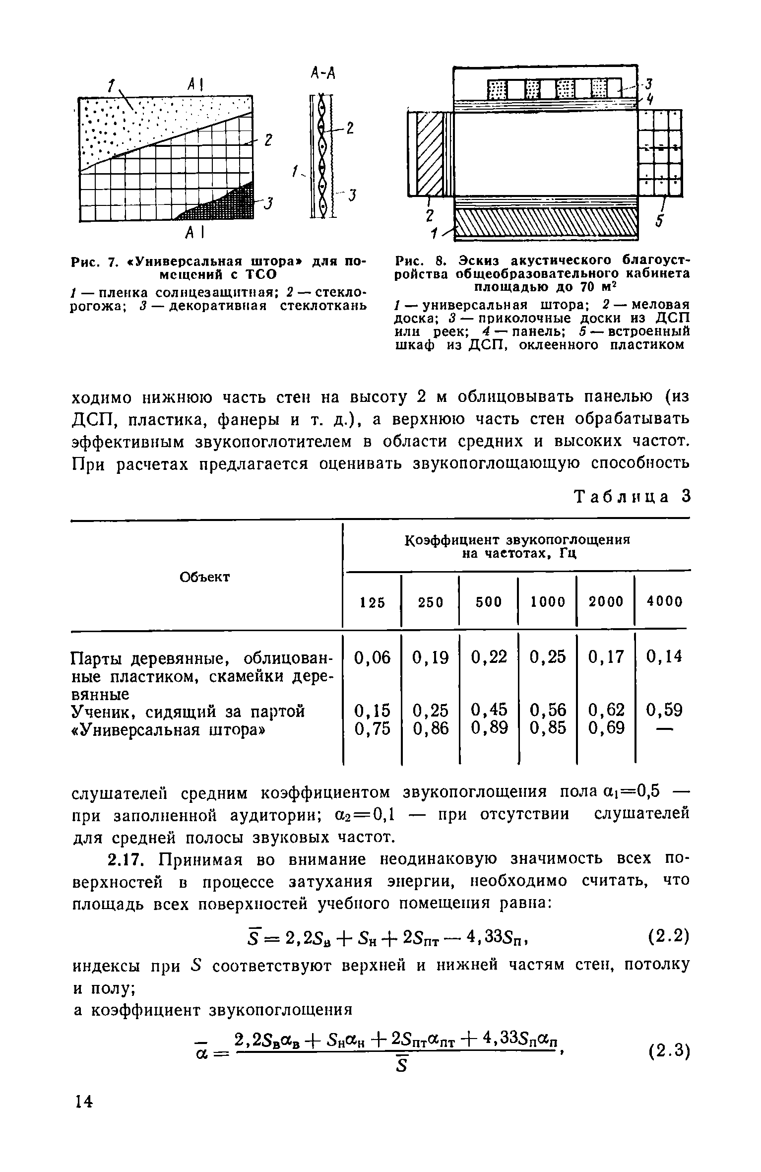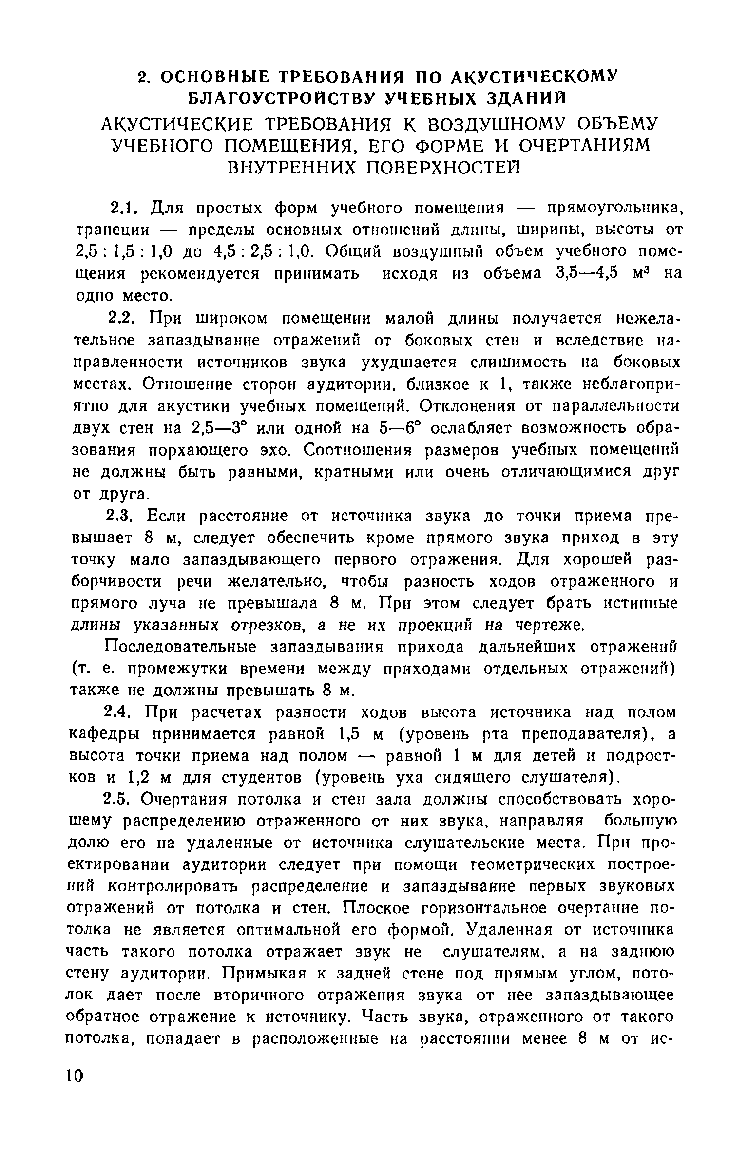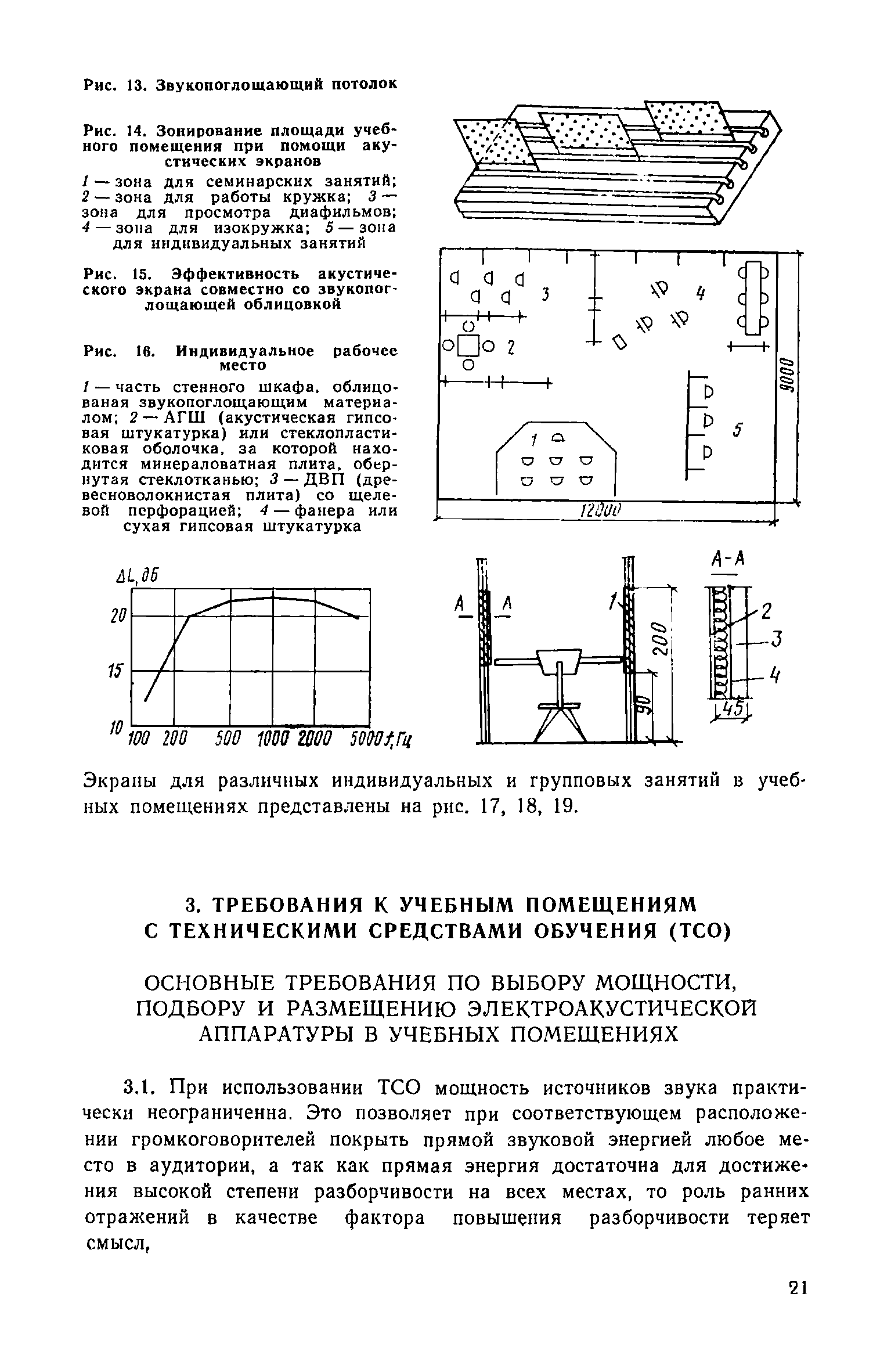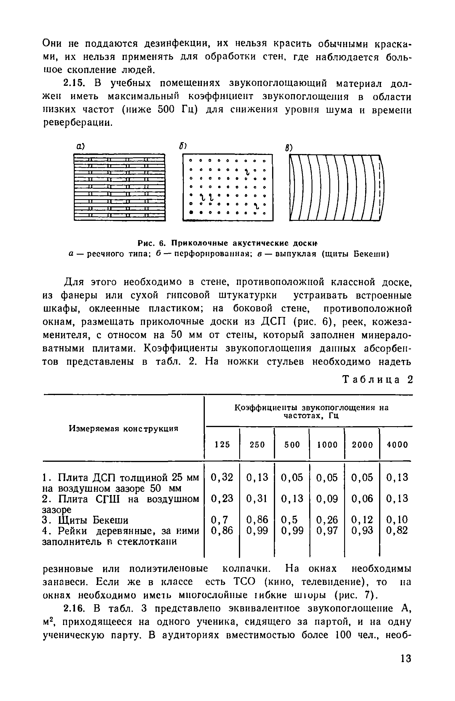 | Оглавление: | Предисловие 1. Общие положения Назначение и область применения Нормы допустимых уровней шума Снижение шума санитарно-технического и инженерного оборудования учебных зданий Размещение учебных зданий на жилой территории . 2. Основные требования по акустическому благоустройству учебных зданий Акустические требования к воздушному объему учебного помещения, его форме и очертаниям внутренних поверхностей Время реверберации учебных помещений Звукопоглощающая отделка аудиторий и звукопоглощение слушателей Разборчивость речи Требования к звукоизоляции ограждающих конструкций Требования к учебным помещениям со свободной планировкой 3. Требования к учебным помещениям с техническими средствами обучения (ТСО) Основные требования по выбору мощности, подбору и размещению электроакустической аппаратуры в учебных помещениях Основные параметры звуковой аппаратуры, рекомендуемой к применению в учебных помещениях Акустическая частотная характеристика учебного помещения Приложение 1. Некоторые акустические понятия и величины Приложение 2. Условия допустимости применения геометрических (лучевых) отражений и их построение 1. Условия допустимости применения геометрических (лучевых) отражений 2. Построение геометрических отражений 3. Участки внутренних поверхностей зала, пригодные для размещения звукопоглощающих материалов и для сильного расчленения Приложение 3. Акустический расчет учебных помещений Приложение 4. Коэффициенты звукопоглощения материалов и конструкций (табл. 1) и эквивалентная площадь звукопоглощения слушателей и кресел (табл. 2) Приложение 5. Методика расчета поправок при определении индексов изоляции воздушного шума ограждающей конструкцией и приведенного уровня ударного шума под перекрытием Приложение 6. Расчет эффективности сооружений, экранирующих шум Литература |