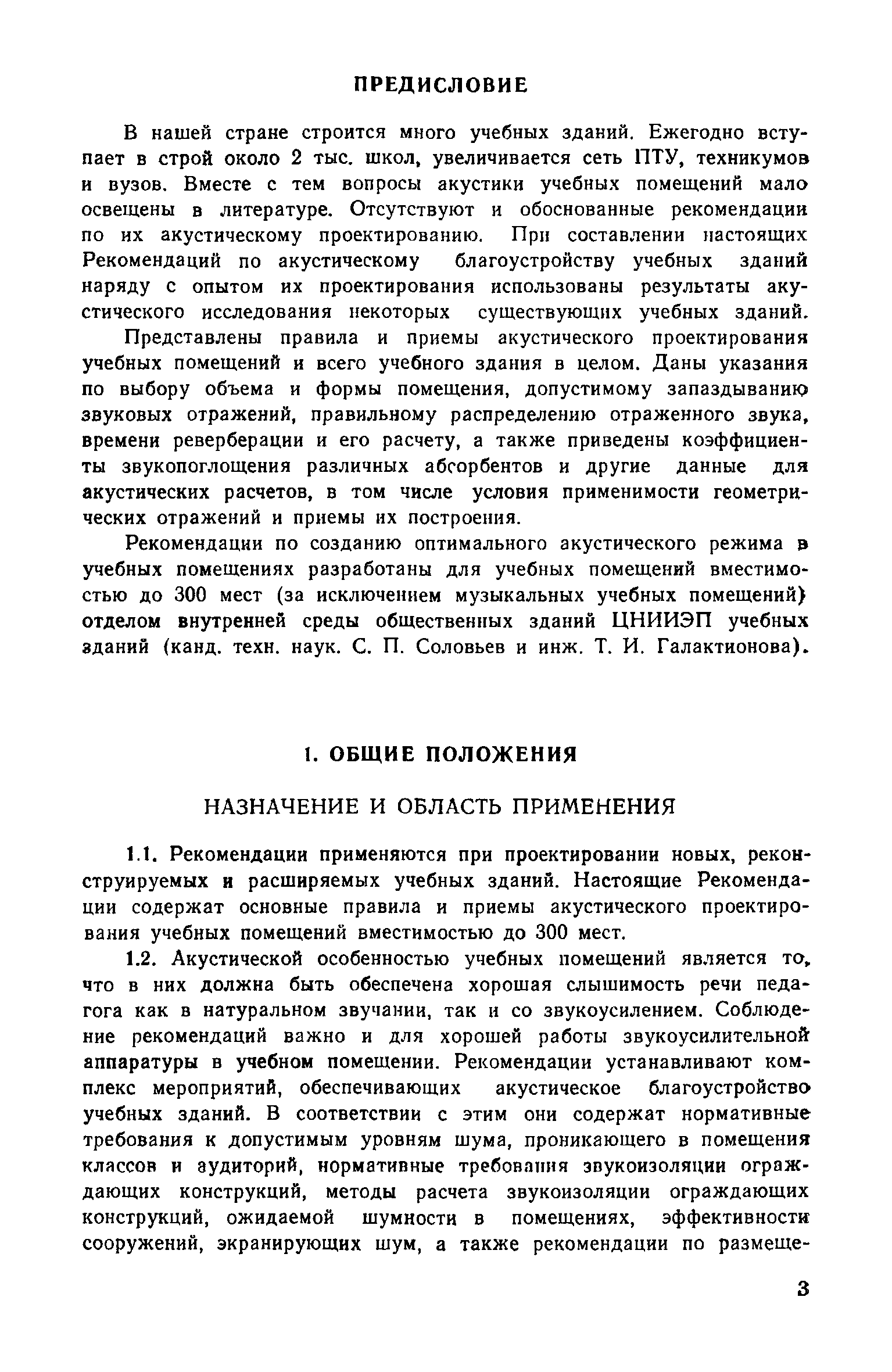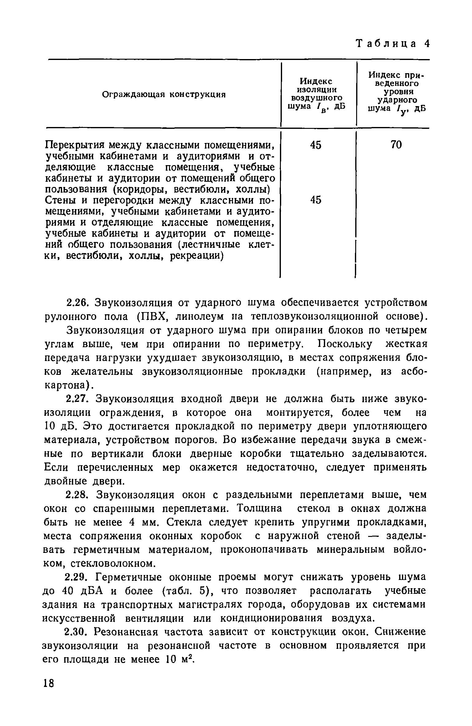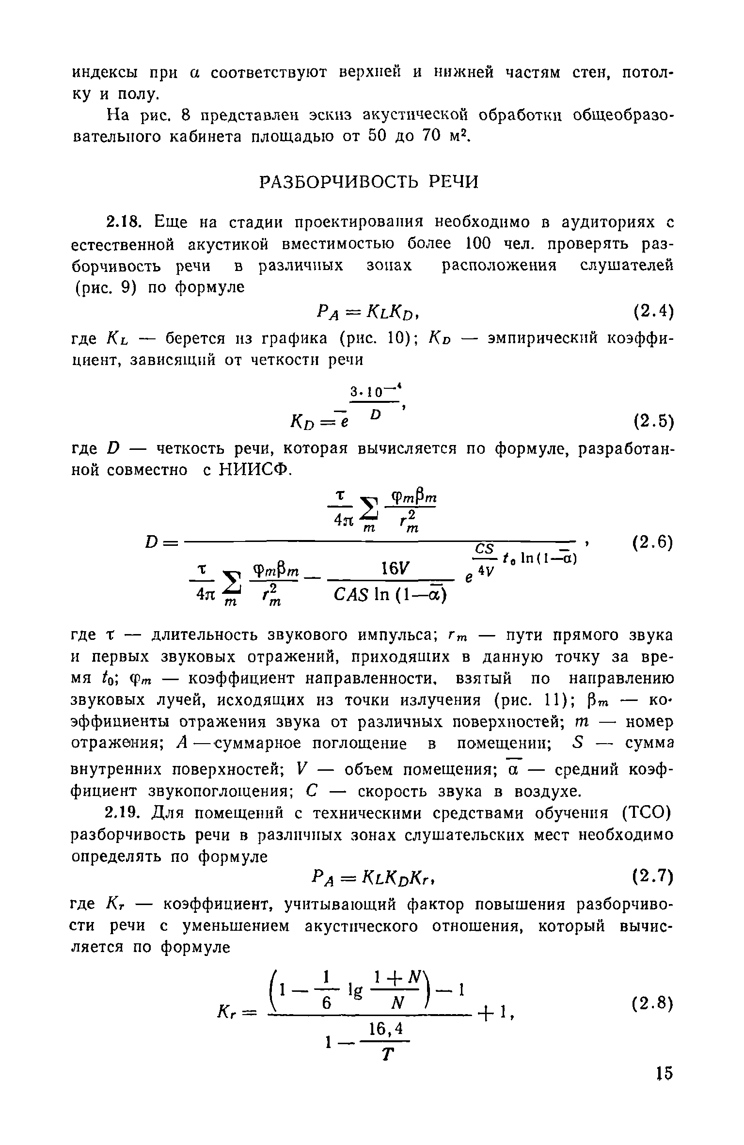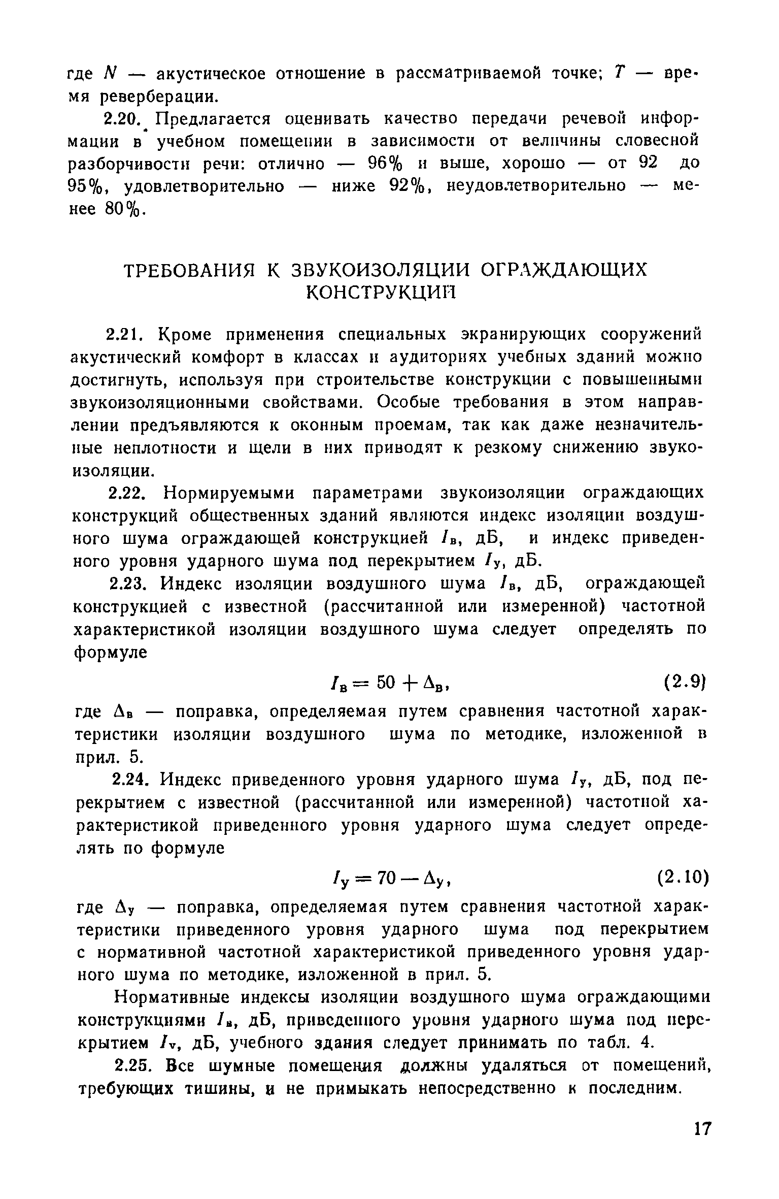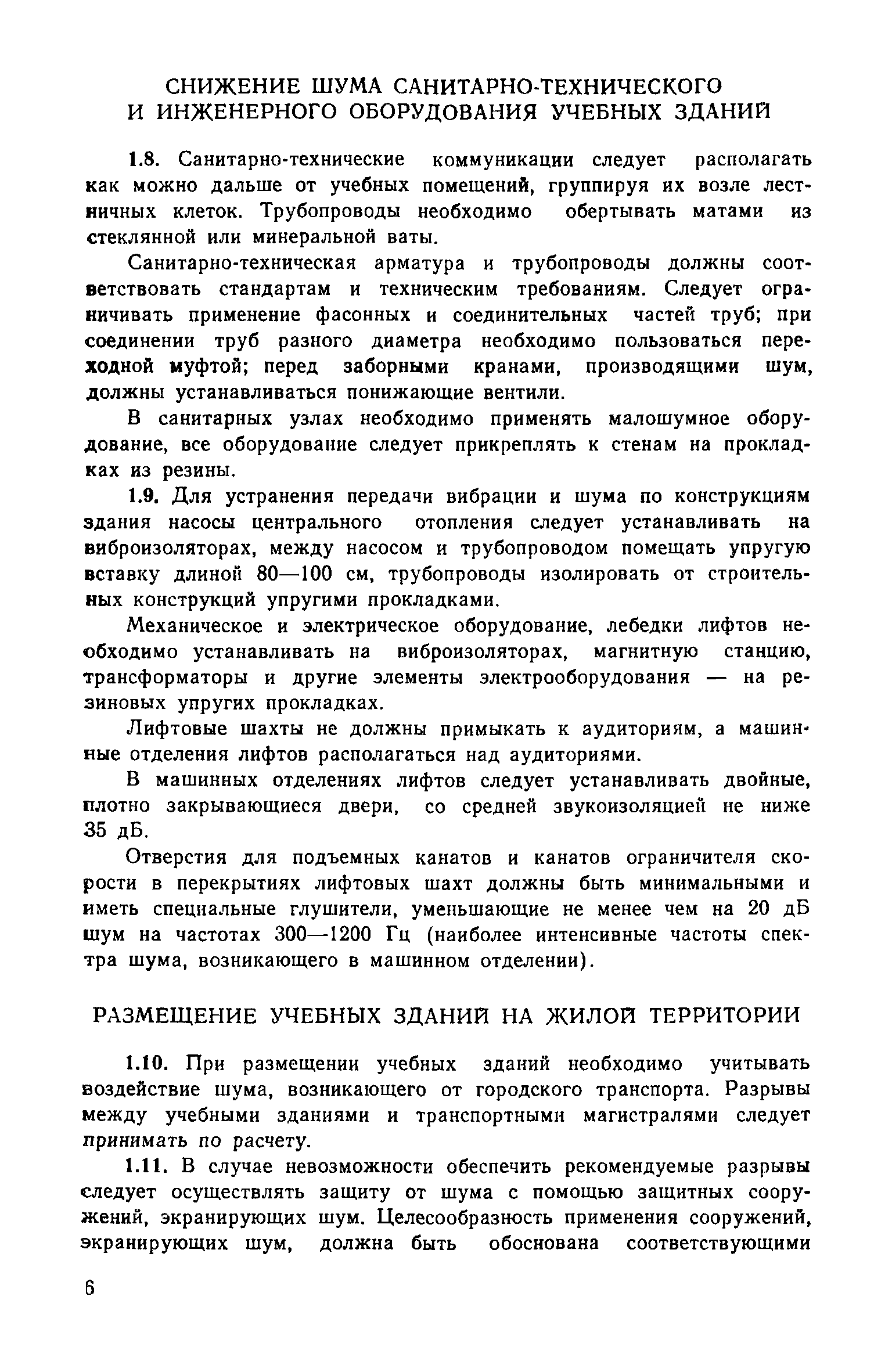 | Оглавление: | Предисловие 1. Общие положения Назначение и область применения Нормы допустимых уровней шума Снижение шума санитарно-технического и инженерного оборудования учебных зданий Размещение учебных зданий на жилой территории . 2. Основные требования по акустическому благоустройству учебных зданий Акустические требования к воздушному объему учебного помещения, его форме и очертаниям внутренних поверхностей Время реверберации учебных помещений Звукопоглощающая отделка аудиторий и звукопоглощение слушателей Разборчивость речи Требования к звукоизоляции ограждающих конструкций Требования к учебным помещениям со свободной планировкой 3. Требования к учебным помещениям с техническими средствами обучения (ТСО) Основные требования по выбору мощности, подбору и размещению электроакустической аппаратуры в учебных помещениях Основные параметры звуковой аппаратуры, рекомендуемой к применению в учебных помещениях Акустическая частотная характеристика учебного помещения Приложение 1. Некоторые акустические понятия и величины Приложение 2. Условия допустимости применения геометрических (лучевых) отражений и их построение 1. Условия допустимости применения геометрических (лучевых) отражений 2. Построение геометрических отражений 3. Участки внутренних поверхностей зала, пригодные для размещения звукопоглощающих материалов и для сильного расчленения Приложение 3. Акустический расчет учебных помещений Приложение 4. Коэффициенты звукопоглощения материалов и конструкций (табл. 1) и эквивалентная площадь звукопоглощения слушателей и кресел (табл. 2) Приложение 5. Методика расчета поправок при определении индексов изоляции воздушного шума ограждающей конструкцией и приведенного уровня ударного шума под перекрытием Приложение 6. Расчет эффективности сооружений, экранирующих шум Литература |