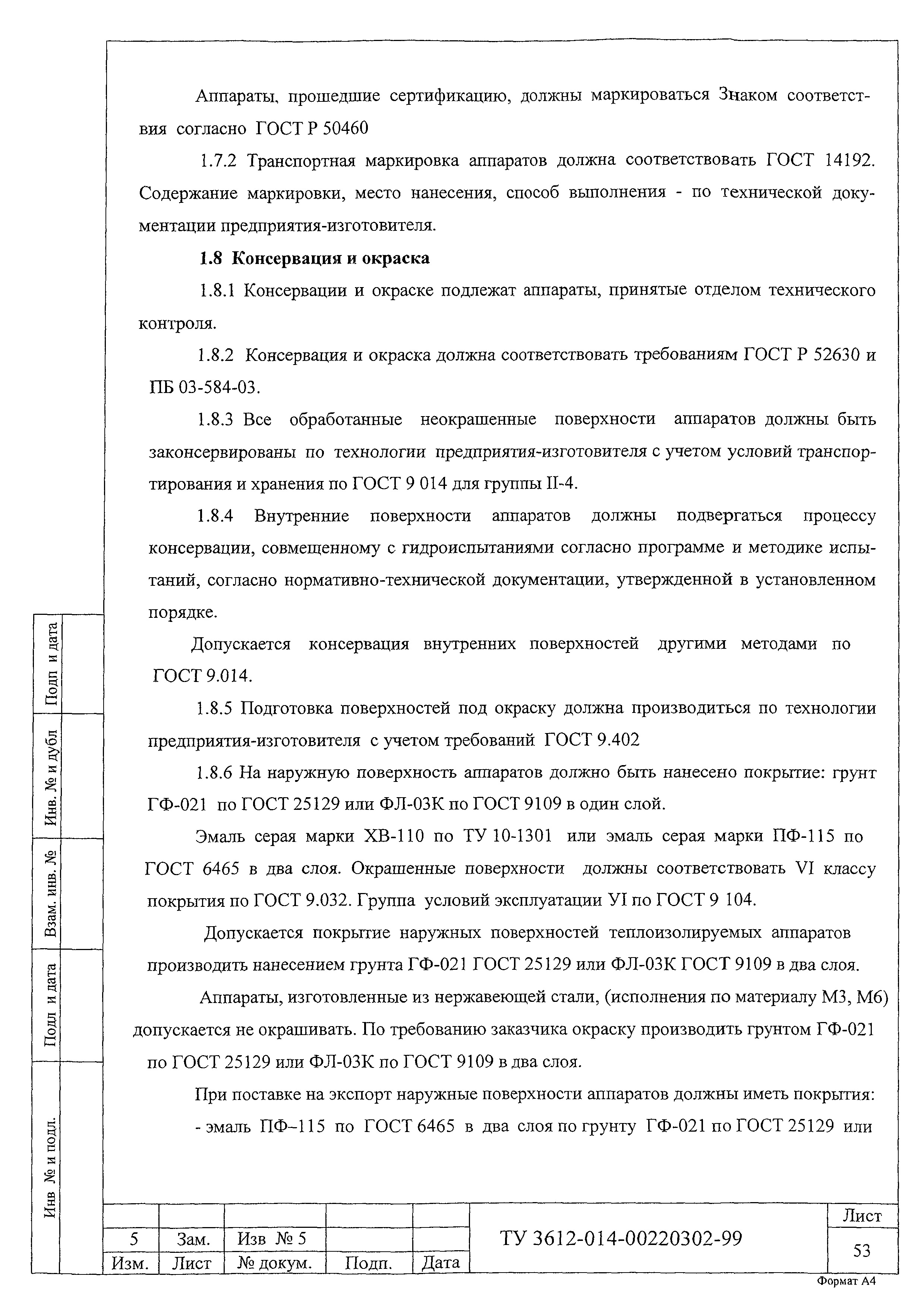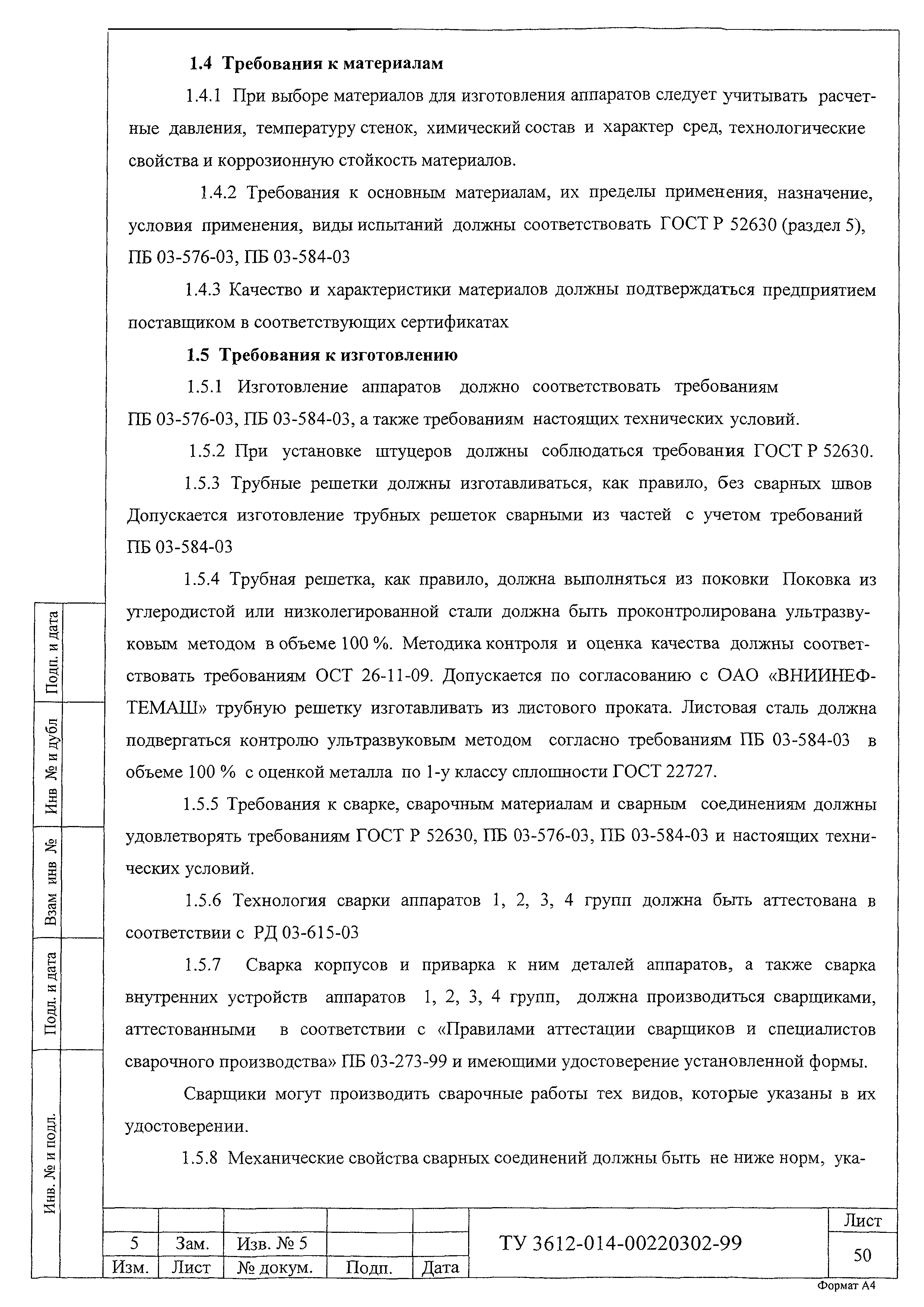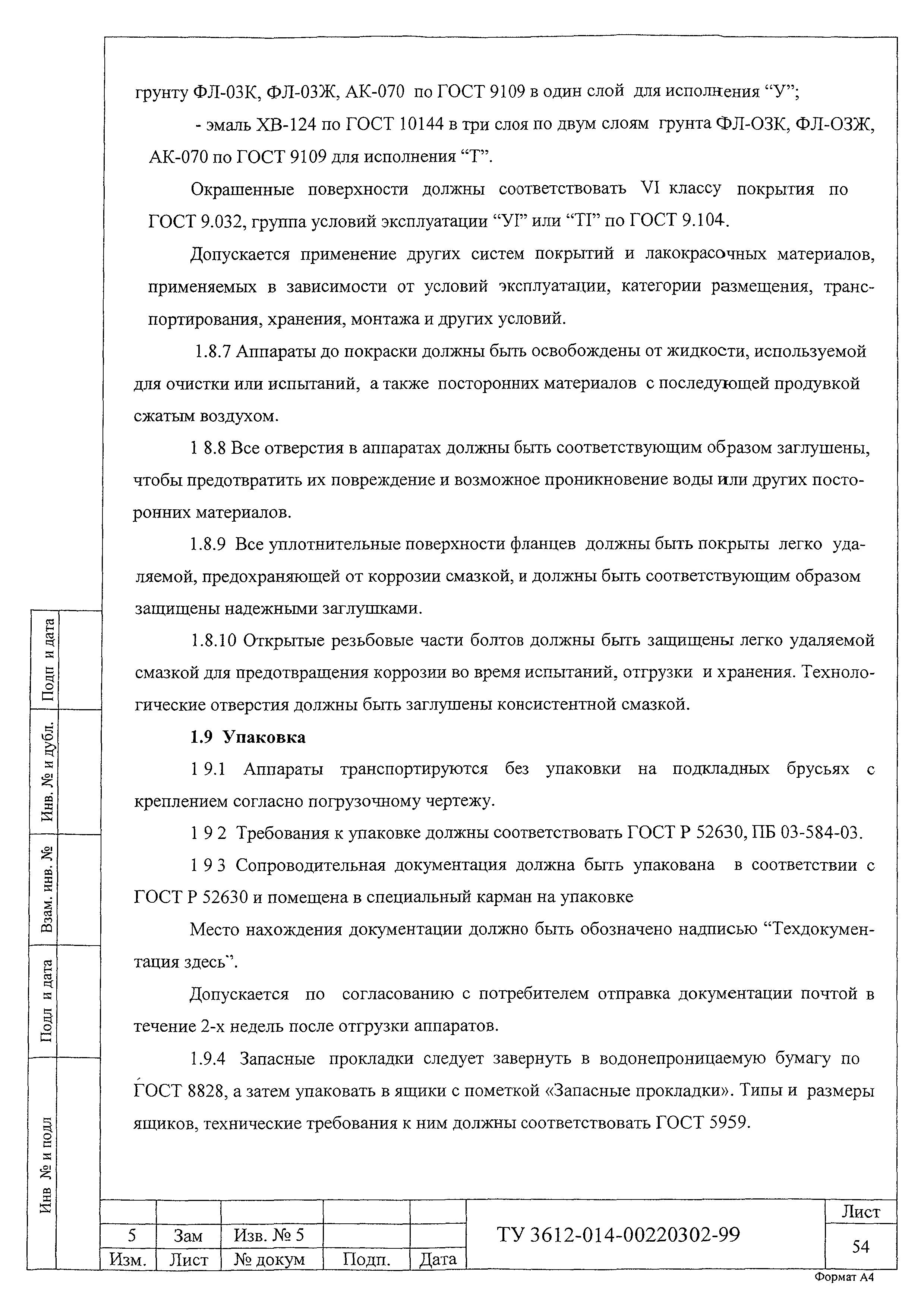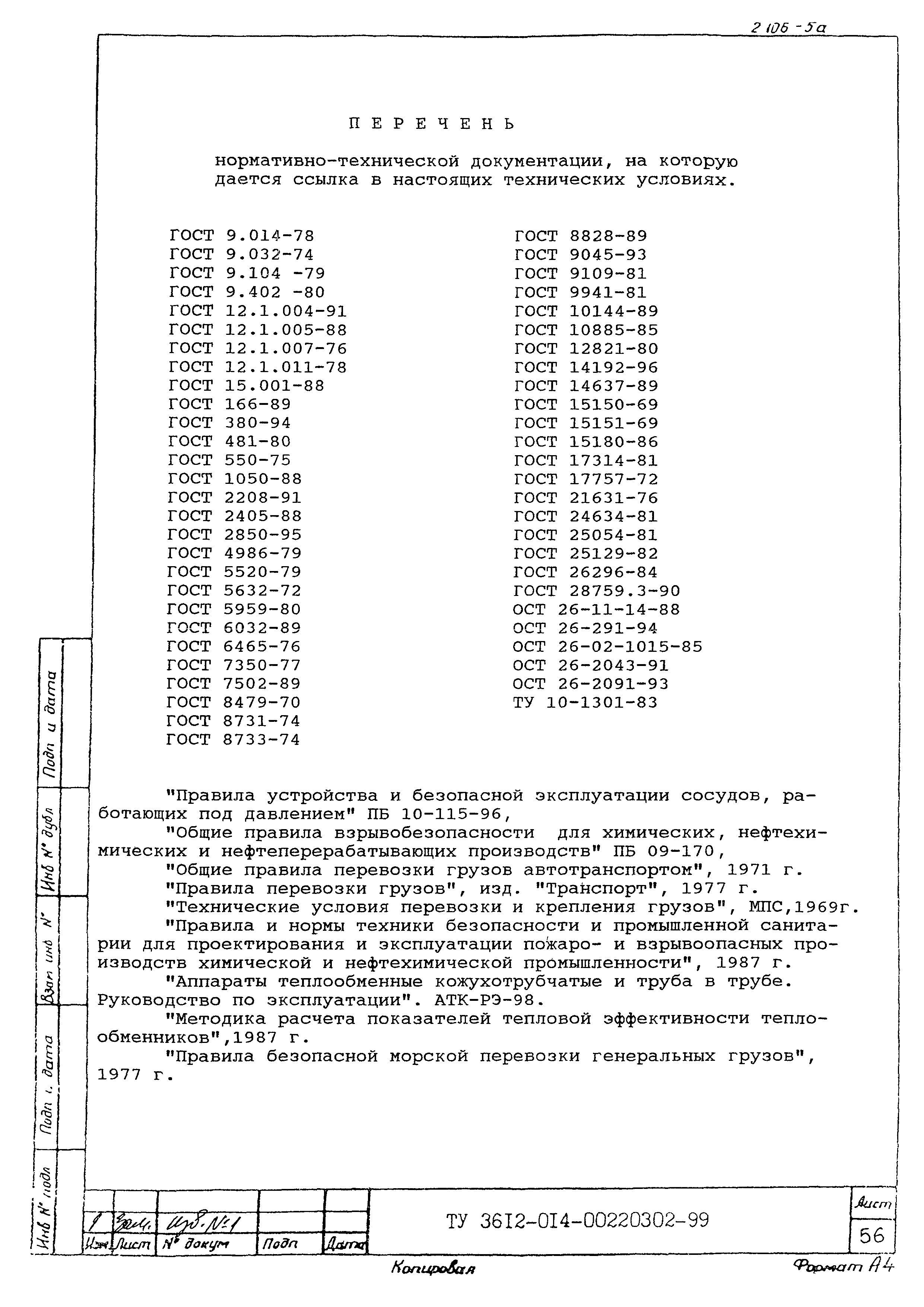 | Нормативные ссылки: |   ПБ 10-115-96 «Правила устройства и безопасной эксплуатации сосудов, работающих под давлением»  ГОСТ 380-94 «Сталь углеродистая обыкновенного качества. Марки»  ГОСТ 1050-88 «Прокат сортовой, калиброванный, со специальной отделкой поверхности из углеродистой качественной конструкционной стали. Общие технические условия»  ГОСТ 5520-79 «Прокат листовой из углеродистой, низколегированной и легированной стали для котлов и сосудов, работающих под давлением. Технические условия»  ГОСТ 5632-72 «Стали высоколегированные и сплавы коррозионно-стойкие, жаростойкие и жаропрочные. Марки»  ГОСТ 12.1.004-91 «Система стандартов безопасности труда. Пожарная безопасность. Общие требования»  ГОСТ 12.1.005-88 «Система стандартов безопасности труда. Общие санитарно-гигиенические требования к воздуху рабочей зоны»  ГОСТ 12.1.007-76 «Система стандартов безопасности труда. Вредные вещества. Классификация и общие требования безопасности»  ГОСТ 12.1.011-78 «Система стандартов безопасности труда. Смеси взрывоопасные. Классификация и методы испытаний» ПБ 09-170-97 «Общие правила взрывобезопасности для взрывопожароопасных химических, нефтехимических и нефтеперерабатывающих производств»  ГОСТ 15.001-88 «Система разработки и постановки продукции на производство. Продукция производственно-технического назначения»  ГОСТ 9.032-74 «Единая система защиты от коррозии и старения. Покрытия лакокрасочные. Группы, технические требования и обозначения»  ГОСТ 9.104-79 «Единая система защиты от коррозии и старения. Покрытия лакокрасочные. Группы условий эксплуатации»  ГОСТ 7502-98 «Рулетки измерительные металлические. Технические условия»  ГОСТ 166-89 «Штангенциркули. Технические условия»  ГОСТ 9.014-78 «Единая система защиты от коррозии и старения. Временная противокоррозионная защита изделий. Общие требования»  ГОСТ 8733-74 «Трубы стальные бесшовные холоднодеформированные и теплодеформированные. Технические требования»  ГОСТ 8479-70 «Поковки из конструкционной углеродистой и легированной стали. Общие технические условия»  ГОСТ 8731-74 «Трубы стальные бесшовные горячедеформированные. Технические требования»  ГОСТ 481-80 «Паронит и прокладки из него. Технические условия»  ГОСТ 2405-88 «Манометры, вакуумметры, мановакуумметры, напоромеры, тягомеры и тягонапоромеры. Общие технические условия»  ГОСТ 550-75 «Трубы стальные бесшовные для нефтеперерабатывающей и нефтехимической промышленности. Технические условия»  ГОСТ 7350-77 «Сталь толстолистовая коррозионно-стойкая, жаростойкая и жаропрочная. Технические условия»  ГОСТ 4986-79 «Лента холоднокатаная из коррозионно-стойкой и жаростойкой стали. Технические условия»  ГОСТ 6465-76 «Эмали ПФ-115. Технические условия»  ГОСТ 2208-91 «Ленты латунные общего назначения. Технические условия» ГОСТ 5959-80 «Ящики из листовых древесных материалов неразборные для грузов массой до 200 кг. Общие технические условия» ГОСТ 6032-89 «Стали и сплавы коррозионно-стойкие. Методы испытания на стойкость против межкристаллитной коррозии»  ГОСТ 9.402-2004 «Единая система защиты от коррозии и старения. Покрытия лакокрасочные. Подготовка металлических поверхностей к окрашиванию»