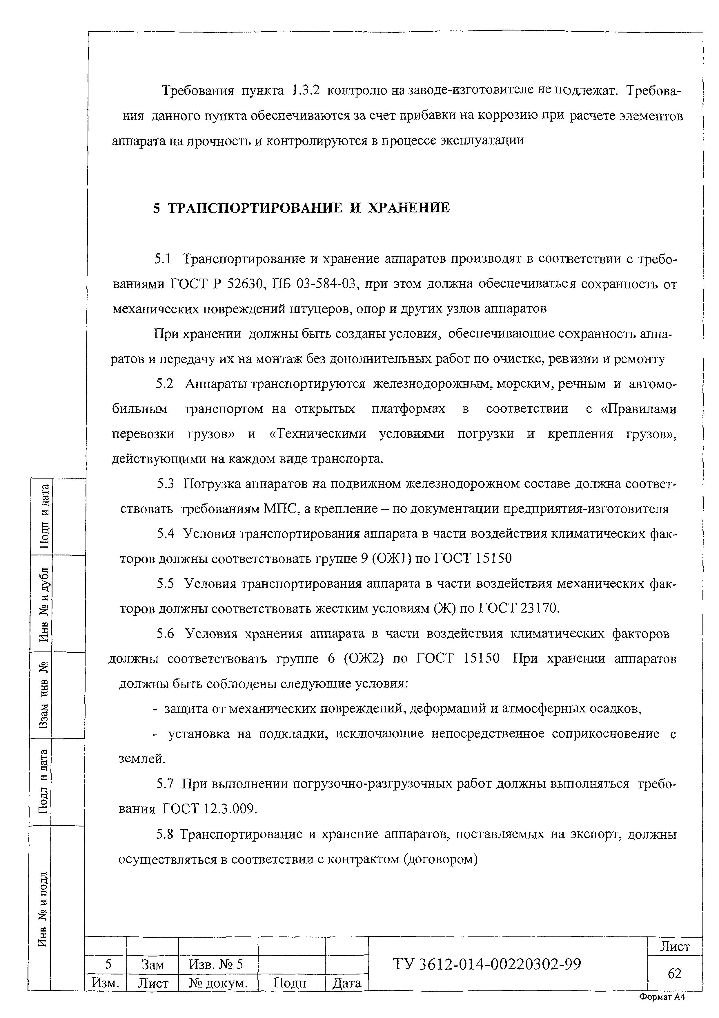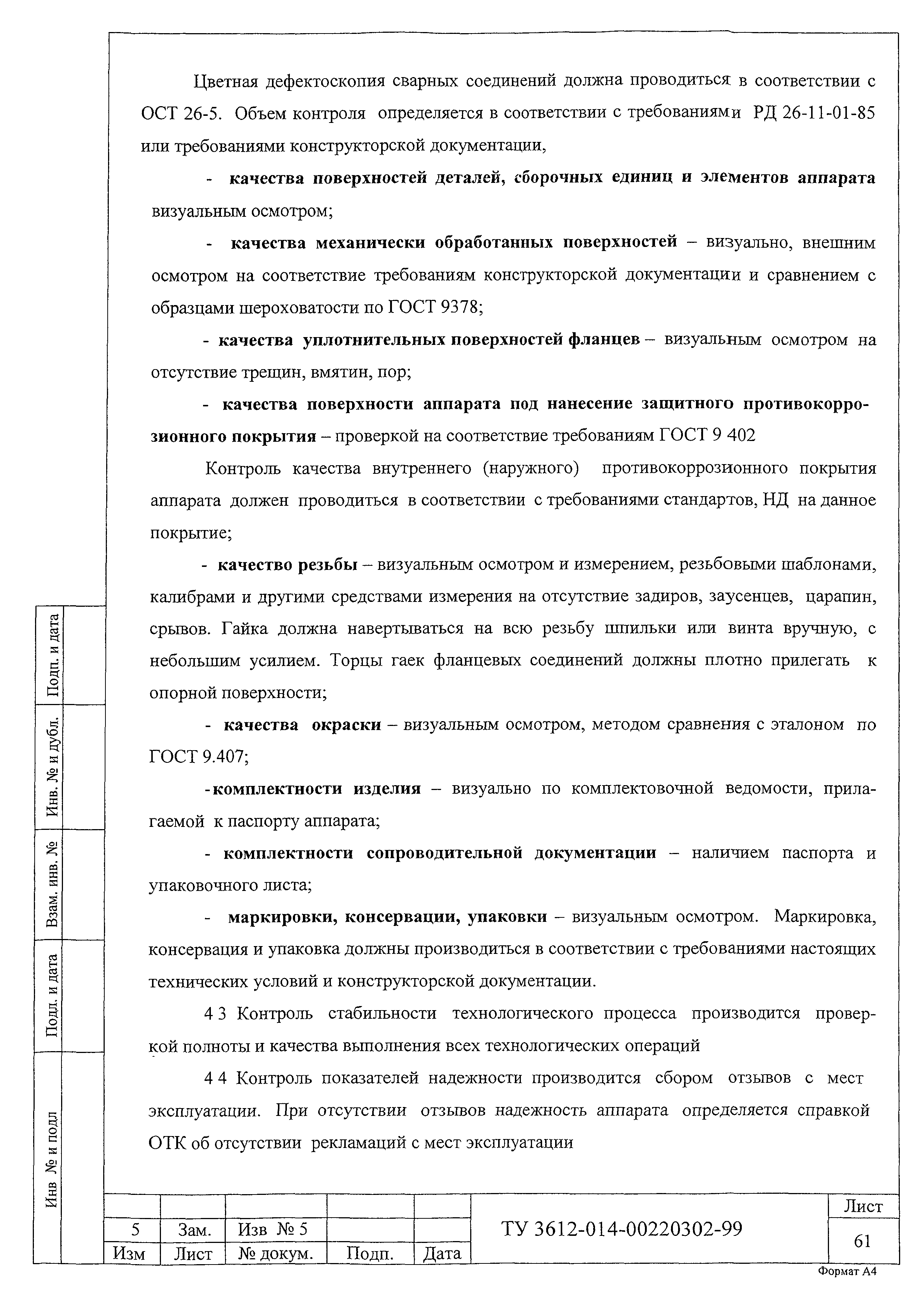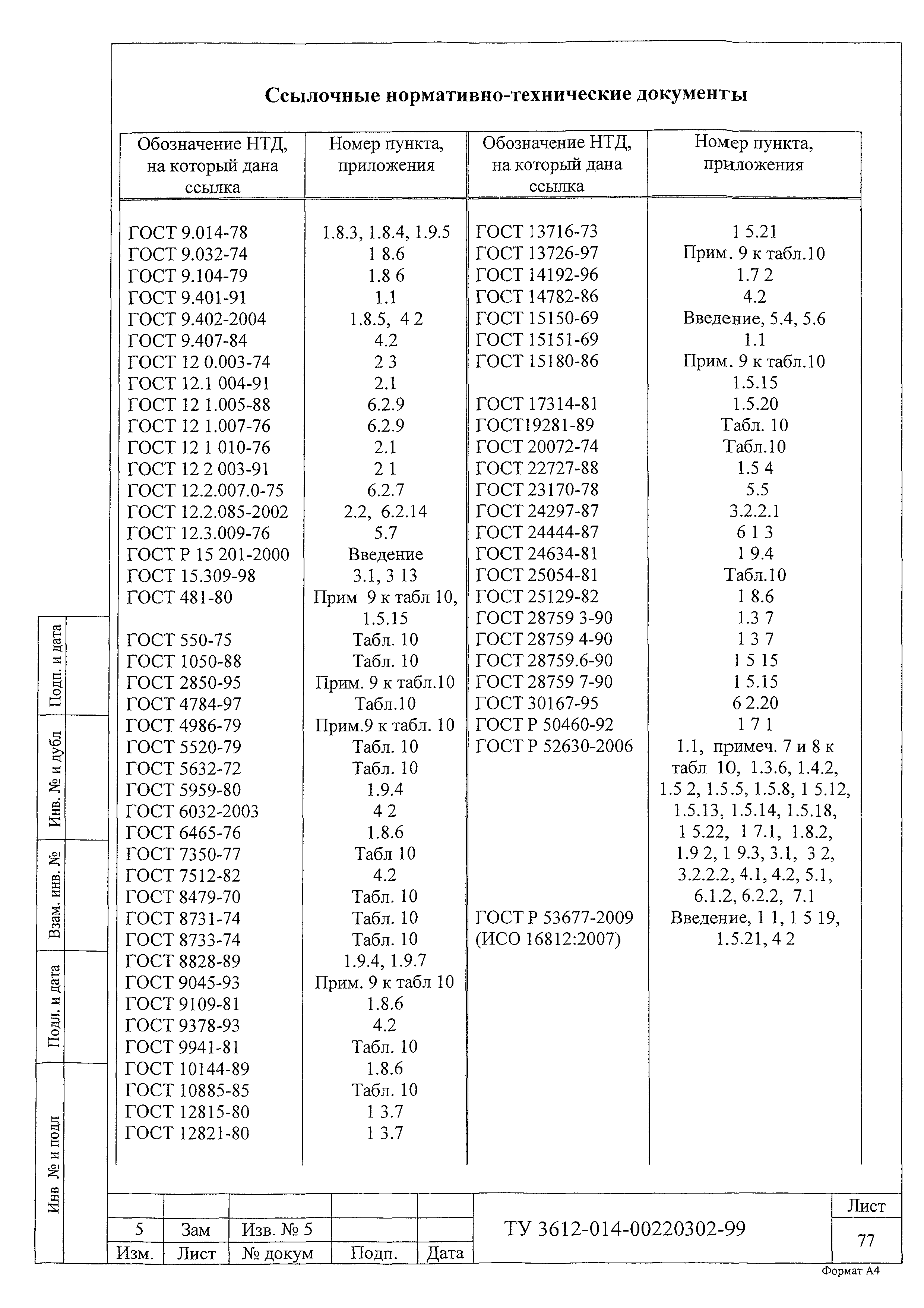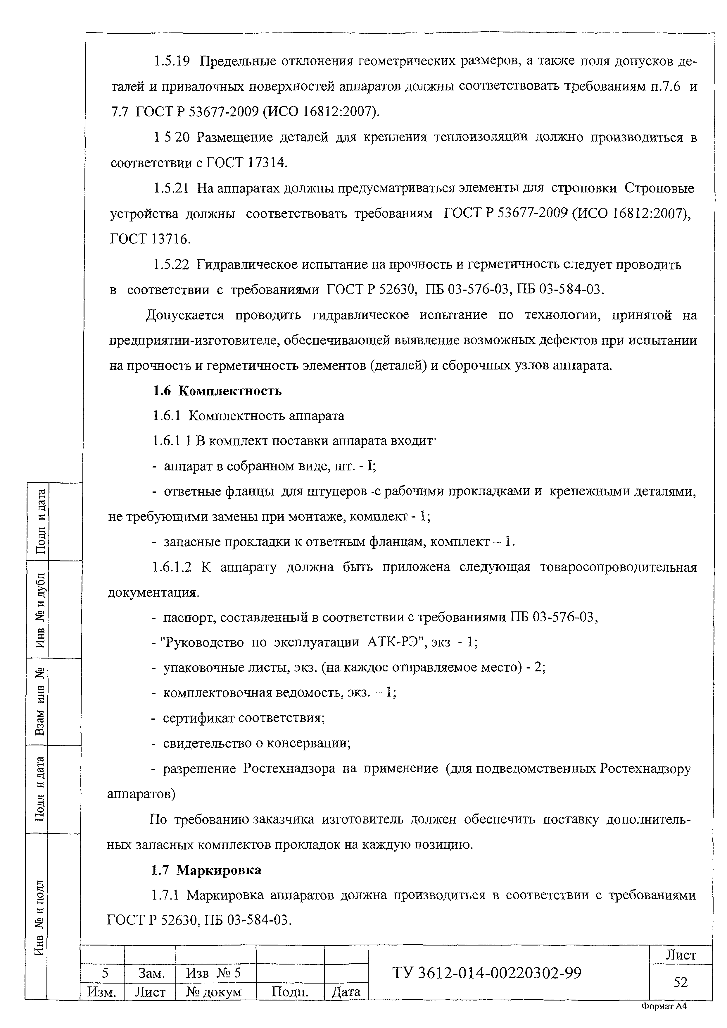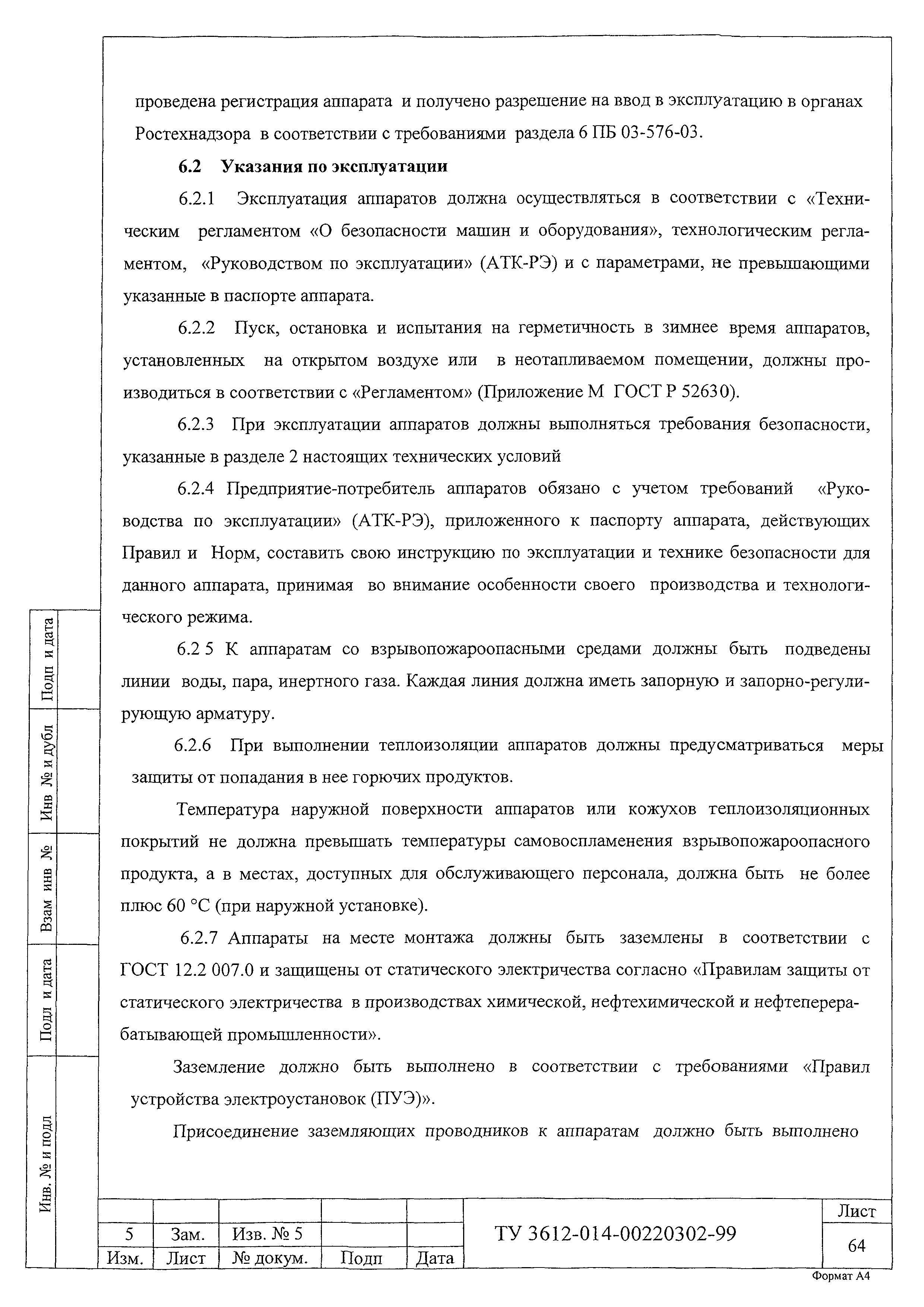 | Нормативные ссылки: |   ПБ 10-115-96 «Правила устройства и безопасной эксплуатации сосудов, работающих под давлением»  ГОСТ 380-94 «Сталь углеродистая обыкновенного качества. Марки»  ГОСТ 1050-88 «Прокат сортовой, калиброванный, со специальной отделкой поверхности из углеродистой качественной конструкционной стали. Общие технические условия»  ГОСТ 5520-79 «Прокат листовой из углеродистой, низколегированной и легированной стали для котлов и сосудов, работающих под давлением. Технические условия»  ГОСТ 5632-72 «Стали высоколегированные и сплавы коррозионно-стойкие, жаростойкие и жаропрочные. Марки»  ГОСТ 12.1.004-91 «Система стандартов безопасности труда. Пожарная безопасность. Общие требования»  ГОСТ 12.1.005-88 «Система стандартов безопасности труда. Общие санитарно-гигиенические требования к воздуху рабочей зоны»  ГОСТ 12.1.007-76 «Система стандартов безопасности труда. Вредные вещества. Классификация и общие требования безопасности»  ГОСТ 12.1.011-78 «Система стандартов безопасности труда. Смеси взрывоопасные. Классификация и методы испытаний» ПБ 09-170-97 «Общие правила взрывобезопасности для взрывопожароопасных химических, нефтехимических и нефтеперерабатывающих производств»  ГОСТ 15.001-88 «Система разработки и постановки продукции на производство. Продукция производственно-технического назначения»  ГОСТ 9.032-74 «Единая система защиты от коррозии и старения. Покрытия лакокрасочные. Группы, технические требования и обозначения»  ГОСТ 9.104-79 «Единая система защиты от коррозии и старения. Покрытия лакокрасочные. Группы условий эксплуатации»  ГОСТ 7502-98 «Рулетки измерительные металлические. Технические условия»  ГОСТ 166-89 «Штангенциркули. Технические условия»  ГОСТ 9.014-78 «Единая система защиты от коррозии и старения. Временная противокоррозионная защита изделий. Общие требования»  ГОСТ 8733-74 «Трубы стальные бесшовные холоднодеформированные и теплодеформированные. Технические требования»  ГОСТ 8479-70 «Поковки из конструкционной углеродистой и легированной стали. Общие технические условия»  ГОСТ 8731-74 «Трубы стальные бесшовные горячедеформированные. Технические требования»  ГОСТ 481-80 «Паронит и прокладки из него. Технические условия»  ГОСТ 2405-88 «Манометры, вакуумметры, мановакуумметры, напоромеры, тягомеры и тягонапоромеры. Общие технические условия»  ГОСТ 550-75 «Трубы стальные бесшовные для нефтеперерабатывающей и нефтехимической промышленности. Технические условия»  ГОСТ 7350-77 «Сталь толстолистовая коррозионно-стойкая, жаростойкая и жаропрочная. Технические условия»  ГОСТ 4986-79 «Лента холоднокатаная из коррозионно-стойкой и жаростойкой стали. Технические условия»  ГОСТ 6465-76 «Эмали ПФ-115. Технические условия»  ГОСТ 2208-91 «Ленты латунные общего назначения. Технические условия» ГОСТ 5959-80 «Ящики из листовых древесных материалов неразборные для грузов массой до 200 кг. Общие технические условия» ГОСТ 6032-89 «Стали и сплавы коррозионно-стойкие. Методы испытания на стойкость против межкристаллитной коррозии»  ГОСТ 9.402-2004 «Единая система защиты от коррозии и старения. Покрытия лакокрасочные. Подготовка металлических поверхностей к окрашиванию»