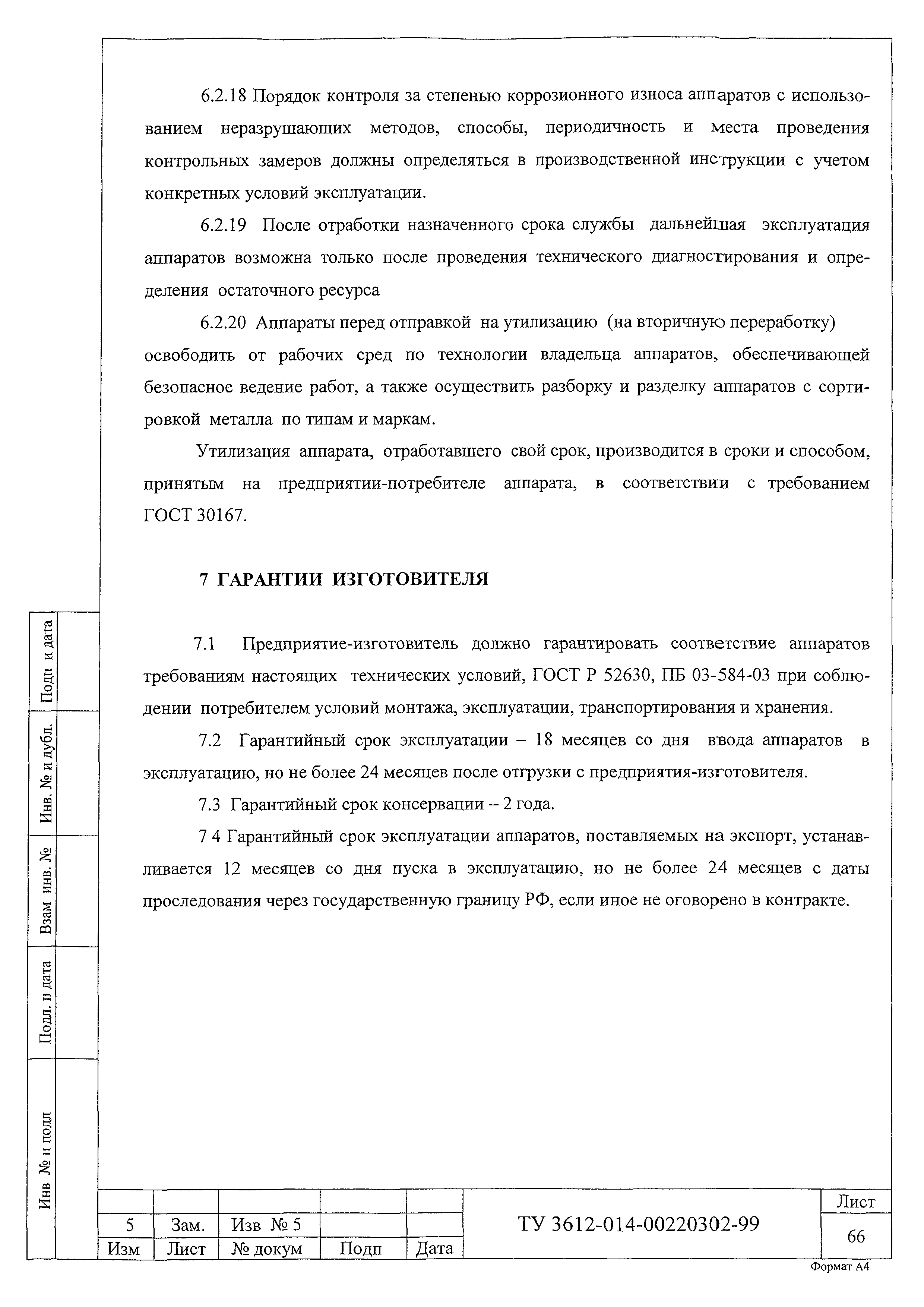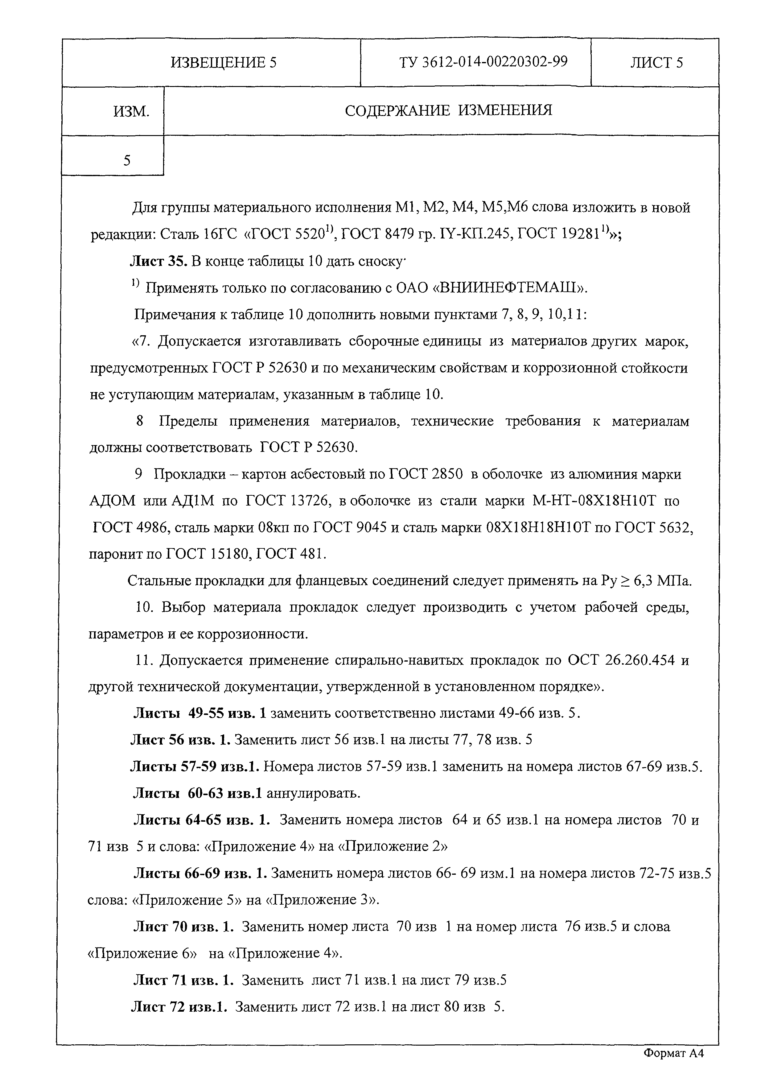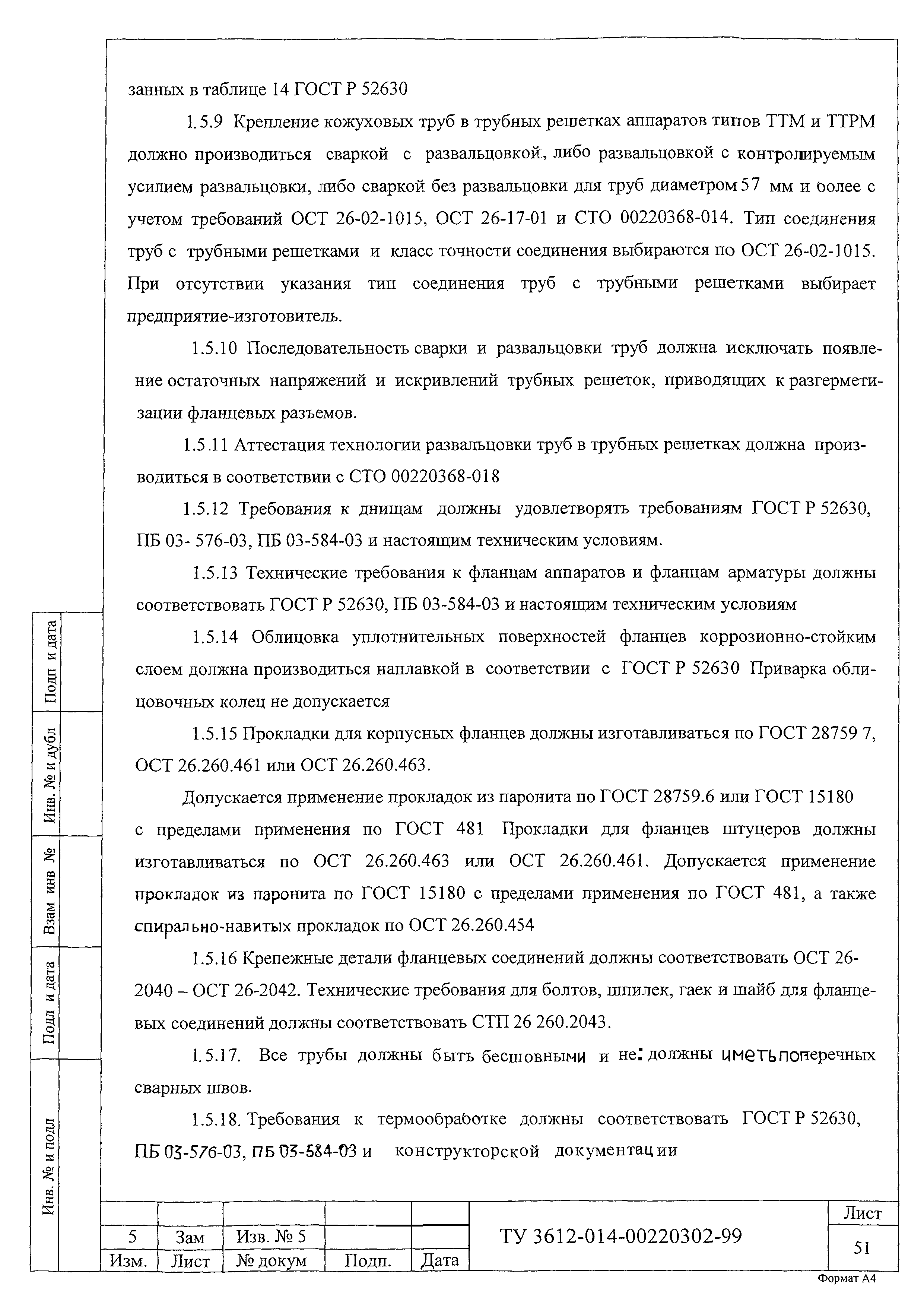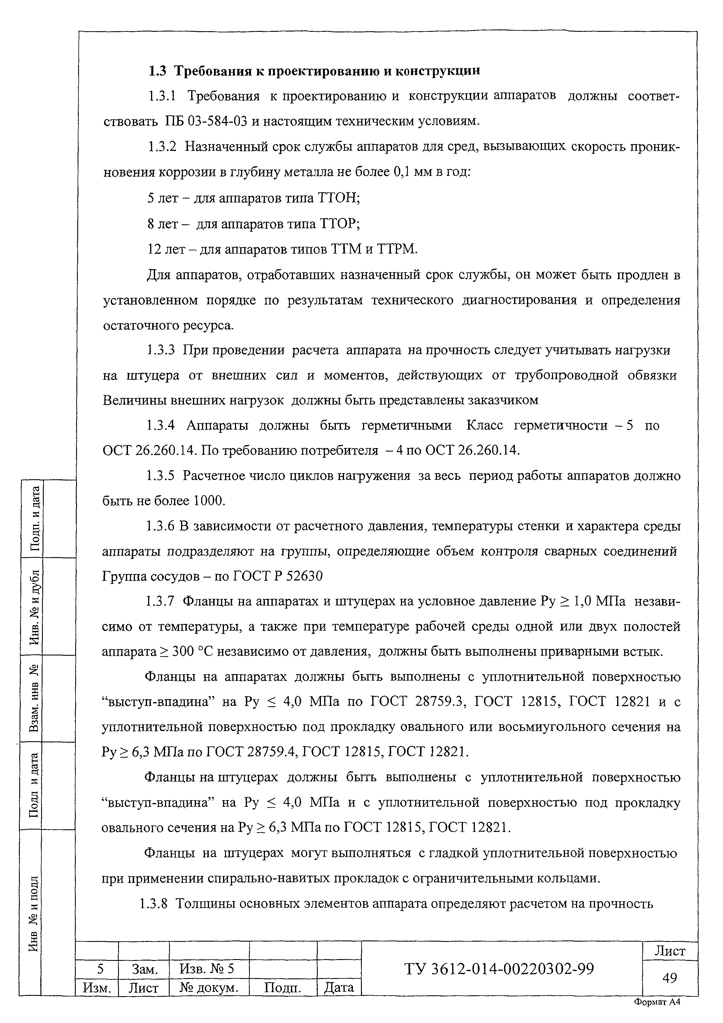 | Нормативные ссылки: |   ПБ 10-115-96 «Правила устройства и безопасной эксплуатации сосудов, работающих под давлением»  ГОСТ 380-94 «Сталь углеродистая обыкновенного качества. Марки»  ГОСТ 1050-88 «Прокат сортовой, калиброванный, со специальной отделкой поверхности из углеродистой качественной конструкционной стали. Общие технические условия»  ГОСТ 5520-79 «Прокат листовой из углеродистой, низколегированной и легированной стали для котлов и сосудов, работающих под давлением. Технические условия»  ГОСТ 5632-72 «Стали высоколегированные и сплавы коррозионно-стойкие, жаростойкие и жаропрочные. Марки»  ГОСТ 12.1.004-91 «Система стандартов безопасности труда. Пожарная безопасность. Общие требования»  ГОСТ 12.1.005-88 «Система стандартов безопасности труда. Общие санитарно-гигиенические требования к воздуху рабочей зоны»  ГОСТ 12.1.007-76 «Система стандартов безопасности труда. Вредные вещества. Классификация и общие требования безопасности»  ГОСТ 12.1.011-78 «Система стандартов безопасности труда. Смеси взрывоопасные. Классификация и методы испытаний» ПБ 09-170-97 «Общие правила взрывобезопасности для взрывопожароопасных химических, нефтехимических и нефтеперерабатывающих производств»  ГОСТ 15.001-88 «Система разработки и постановки продукции на производство. Продукция производственно-технического назначения»  ГОСТ 9.032-74 «Единая система защиты от коррозии и старения. Покрытия лакокрасочные. Группы, технические требования и обозначения»  ГОСТ 9.104-79 «Единая система защиты от коррозии и старения. Покрытия лакокрасочные. Группы условий эксплуатации»  ГОСТ 7502-98 «Рулетки измерительные металлические. Технические условия»  ГОСТ 166-89 «Штангенциркули. Технические условия»  ГОСТ 9.014-78 «Единая система защиты от коррозии и старения. Временная противокоррозионная защита изделий. Общие требования»  ГОСТ 8733-74 «Трубы стальные бесшовные холоднодеформированные и теплодеформированные. Технические требования»  ГОСТ 8479-70 «Поковки из конструкционной углеродистой и легированной стали. Общие технические условия»  ГОСТ 8731-74 «Трубы стальные бесшовные горячедеформированные. Технические требования»  ГОСТ 481-80 «Паронит и прокладки из него. Технические условия»  ГОСТ 2405-88 «Манометры, вакуумметры, мановакуумметры, напоромеры, тягомеры и тягонапоромеры. Общие технические условия»  ГОСТ 550-75 «Трубы стальные бесшовные для нефтеперерабатывающей и нефтехимической промышленности. Технические условия»  ГОСТ 7350-77 «Сталь толстолистовая коррозионно-стойкая, жаростойкая и жаропрочная. Технические условия»  ГОСТ 4986-79 «Лента холоднокатаная из коррозионно-стойкой и жаростойкой стали. Технические условия»  ГОСТ 6465-76 «Эмали ПФ-115. Технические условия»  ГОСТ 2208-91 «Ленты латунные общего назначения. Технические условия» ГОСТ 5959-80 «Ящики из листовых древесных материалов неразборные для грузов массой до 200 кг. Общие технические условия» ГОСТ 6032-89 «Стали и сплавы коррозионно-стойкие. Методы испытания на стойкость против межкристаллитной коррозии»  ГОСТ 9.402-2004 «Единая система защиты от коррозии и старения. Покрытия лакокрасочные. Подготовка металлических поверхностей к окрашиванию»