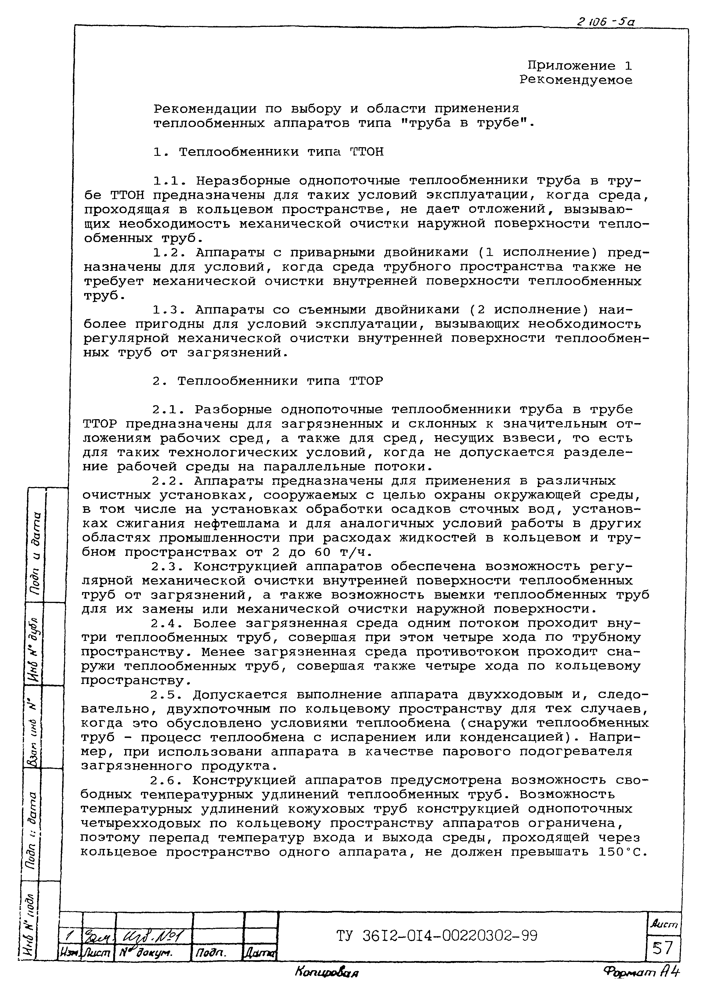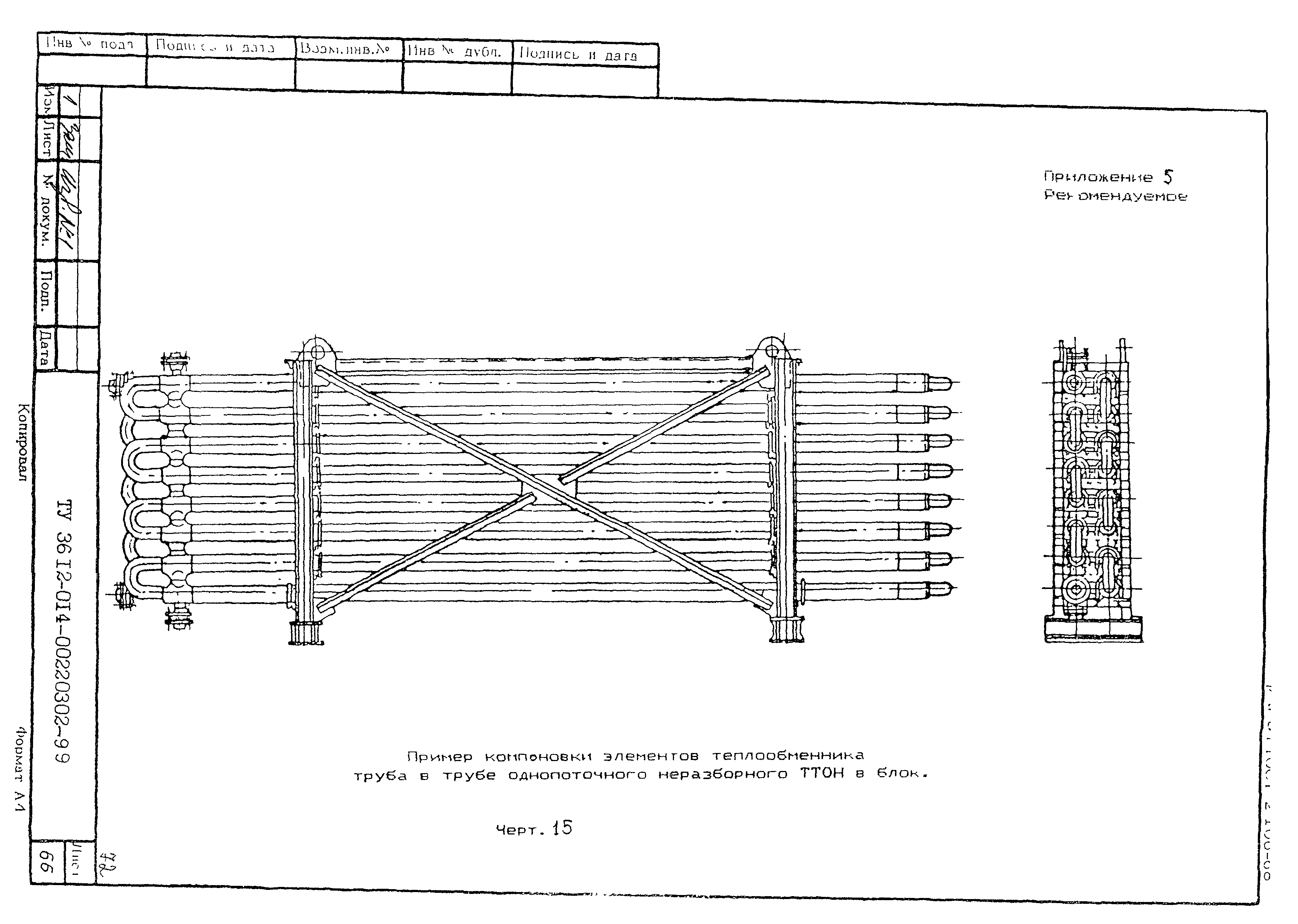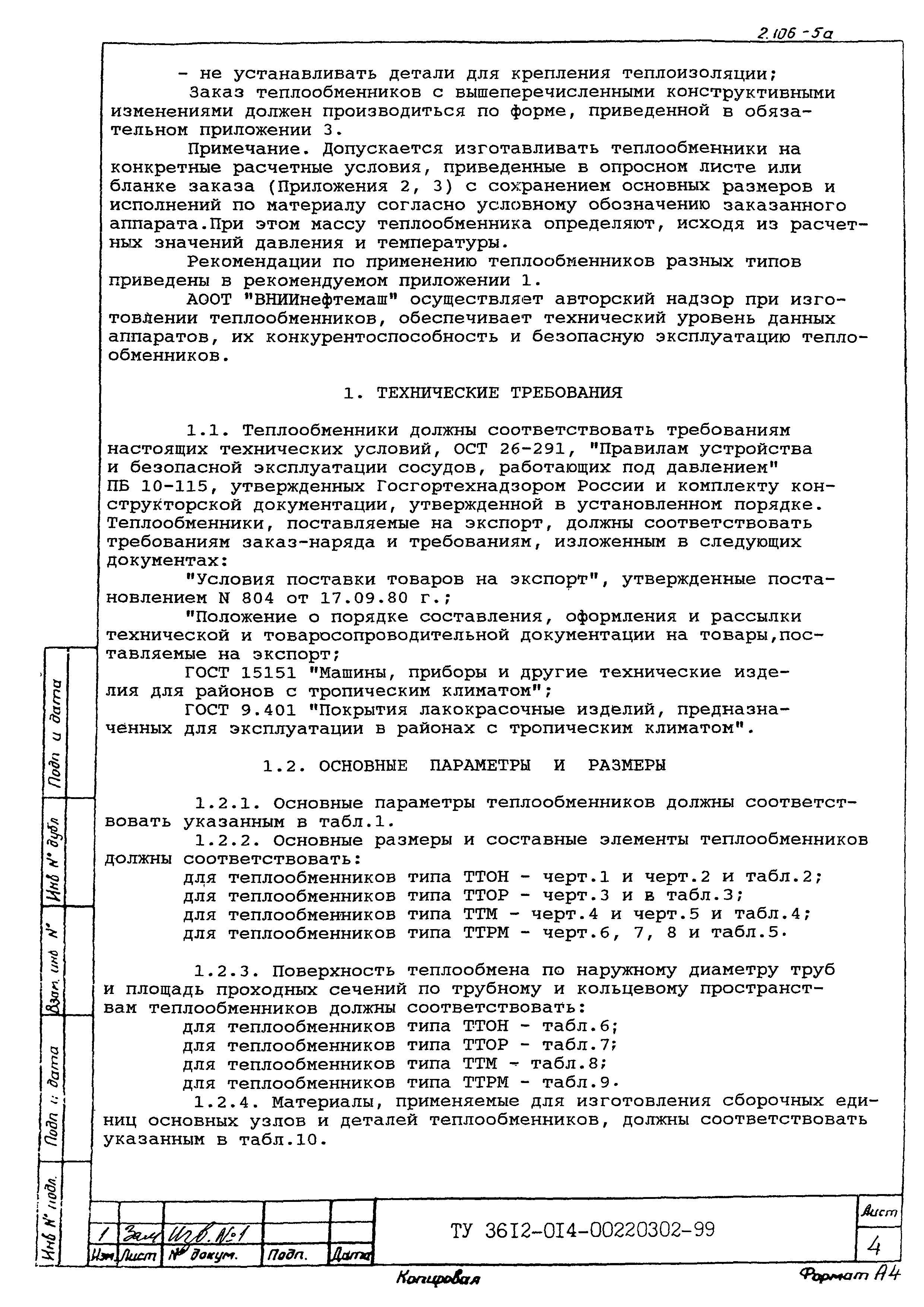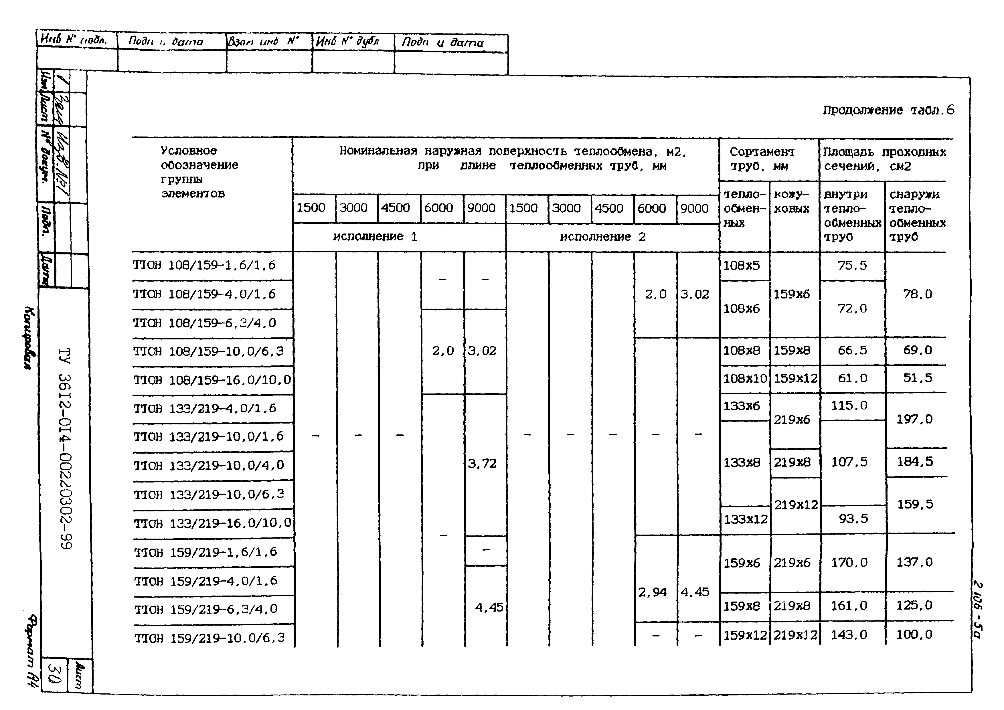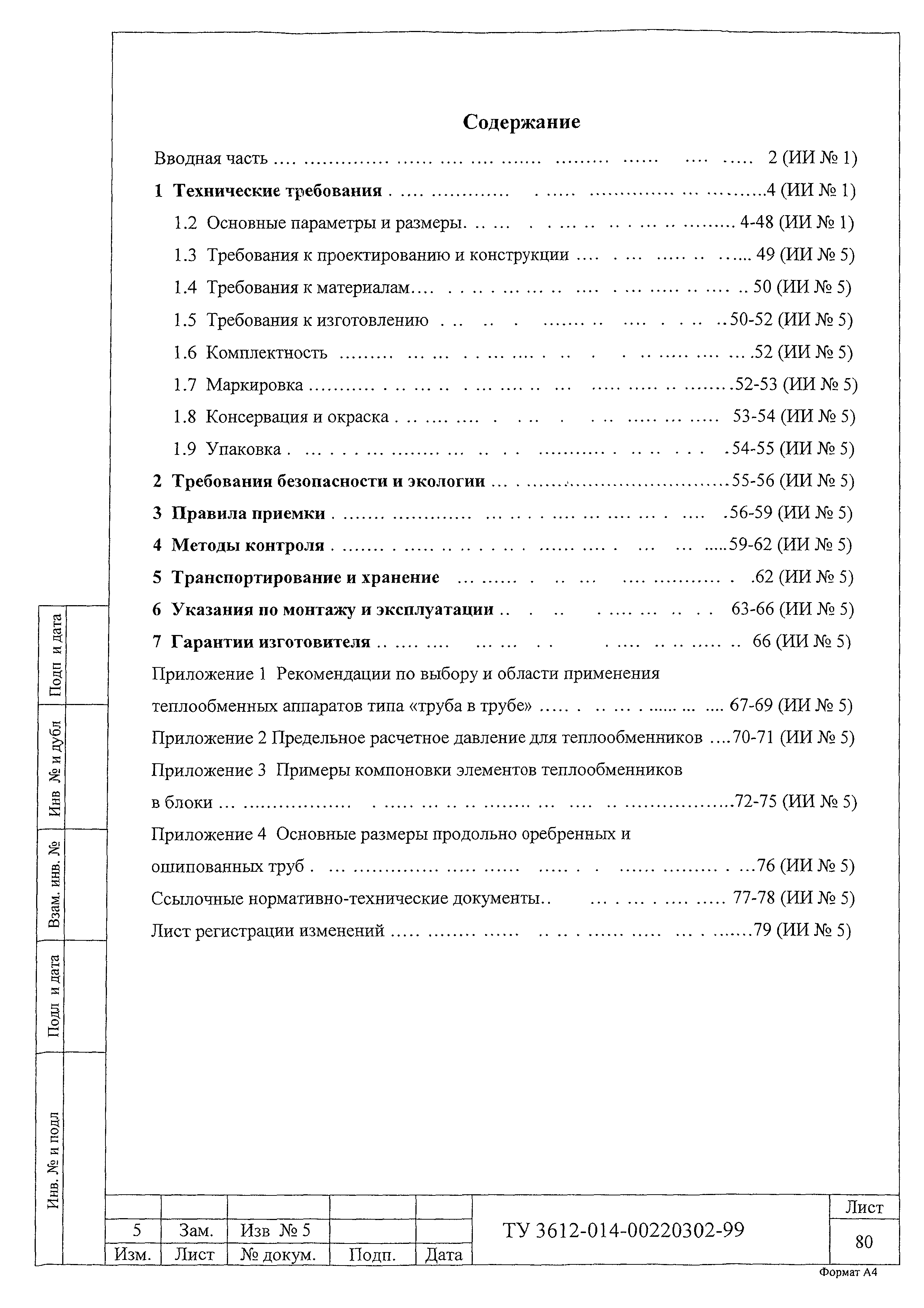 | Оглавление: | Вводная часть 1. Технические требования 1.2 Основные параметры и размеры 1.3 Требования к изготовлению 1.4 Комплектность 1.5 Маркировка 1.6 Упаковка 2. Требования безопасности и экологии 3. Правила приемки 4. Методы контроля 5. Транспортирование и хранение 6. Указания по эксплуатации 7. Гарантии изготовителя Перечень нормативно-технической документации Приложение 1. Рекомендации по выбору и области применения Приложение 2. Опросный лист теплообменного аппарата по ТУ Приложение 3. Бланк заказа теплообменника по ТУ Приложение 4. Предельное расчетное давление в зависимости от температуры среды Приложение 5. Примеры компоновки элементов теплообменников в блок Приложение 6. Трубы ребристые, алюминиевые и ошипованные Лист регистрации изменений |