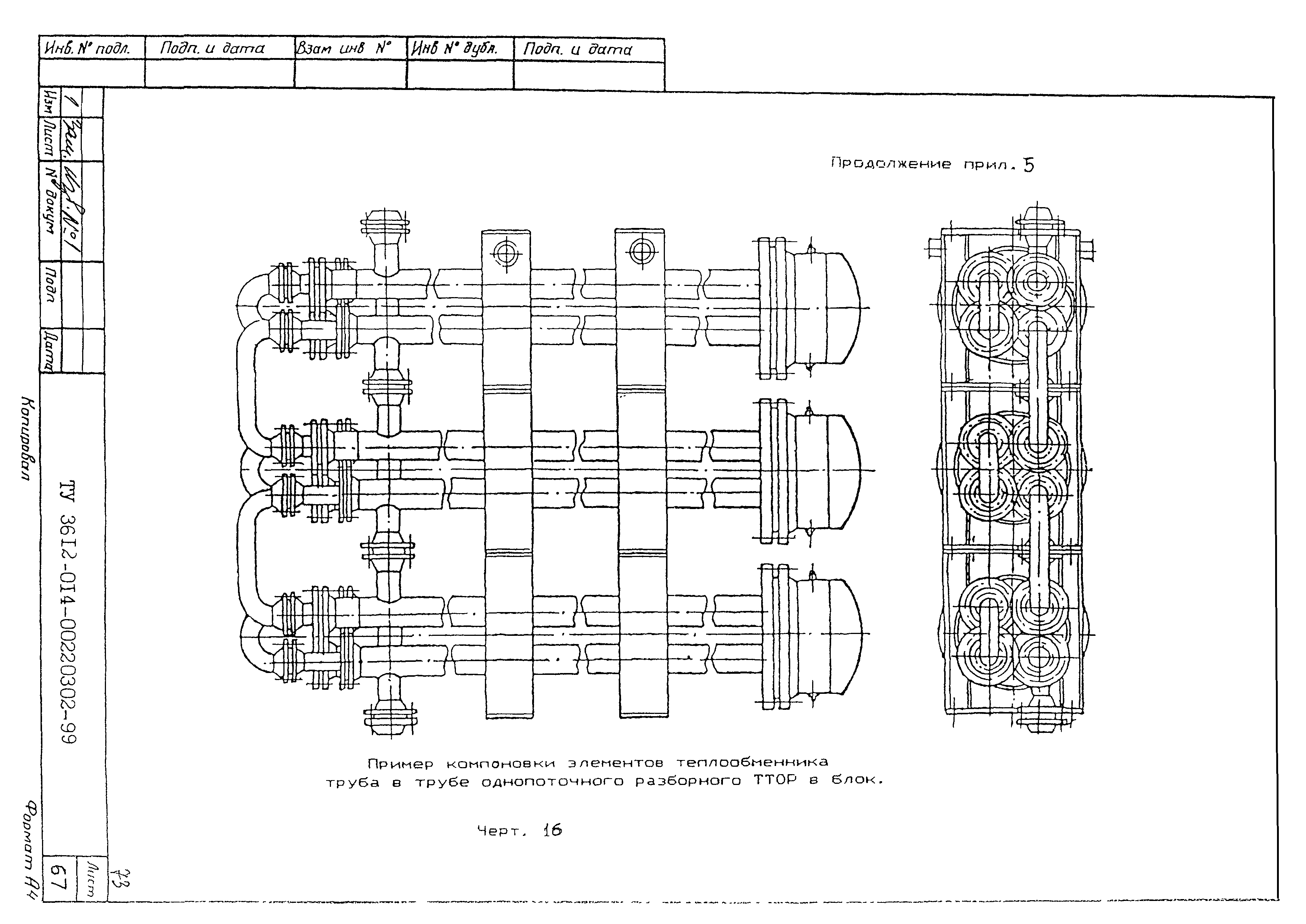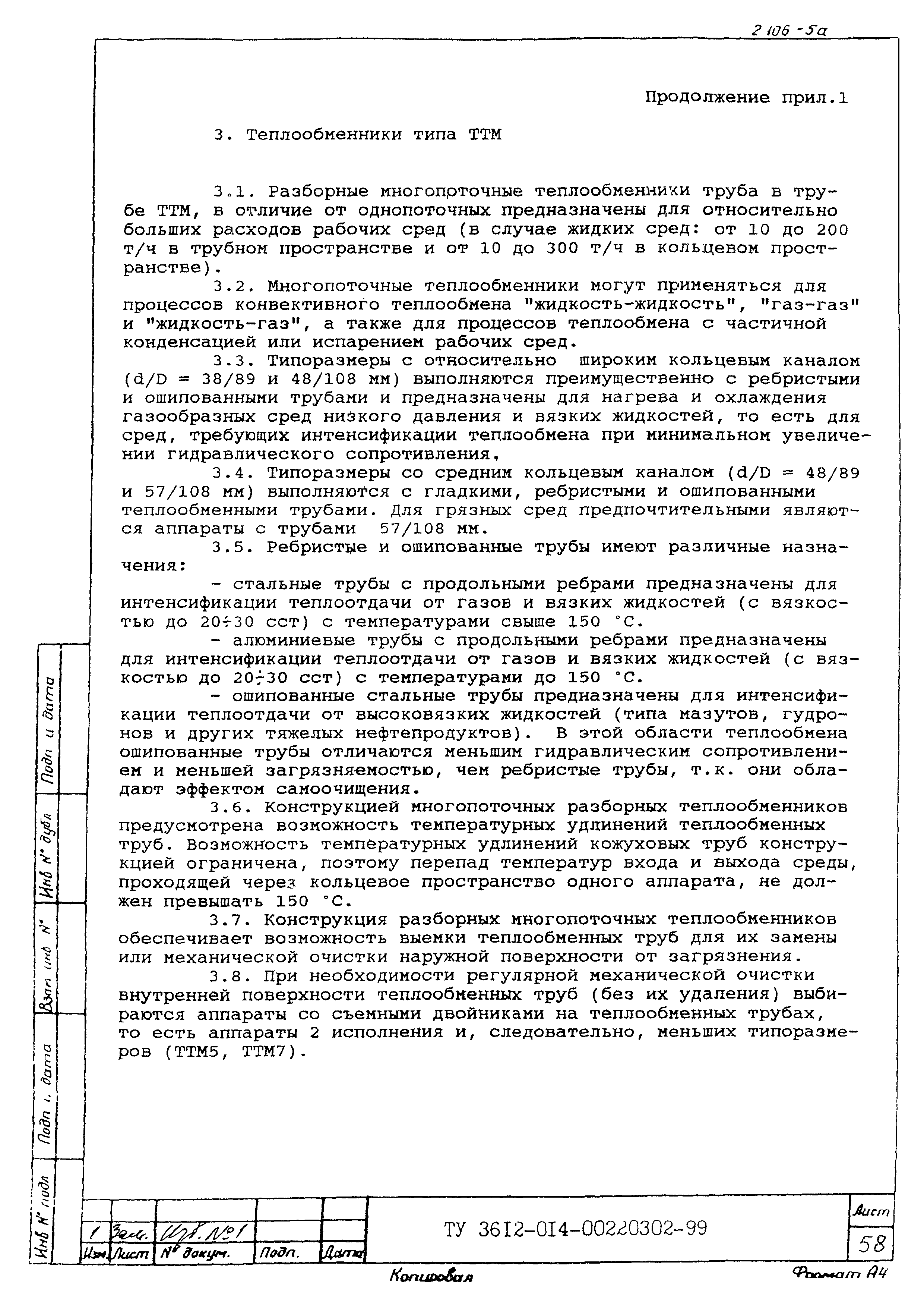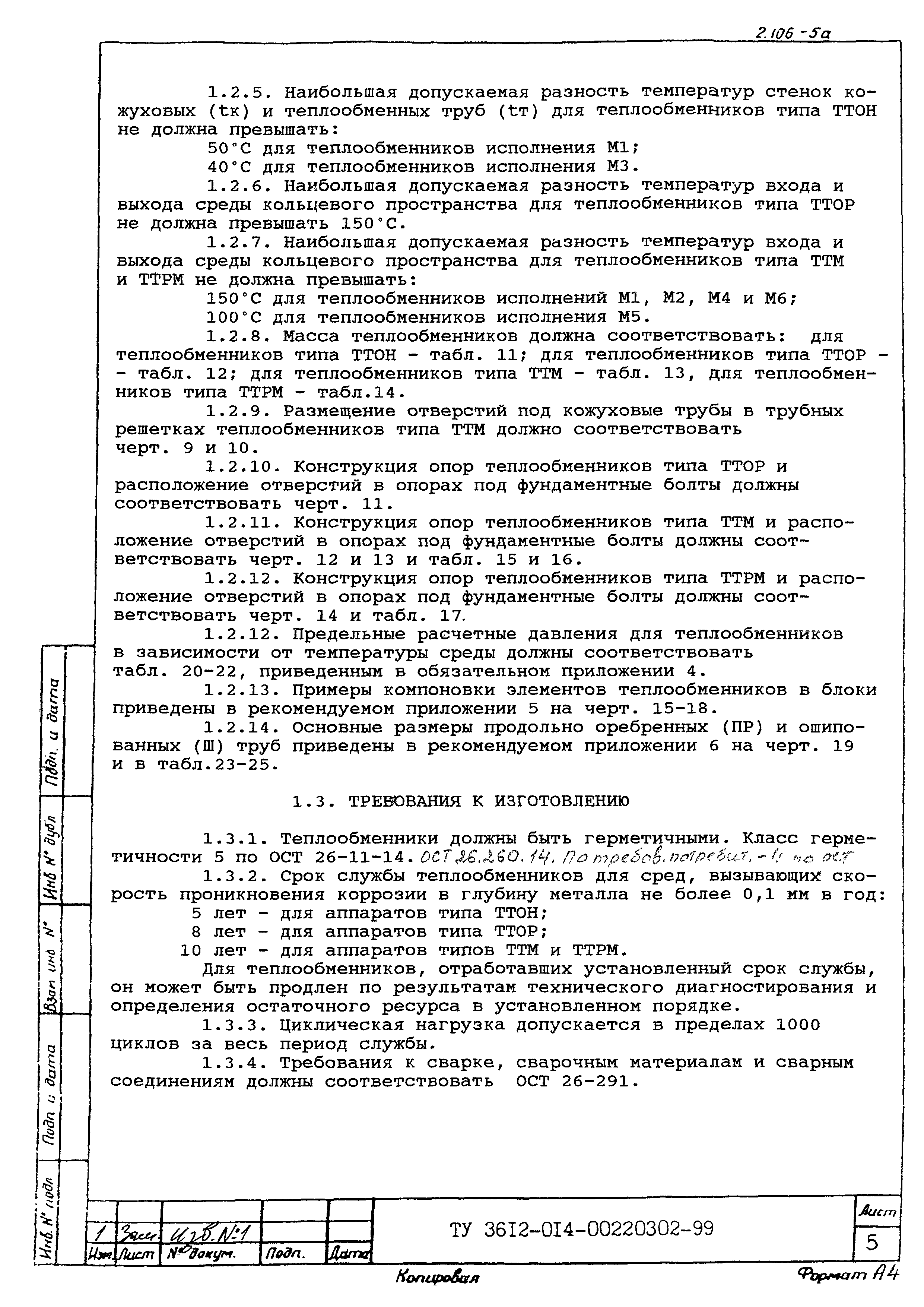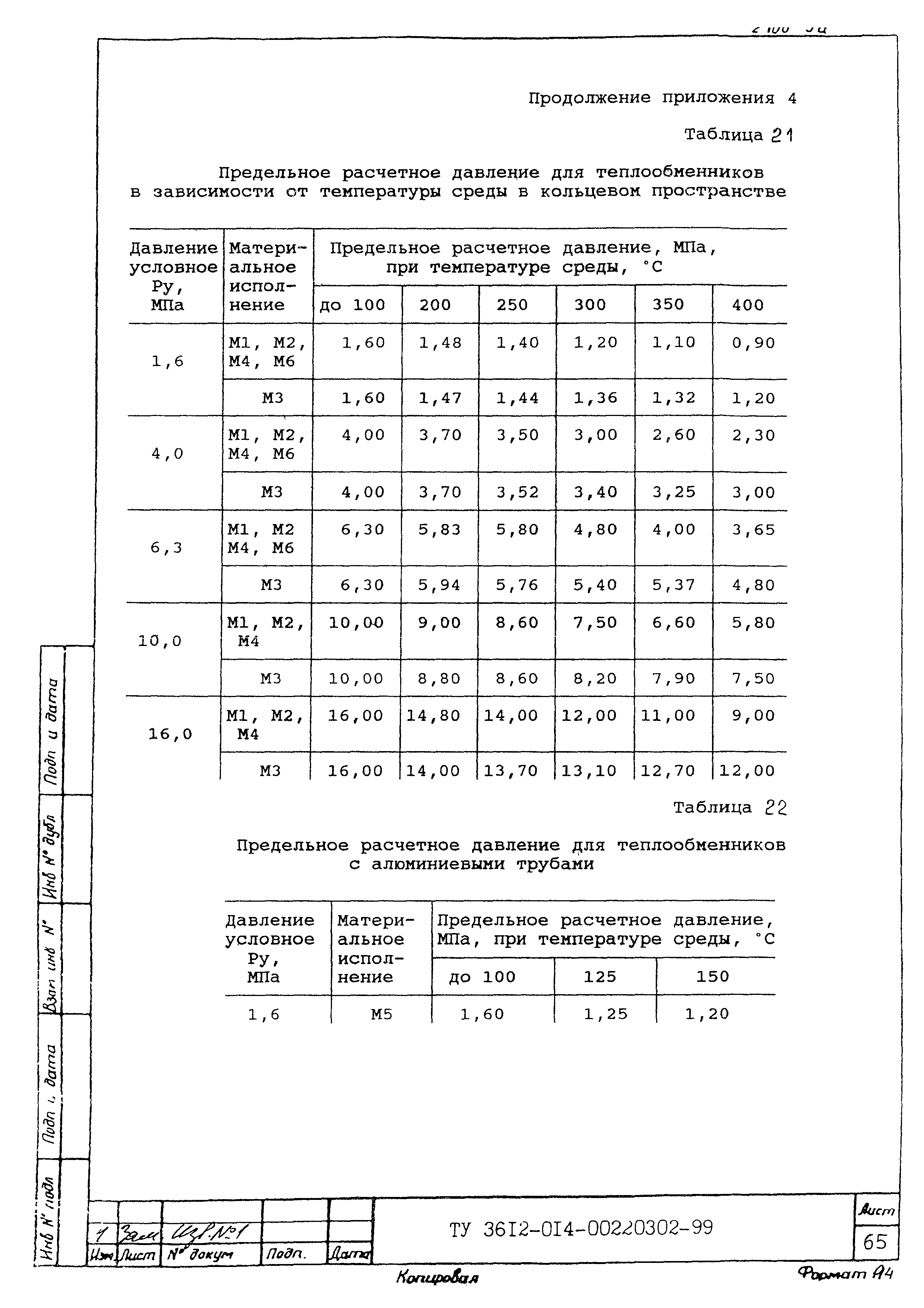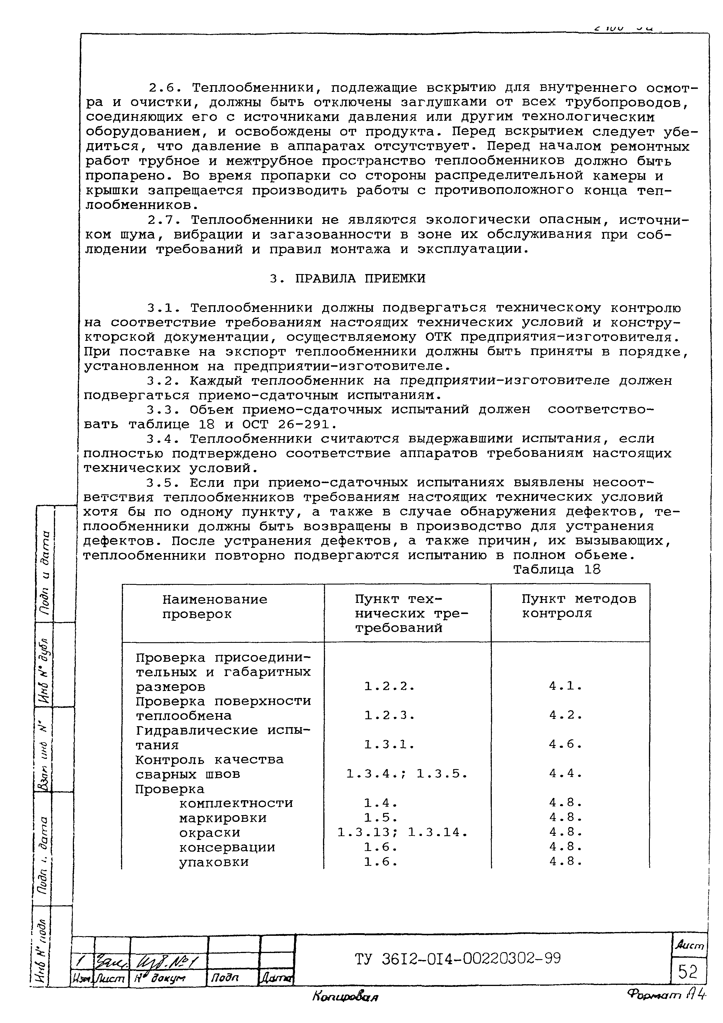 | Оглавление: | Вводная часть 1. Технические требования 1.2 Основные параметры и размеры 1.3 Требования к изготовлению 1.4 Комплектность 1.5 Маркировка 1.6 Упаковка 2. Требования безопасности и экологии 3. Правила приемки 4. Методы контроля 5. Транспортирование и хранение 6. Указания по эксплуатации 7. Гарантии изготовителя Перечень нормативно-технической документации Приложение 1. Рекомендации по выбору и области применения Приложение 2. Опросный лист теплообменного аппарата по ТУ Приложение 3. Бланк заказа теплообменника по ТУ Приложение 4. Предельное расчетное давление в зависимости от температуры среды Приложение 5. Примеры компоновки элементов теплообменников в блок Приложение 6. Трубы ребристые, алюминиевые и ошипованные Лист регистрации изменений |