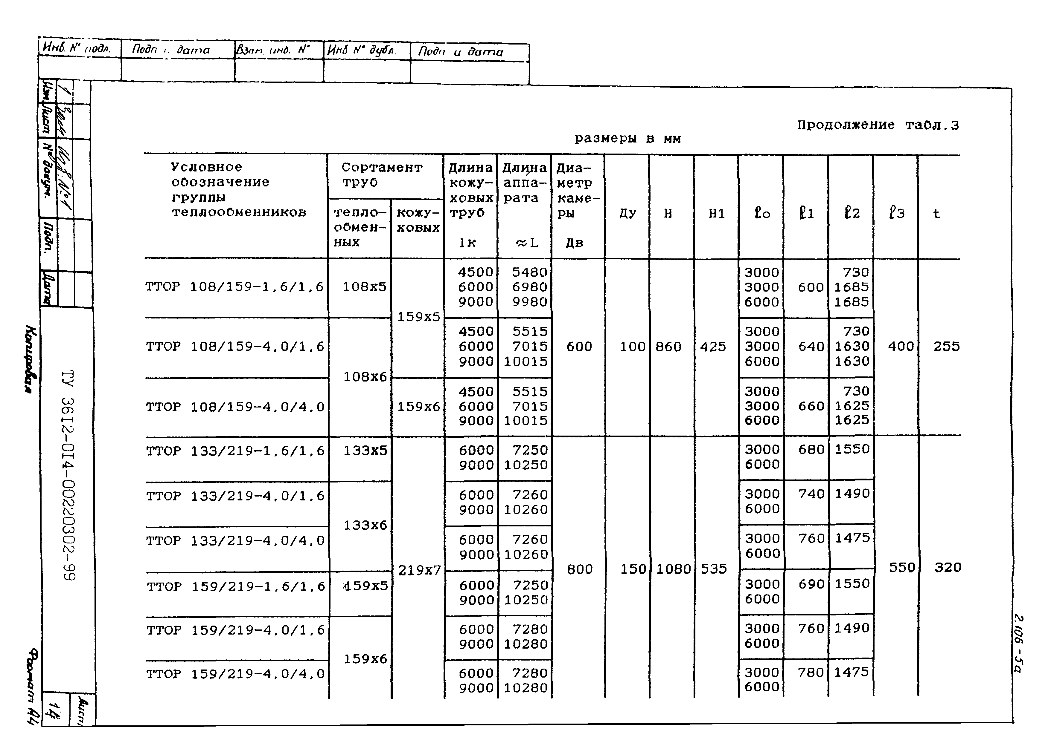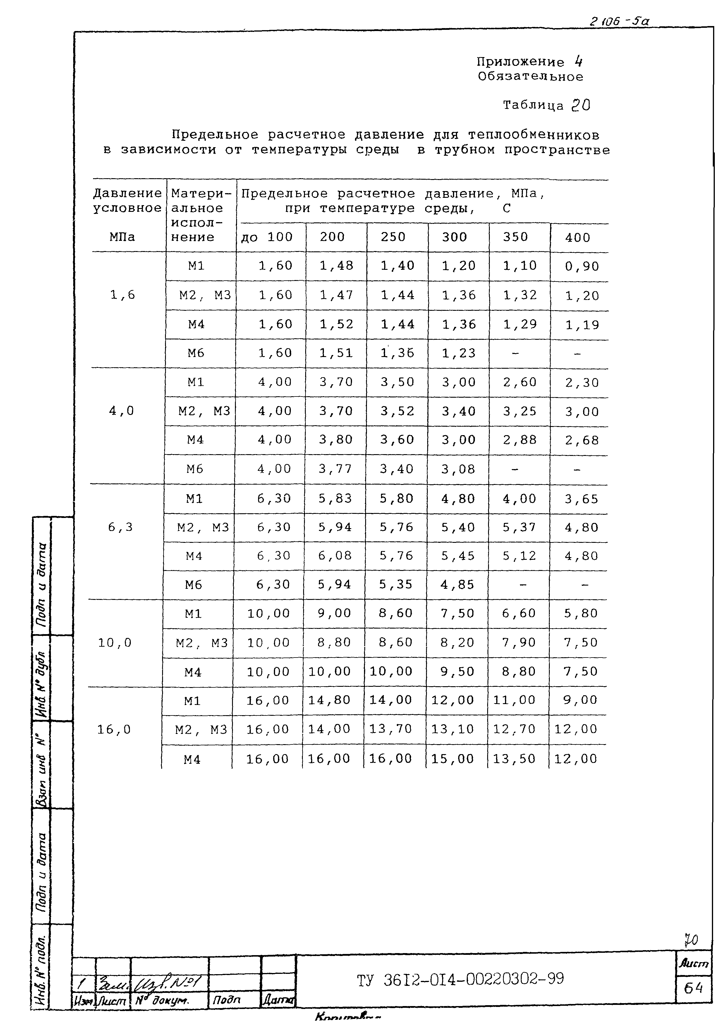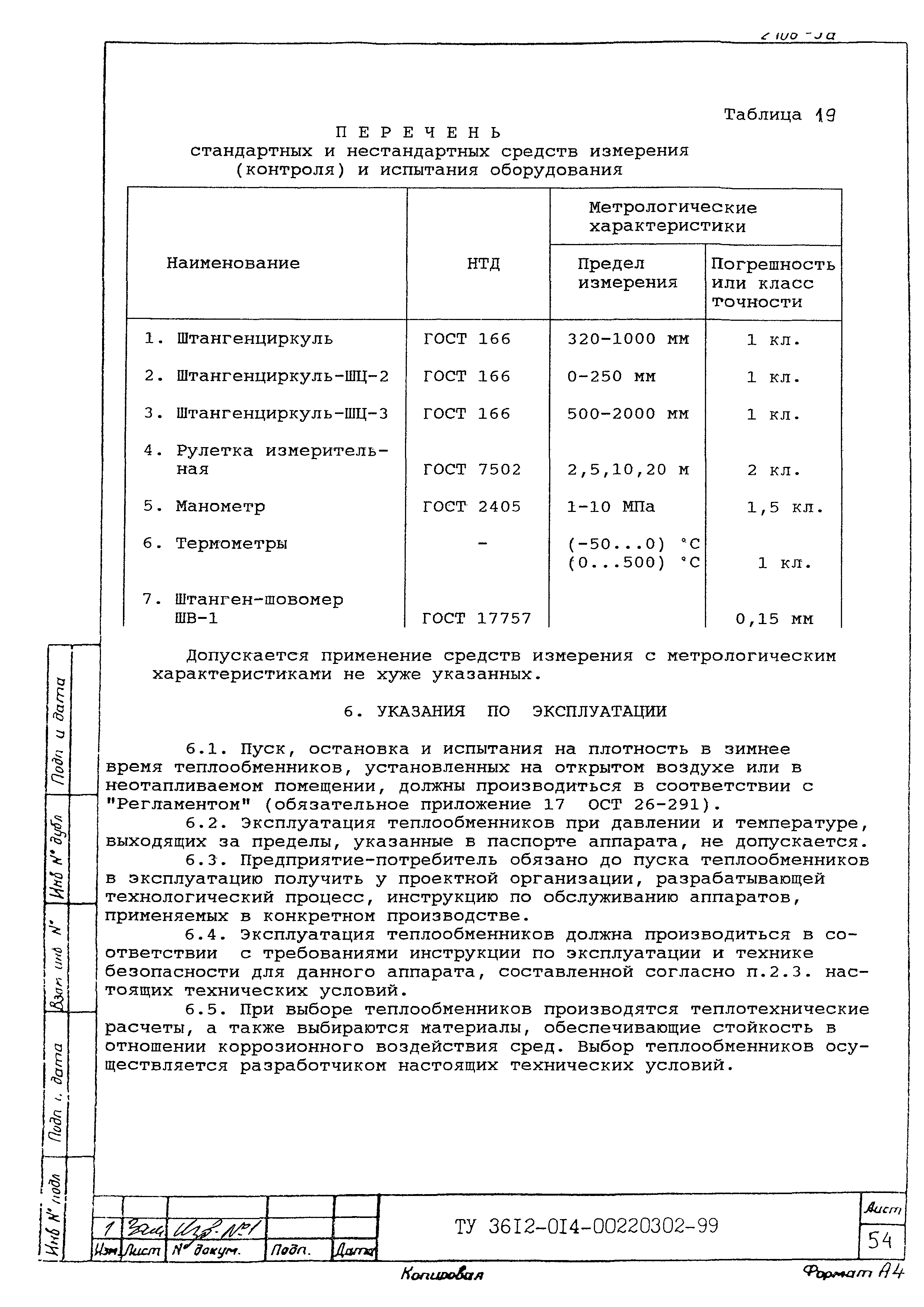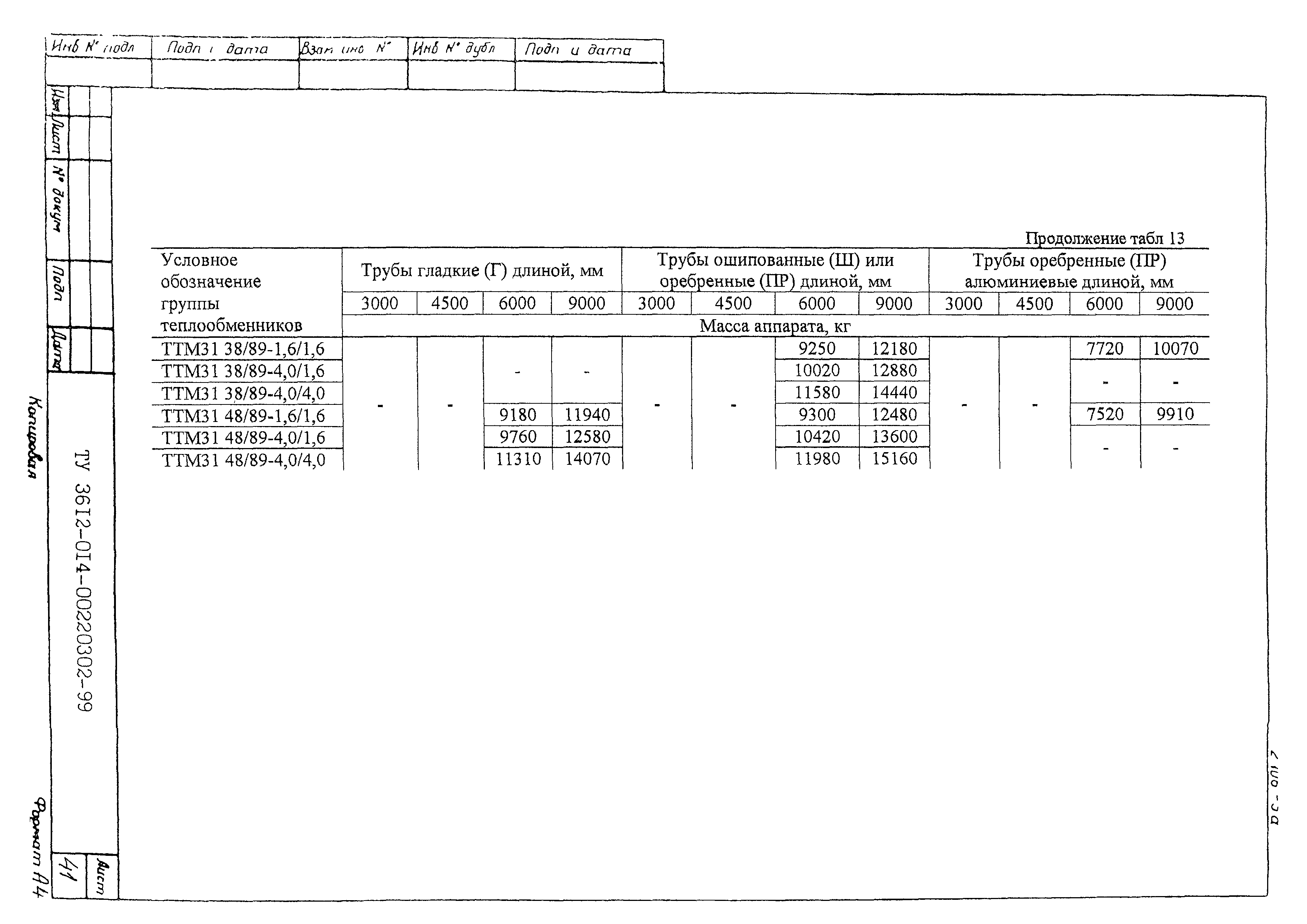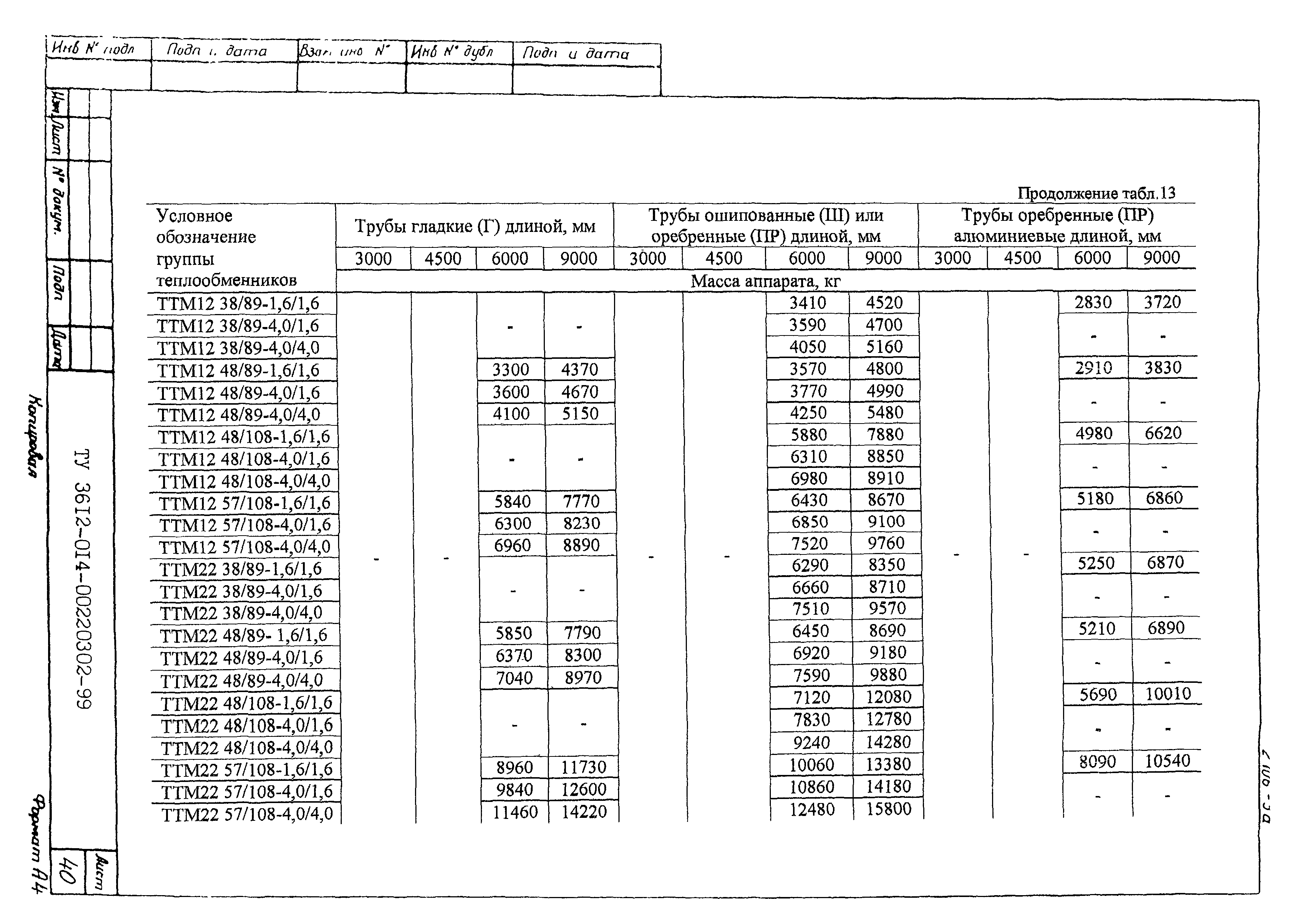 | Оглавление: | Вводная часть 1. Технические требования 1.2 Основные параметры и размеры 1.3 Требования к изготовлению 1.4 Комплектность 1.5 Маркировка 1.6 Упаковка 2. Требования безопасности и экологии 3. Правила приемки 4. Методы контроля 5. Транспортирование и хранение 6. Указания по эксплуатации 7. Гарантии изготовителя Перечень нормативно-технической документации Приложение 1. Рекомендации по выбору и области применения Приложение 2. Опросный лист теплообменного аппарата по ТУ Приложение 3. Бланк заказа теплообменника по ТУ Приложение 4. Предельное расчетное давление в зависимости от температуры среды Приложение 5. Примеры компоновки элементов теплообменников в блок Приложение 6. Трубы ребристые, алюминиевые и ошипованные Лист регистрации изменений |