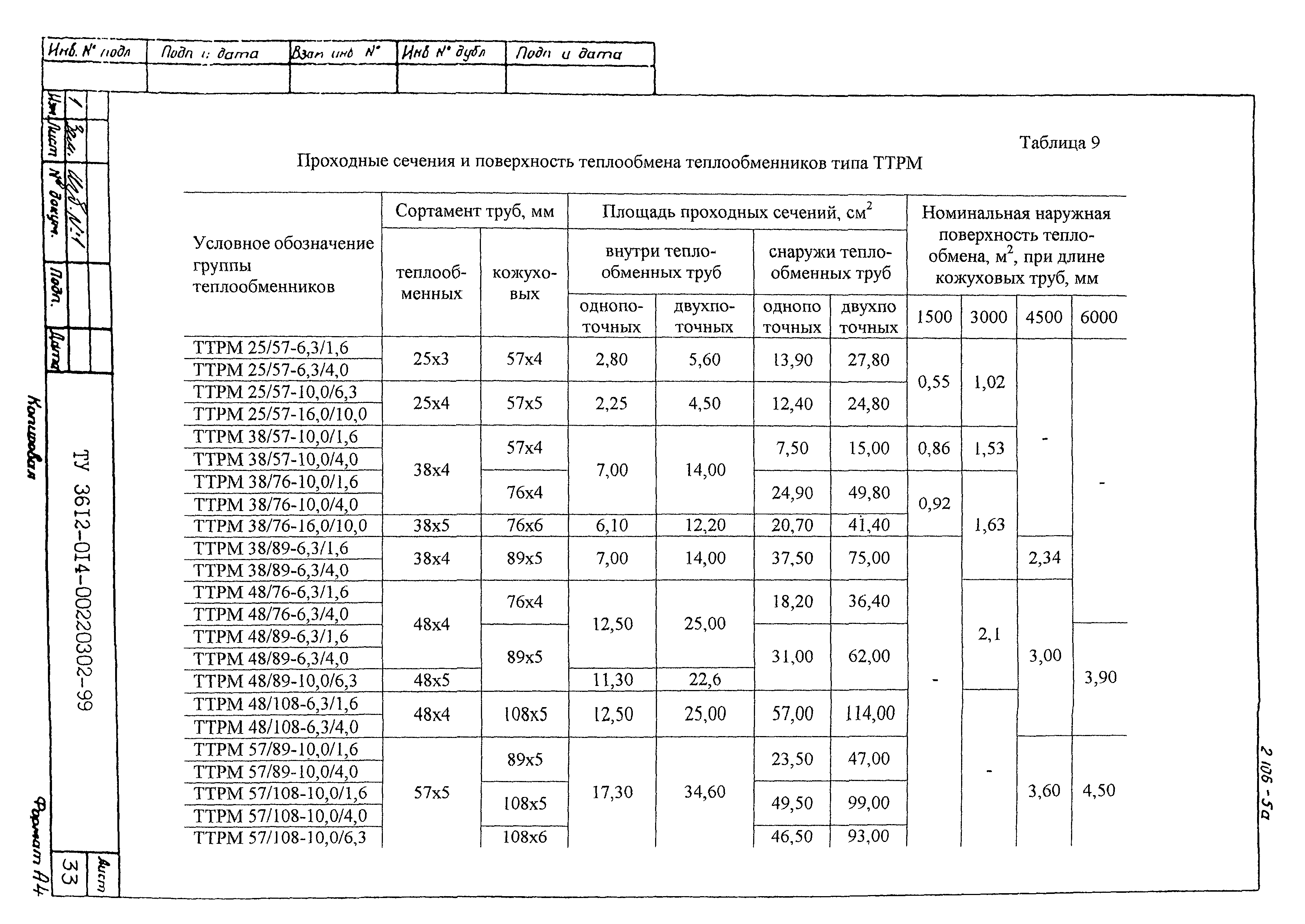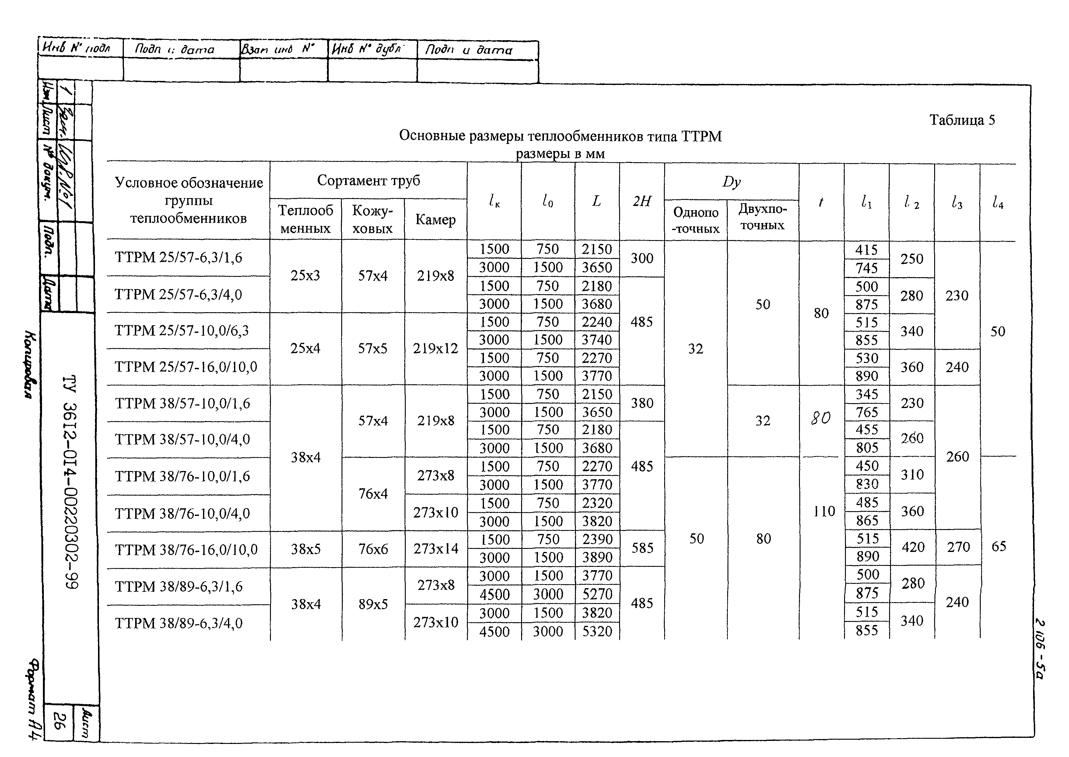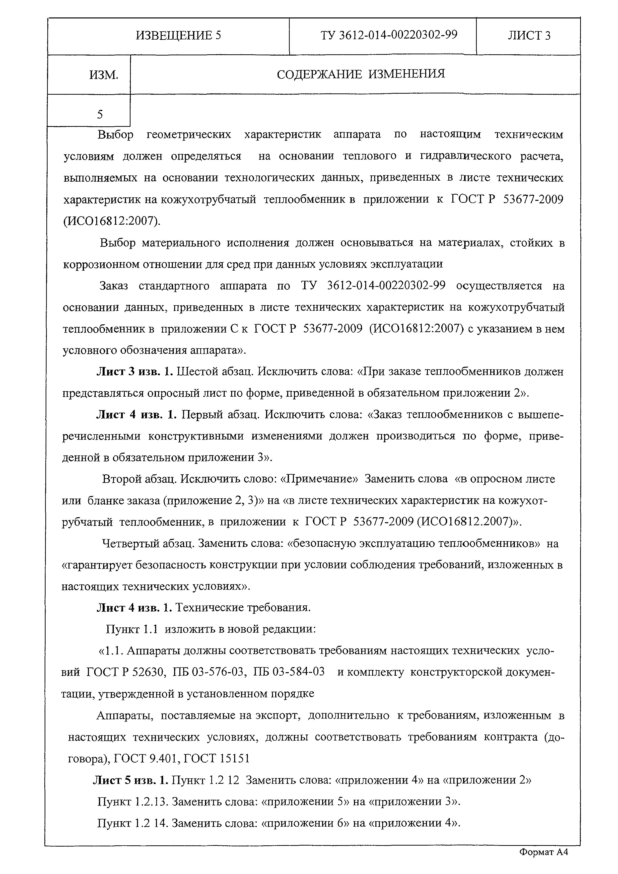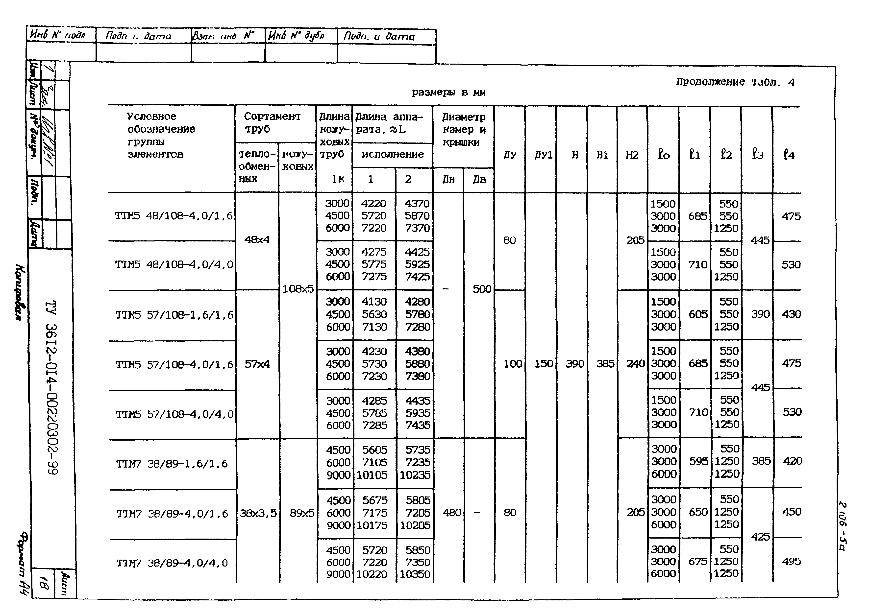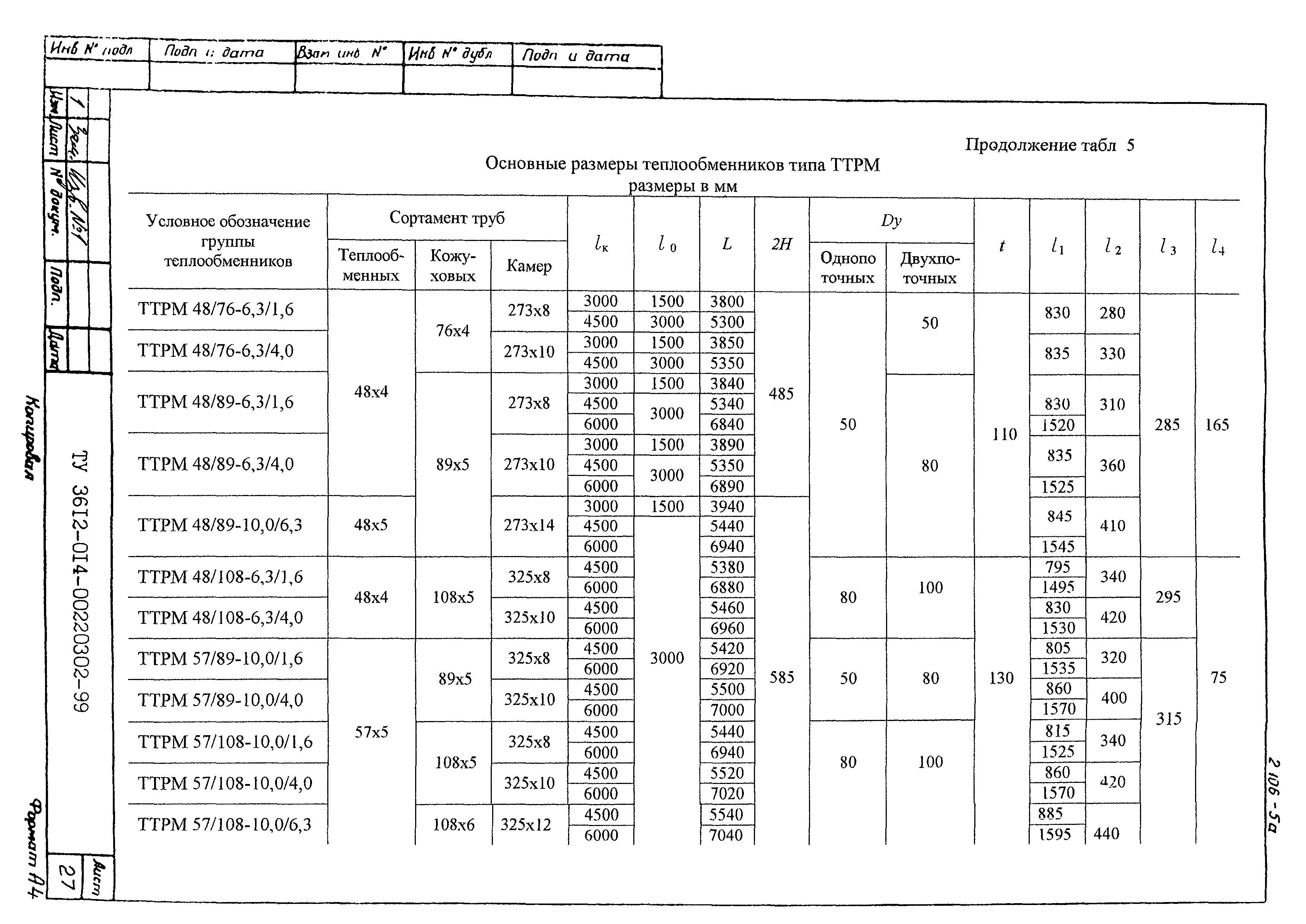 | Оглавление: | Вводная часть 1. Технические требования 1.2 Основные параметры и размеры 1.3 Требования к изготовлению 1.4 Комплектность 1.5 Маркировка 1.6 Упаковка 2. Требования безопасности и экологии 3. Правила приемки 4. Методы контроля 5. Транспортирование и хранение 6. Указания по эксплуатации 7. Гарантии изготовителя Перечень нормативно-технической документации Приложение 1. Рекомендации по выбору и области применения Приложение 2. Опросный лист теплообменного аппарата по ТУ Приложение 3. Бланк заказа теплообменника по ТУ Приложение 4. Предельное расчетное давление в зависимости от температуры среды Приложение 5. Примеры компоновки элементов теплообменников в блок Приложение 6. Трубы ребристые, алюминиевые и ошипованные Лист регистрации изменений |