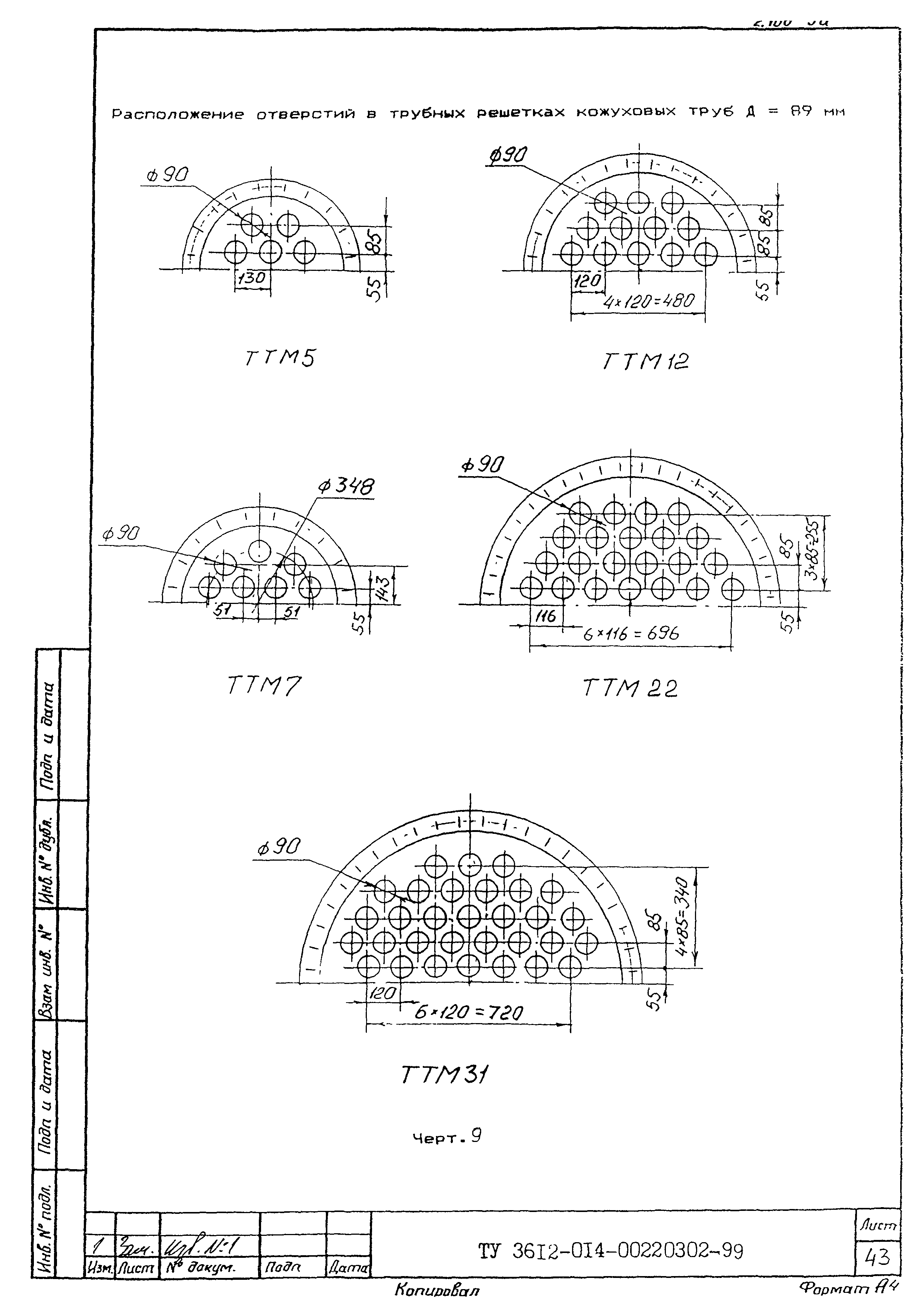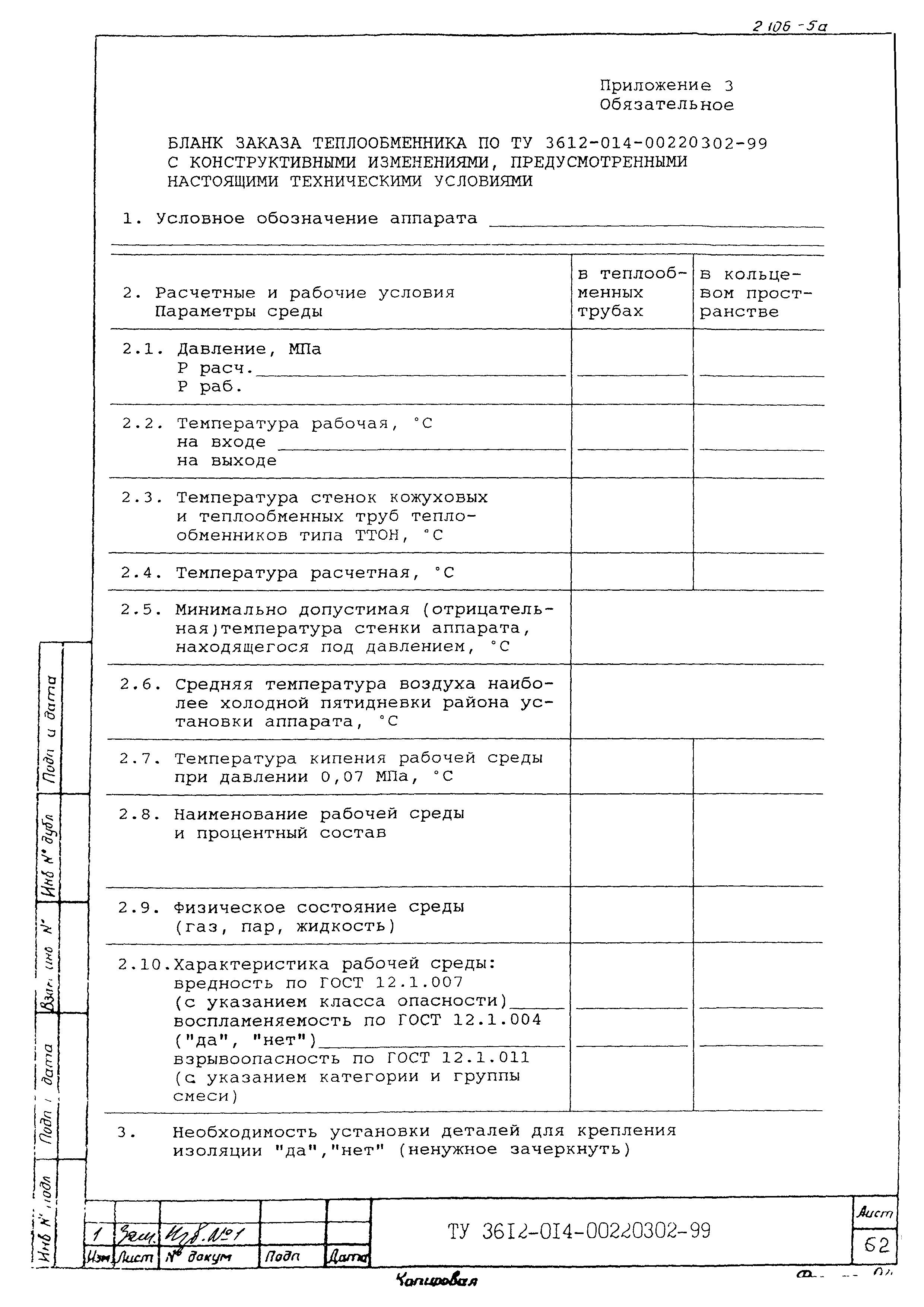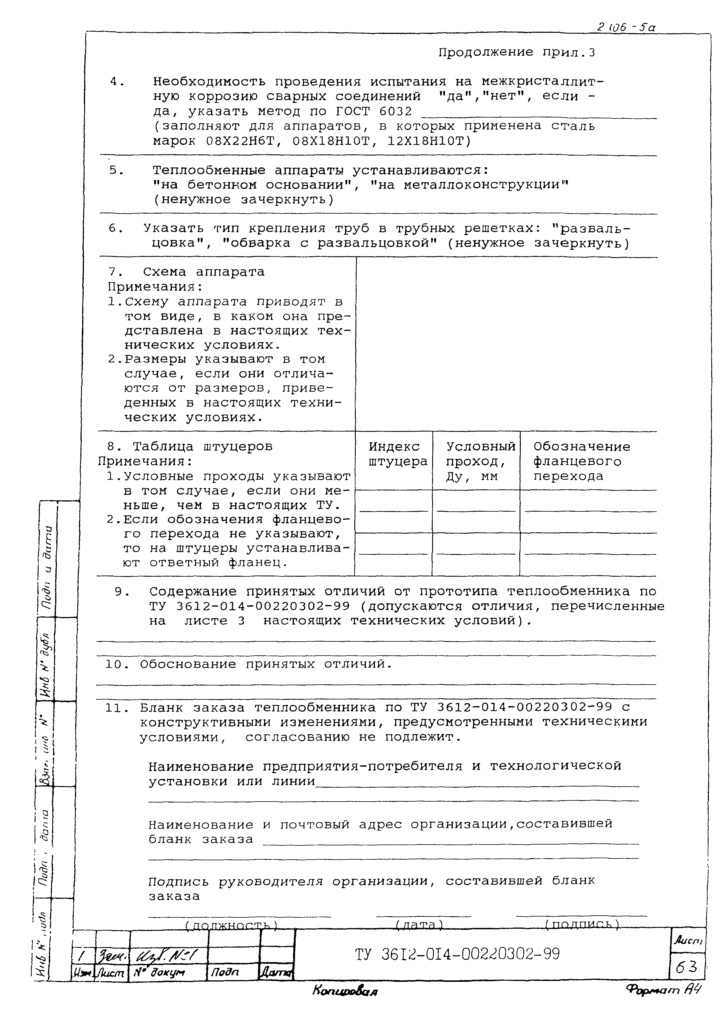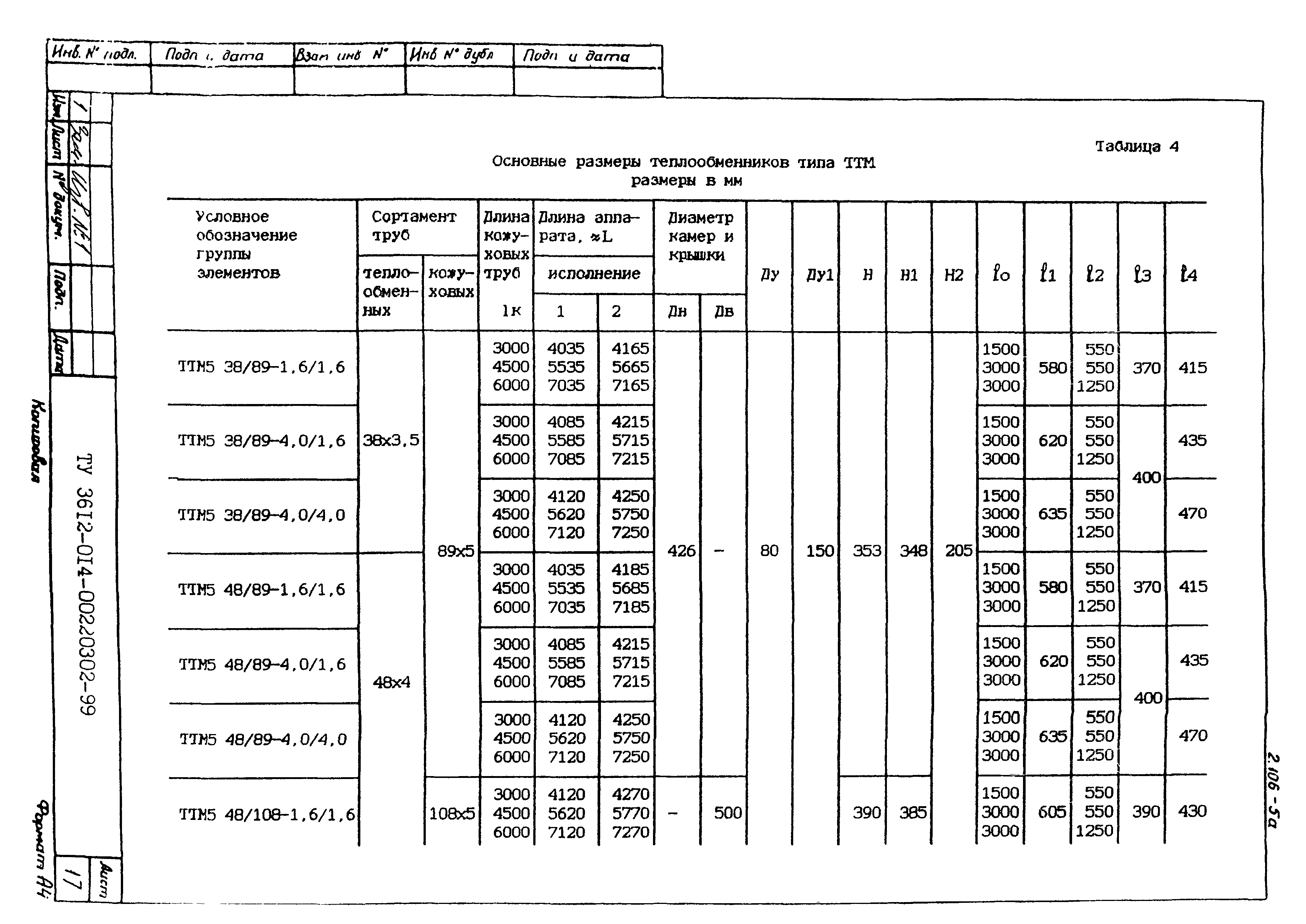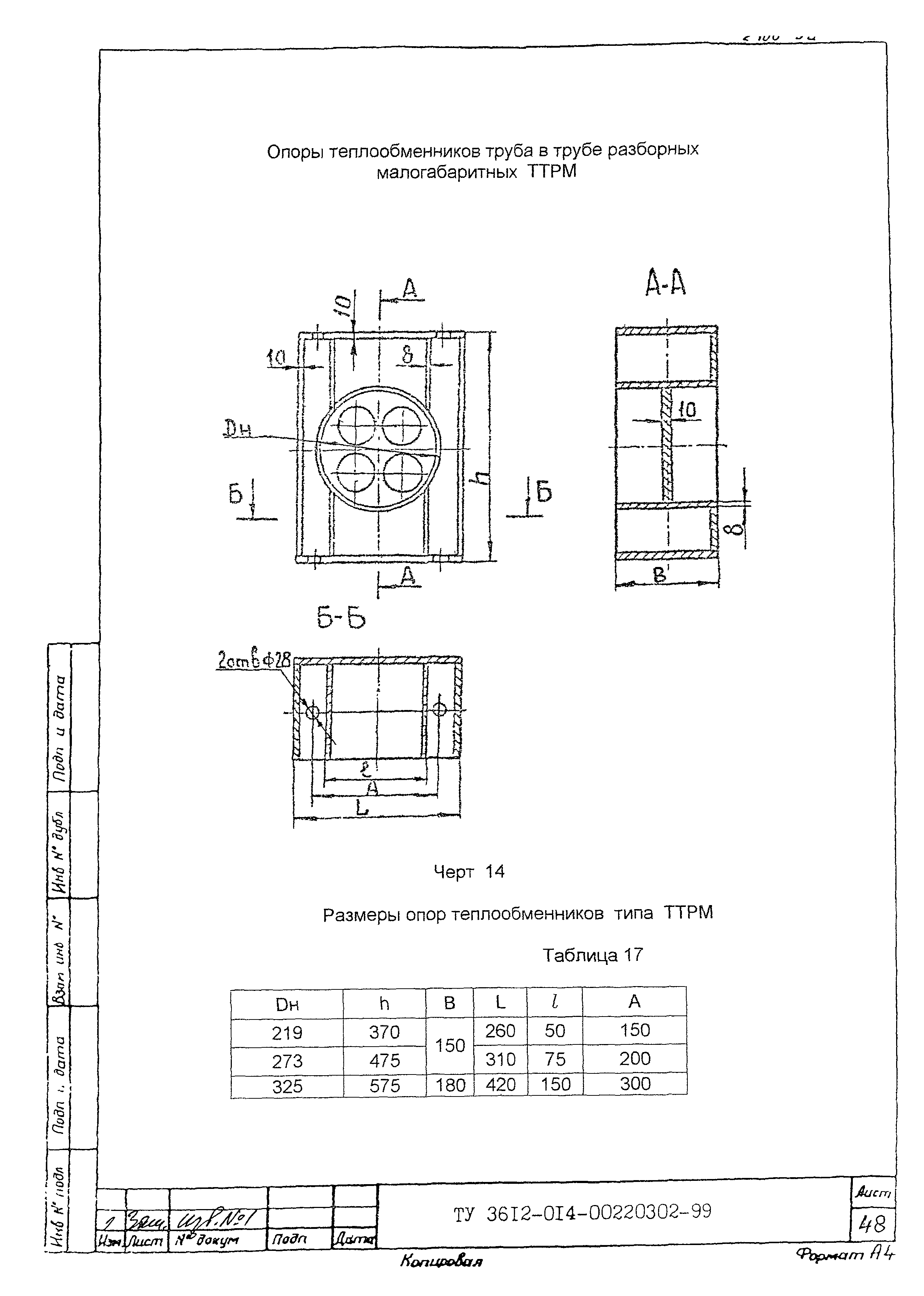 | Оглавление: | Вводная часть 1. Технические требования 1.2 Основные параметры и размеры 1.3 Требования к изготовлению 1.4 Комплектность 1.5 Маркировка 1.6 Упаковка 2. Требования безопасности и экологии 3. Правила приемки 4. Методы контроля 5. Транспортирование и хранение 6. Указания по эксплуатации 7. Гарантии изготовителя Перечень нормативно-технической документации Приложение 1. Рекомендации по выбору и области применения Приложение 2. Опросный лист теплообменного аппарата по ТУ Приложение 3. Бланк заказа теплообменника по ТУ Приложение 4. Предельное расчетное давление в зависимости от температуры среды Приложение 5. Примеры компоновки элементов теплообменников в блок Приложение 6. Трубы ребристые, алюминиевые и ошипованные Лист регистрации изменений |