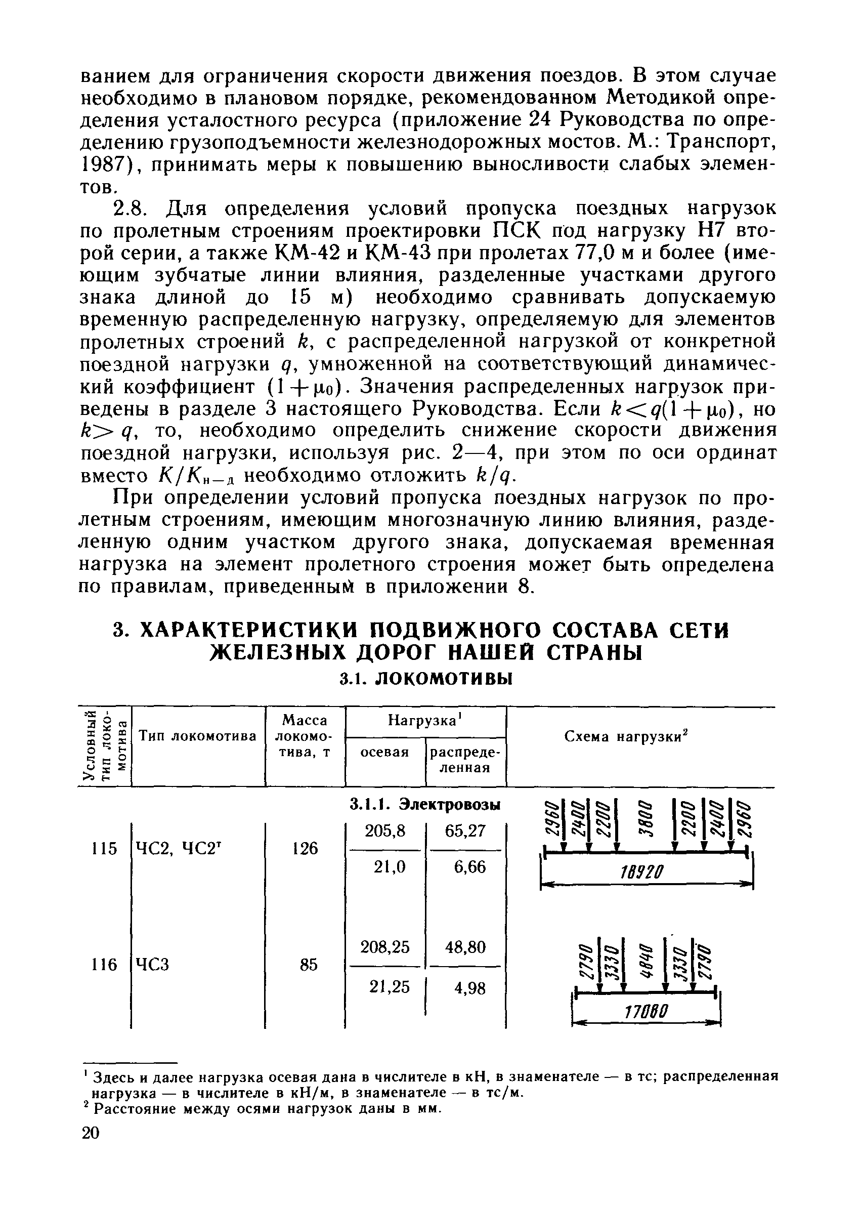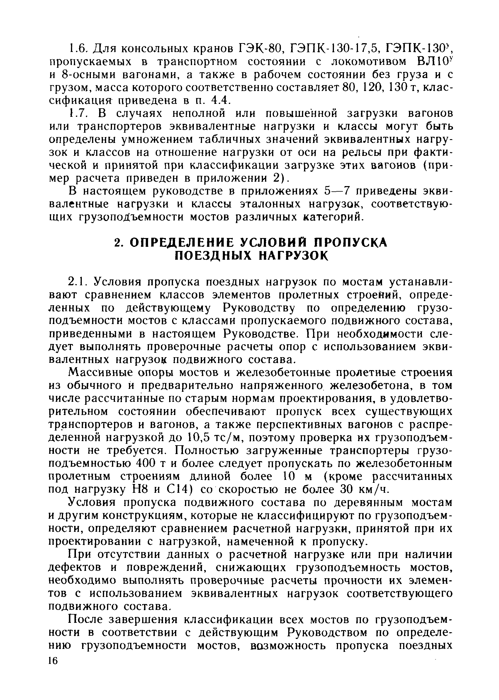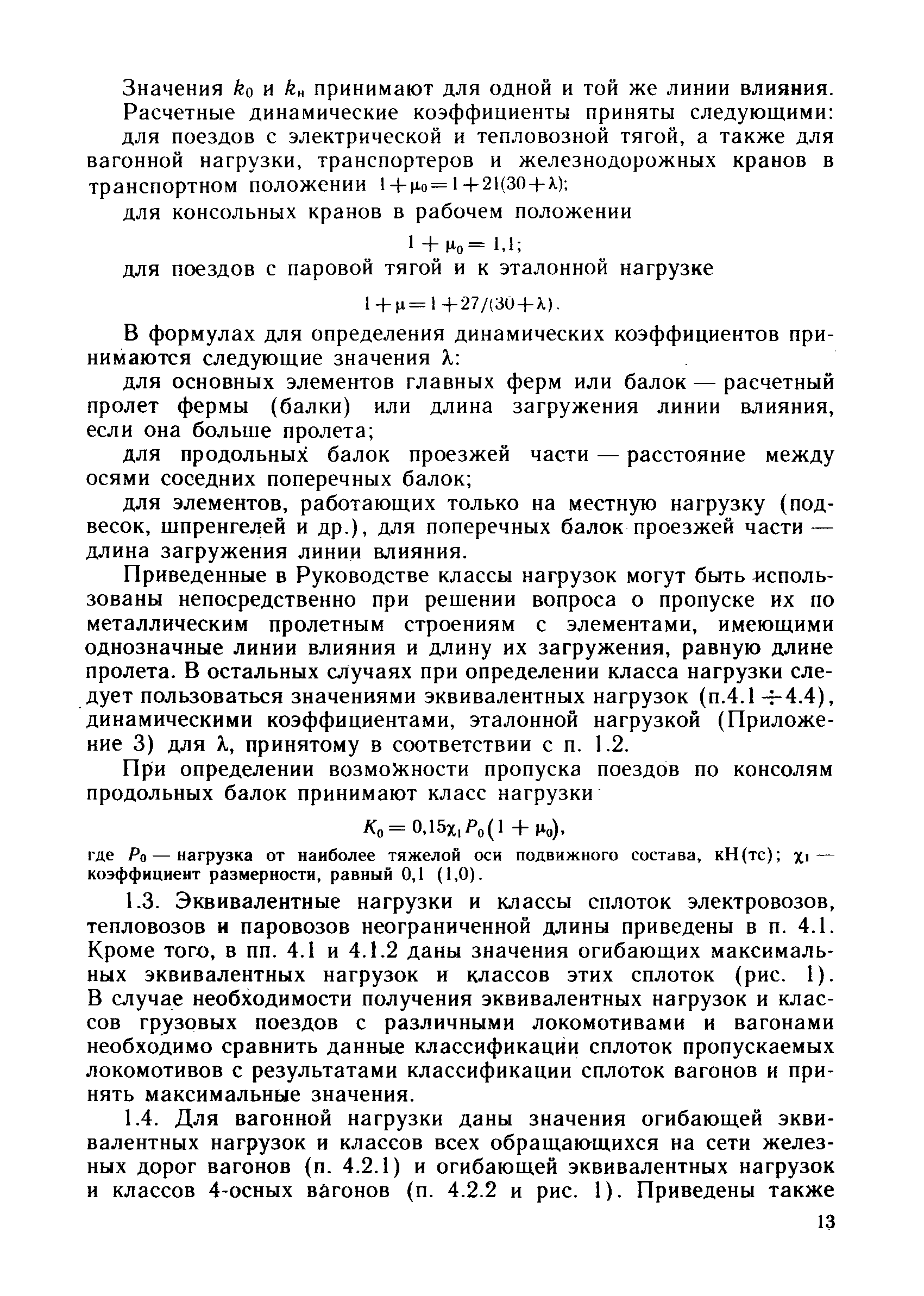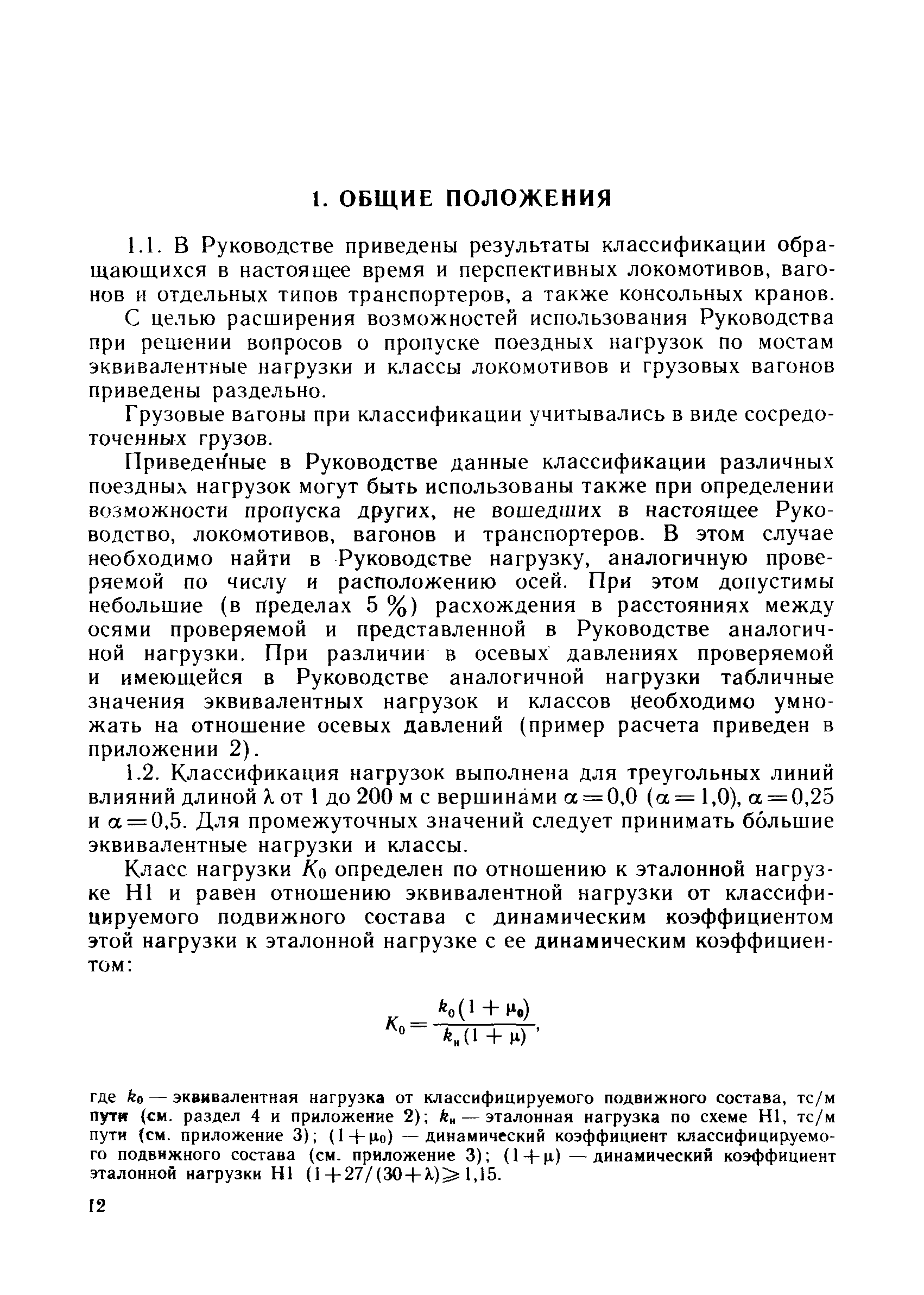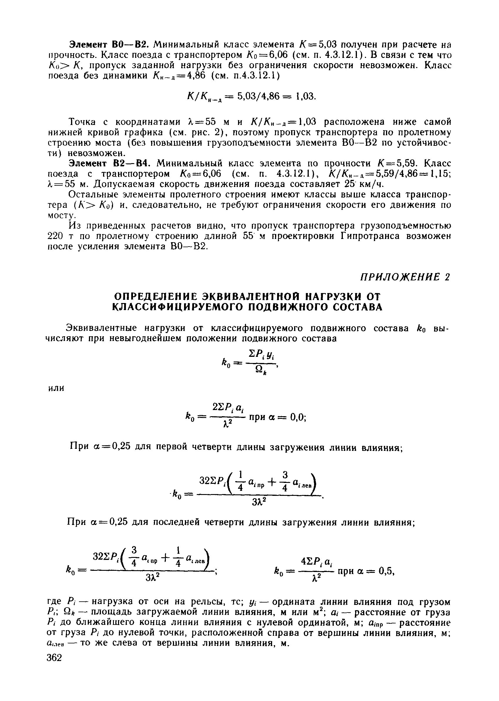 Руководство по пропуску подвижного состава по железнодорожным мостам| Статус: | не подлежит применению | | Название рус.: | Руководство по пропуску подвижного состава по железнодорожным мостам | | Дата добавления в базу: | 01.09.2013 | | Дата актуализации: | 01.01.2021 | | Дата окончания срока действия: | 26.08.2019 | | Область применения: | Приведены основные характеристики и результаты классификации (классы) обращающихся и перспективных локомотивов, вагонов, транспортеров, железнодорожных кранов и, кроме того, категории грузоподъемности мостов, обеспечивающих их пропуск. | | Оглавление: | 1. Общие положения 2. Определение условий пропуска поездных нагрузок 3. Характеристики подвижного состава сети железных дорог нашей страны 3.1. Локомотивы 3.2. Вагоны 3.3. Транспортеры 3.4. Консольные железнодорожные краны 4. Классификация нагрузок 4.1. Эквивалентные нагрузки и классы сплоток электровозов, тепловозов, паровозов 4.2. Эквивалентные нагрузки и классы обращающихся и перспективных вагонов 4.3. Эквивалентные нагрузки и классы транспортеров 4.4. Эквивалентные нагрузки и классы железнодорожных консольных кранов Приложение 1. Примеры классификации подвижного состава и определения условий пропуска его по металлическим пролетным строениям железнодорожных мостов Приложение 2. Определение эквивалентной нагрузки от классифицируемого подвижного состава Приложение 3. Динамические коэффициенты, их отношения и эталонная нагрузка от HI 364 Приложение 4. Вагоны «прикрытия» транспортеров Приложение 5. Эквивалентные нагрузки и классы эталонной нагрузки, соответствующие грузоподъемности мостов II-IV категорий Приложение 6. Пример определения допускаемой временной нагрузки на элементы про¬летных строений, имеющих многозначную линию влияния, разделенную одним участком другого знака длиной более 15 м | | Разработан: | Научно-исследовательский институт мостов