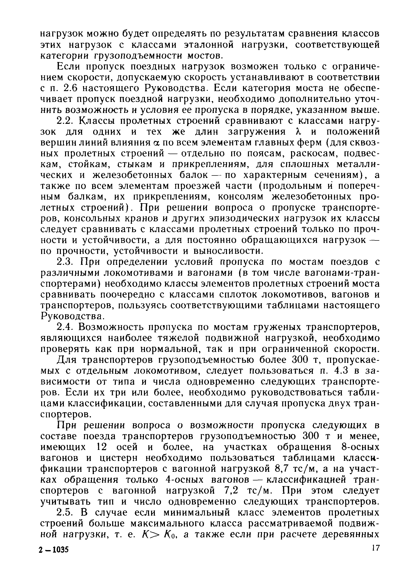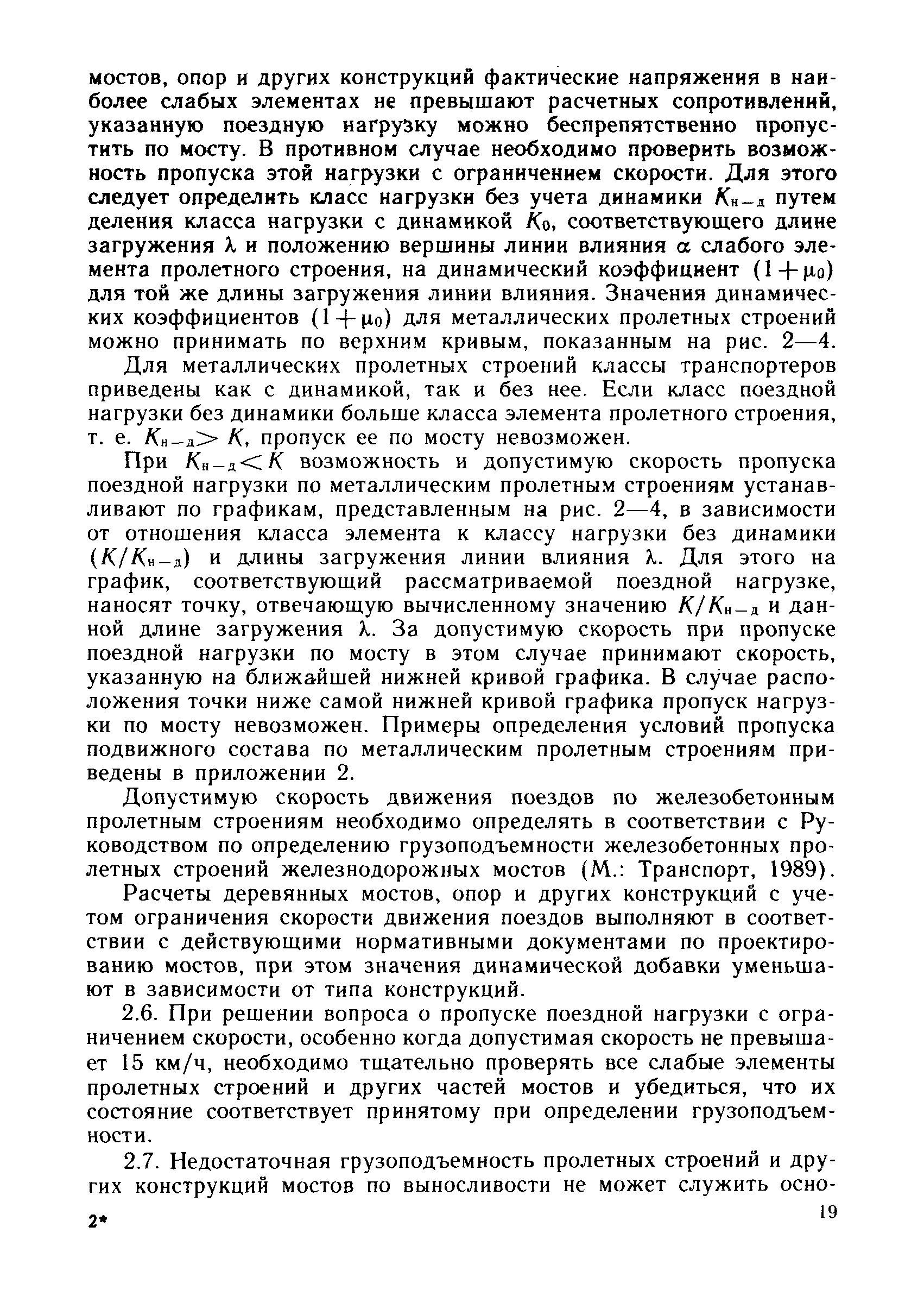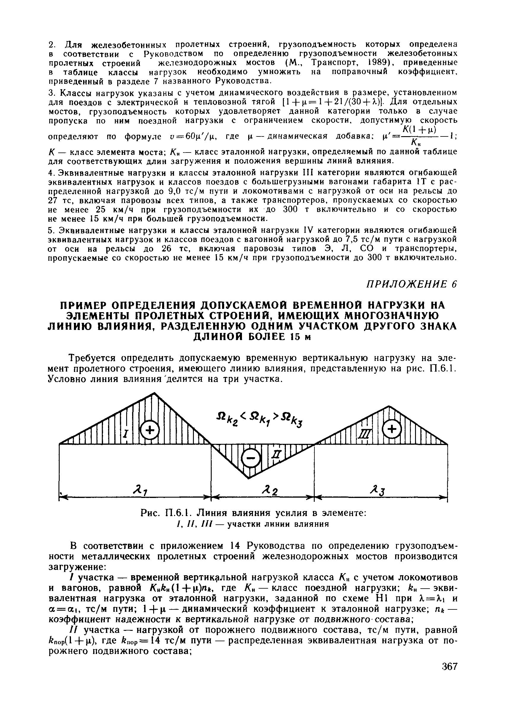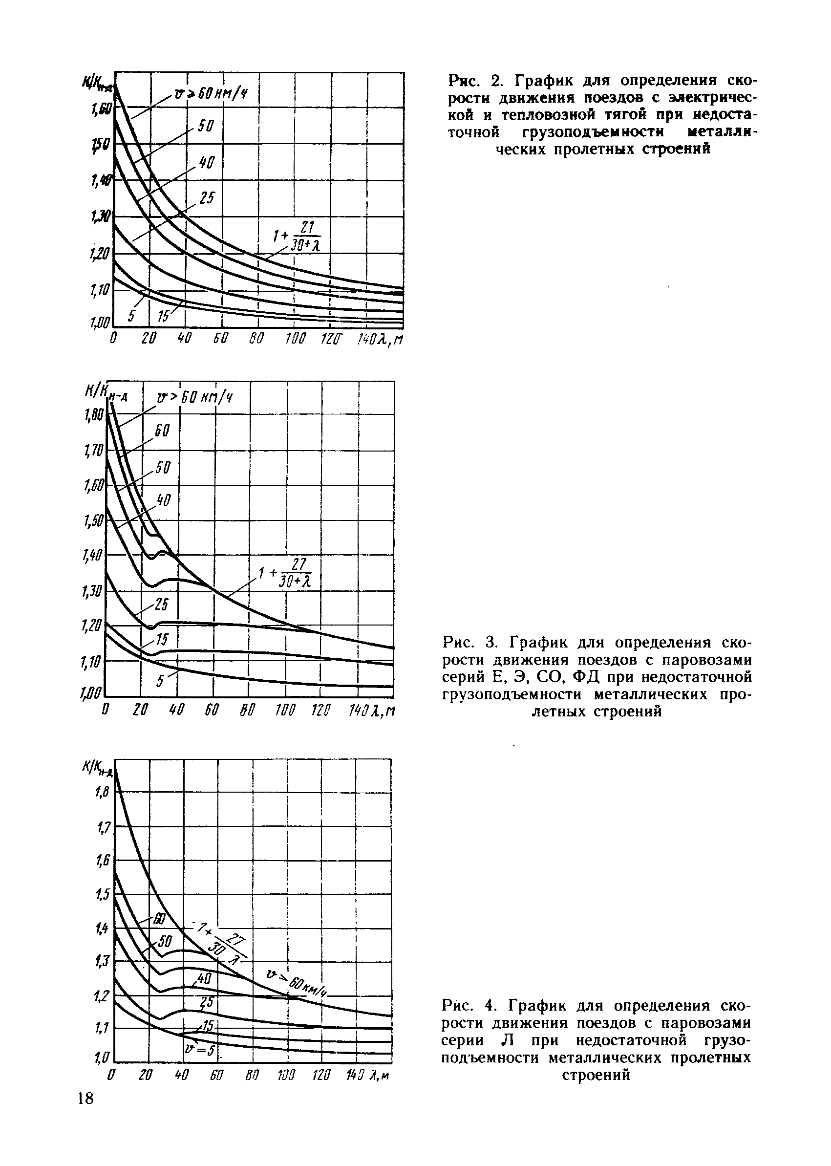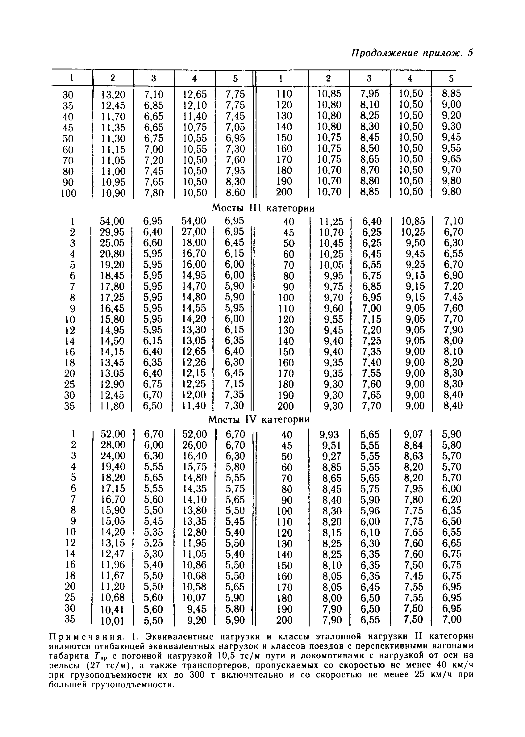 Руководство по пропуску подвижного состава по железнодорожным мостам| Статус: | не подлежит применению | | Название рус.: | Руководство по пропуску подвижного состава по железнодорожным мостам | | Дата добавления в базу: | 01.09.2013 | | Дата актуализации: | 01.01.2021 | | Дата окончания срока действия: | 26.08.2019 | | Область применения: | Приведены основные характеристики и результаты классификации (классы) обращающихся и перспективных локомотивов, вагонов, транспортеров, железнодорожных кранов и, кроме того, категории грузоподъемности мостов, обеспечивающих их пропуск. | | Оглавление: | 1. Общие положения 2. Определение условий пропуска поездных нагрузок 3. Характеристики подвижного состава сети железных дорог нашей страны 3.1. Локомотивы 3.2. Вагоны 3.3. Транспортеры 3.4. Консольные железнодорожные краны 4. Классификация нагрузок 4.1. Эквивалентные нагрузки и классы сплоток электровозов, тепловозов, паровозов 4.2. Эквивалентные нагрузки и классы обращающихся и перспективных вагонов 4.3. Эквивалентные нагрузки и классы транспортеров 4.4. Эквивалентные нагрузки и классы железнодорожных консольных кранов Приложение 1. Примеры классификации подвижного состава и определения условий пропуска его по металлическим пролетным строениям железнодорожных мостов Приложение 2. Определение эквивалентной нагрузки от классифицируемого подвижного состава Приложение 3. Динамические коэффициенты, их отношения и эталонная нагрузка от HI 364 Приложение 4. Вагоны «прикрытия» транспортеров Приложение 5. Эквивалентные нагрузки и классы эталонной нагрузки, соответствующие грузоподъемности мостов II-IV категорий Приложение 6. Пример определения допускаемой временной нагрузки на элементы про¬летных строений, имеющих многозначную линию влияния, разделенную одним участком другого знака длиной более 15 м | | Разработан: | Научно-исследовательский институт мостов