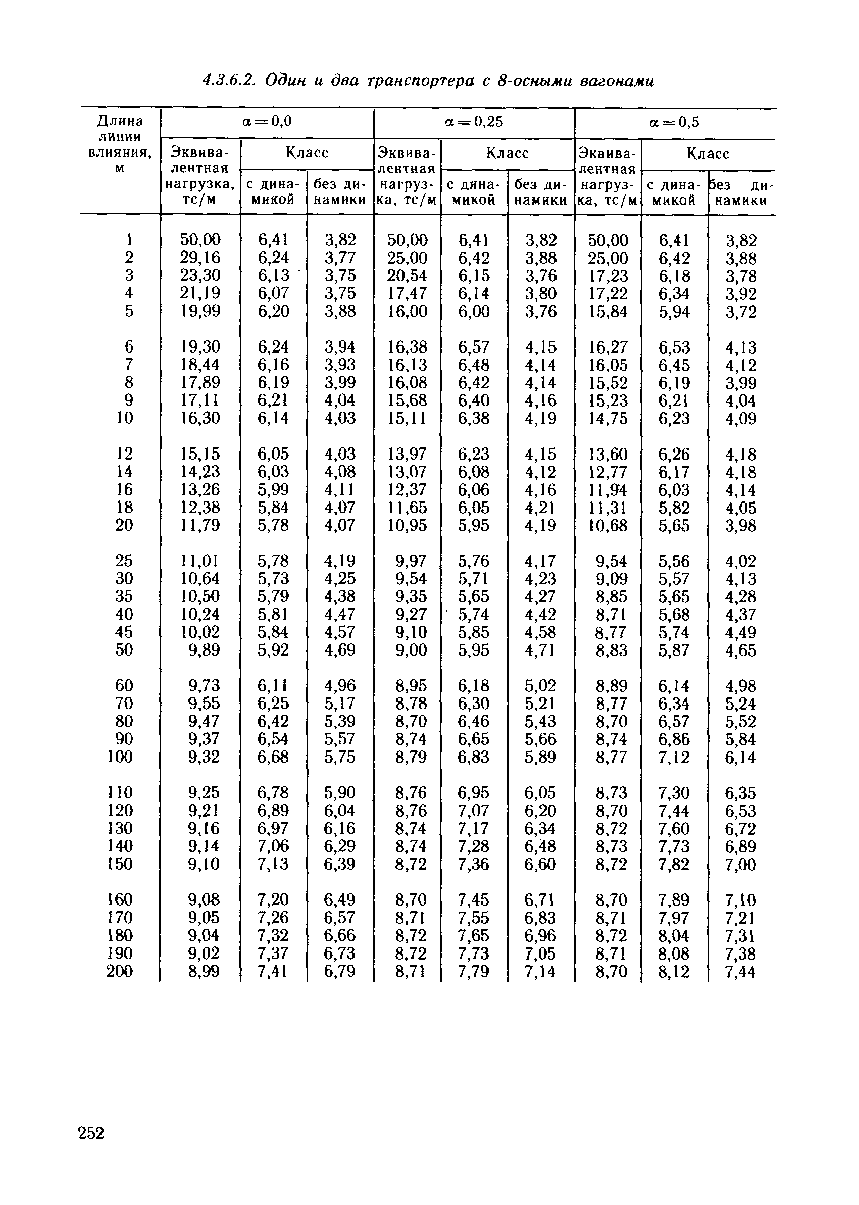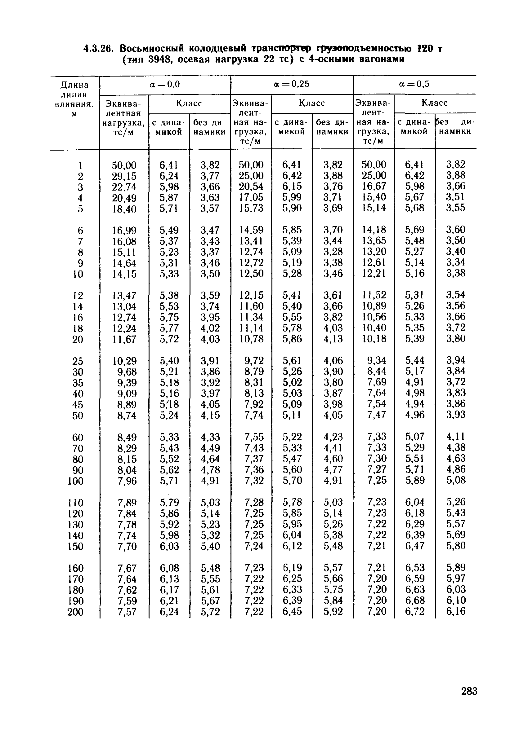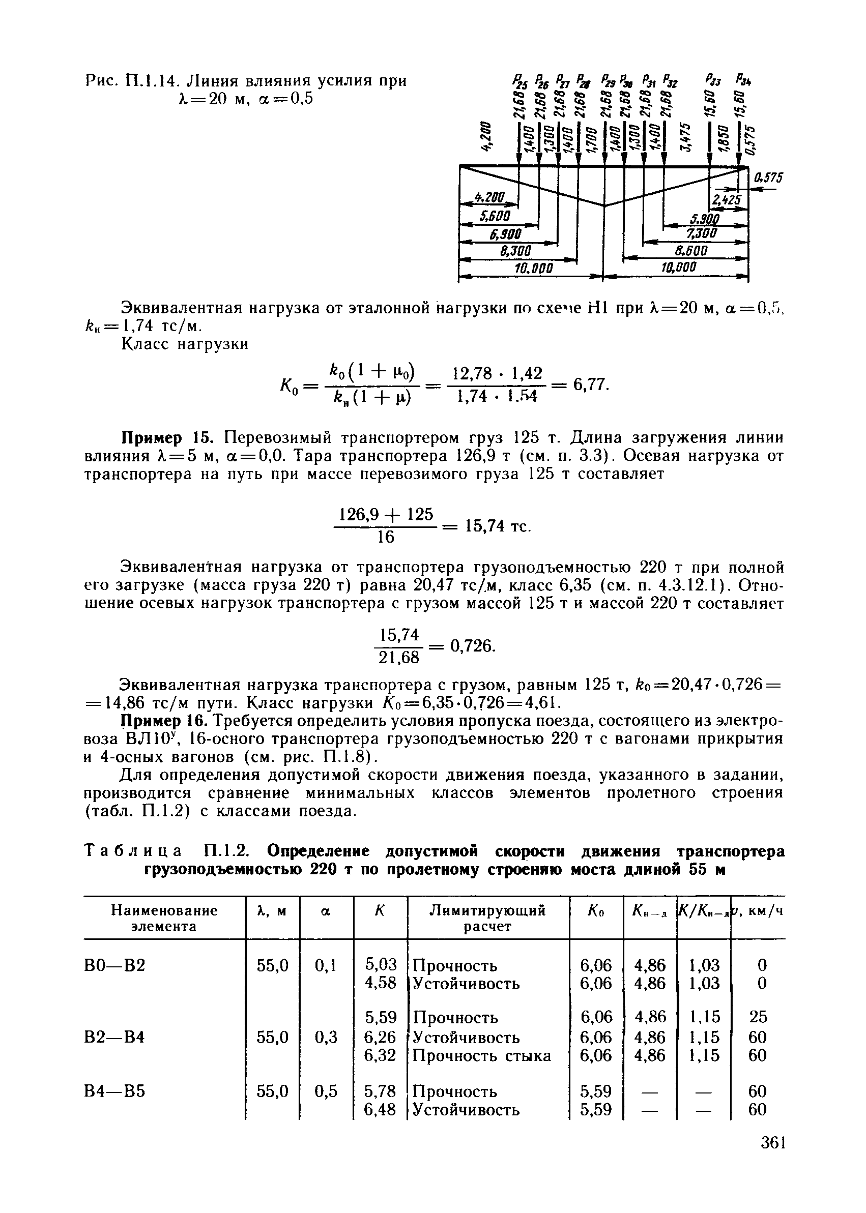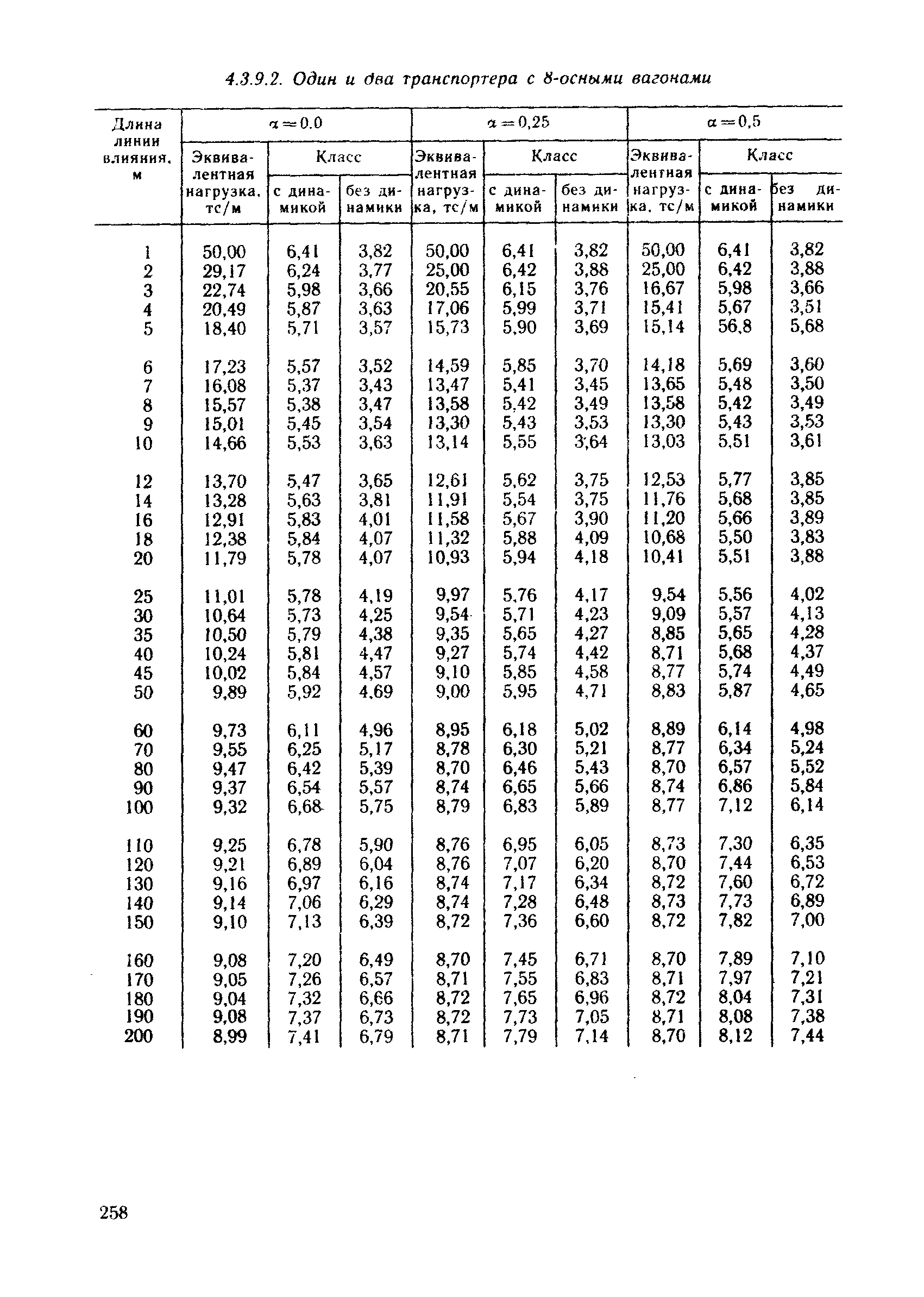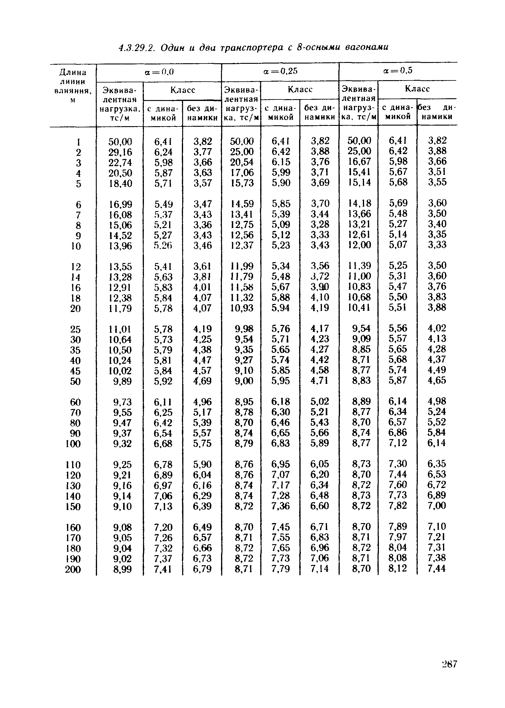Руководство по пропуску подвижного состава по железнодорожным мостам| Статус: | не подлежит применению | | Название рус.: | Руководство по пропуску подвижного состава по железнодорожным мостам | | Дата добавления в базу: | 01.09.2013 | | Дата актуализации: | 01.01.2021 | | Дата окончания срока действия: | 26.08.2019 | | Область применения: | Приведены основные характеристики и результаты классификации (классы) обращающихся и перспективных локомотивов, вагонов, транспортеров, железнодорожных кранов и, кроме того, категории грузоподъемности мостов, обеспечивающих их пропуск. | | Оглавление: | 1. Общие положения 2. Определение условий пропуска поездных нагрузок 3. Характеристики подвижного состава сети железных дорог нашей страны 3.1. Локомотивы 3.2. Вагоны 3.3. Транспортеры 3.4. Консольные железнодорожные краны 4. Классификация нагрузок 4.1. Эквивалентные нагрузки и классы сплоток электровозов, тепловозов, паровозов 4.2. Эквивалентные нагрузки и классы обращающихся и перспективных вагонов 4.3. Эквивалентные нагрузки и классы транспортеров 4.4. Эквивалентные нагрузки и классы железнодорожных консольных кранов Приложение 1. Примеры классификации подвижного состава и определения условий пропуска его по металлическим пролетным строениям железнодорожных мостов Приложение 2. Определение эквивалентной нагрузки от классифицируемого подвижного состава Приложение 3. Динамические коэффициенты, их отношения и эталонная нагрузка от HI 364 Приложение 4. Вагоны «прикрытия» транспортеров Приложение 5. Эквивалентные нагрузки и классы эталонной нагрузки, соответствующие грузоподъемности мостов II-IV категорий Приложение 6. Пример определения допускаемой временной нагрузки на элементы про¬летных строений, имеющих многозначную линию влияния, разделенную одним участком другого знака длиной более 15 м | | Разработан: | Научно-исследовательский институт мостов