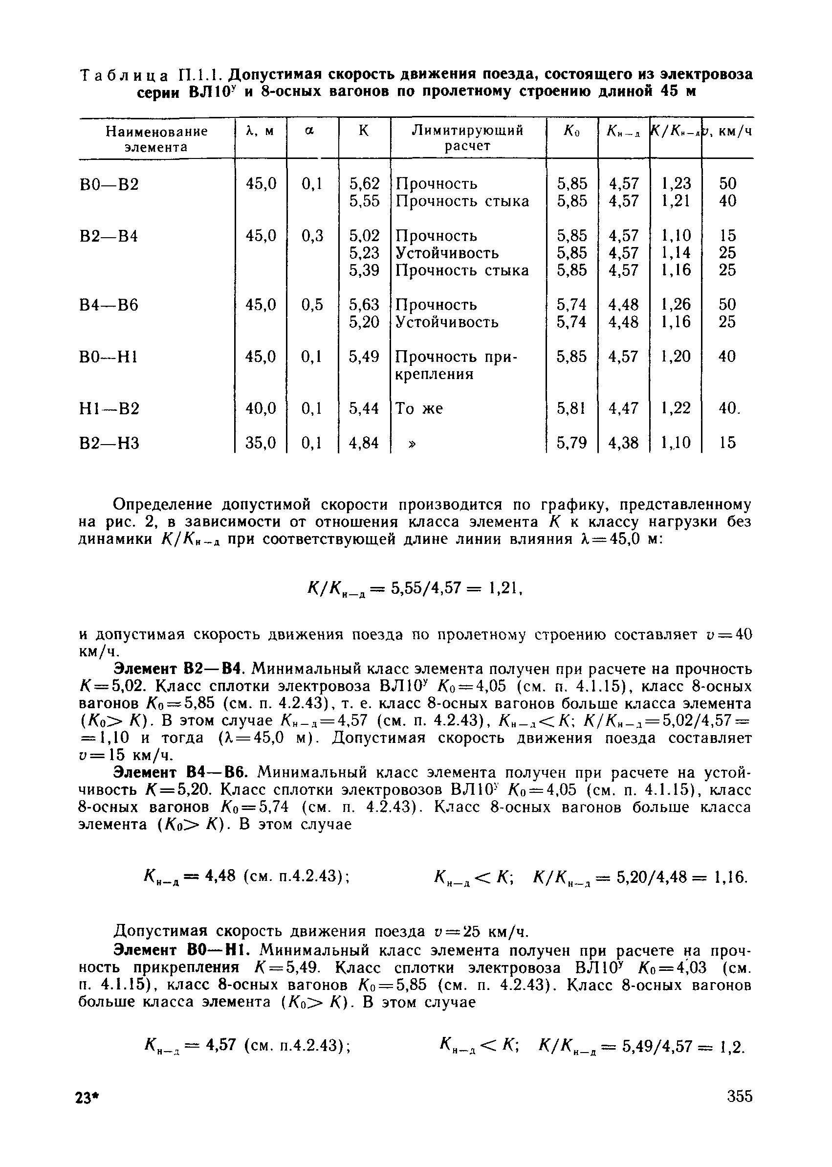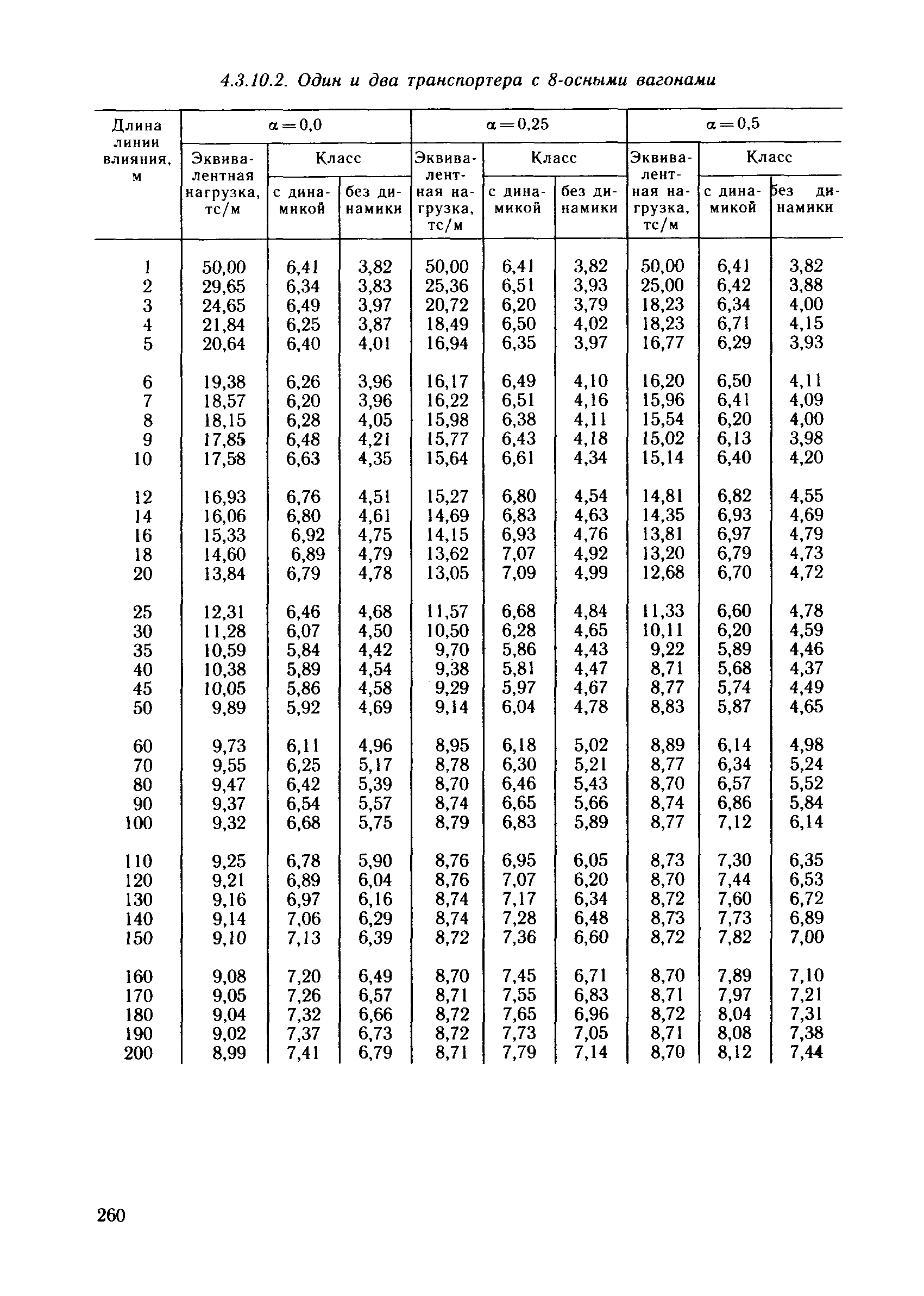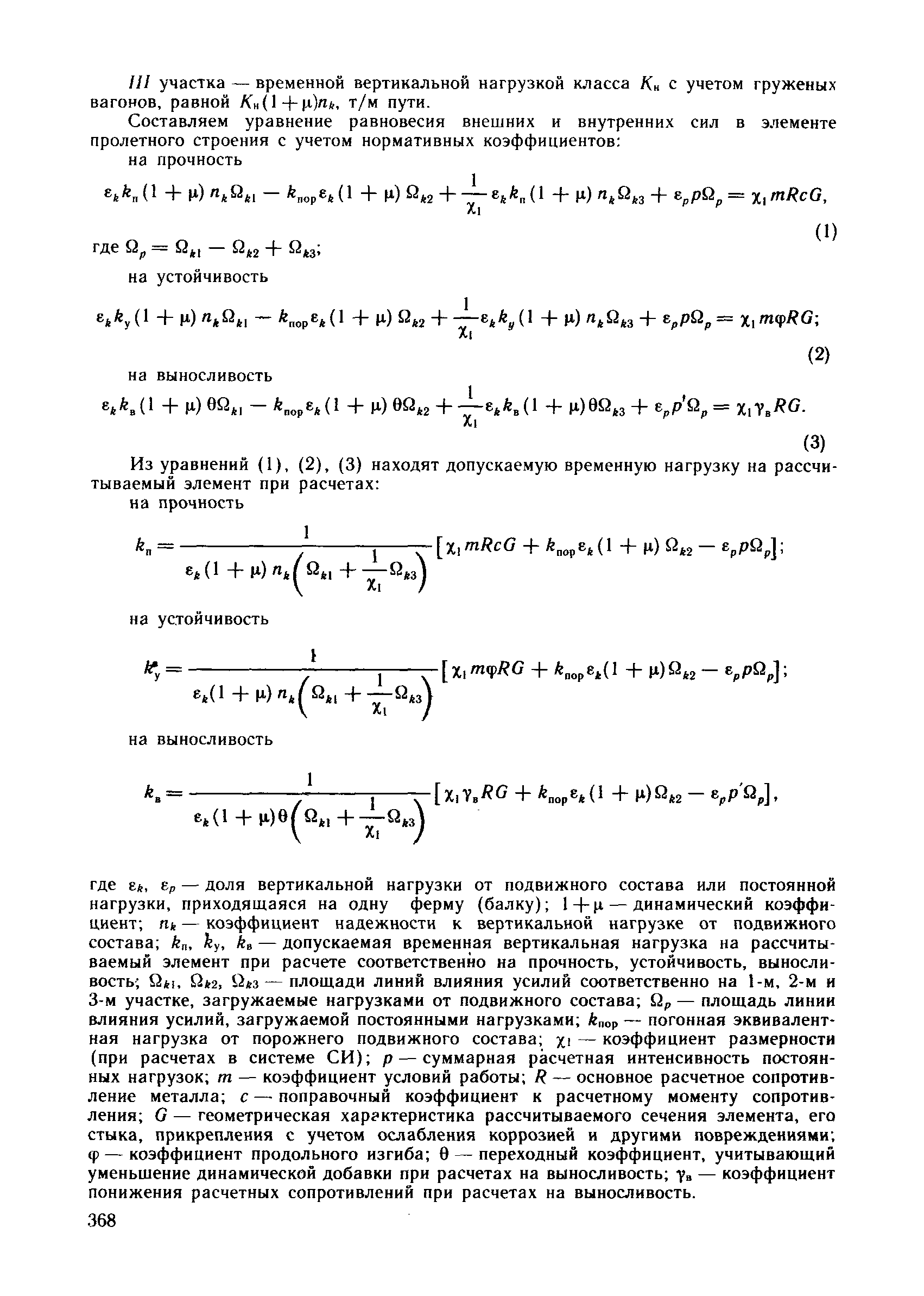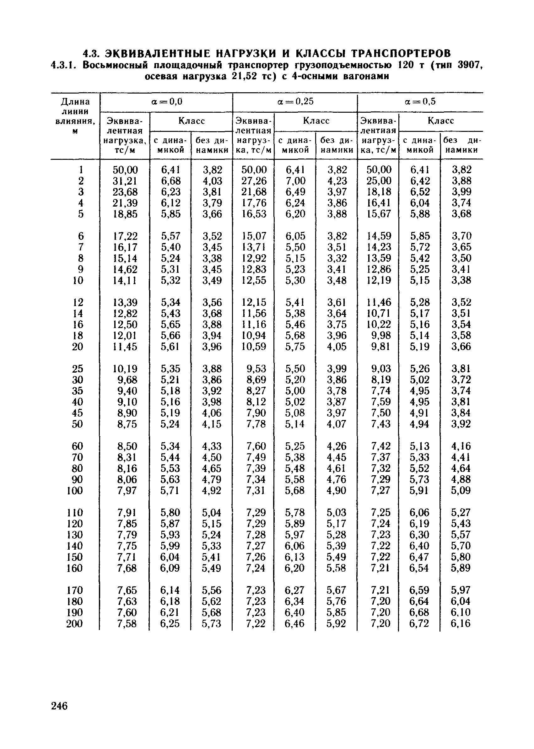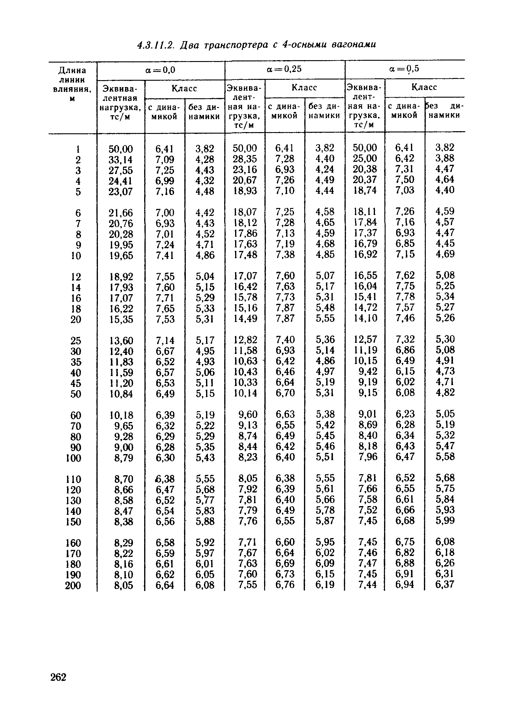 Руководство по пропуску подвижного состава по железнодорожным мостам| Статус: | не подлежит применению | | Название рус.: | Руководство по пропуску подвижного состава по железнодорожным мостам | | Дата добавления в базу: | 01.09.2013 | | Дата актуализации: | 01.01.2021 | | Дата окончания срока действия: | 26.08.2019 | | Область применения: | Приведены основные характеристики и результаты классификации (классы) обращающихся и перспективных локомотивов, вагонов, транспортеров, железнодорожных кранов и, кроме того, категории грузоподъемности мостов, обеспечивающих их пропуск. | | Оглавление: | 1. Общие положения 2. Определение условий пропуска поездных нагрузок 3. Характеристики подвижного состава сети железных дорог нашей страны 3.1. Локомотивы 3.2. Вагоны 3.3. Транспортеры 3.4. Консольные железнодорожные краны 4. Классификация нагрузок 4.1. Эквивалентные нагрузки и классы сплоток электровозов, тепловозов, паровозов 4.2. Эквивалентные нагрузки и классы обращающихся и перспективных вагонов 4.3. Эквивалентные нагрузки и классы транспортеров 4.4. Эквивалентные нагрузки и классы железнодорожных консольных кранов Приложение 1. Примеры классификации подвижного состава и определения условий пропуска его по металлическим пролетным строениям железнодорожных мостов Приложение 2. Определение эквивалентной нагрузки от классифицируемого подвижного состава Приложение 3. Динамические коэффициенты, их отношения и эталонная нагрузка от HI 364 Приложение 4. Вагоны «прикрытия» транспортеров Приложение 5. Эквивалентные нагрузки и классы эталонной нагрузки, соответствующие грузоподъемности мостов II-IV категорий Приложение 6. Пример определения допускаемой временной нагрузки на элементы про¬летных строений, имеющих многозначную линию влияния, разделенную одним участком другого знака длиной более 15 м | | Разработан: | Научно-исследовательский институт мостов