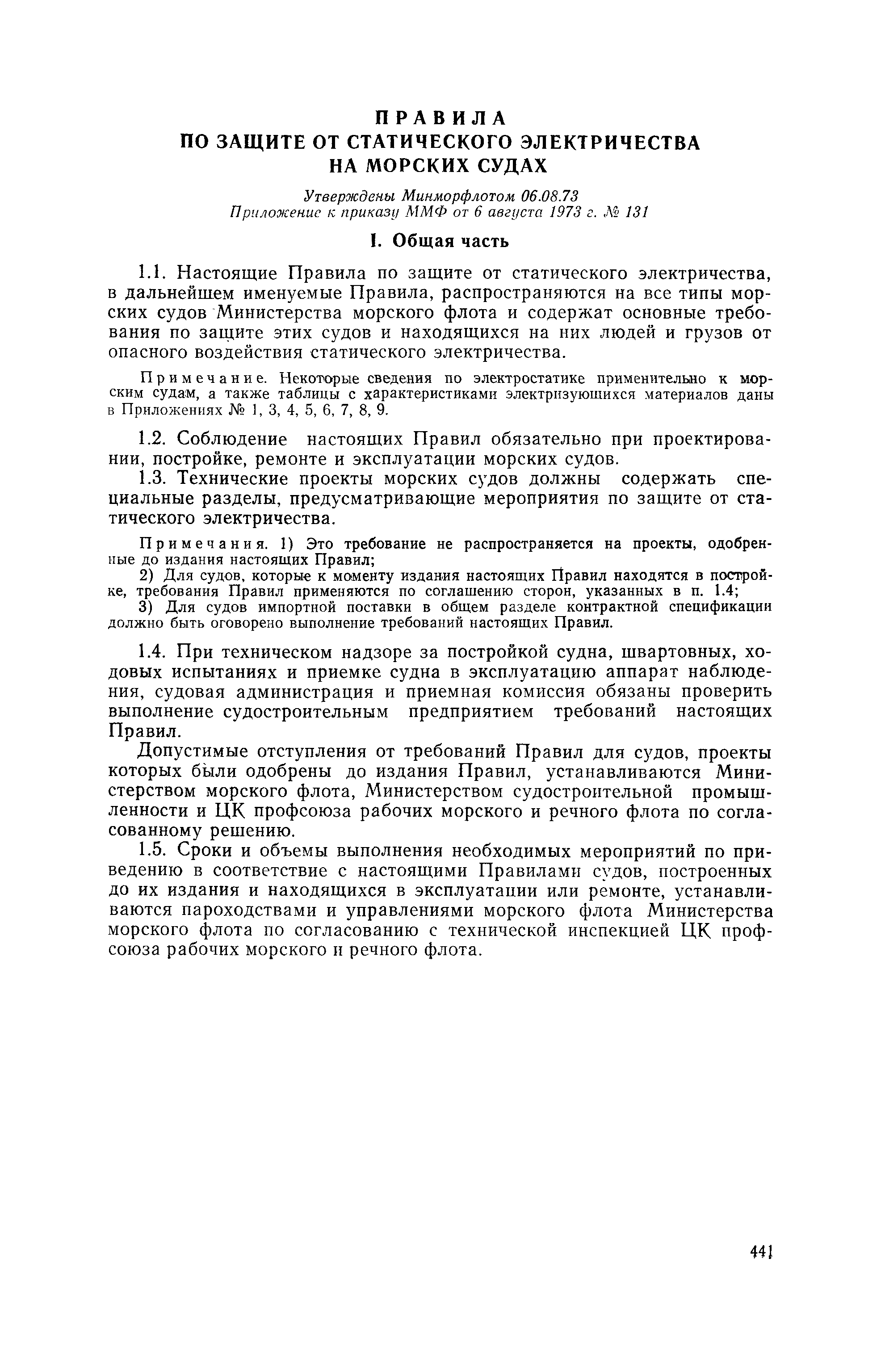 | Область применения: | Правила распространяются на все типы морских судов Министерства морского флота и содержат основные требования по защите этих судов и находящихся на них людей и грузов от опасного воздействия статического электричества. |