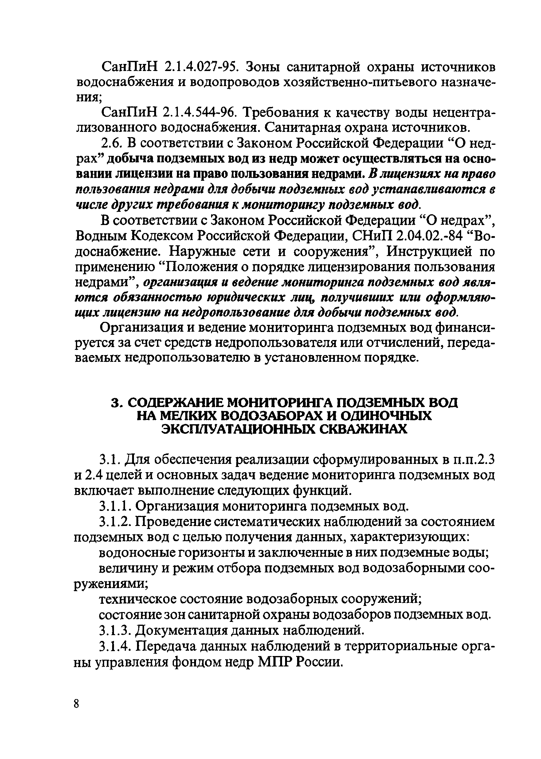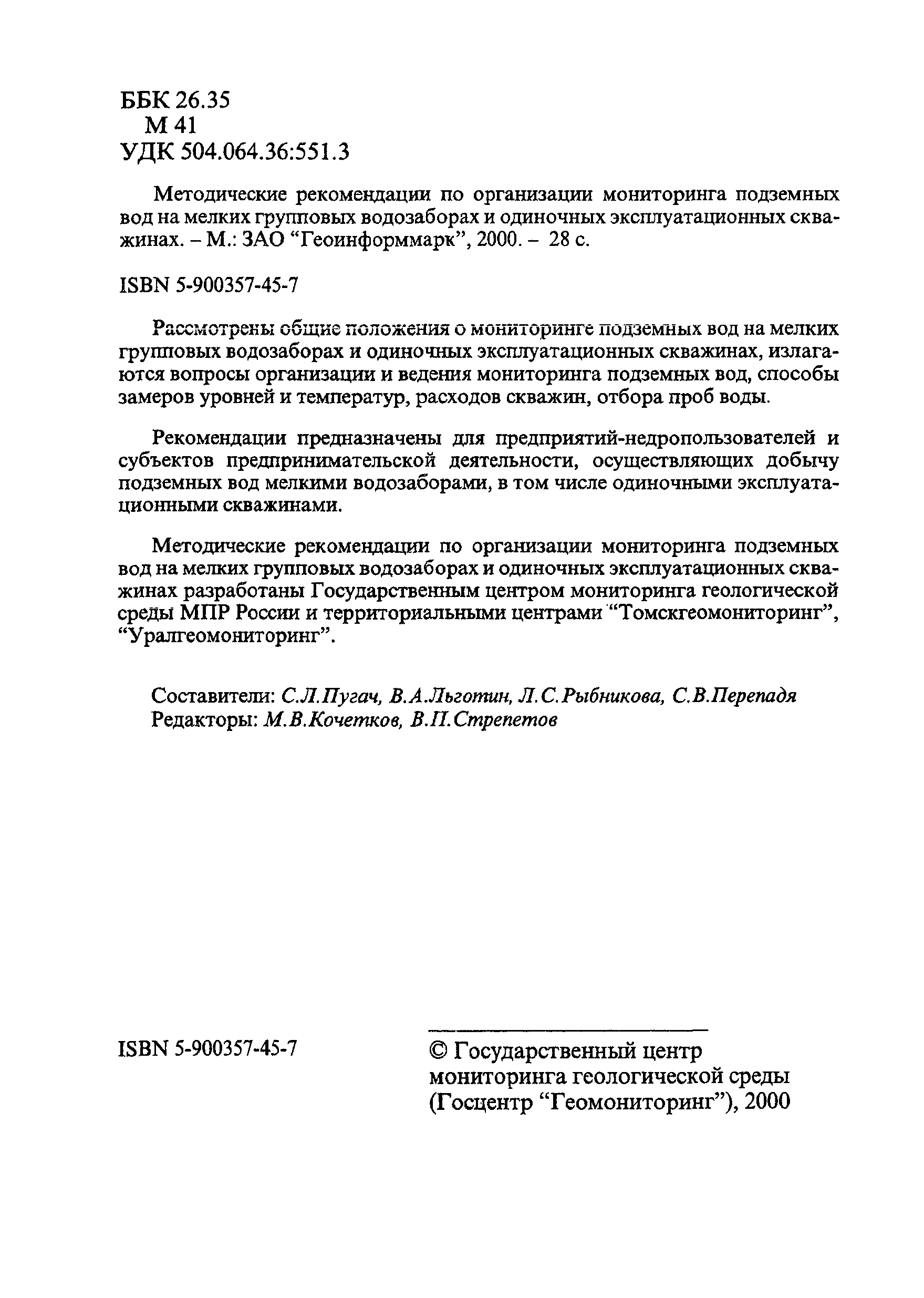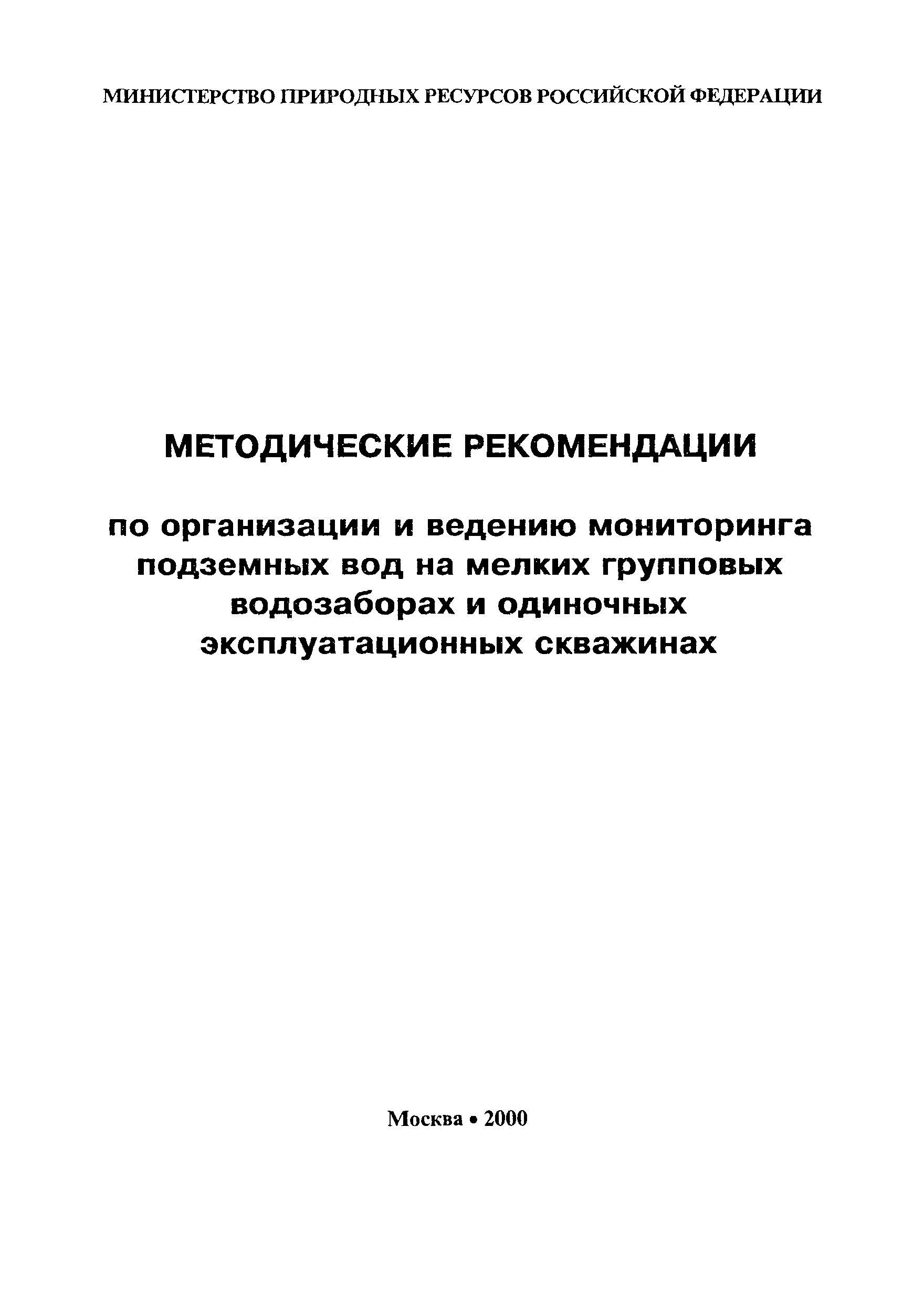 | Название рус.: | Методические рекомендации по организации и ведению мониторинга подземных вод на мелких групповых водозаборах и одиночных эксплуатационных скважинах |