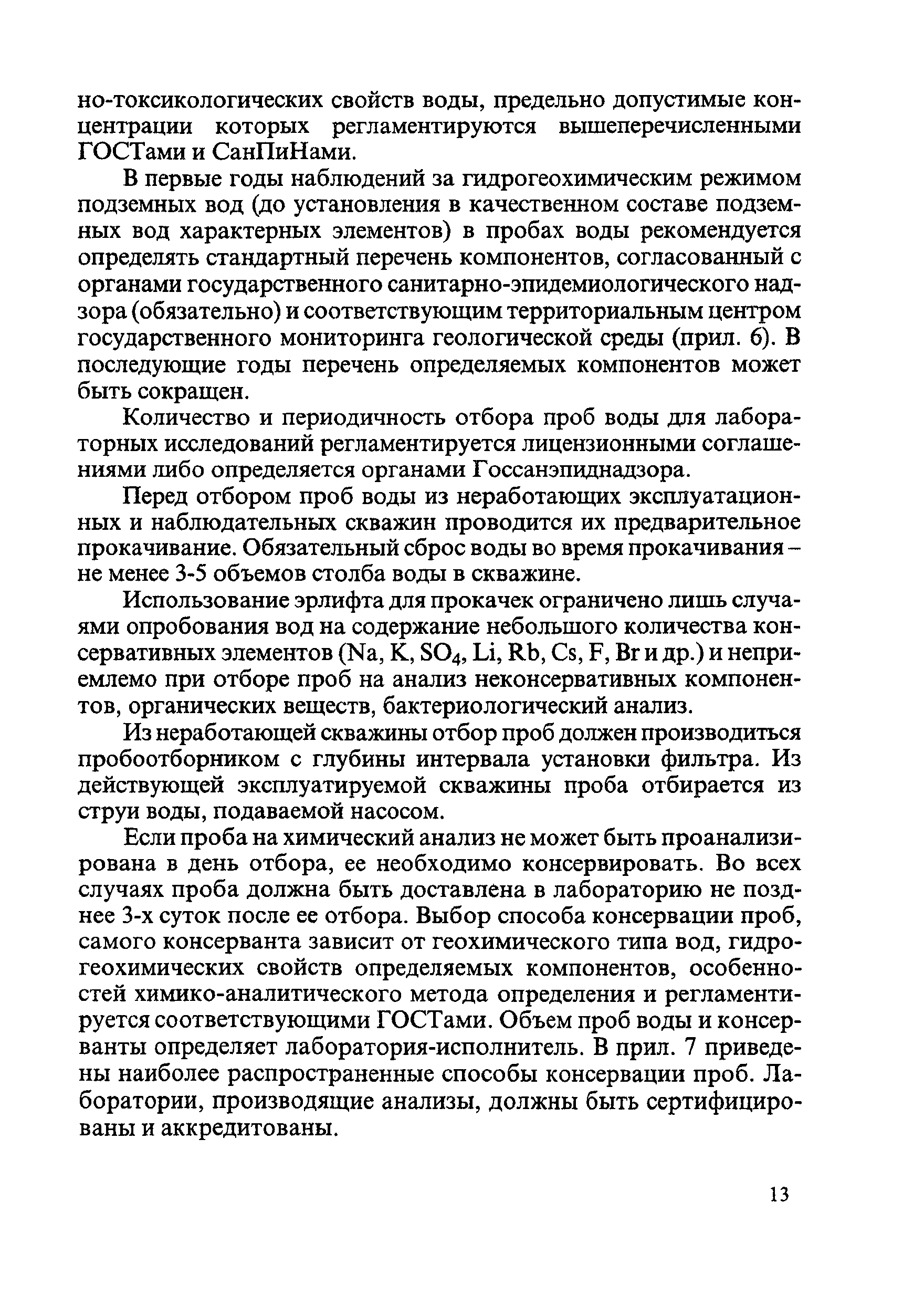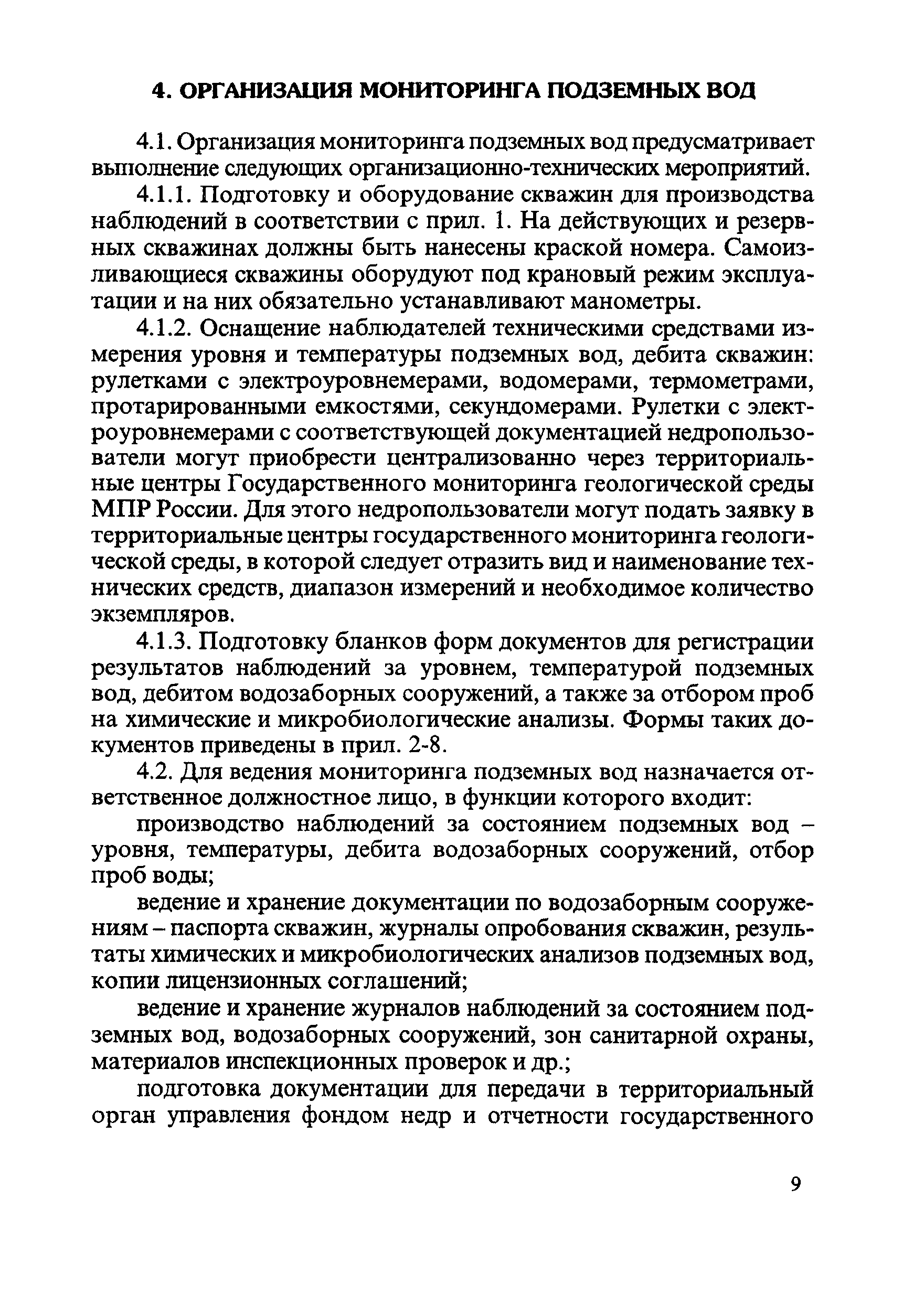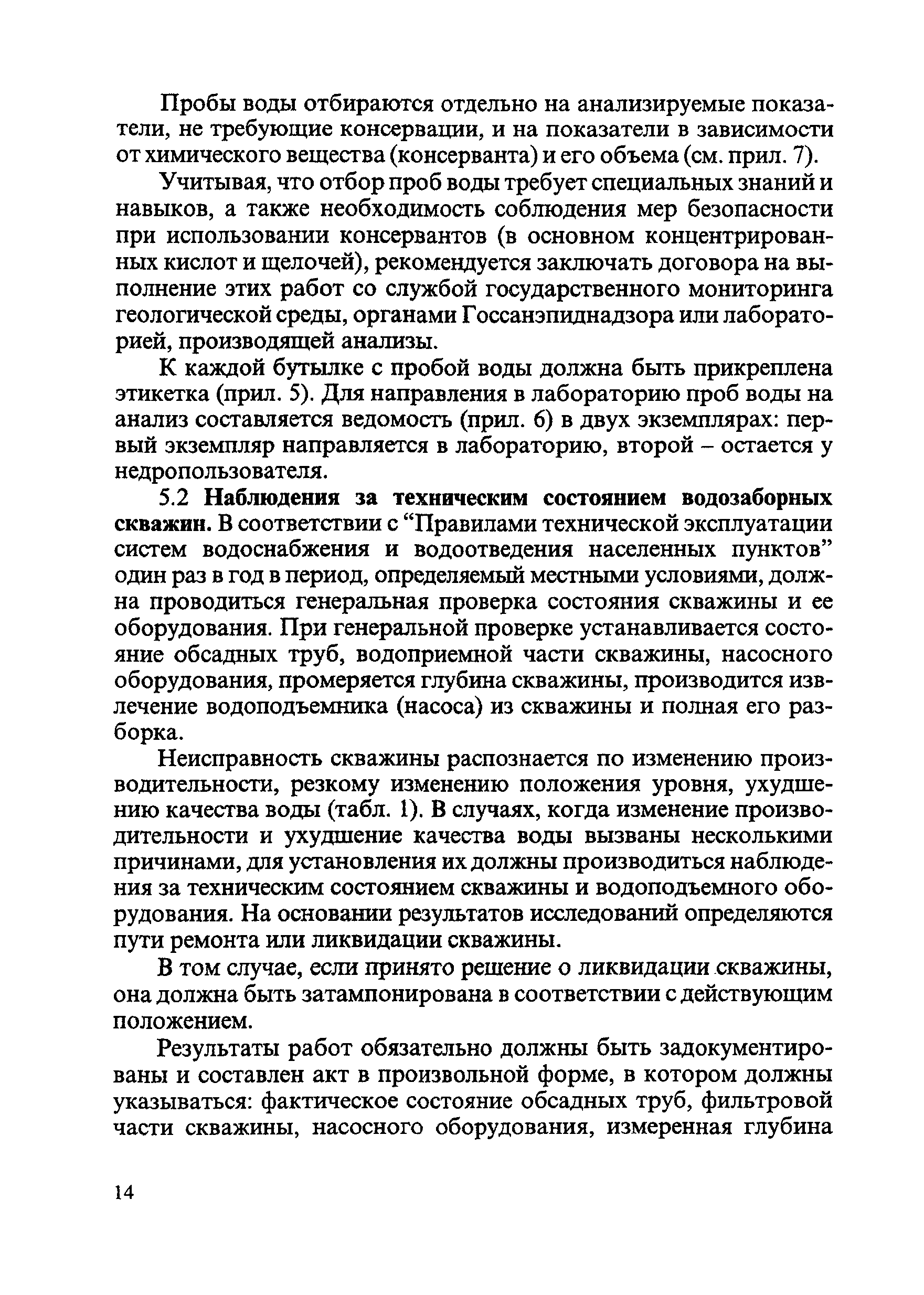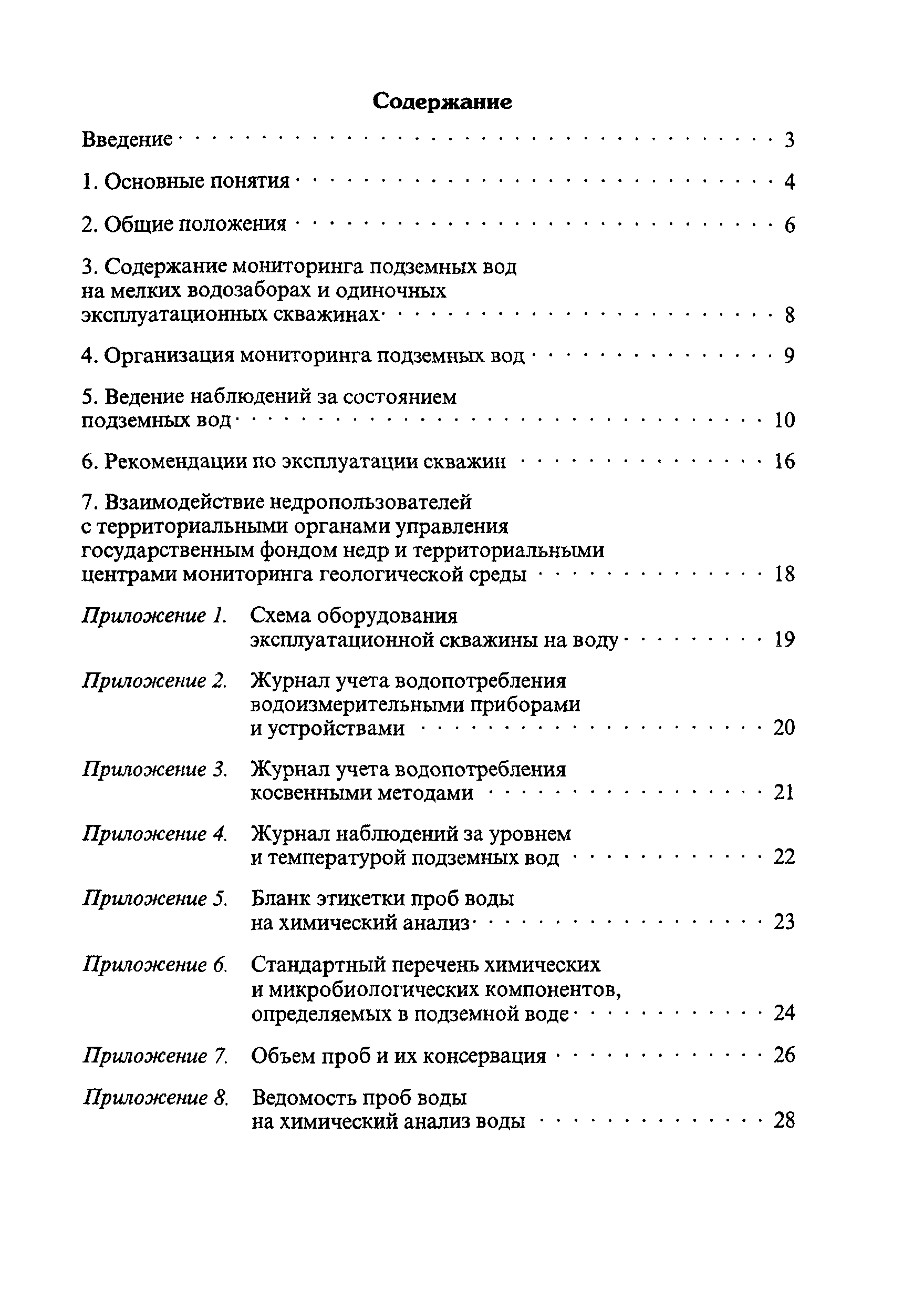 | Оглавление: | Введение 1. Основные понятия 2. Общие положения 3. Содержание мониторинга подземных вод на мелких водозаборах и одиночных эксплуатационных скважинах 4. Организация мониторинга подземных вод 5. Ведение наблюдений за состоянием подземных вод 6. Рекомендации по эксплуатации скважин 7. Взаимодействие недропользователей с территориальными органами управления государственным фондом недр и территориальными центрами мониторинга геологической среды Приложение 1. Схема оборудования эксплуатационной скважины на воду Приложение 2. Журнал учета водопотребления водоизмерительными приборами и устройствами Приложение 3. Журнал учета водопотребления косвенными методами Приложение 4. Журнал наблюдений за уровнем и температурой подземных вод Приложение 5. Бланк этикетки проб воды на химический анализ Приложение 6. Стандартный перечень химических и микробиологических компонентов, определяемых в подземной воде Приложение 7. Объем проб и их консервация Приложение 8. Ведомость проб воды на химический анализ воды |