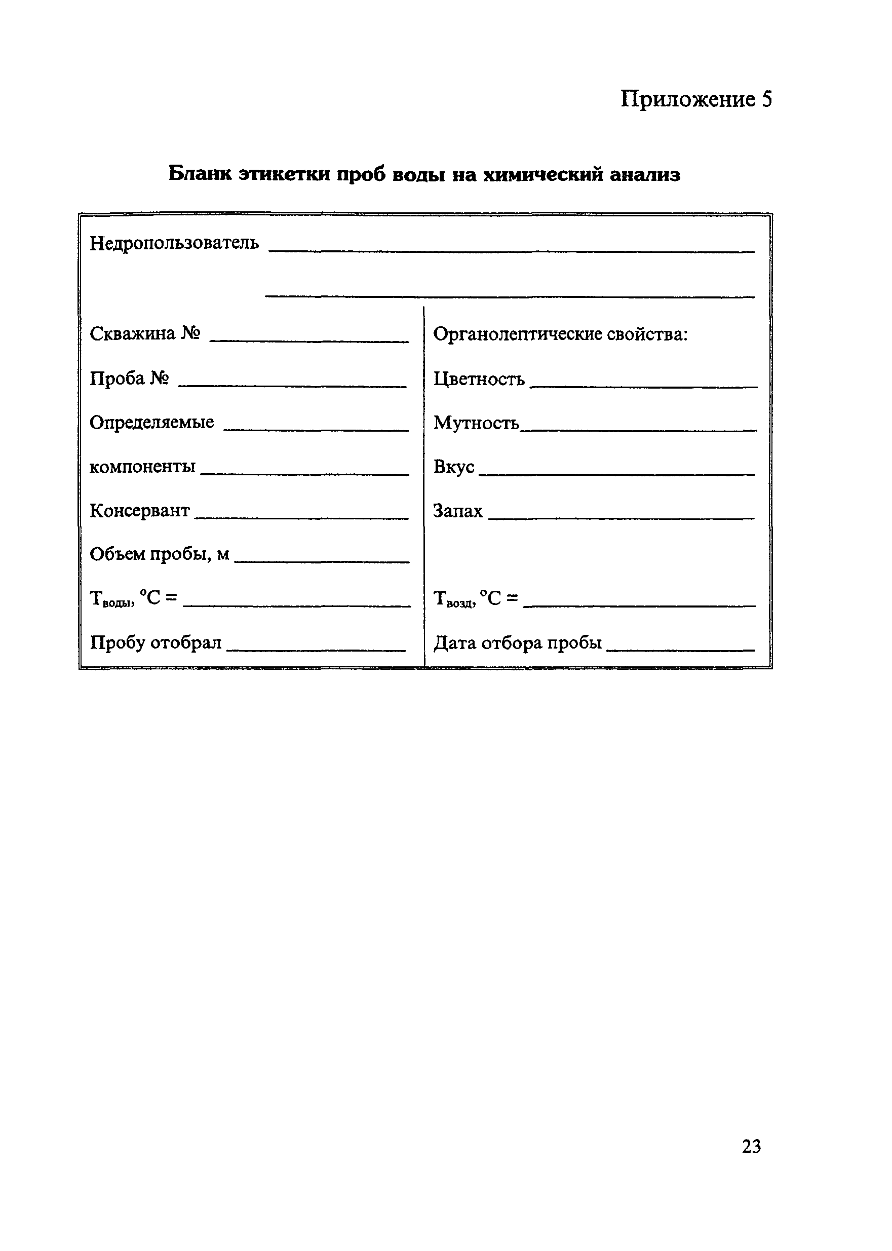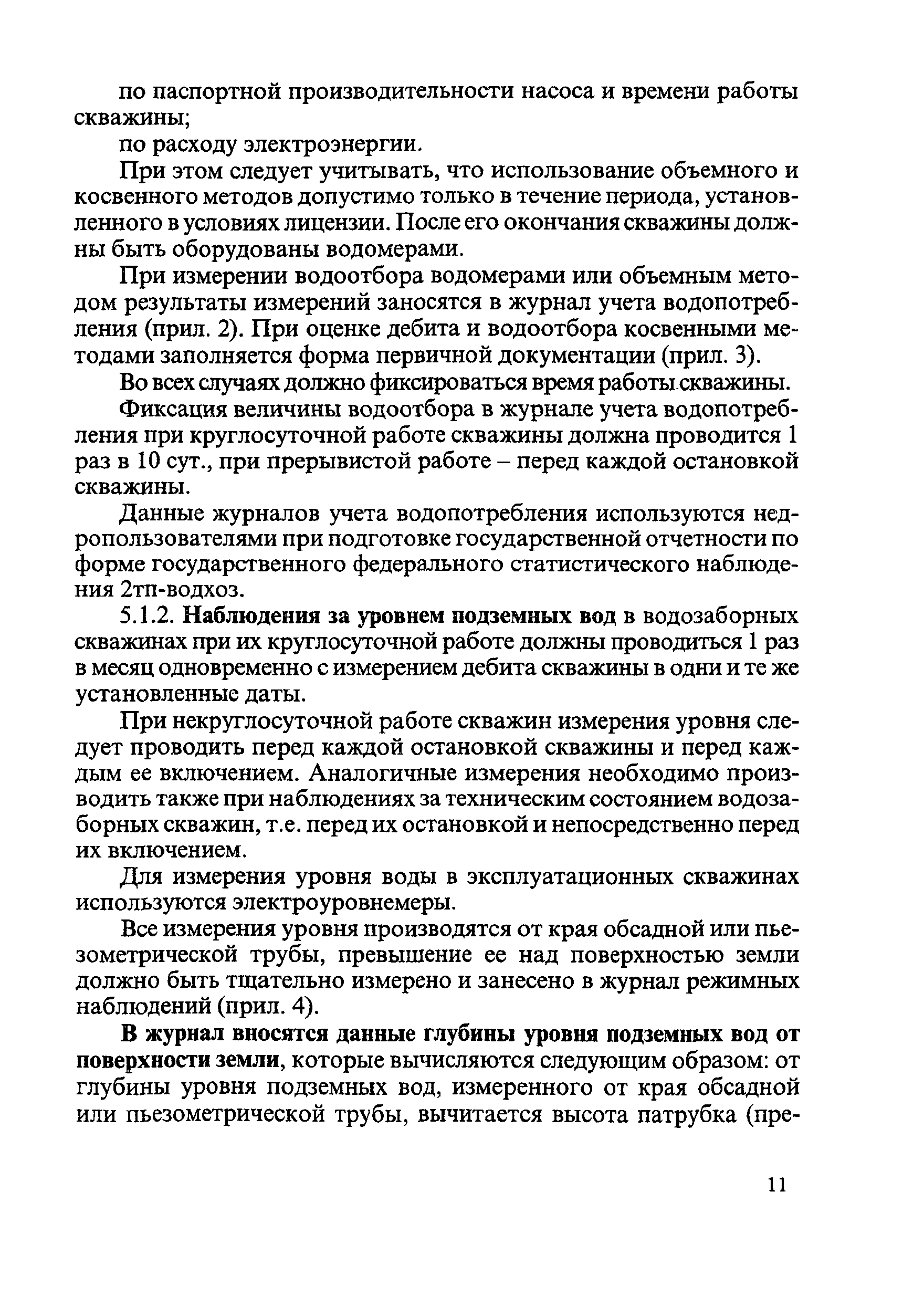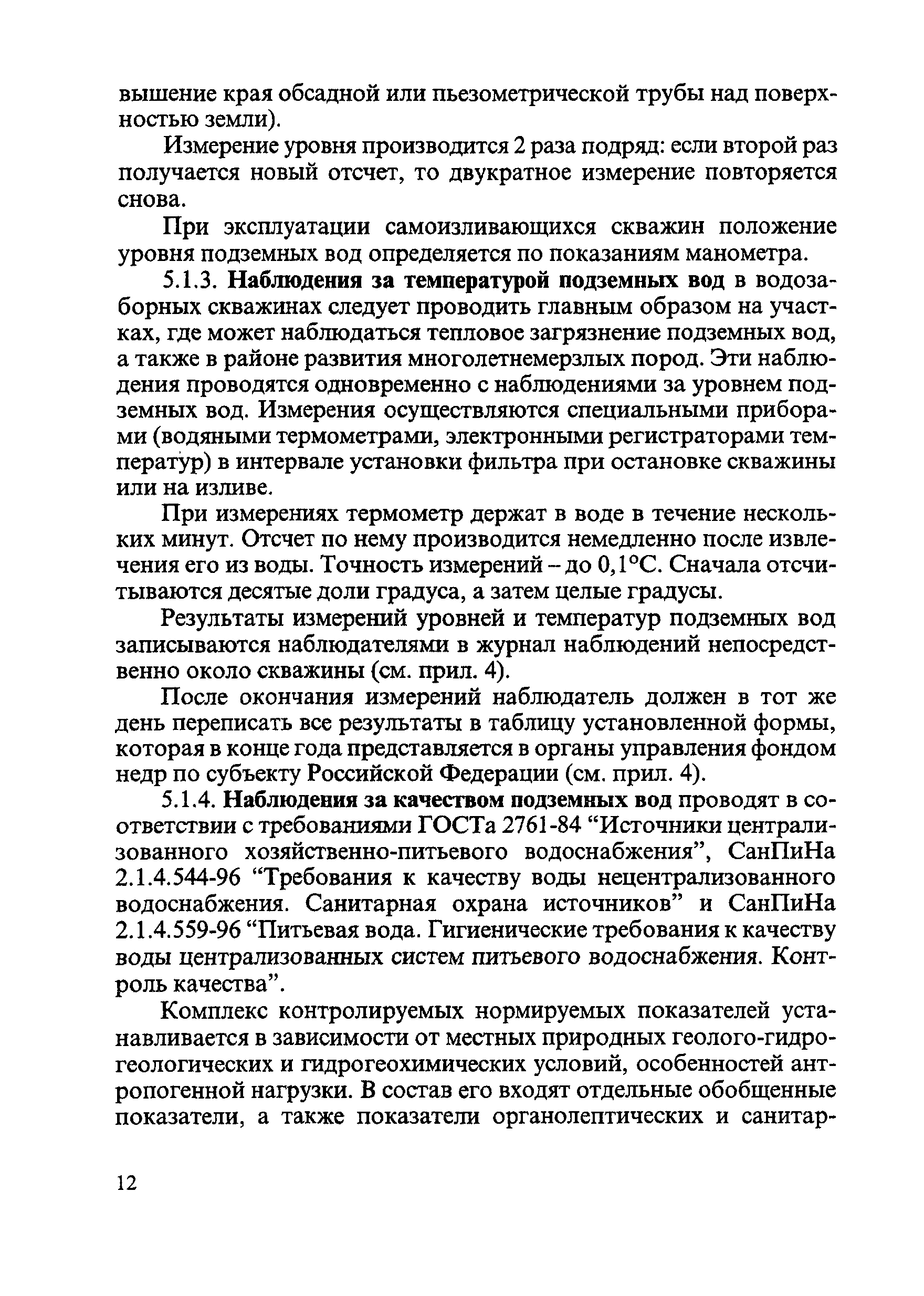 | Оглавление: | Введение 1. Основные понятия 2. Общие положения 3. Содержание мониторинга подземных вод на мелких водозаборах и одиночных эксплуатационных скважинах 4. Организация мониторинга подземных вод 5. Ведение наблюдений за состоянием подземных вод 6. Рекомендации по эксплуатации скважин 7. Взаимодействие недропользователей с территориальными органами управления государственным фондом недр и территориальными центрами мониторинга геологической среды Приложение 1. Схема оборудования эксплуатационной скважины на воду Приложение 2. Журнал учета водопотребления водоизмерительными приборами и устройствами Приложение 3. Журнал учета водопотребления косвенными методами Приложение 4. Журнал наблюдений за уровнем и температурой подземных вод Приложение 5. Бланк этикетки проб воды на химический анализ Приложение 6. Стандартный перечень химических и микробиологических компонентов, определяемых в подземной воде Приложение 7. Объем проб и их консервация Приложение 8. Ведомость проб воды на химический анализ воды |