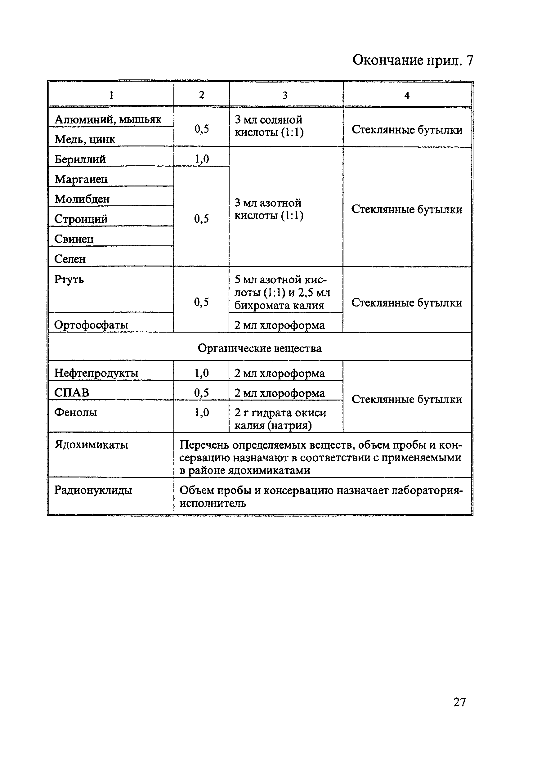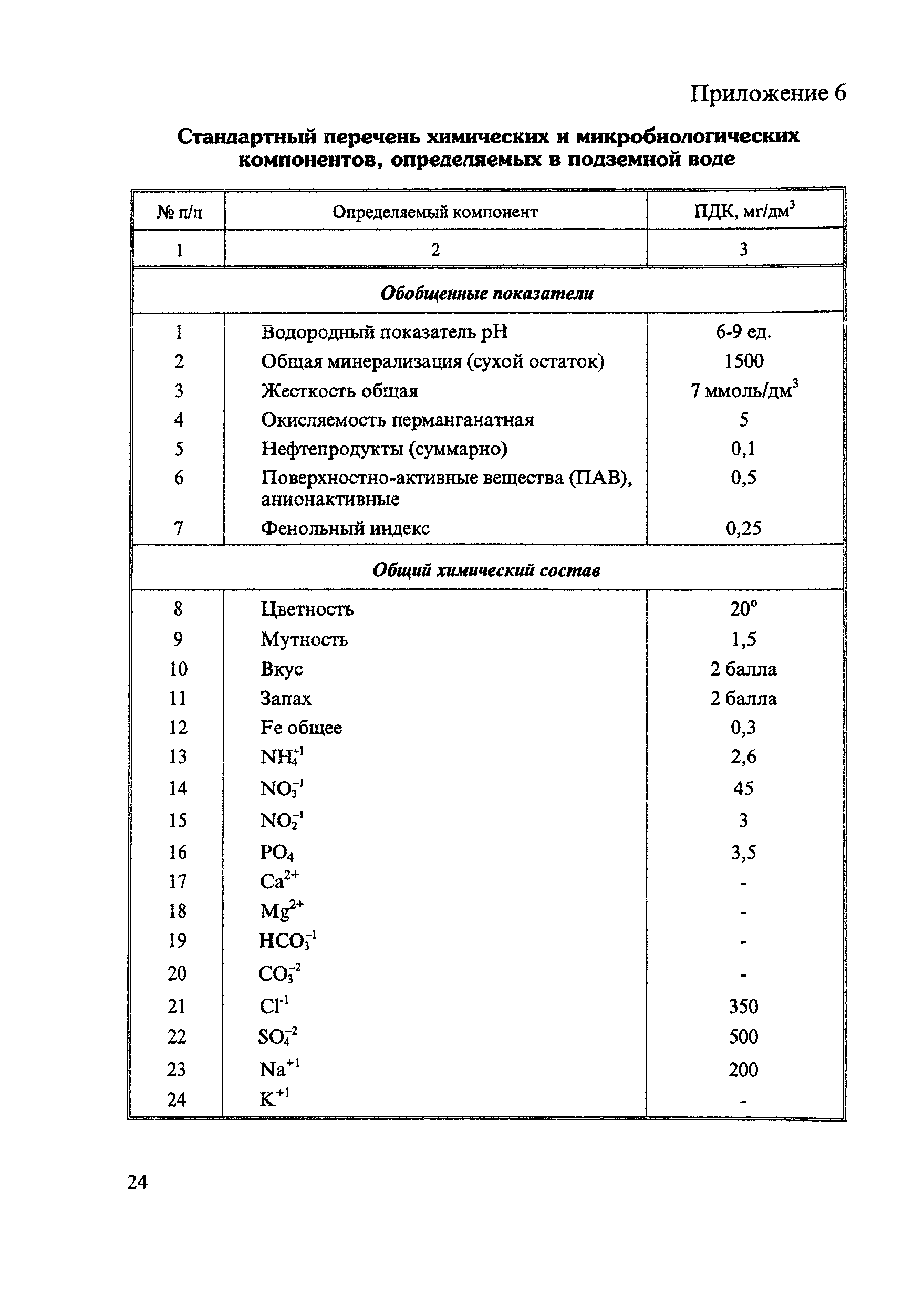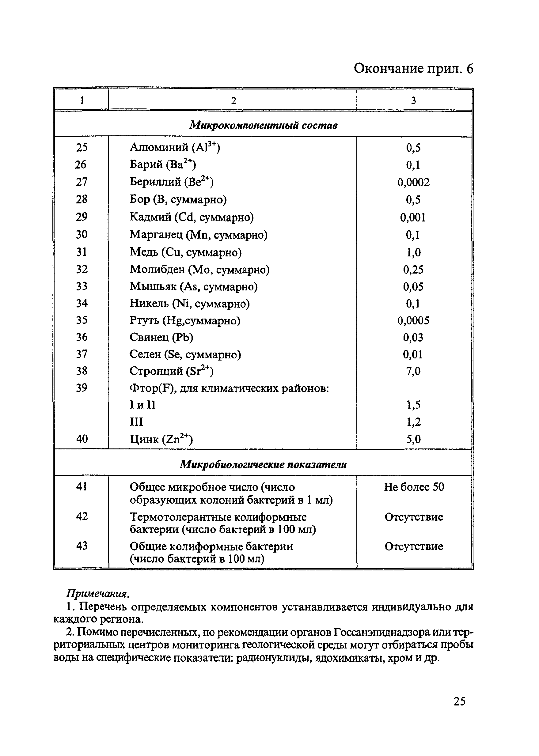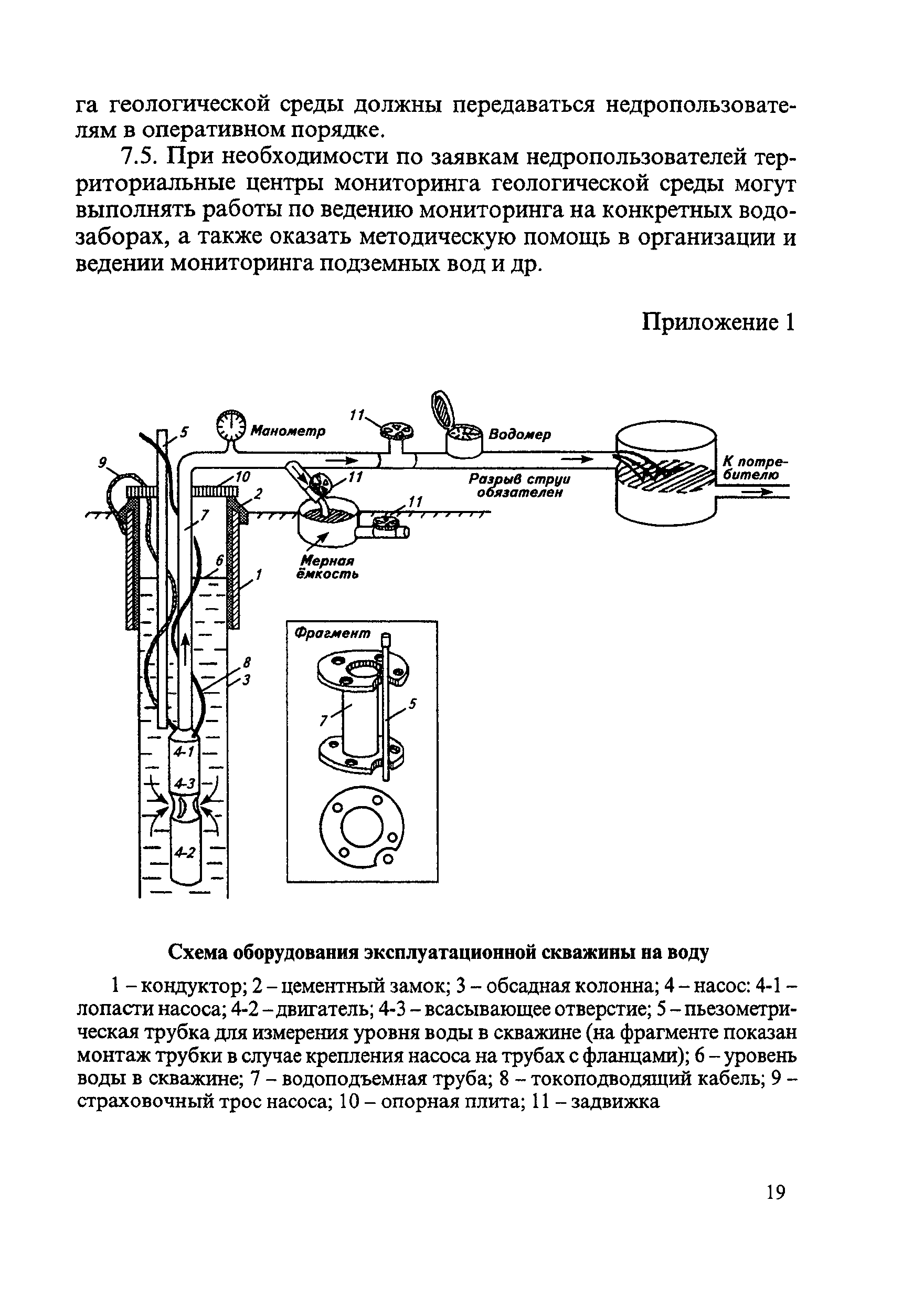 | Оглавление: | Введение 1. Основные понятия 2. Общие положения 3. Содержание мониторинга подземных вод на мелких водозаборах и одиночных эксплуатационных скважинах 4. Организация мониторинга подземных вод 5. Ведение наблюдений за состоянием подземных вод 6. Рекомендации по эксплуатации скважин 7. Взаимодействие недропользователей с территориальными органами управления государственным фондом недр и территориальными центрами мониторинга геологической среды Приложение 1. Схема оборудования эксплуатационной скважины на воду Приложение 2. Журнал учета водопотребления водоизмерительными приборами и устройствами Приложение 3. Журнал учета водопотребления косвенными методами Приложение 4. Журнал наблюдений за уровнем и температурой подземных вод Приложение 5. Бланк этикетки проб воды на химический анализ Приложение 6. Стандартный перечень химических и микробиологических компонентов, определяемых в подземной воде Приложение 7. Объем проб и их консервация Приложение 8. Ведомость проб воды на химический анализ воды |