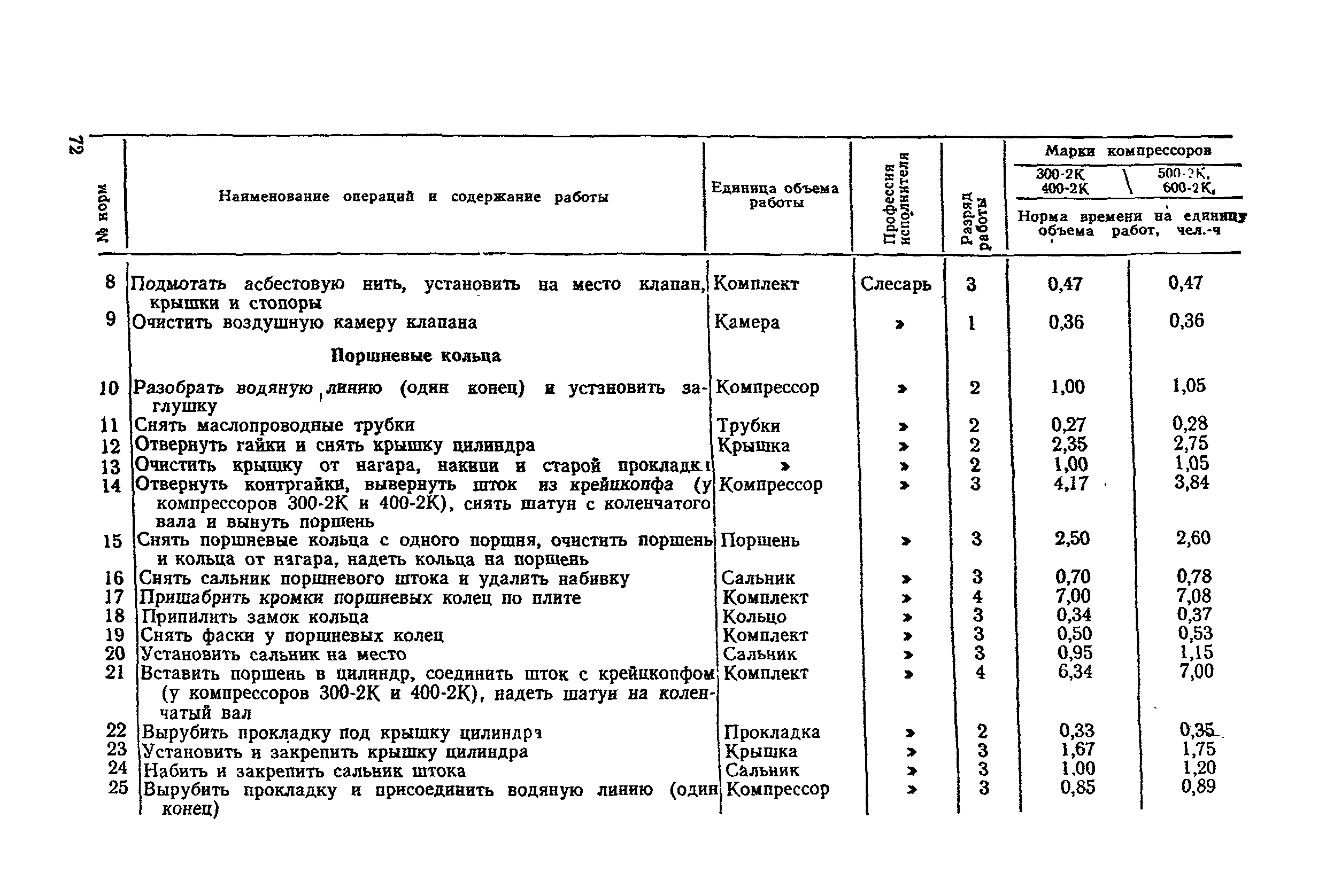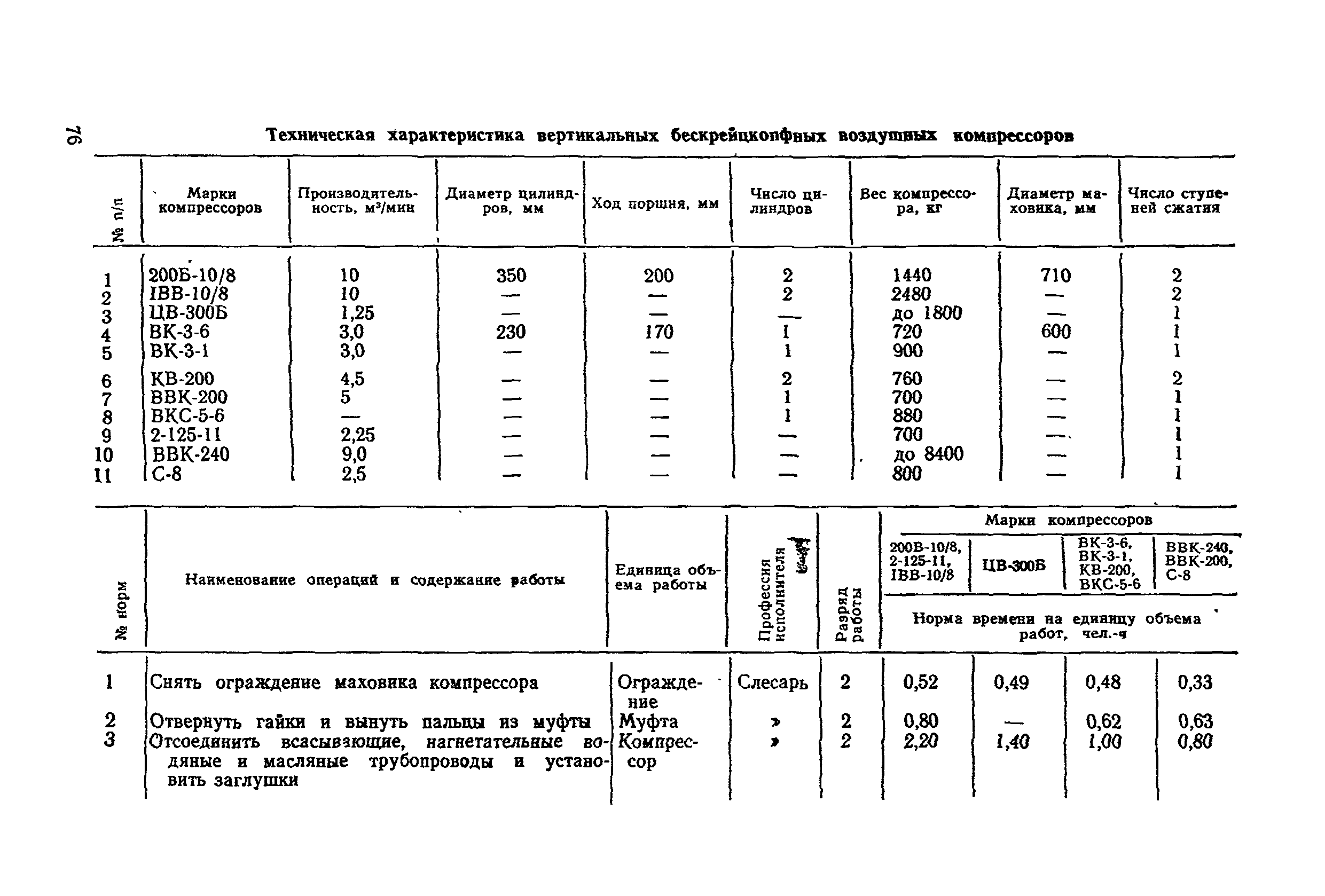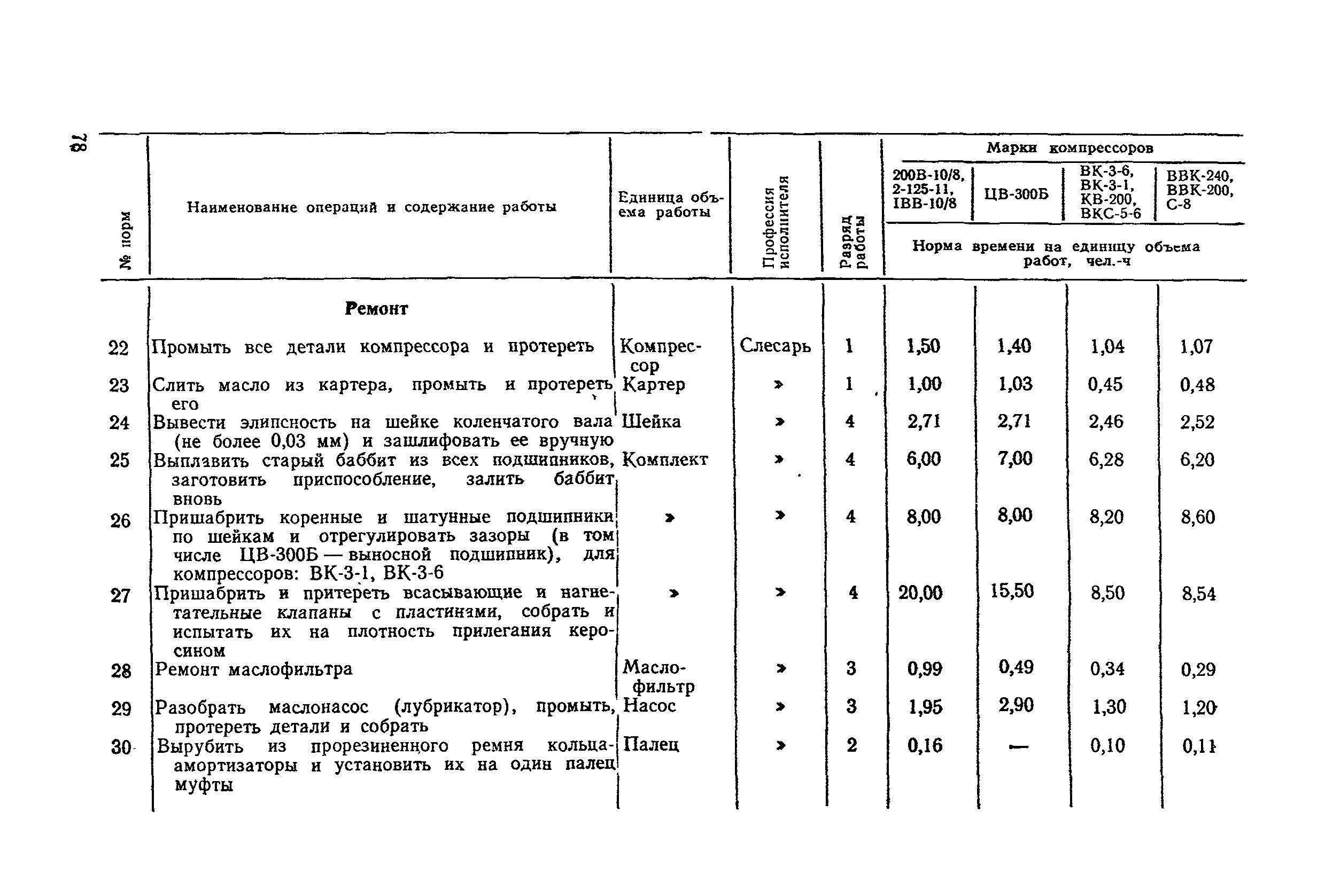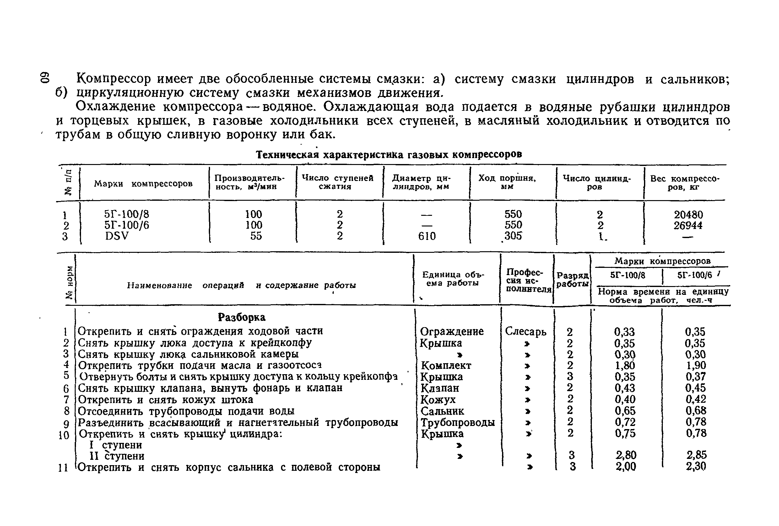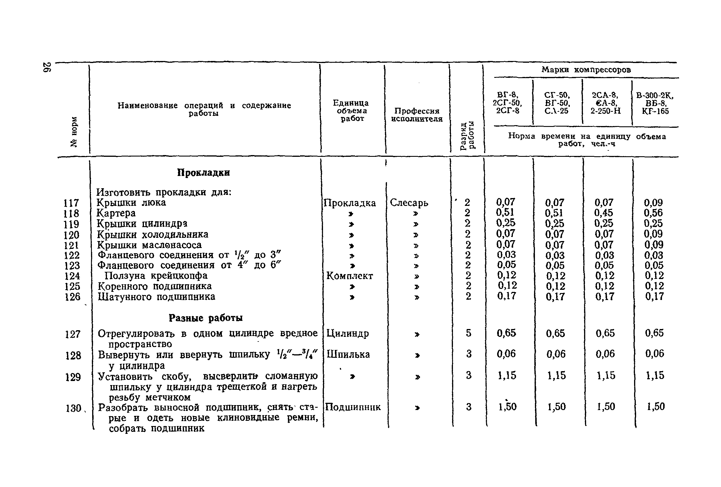 Типовые нормы времени на ремонт компрессоров (стационарных воздушных и газовых производительностью до 100 м3/мин)| Статус: | отменен в рф | | Название рус.: | Типовые нормы времени на ремонт компрессоров (стационарных воздушных и газовых производительностью до 100 м3/мин) | | Дата добавления в базу: | 01.09.2013 | | Дата актуализации: | 01.01.2021 | | Дата введения: | 25.06.2020 | | Область применения: | Сборник содержит нормы времени на разборку, сборку и ремонт компрессоров стационарных воздушных и газовых: крейцкопфных, бескрейцкопфных, ротационных и турбокомпрессоров. | | Оглавление: | Общая часть Организация труда Нормативная часть Раздел 1. Крейцкопфные компрессоры 1. Вертикальные двухрядные воздушные компрессоры типа ВГ, СГ, СА, В, ВБ, КГ 2. Угловые (прямоугольные) воздушные и газовые компрессоры типа: ВП и ГП 3. Вертикальные двухрядные воздушные компрессоры высокого давления типа Р. РК, РО, РВ, ЭК 4. Горизонтальные одно- и двухрядные воздушные компрессоры низкого давления типа В, ВГ, АГ, ГМ, АГК, АДК, ЗУГМ, 4УГ, 5УГ 5. Горизонтальные двухрядные газовые компрессоры типа 5Г, ДSV 6. Горизонтальные воздушные компрессоры низкого давления типа 300-2К, 400-2К, 500-2К, 600-2К Раздел II. Бескрейцкопфные компрессоры 7. Вертикальные, одно0 и двухрядные воздушные компрессоры типа В, ЦВ, ВК, КВ, ВКС, ВВК, C 8. Вертикальные одно- и двухрядные, одно- и двухцилиндровые компрессоры типа АВ, ФВ, Г 9. Вертикальные V- и W-образные воздушные компрессоры типа В, АУ, БАУ, ВУ, КС-3М, КСЭ-3М, К-5, КСЭ-5М 10. Вертикальные аммиачные компрессоры типа АВ-100, АУ-200, АУ-300, АУ-400, ДАУ-80, ДАУ-100 Раздел III. Ротационные компрессоры и турбокомпрессоры 11. Ротационные компрессоры типа "Демаг", "Клейн-Шандлер-Беккер" 12. Турбокомпрессоры типа ТГ-700/7, "ККК", ТР-7/3. "ЕГЕР", ТГ-4 | | Разработан: | НИИ труда Госкомтруда СССР ЦБНТ