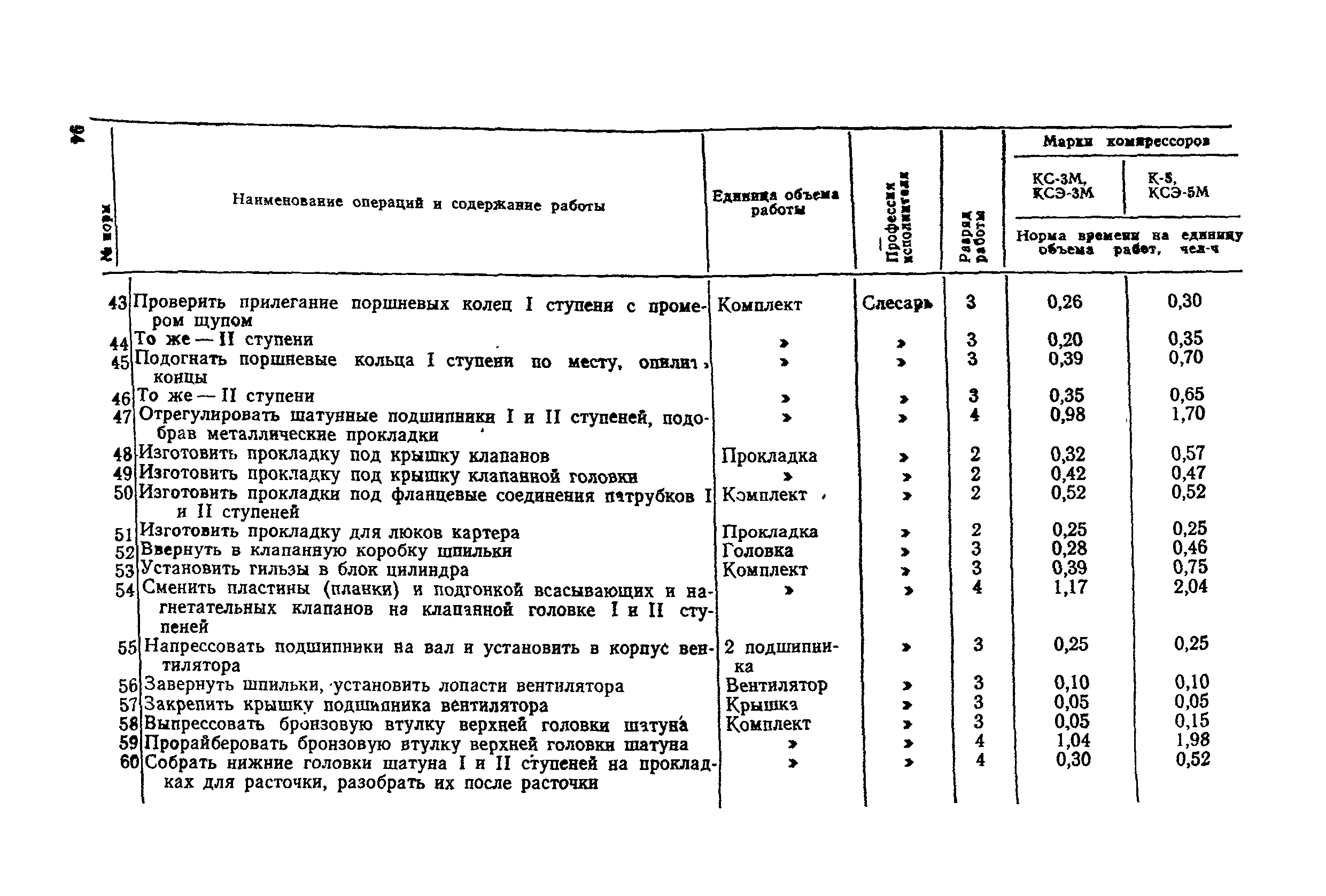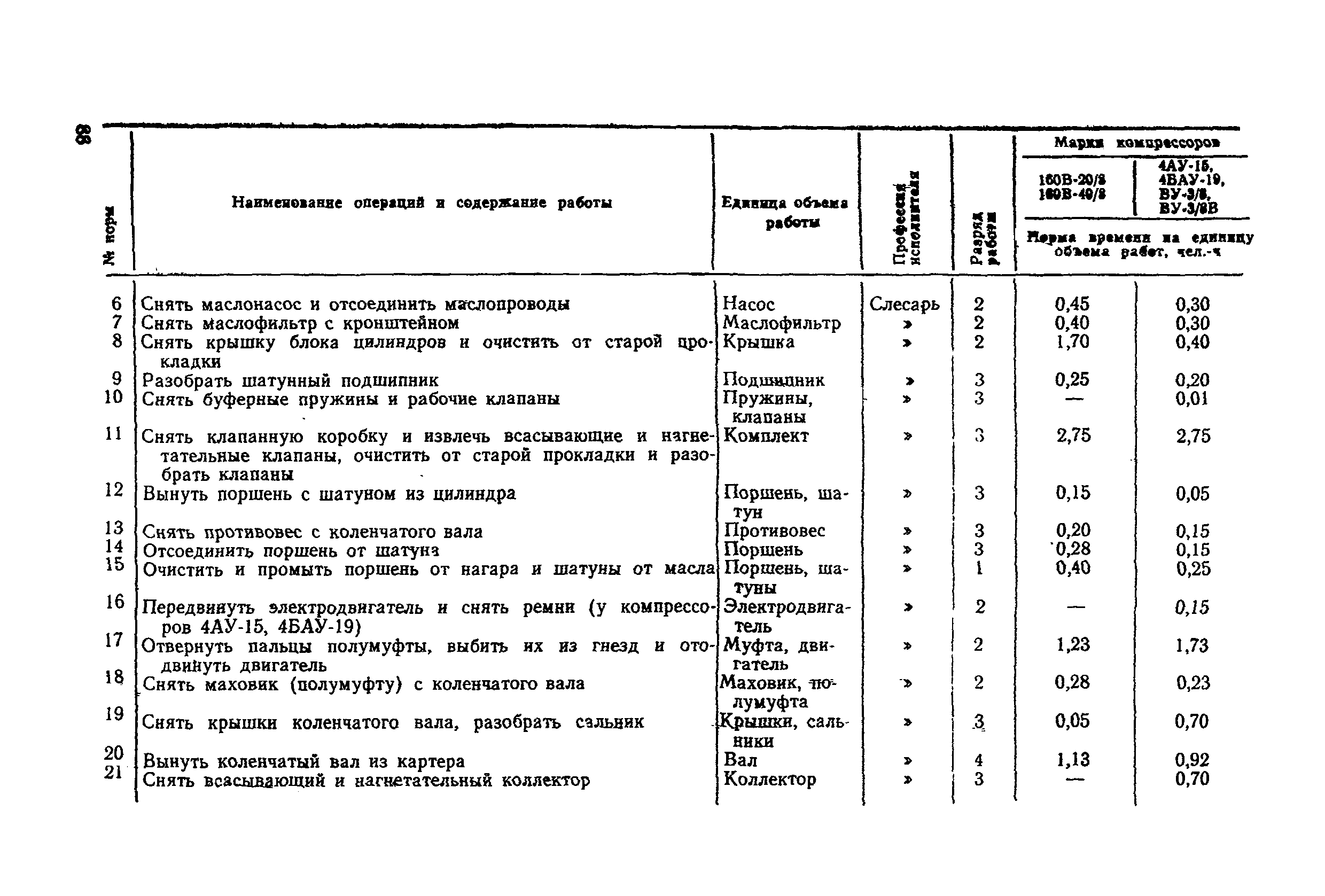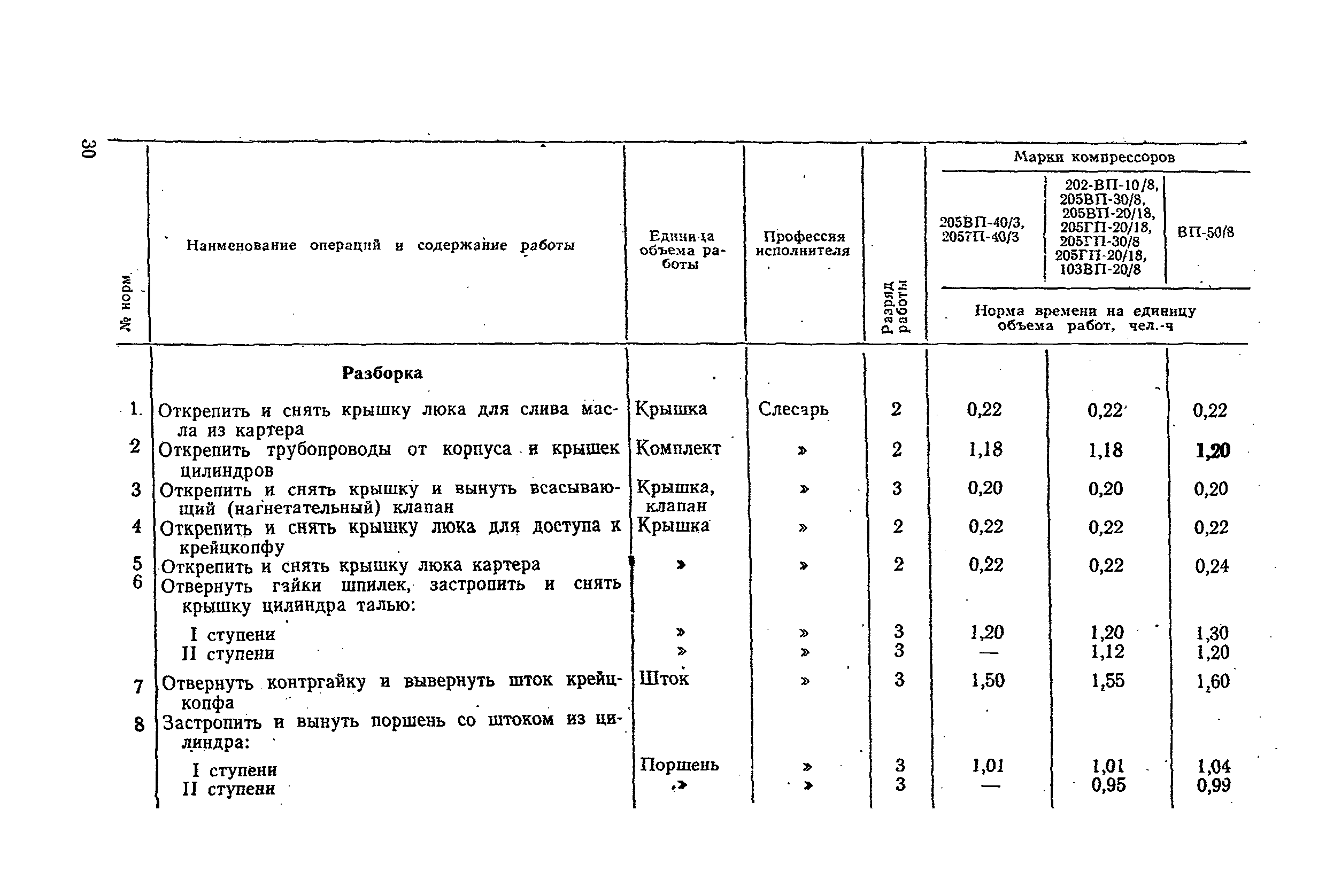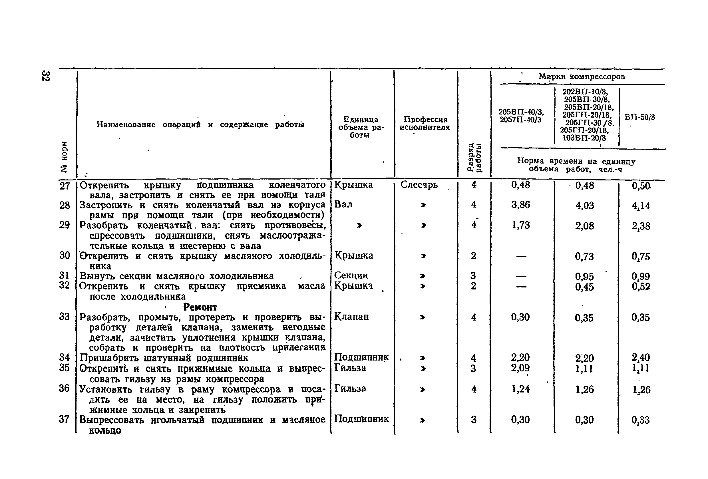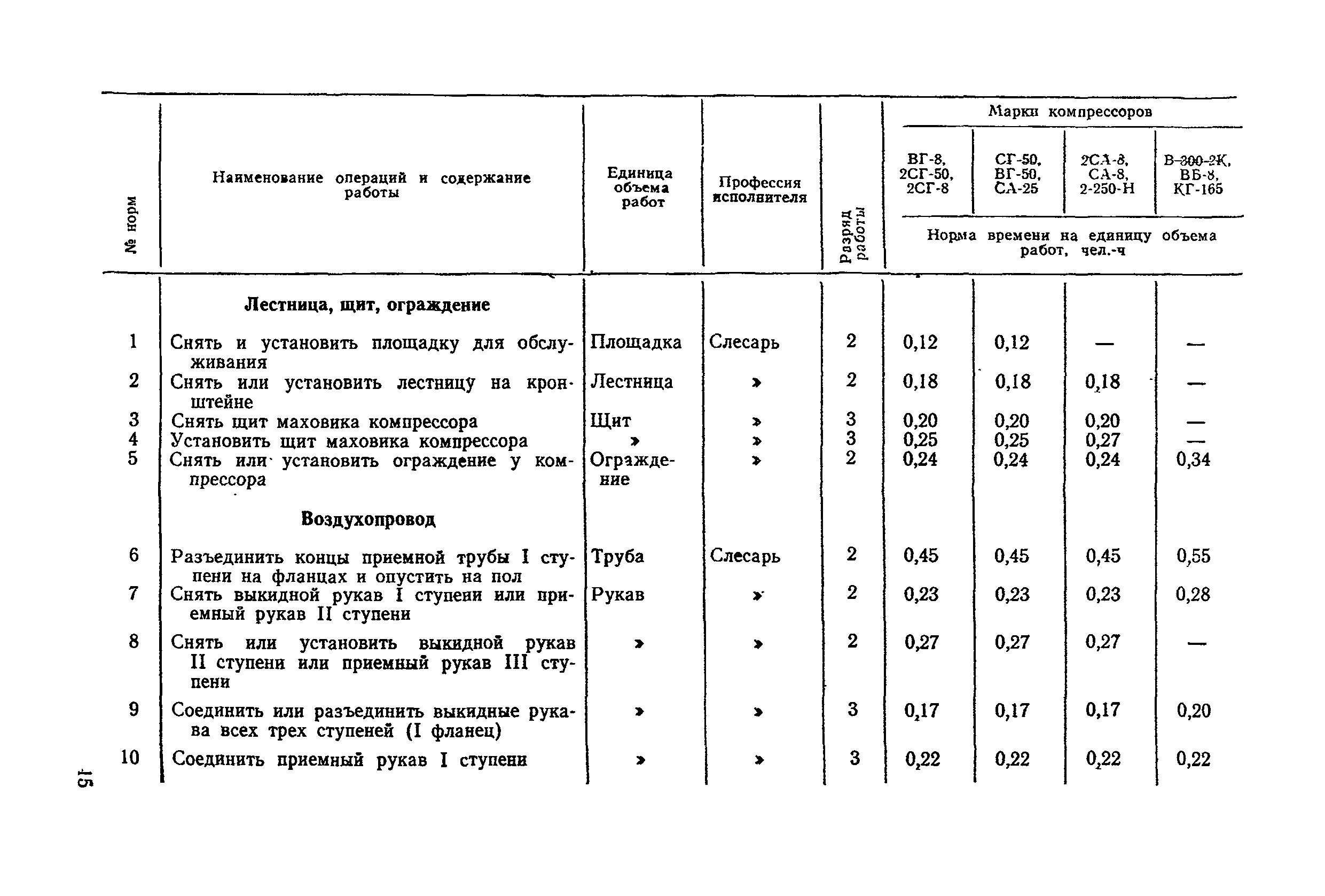 Типовые нормы времени на ремонт компрессоров (стационарных воздушных и газовых производительностью до 100 м3/мин)| Статус: | отменен в рф | | Название рус.: | Типовые нормы времени на ремонт компрессоров (стационарных воздушных и газовых производительностью до 100 м3/мин) | | Дата добавления в базу: | 01.09.2013 | | Дата актуализации: | 01.01.2021 | | Дата введения: | 25.06.2020 | | Область применения: | Сборник содержит нормы времени на разборку, сборку и ремонт компрессоров стационарных воздушных и газовых: крейцкопфных, бескрейцкопфных, ротационных и турбокомпрессоров. | | Оглавление: | Общая часть Организация труда Нормативная часть Раздел 1. Крейцкопфные компрессоры 1. Вертикальные двухрядные воздушные компрессоры типа ВГ, СГ, СА, В, ВБ, КГ 2. Угловые (прямоугольные) воздушные и газовые компрессоры типа: ВП и ГП 3. Вертикальные двухрядные воздушные компрессоры высокого давления типа Р. РК, РО, РВ, ЭК 4. Горизонтальные одно- и двухрядные воздушные компрессоры низкого давления типа В, ВГ, АГ, ГМ, АГК, АДК, ЗУГМ, 4УГ, 5УГ 5. Горизонтальные двухрядные газовые компрессоры типа 5Г, ДSV 6. Горизонтальные воздушные компрессоры низкого давления типа 300-2К, 400-2К, 500-2К, 600-2К Раздел II. Бескрейцкопфные компрессоры 7. Вертикальные, одно0 и двухрядные воздушные компрессоры типа В, ЦВ, ВК, КВ, ВКС, ВВК, C 8. Вертикальные одно- и двухрядные, одно- и двухцилиндровые компрессоры типа АВ, ФВ, Г 9. Вертикальные V- и W-образные воздушные компрессоры типа В, АУ, БАУ, ВУ, КС-3М, КСЭ-3М, К-5, КСЭ-5М 10. Вертикальные аммиачные компрессоры типа АВ-100, АУ-200, АУ-300, АУ-400, ДАУ-80, ДАУ-100 Раздел III. Ротационные компрессоры и турбокомпрессоры 11. Ротационные компрессоры типа "Демаг", "Клейн-Шандлер-Беккер" 12. Турбокомпрессоры типа ТГ-700/7, "ККК", ТР-7/3. "ЕГЕР", ТГ-4 | | Разработан: | НИИ труда Госкомтруда СССР ЦБНТ