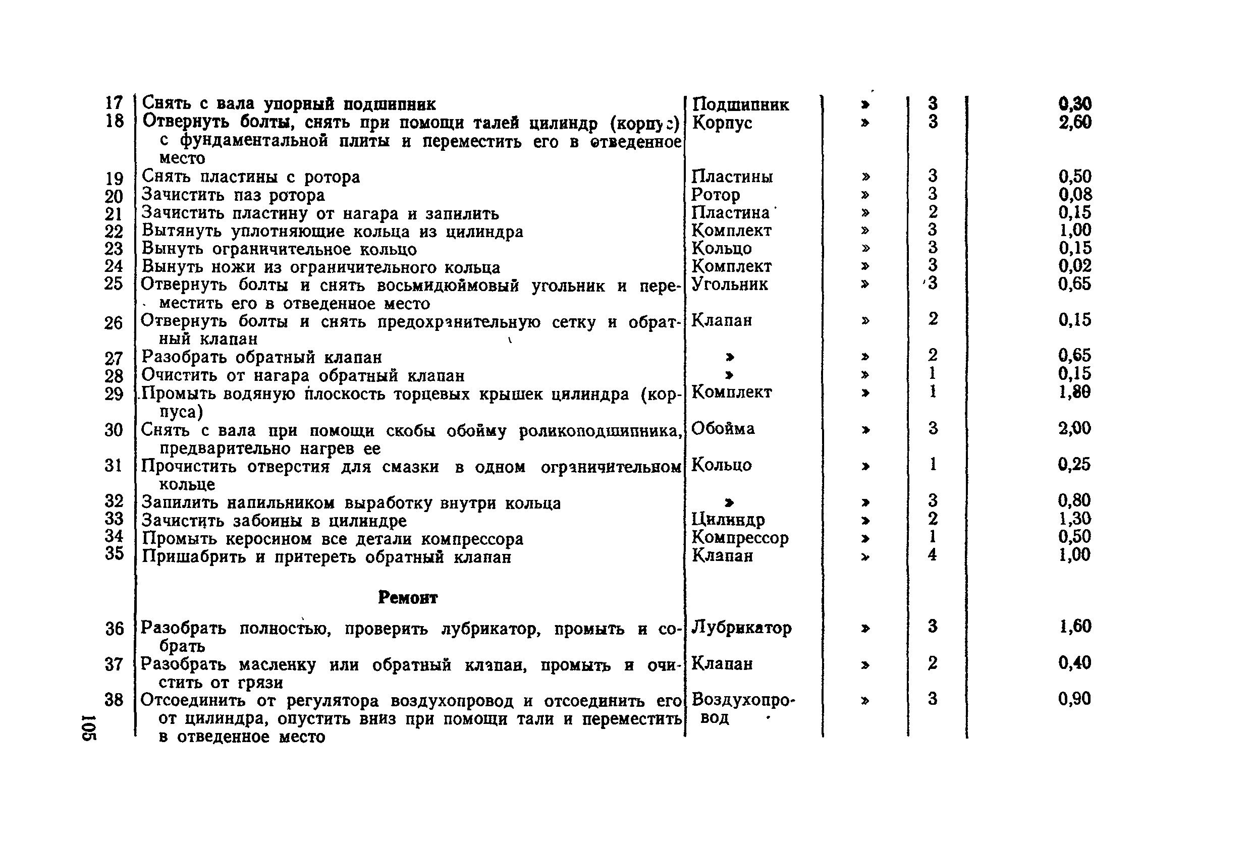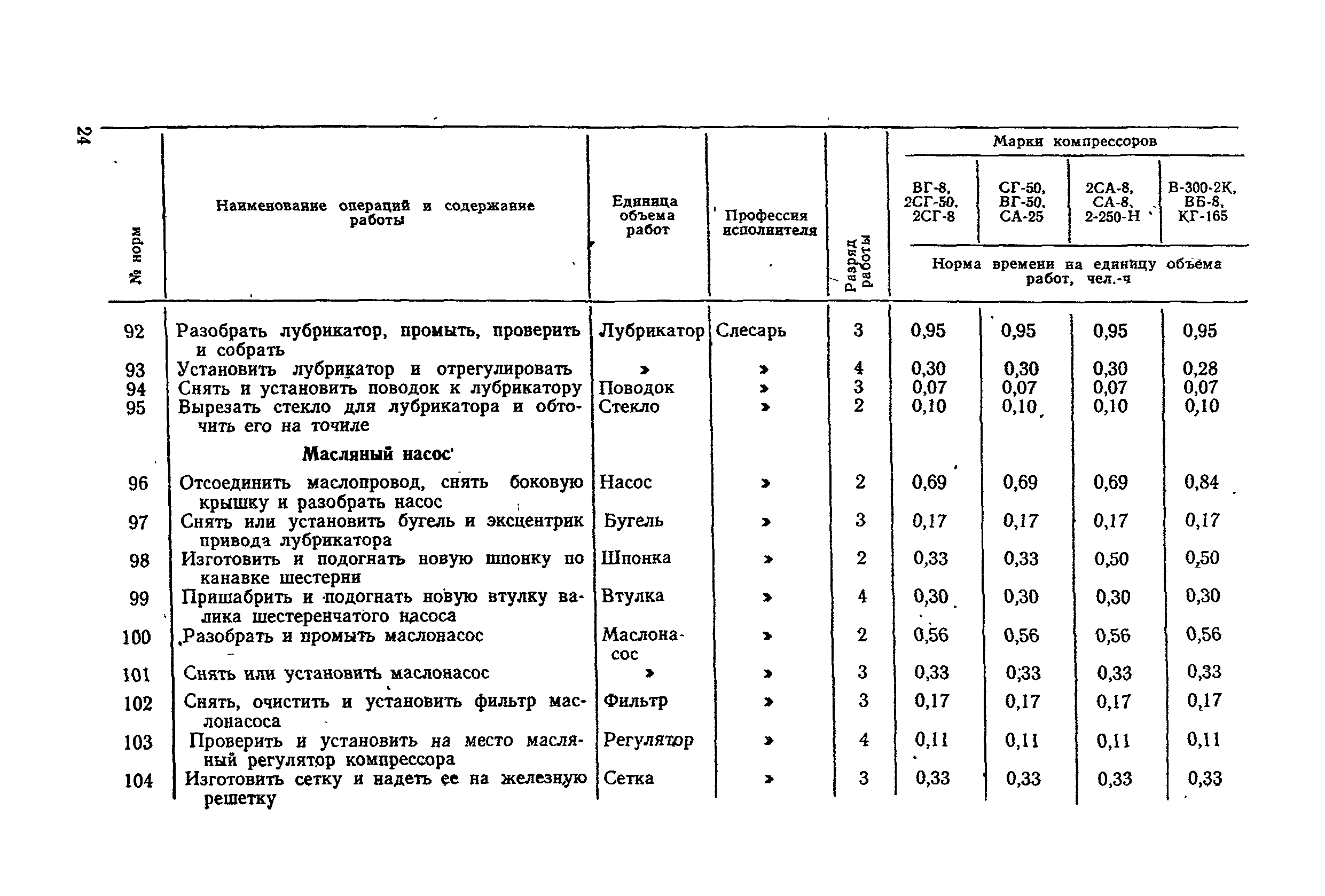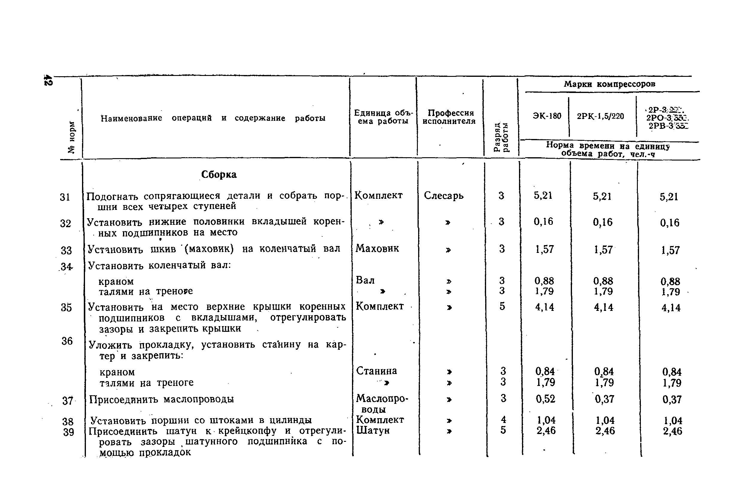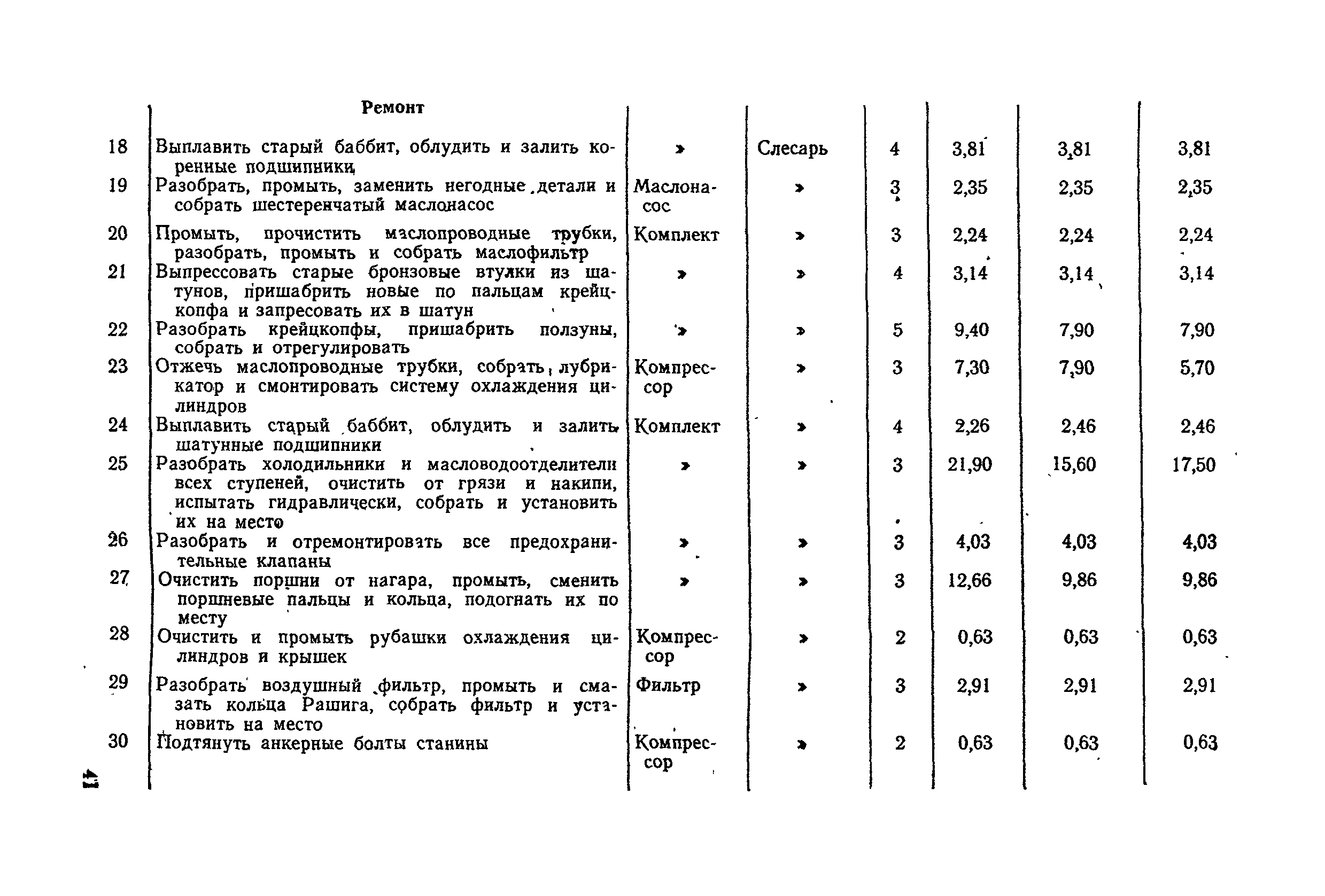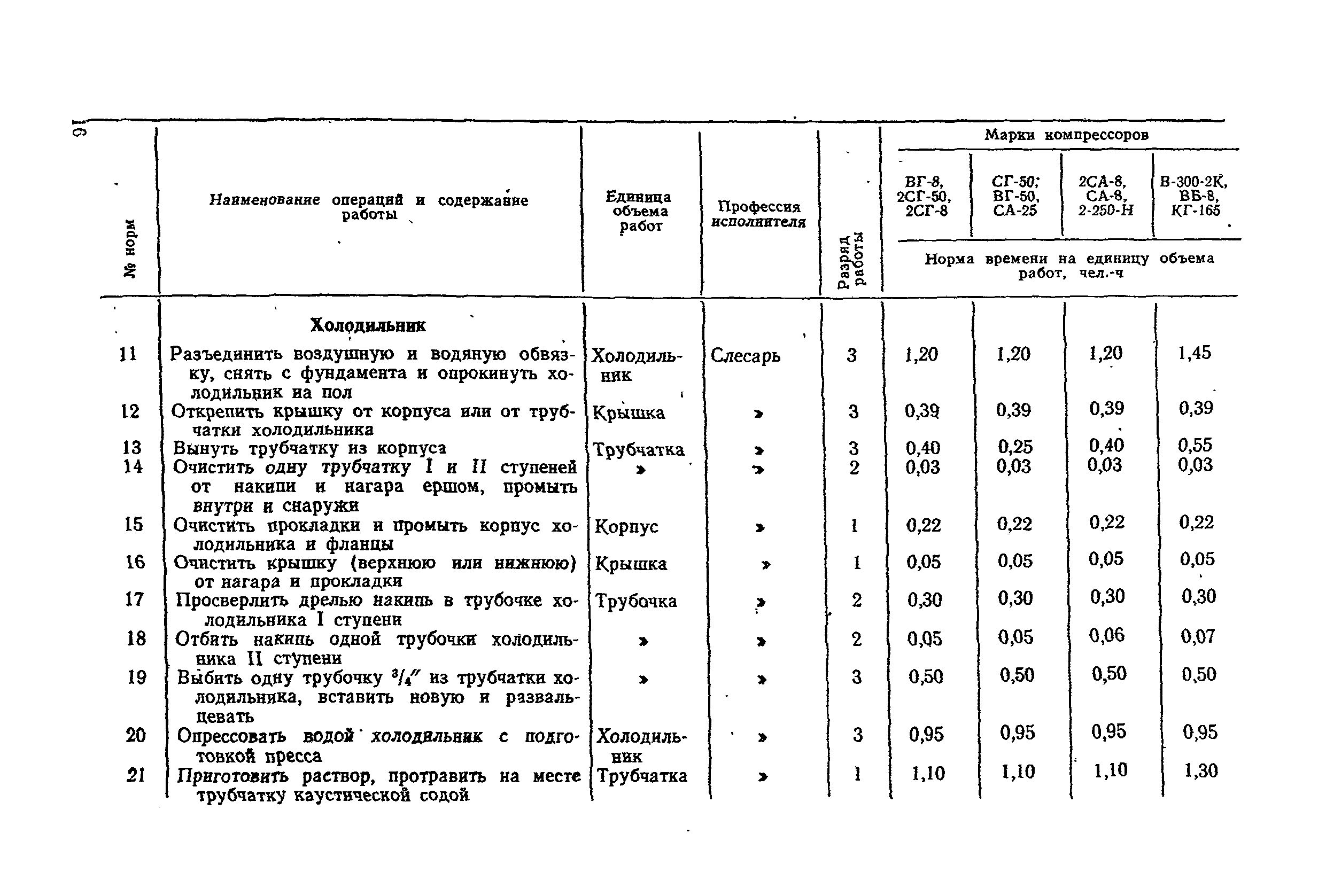 Типовые нормы времени на ремонт компрессоров (стационарных воздушных и газовых производительностью до 100 м3/мин)| Статус: | отменен в рф | | Название рус.: | Типовые нормы времени на ремонт компрессоров (стационарных воздушных и газовых производительностью до 100 м3/мин) | | Дата добавления в базу: | 01.09.2013 | | Дата актуализации: | 01.01.2021 | | Дата введения: | 25.06.2020 | | Область применения: | Сборник содержит нормы времени на разборку, сборку и ремонт компрессоров стационарных воздушных и газовых: крейцкопфных, бескрейцкопфных, ротационных и турбокомпрессоров. | | Оглавление: | Общая часть Организация труда Нормативная часть Раздел 1. Крейцкопфные компрессоры 1. Вертикальные двухрядные воздушные компрессоры типа ВГ, СГ, СА, В, ВБ, КГ 2. Угловые (прямоугольные) воздушные и газовые компрессоры типа: ВП и ГП 3. Вертикальные двухрядные воздушные компрессоры высокого давления типа Р. РК, РО, РВ, ЭК 4. Горизонтальные одно- и двухрядные воздушные компрессоры низкого давления типа В, ВГ, АГ, ГМ, АГК, АДК, ЗУГМ, 4УГ, 5УГ 5. Горизонтальные двухрядные газовые компрессоры типа 5Г, ДSV 6. Горизонтальные воздушные компрессоры низкого давления типа 300-2К, 400-2К, 500-2К, 600-2К Раздел II. Бескрейцкопфные компрессоры 7. Вертикальные, одно0 и двухрядные воздушные компрессоры типа В, ЦВ, ВК, КВ, ВКС, ВВК, C 8. Вертикальные одно- и двухрядные, одно- и двухцилиндровые компрессоры типа АВ, ФВ, Г 9. Вертикальные V- и W-образные воздушные компрессоры типа В, АУ, БАУ, ВУ, КС-3М, КСЭ-3М, К-5, КСЭ-5М 10. Вертикальные аммиачные компрессоры типа АВ-100, АУ-200, АУ-300, АУ-400, ДАУ-80, ДАУ-100 Раздел III. Ротационные компрессоры и турбокомпрессоры 11. Ротационные компрессоры типа "Демаг", "Клейн-Шандлер-Беккер" 12. Турбокомпрессоры типа ТГ-700/7, "ККК", ТР-7/3. "ЕГЕР", ТГ-4 | | Разработан: | НИИ труда Госкомтруда СССР ЦБНТ