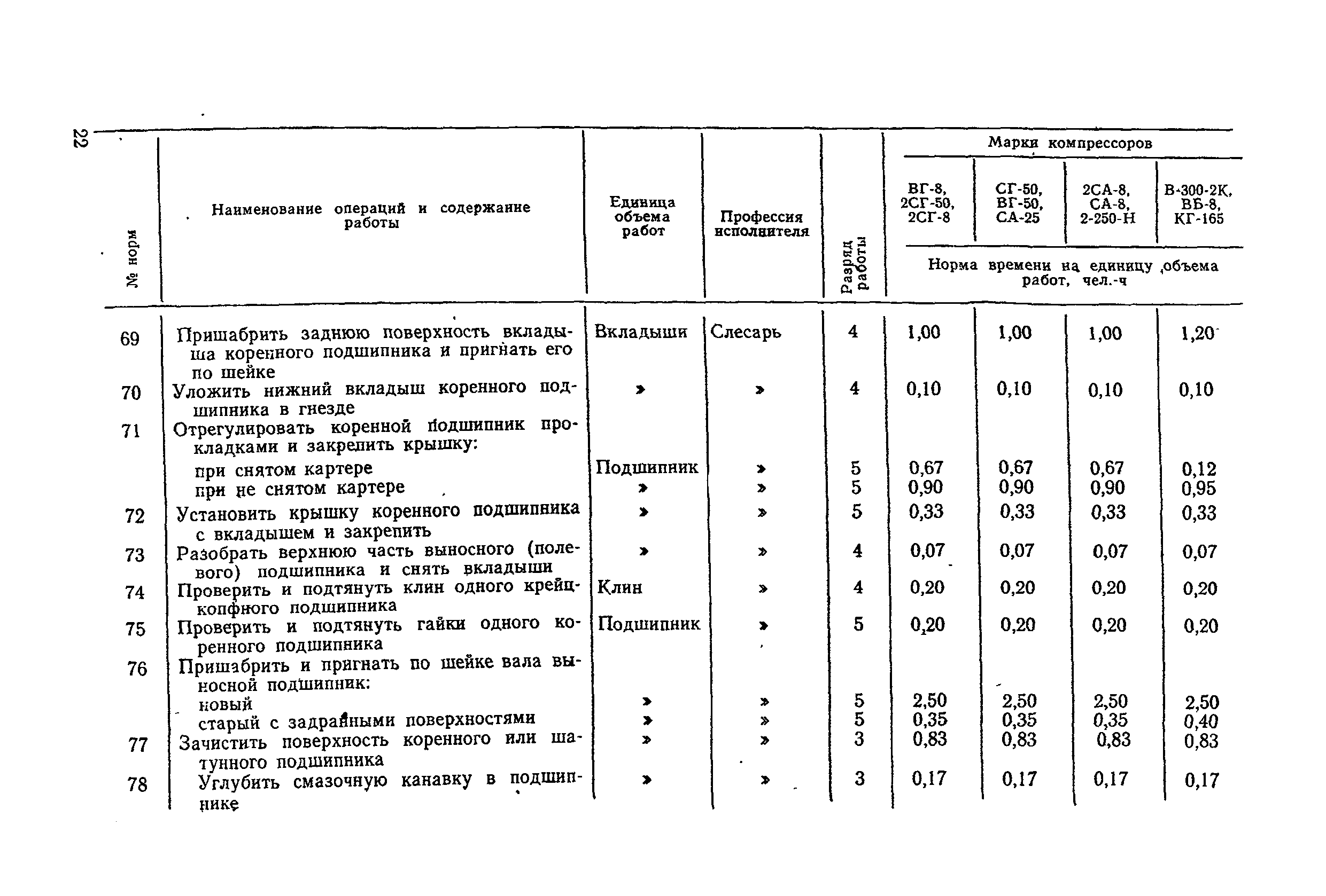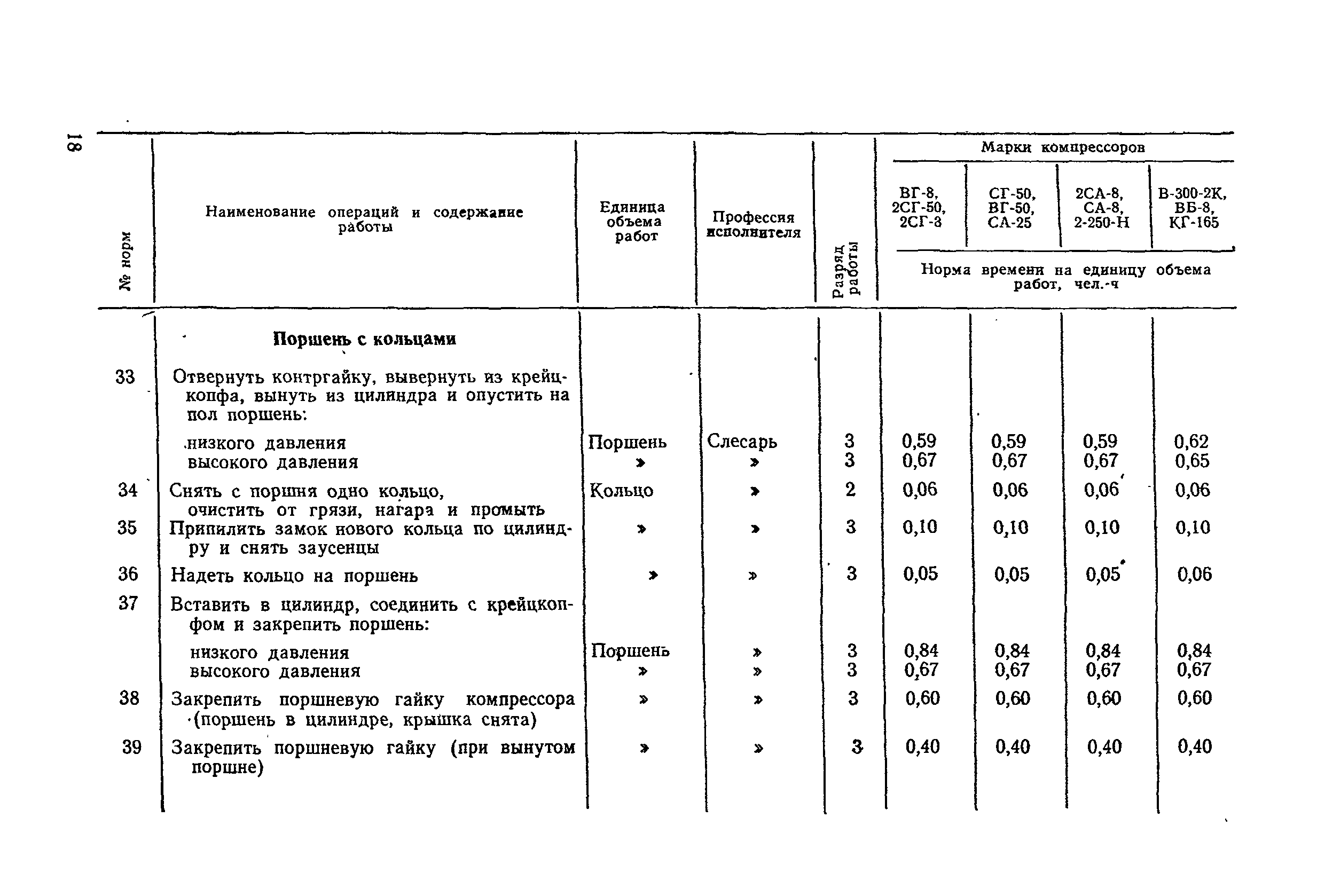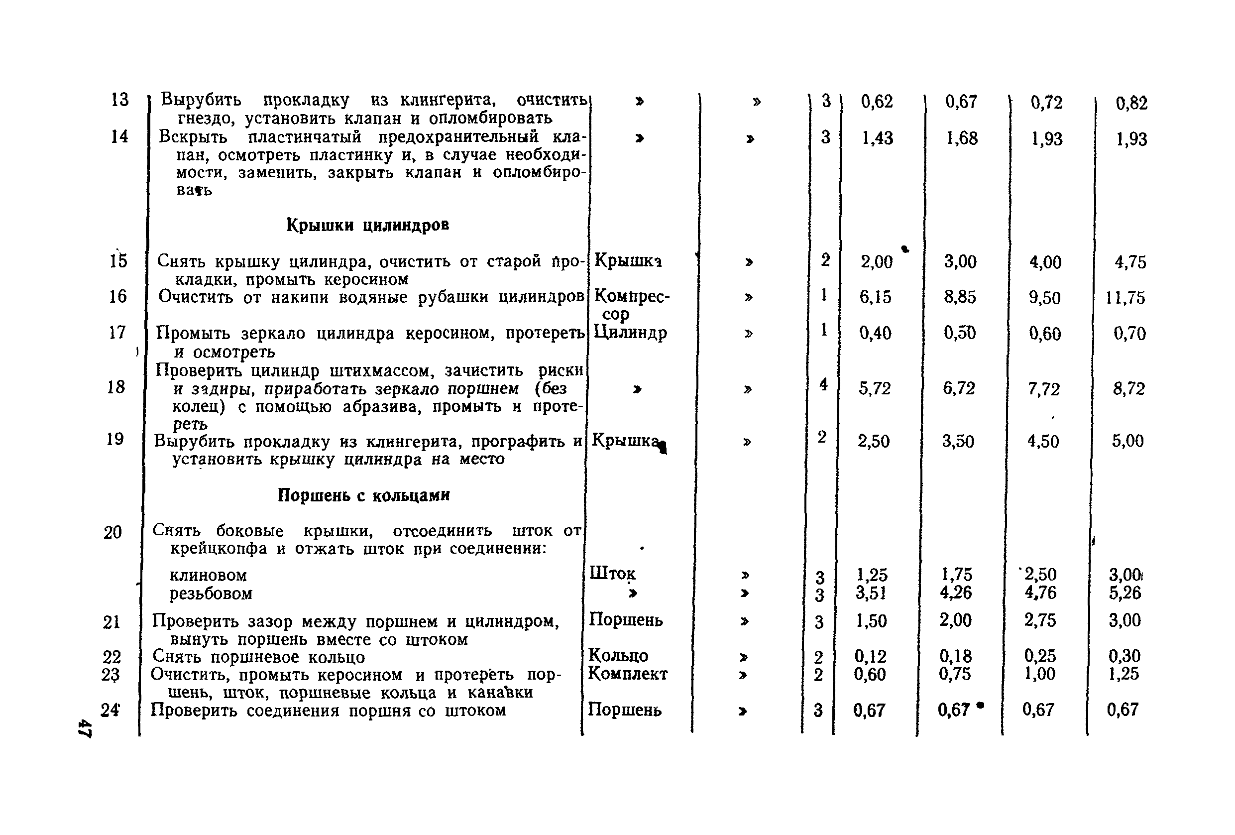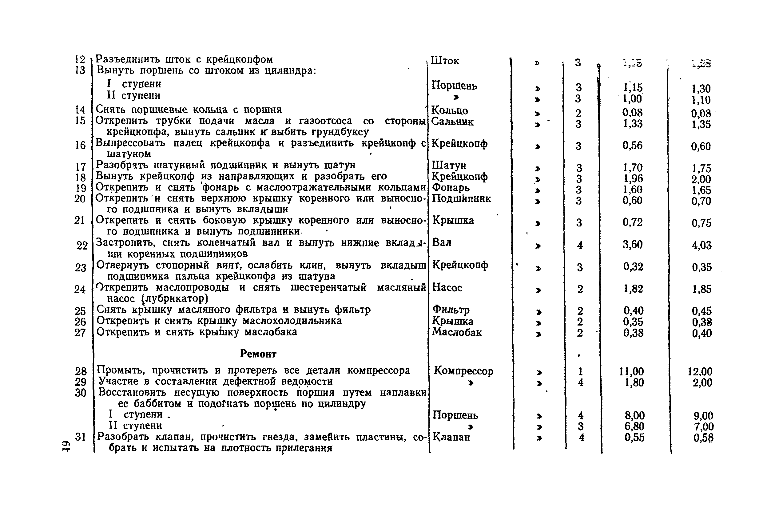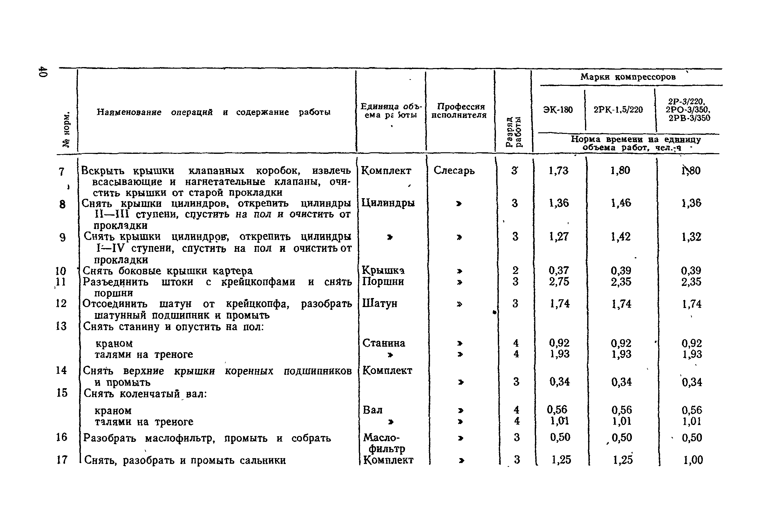 Типовые нормы времени на ремонт компрессоров (стационарных воздушных и газовых производительностью до 100 м3/мин)| Статус: | отменен в рф | | Название рус.: | Типовые нормы времени на ремонт компрессоров (стационарных воздушных и газовых производительностью до 100 м3/мин) | | Дата добавления в базу: | 01.09.2013 | | Дата актуализации: | 01.01.2021 | | Дата введения: | 25.06.2020 | | Область применения: | Сборник содержит нормы времени на разборку, сборку и ремонт компрессоров стационарных воздушных и газовых: крейцкопфных, бескрейцкопфных, ротационных и турбокомпрессоров. | | Оглавление: | Общая часть Организация труда Нормативная часть Раздел 1. Крейцкопфные компрессоры 1. Вертикальные двухрядные воздушные компрессоры типа ВГ, СГ, СА, В, ВБ, КГ 2. Угловые (прямоугольные) воздушные и газовые компрессоры типа: ВП и ГП 3. Вертикальные двухрядные воздушные компрессоры высокого давления типа Р. РК, РО, РВ, ЭК 4. Горизонтальные одно- и двухрядные воздушные компрессоры низкого давления типа В, ВГ, АГ, ГМ, АГК, АДК, ЗУГМ, 4УГ, 5УГ 5. Горизонтальные двухрядные газовые компрессоры типа 5Г, ДSV 6. Горизонтальные воздушные компрессоры низкого давления типа 300-2К, 400-2К, 500-2К, 600-2К Раздел II. Бескрейцкопфные компрессоры 7. Вертикальные, одно0 и двухрядные воздушные компрессоры типа В, ЦВ, ВК, КВ, ВКС, ВВК, C 8. Вертикальные одно- и двухрядные, одно- и двухцилиндровые компрессоры типа АВ, ФВ, Г 9. Вертикальные V- и W-образные воздушные компрессоры типа В, АУ, БАУ, ВУ, КС-3М, КСЭ-3М, К-5, КСЭ-5М 10. Вертикальные аммиачные компрессоры типа АВ-100, АУ-200, АУ-300, АУ-400, ДАУ-80, ДАУ-100 Раздел III. Ротационные компрессоры и турбокомпрессоры 11. Ротационные компрессоры типа "Демаг", "Клейн-Шандлер-Беккер" 12. Турбокомпрессоры типа ТГ-700/7, "ККК", ТР-7/3. "ЕГЕР", ТГ-4 | | Разработан: | НИИ труда Госкомтруда СССР ЦБНТ