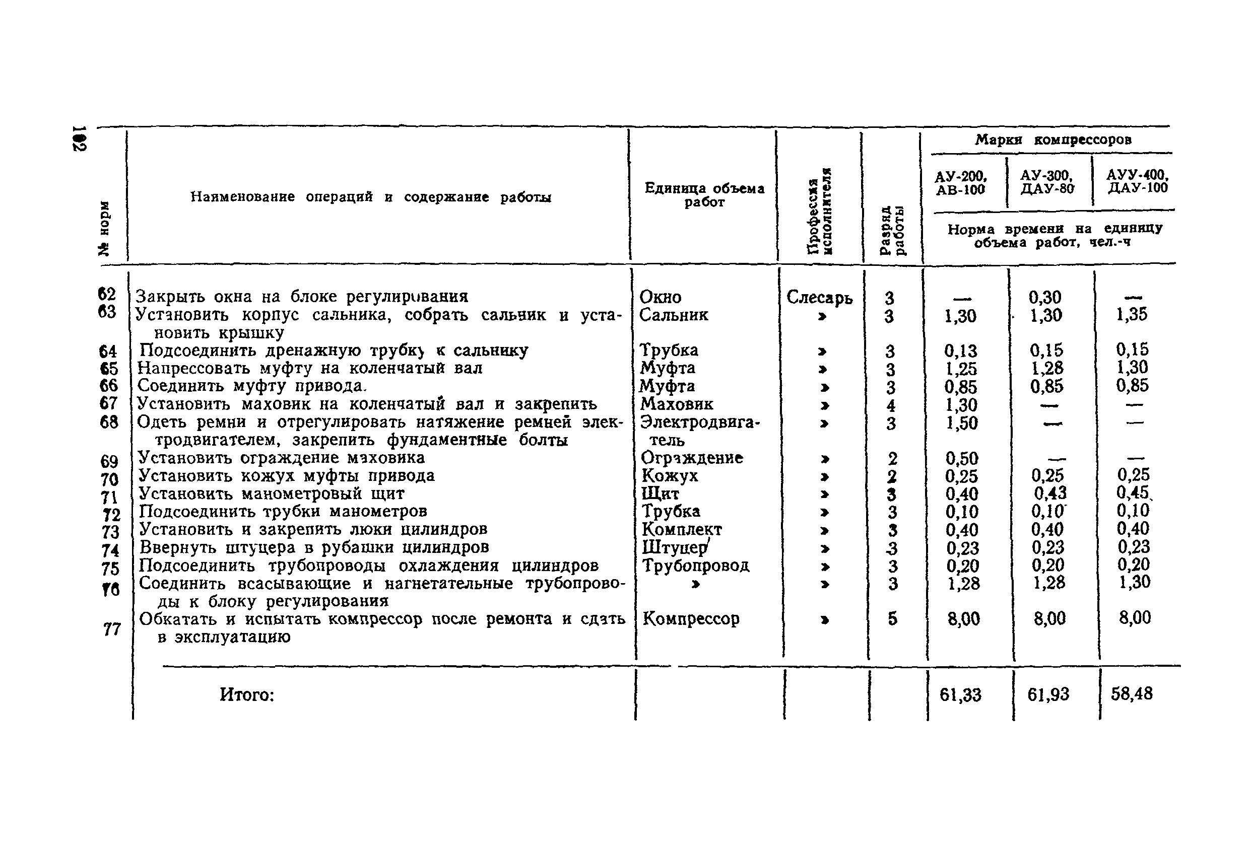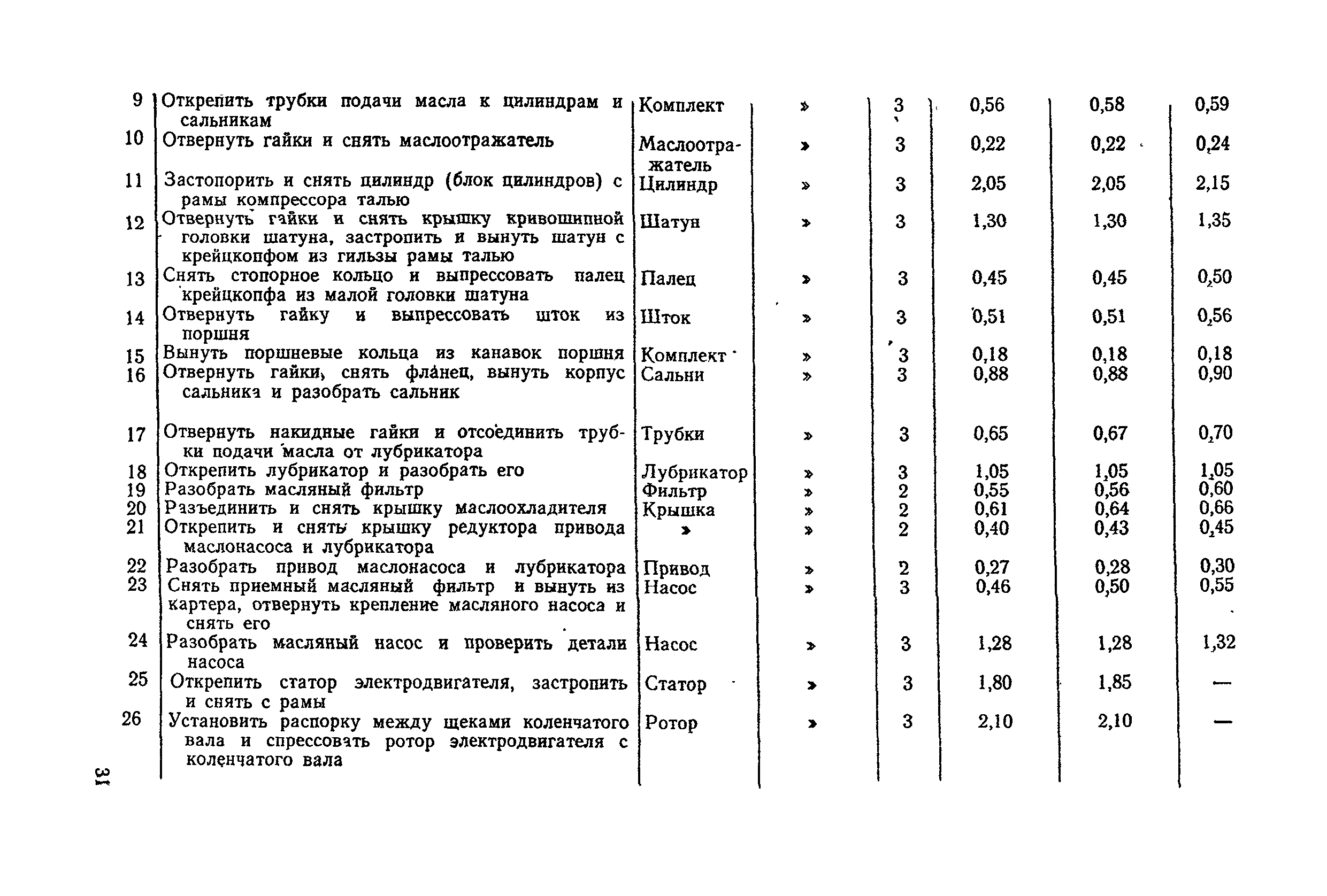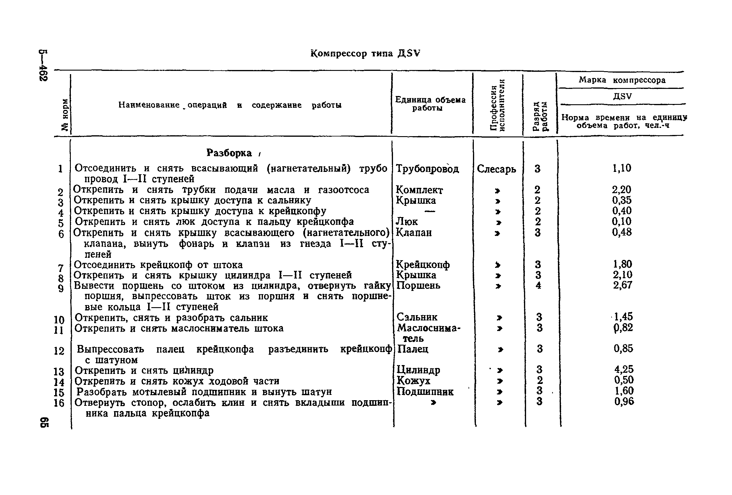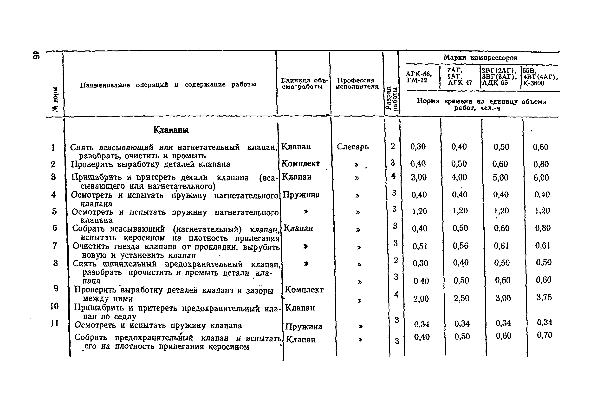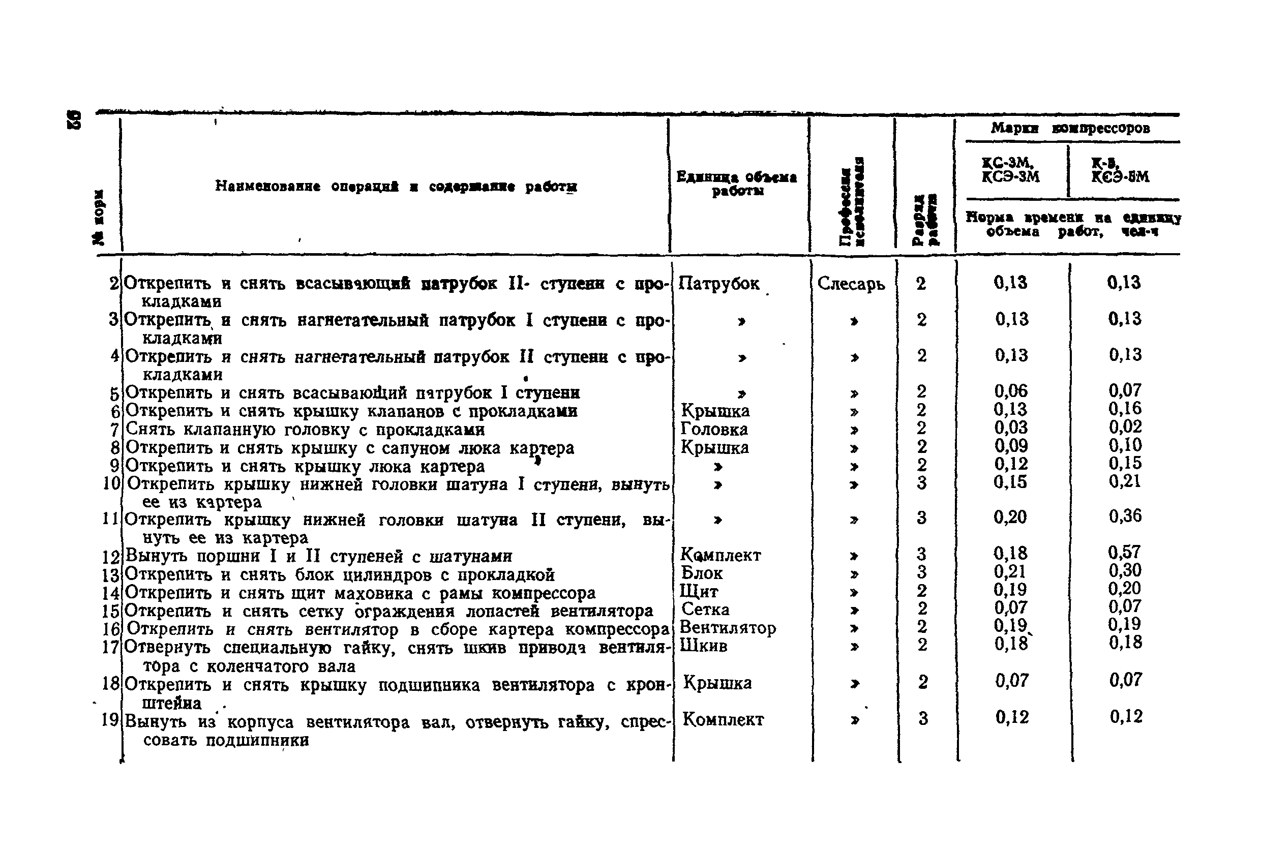 Типовые нормы времени на ремонт компрессоров (стационарных воздушных и газовых производительностью до 100 м3/мин)| Статус: | отменен в рф | | Название рус.: | Типовые нормы времени на ремонт компрессоров (стационарных воздушных и газовых производительностью до 100 м3/мин) | | Дата добавления в базу: | 01.09.2013 | | Дата актуализации: | 01.01.2021 | | Дата введения: | 25.06.2020 | | Область применения: | Сборник содержит нормы времени на разборку, сборку и ремонт компрессоров стационарных воздушных и газовых: крейцкопфных, бескрейцкопфных, ротационных и турбокомпрессоров. | | Оглавление: | Общая часть Организация труда Нормативная часть Раздел 1. Крейцкопфные компрессоры 1. Вертикальные двухрядные воздушные компрессоры типа ВГ, СГ, СА, В, ВБ, КГ 2. Угловые (прямоугольные) воздушные и газовые компрессоры типа: ВП и ГП 3. Вертикальные двухрядные воздушные компрессоры высокого давления типа Р. РК, РО, РВ, ЭК 4. Горизонтальные одно- и двухрядные воздушные компрессоры низкого давления типа В, ВГ, АГ, ГМ, АГК, АДК, ЗУГМ, 4УГ, 5УГ 5. Горизонтальные двухрядные газовые компрессоры типа 5Г, ДSV 6. Горизонтальные воздушные компрессоры низкого давления типа 300-2К, 400-2К, 500-2К, 600-2К Раздел II. Бескрейцкопфные компрессоры 7. Вертикальные, одно0 и двухрядные воздушные компрессоры типа В, ЦВ, ВК, КВ, ВКС, ВВК, C 8. Вертикальные одно- и двухрядные, одно- и двухцилиндровые компрессоры типа АВ, ФВ, Г 9. Вертикальные V- и W-образные воздушные компрессоры типа В, АУ, БАУ, ВУ, КС-3М, КСЭ-3М, К-5, КСЭ-5М 10. Вертикальные аммиачные компрессоры типа АВ-100, АУ-200, АУ-300, АУ-400, ДАУ-80, ДАУ-100 Раздел III. Ротационные компрессоры и турбокомпрессоры 11. Ротационные компрессоры типа "Демаг", "Клейн-Шандлер-Беккер" 12. Турбокомпрессоры типа ТГ-700/7, "ККК", ТР-7/3. "ЕГЕР", ТГ-4 | | Разработан: | НИИ труда Госкомтруда СССР ЦБНТ