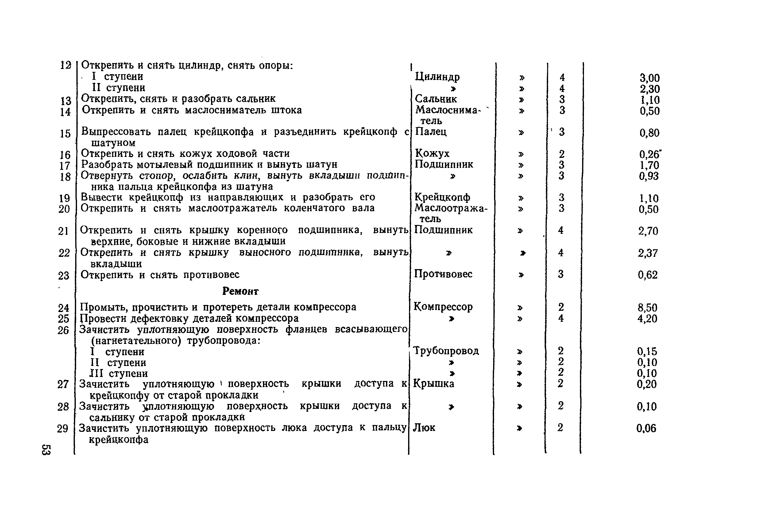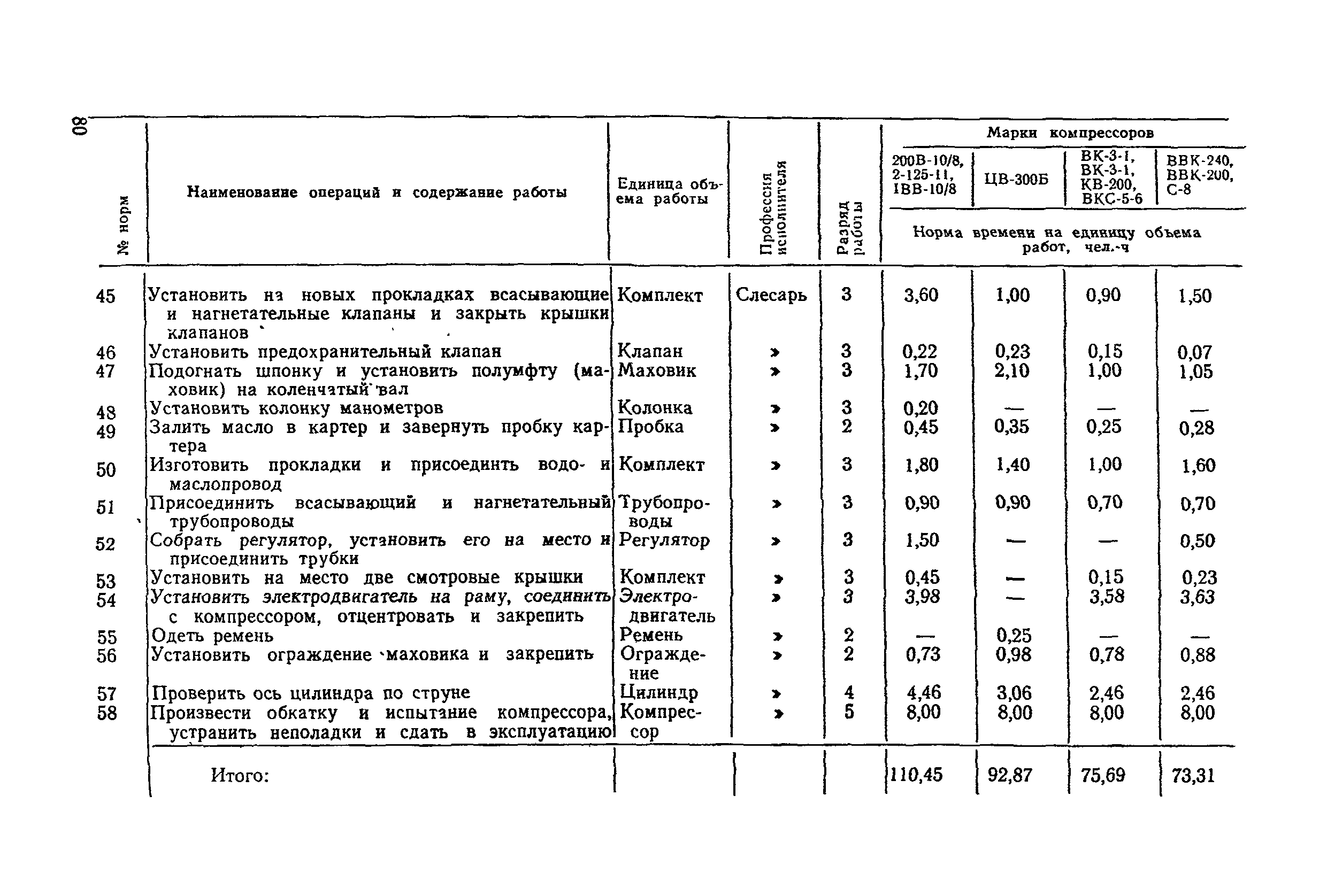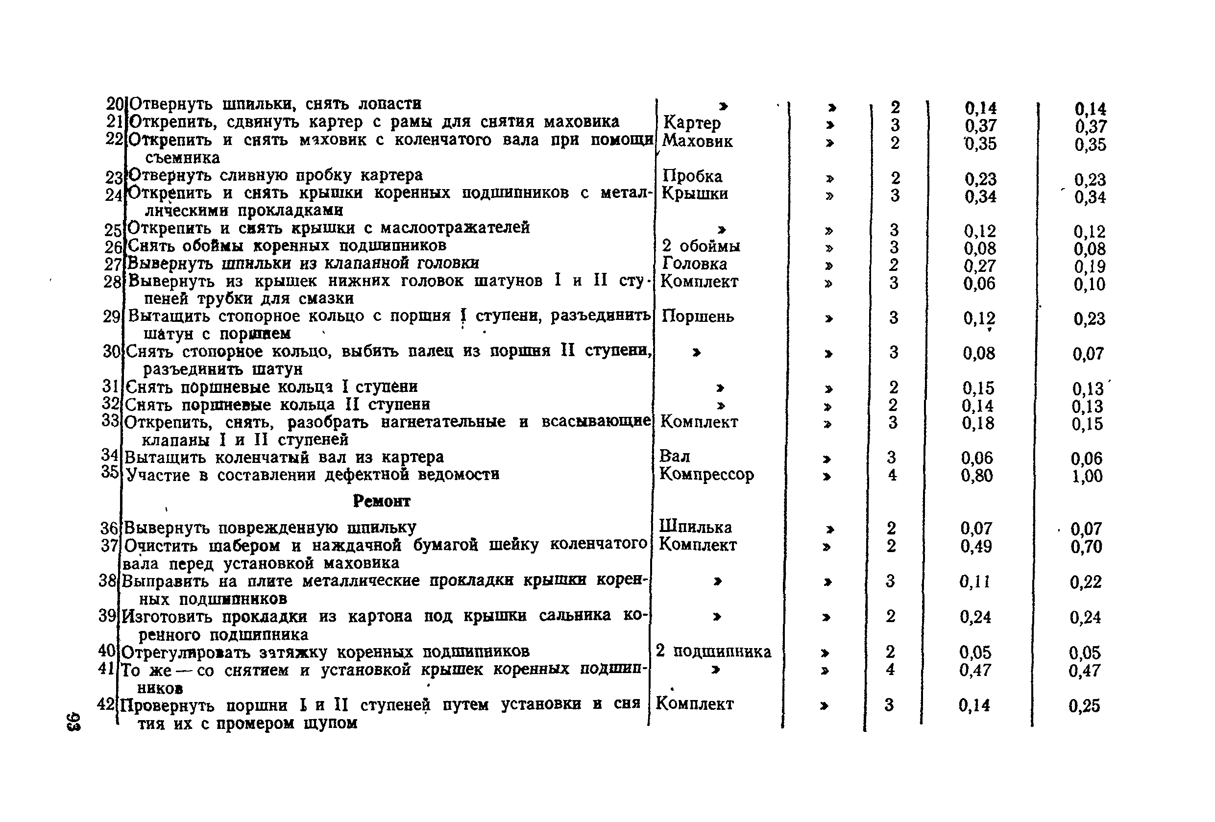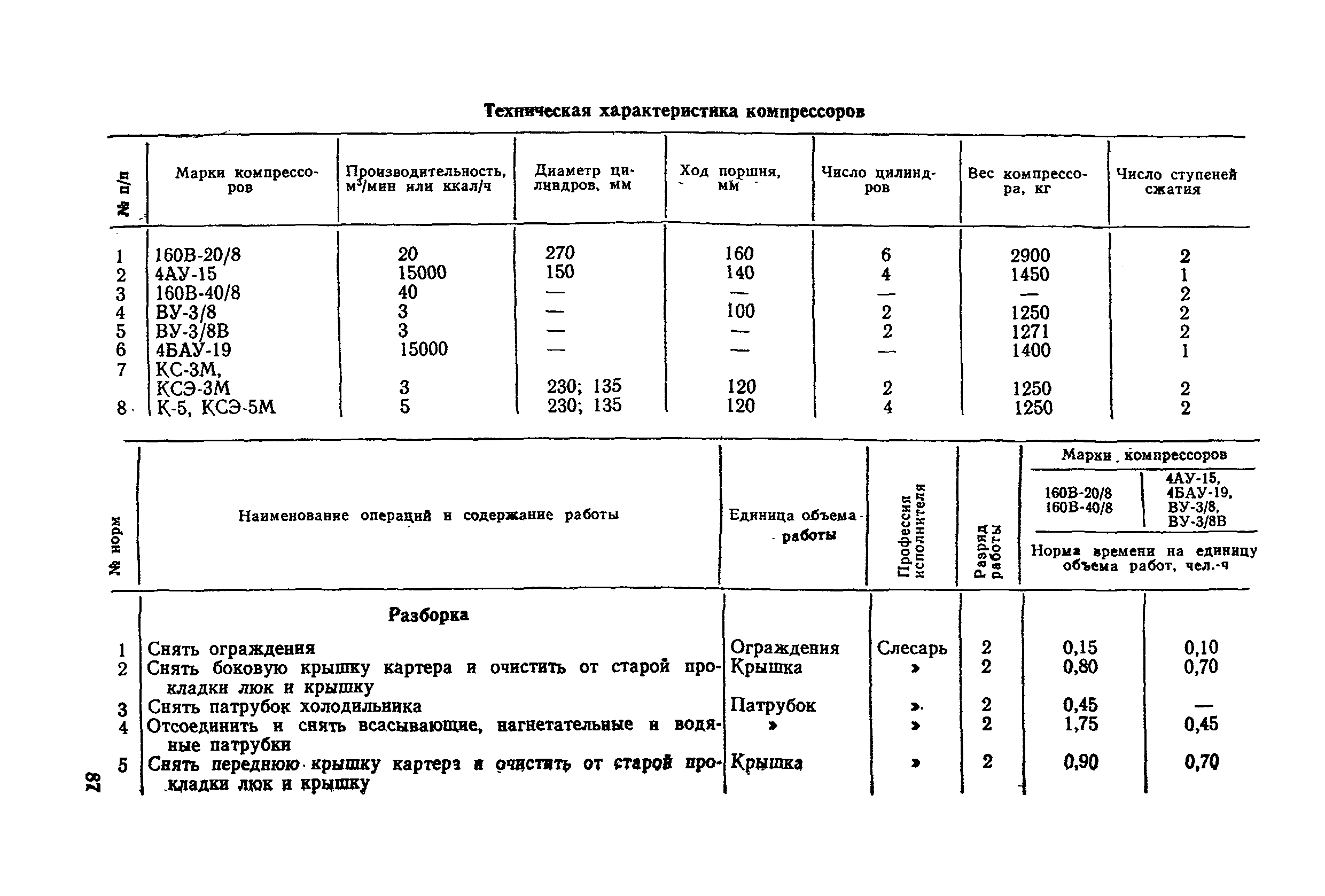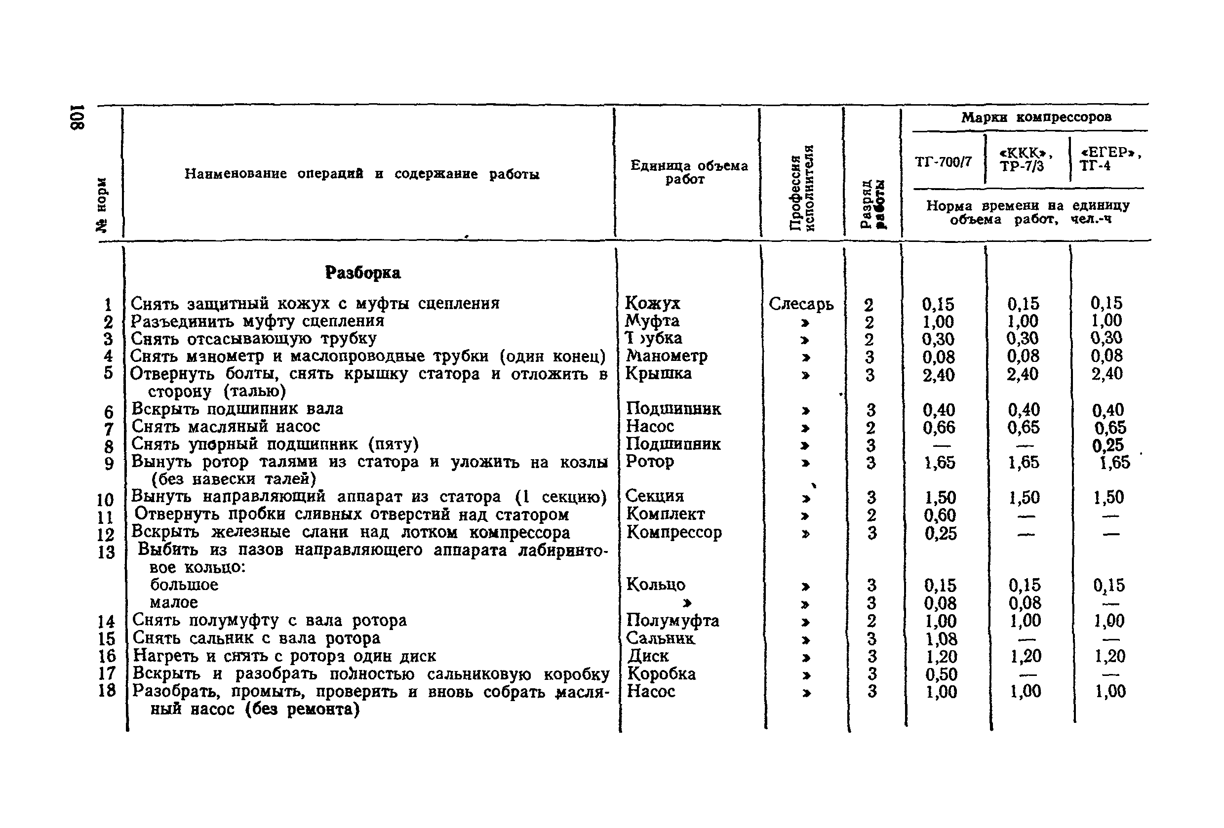 Типовые нормы времени на ремонт компрессоров (стационарных воздушных и газовых производительностью до 100 м3/мин)| Статус: | отменен в рф | | Название рус.: | Типовые нормы времени на ремонт компрессоров (стационарных воздушных и газовых производительностью до 100 м3/мин) | | Дата добавления в базу: | 01.09.2013 | | Дата актуализации: | 01.01.2021 | | Дата введения: | 25.06.2020 | | Область применения: | Сборник содержит нормы времени на разборку, сборку и ремонт компрессоров стационарных воздушных и газовых: крейцкопфных, бескрейцкопфных, ротационных и турбокомпрессоров. | | Оглавление: | Общая часть Организация труда Нормативная часть Раздел 1. Крейцкопфные компрессоры 1. Вертикальные двухрядные воздушные компрессоры типа ВГ, СГ, СА, В, ВБ, КГ 2. Угловые (прямоугольные) воздушные и газовые компрессоры типа: ВП и ГП 3. Вертикальные двухрядные воздушные компрессоры высокого давления типа Р. РК, РО, РВ, ЭК 4. Горизонтальные одно- и двухрядные воздушные компрессоры низкого давления типа В, ВГ, АГ, ГМ, АГК, АДК, ЗУГМ, 4УГ, 5УГ 5. Горизонтальные двухрядные газовые компрессоры типа 5Г, ДSV 6. Горизонтальные воздушные компрессоры низкого давления типа 300-2К, 400-2К, 500-2К, 600-2К Раздел II. Бескрейцкопфные компрессоры 7. Вертикальные, одно0 и двухрядные воздушные компрессоры типа В, ЦВ, ВК, КВ, ВКС, ВВК, C 8. Вертикальные одно- и двухрядные, одно- и двухцилиндровые компрессоры типа АВ, ФВ, Г 9. Вертикальные V- и W-образные воздушные компрессоры типа В, АУ, БАУ, ВУ, КС-3М, КСЭ-3М, К-5, КСЭ-5М 10. Вертикальные аммиачные компрессоры типа АВ-100, АУ-200, АУ-300, АУ-400, ДАУ-80, ДАУ-100 Раздел III. Ротационные компрессоры и турбокомпрессоры 11. Ротационные компрессоры типа "Демаг", "Клейн-Шандлер-Беккер" 12. Турбокомпрессоры типа ТГ-700/7, "ККК", ТР-7/3. "ЕГЕР", ТГ-4 | | Разработан: | НИИ труда Госкомтруда СССР ЦБНТ