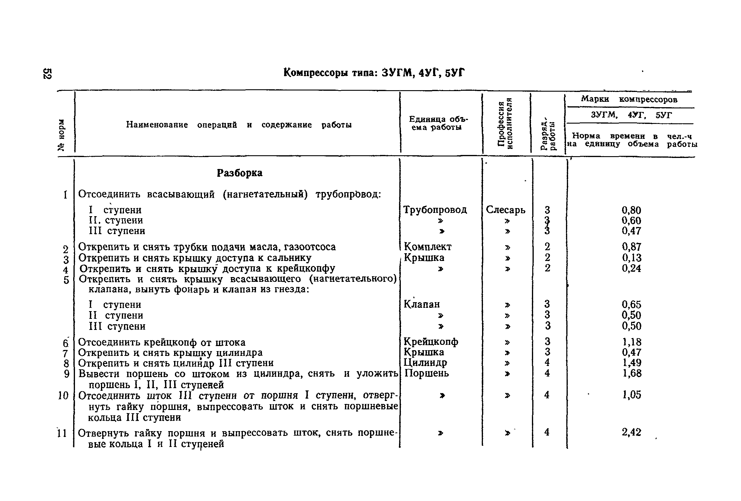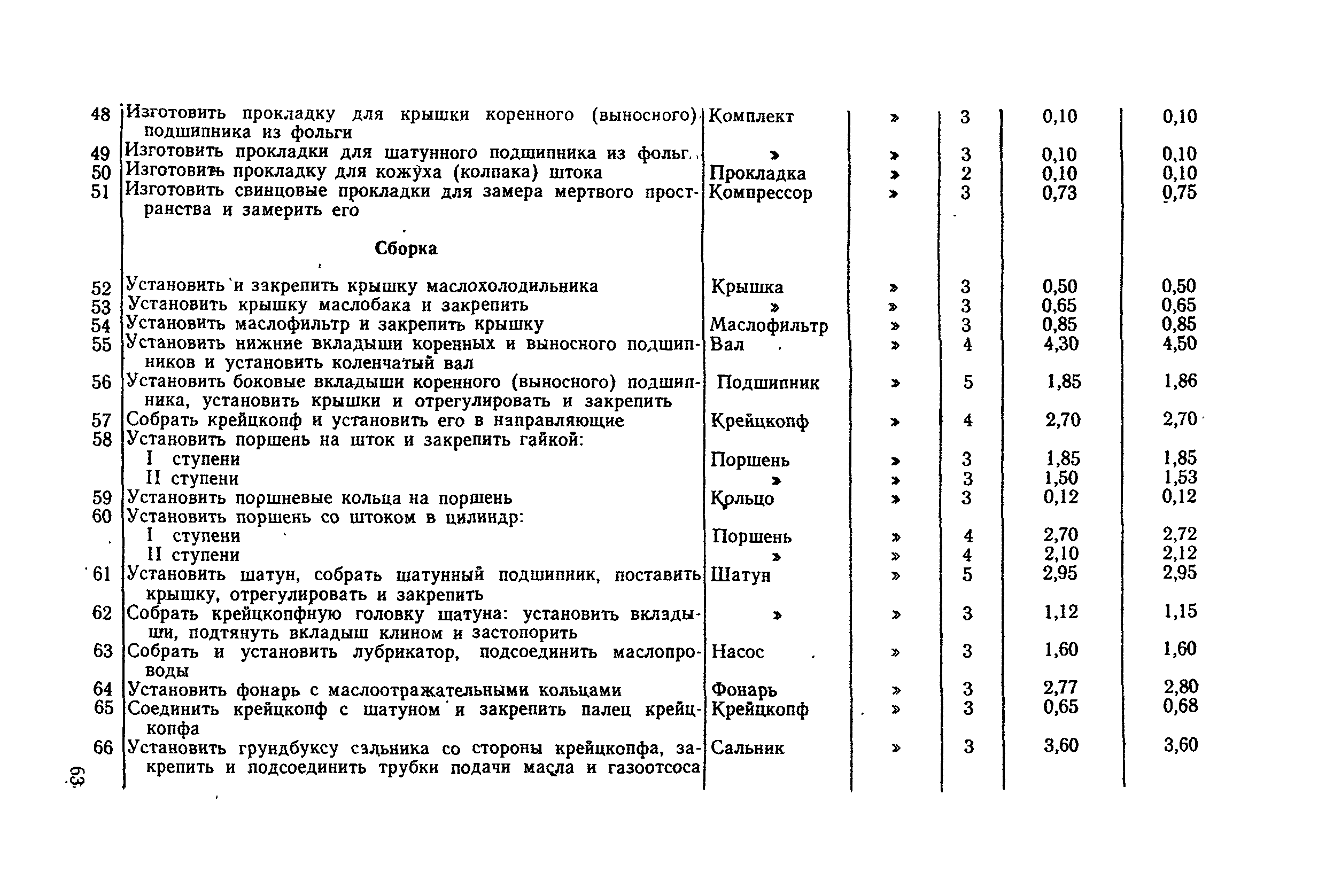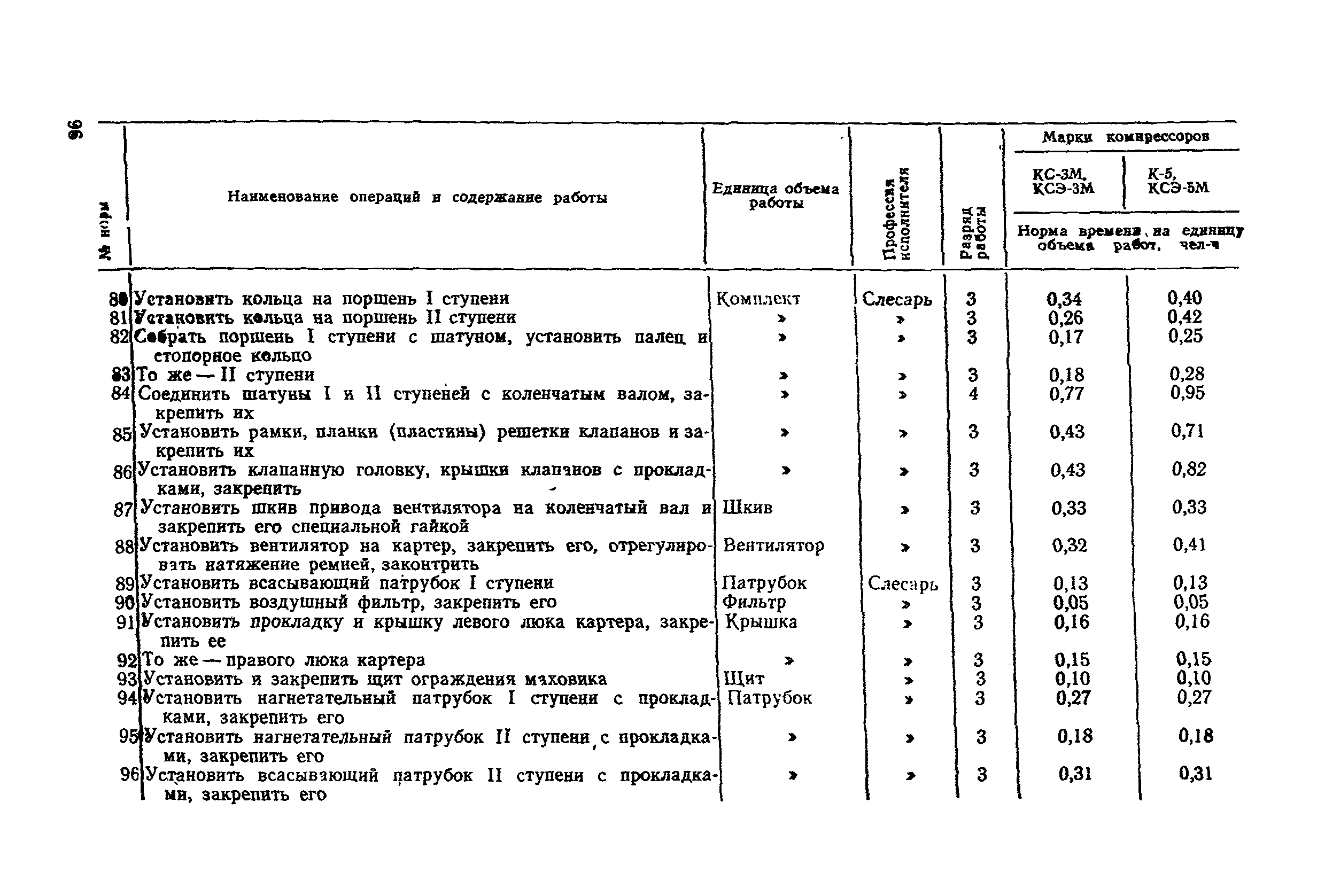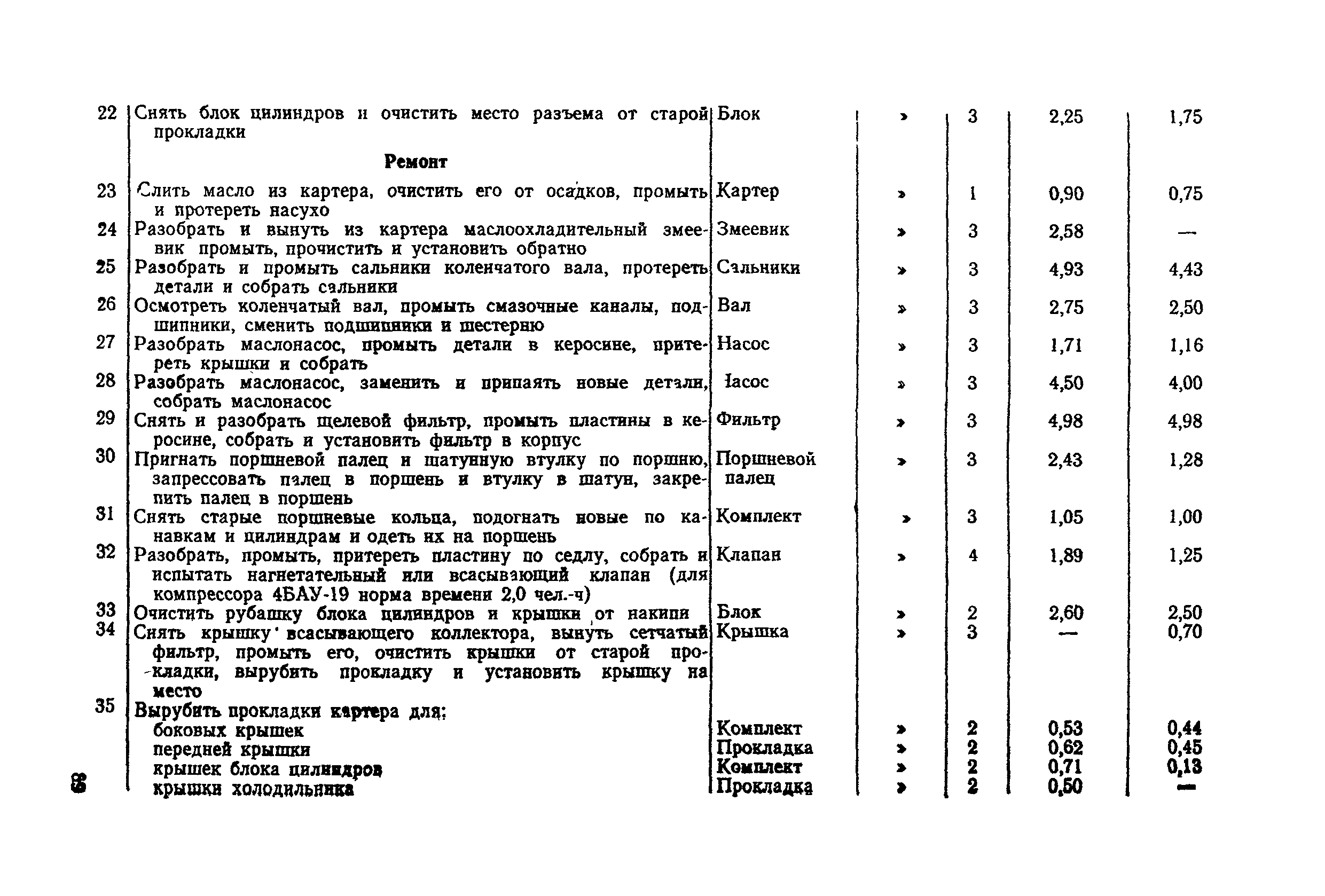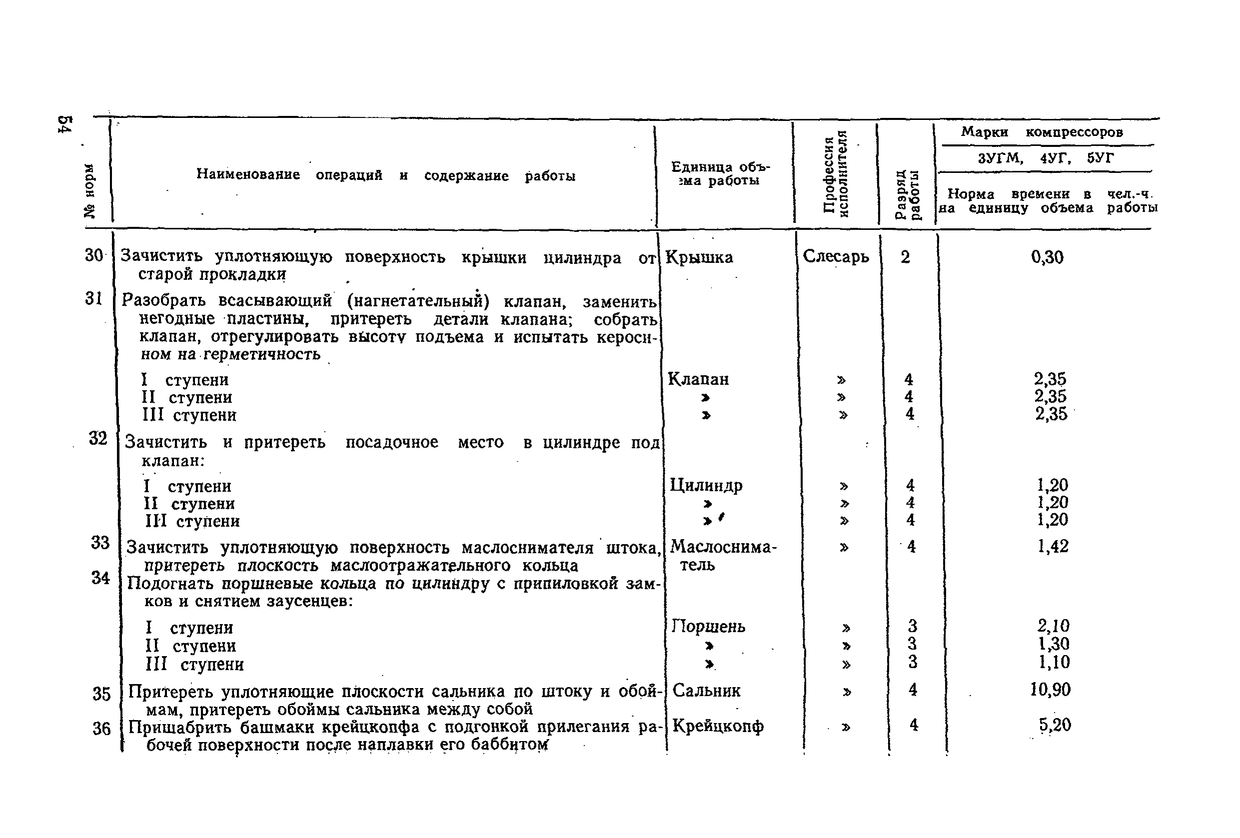 Типовые нормы времени на ремонт компрессоров (стационарных воздушных и газовых производительностью до 100 м3/мин)| Статус: | отменен в рф | | Название рус.: | Типовые нормы времени на ремонт компрессоров (стационарных воздушных и газовых производительностью до 100 м3/мин) | | Дата добавления в базу: | 01.09.2013 | | Дата актуализации: | 01.01.2021 | | Дата введения: | 25.06.2020 | | Область применения: | Сборник содержит нормы времени на разборку, сборку и ремонт компрессоров стационарных воздушных и газовых: крейцкопфных, бескрейцкопфных, ротационных и турбокомпрессоров. | | Оглавление: | Общая часть Организация труда Нормативная часть Раздел 1. Крейцкопфные компрессоры 1. Вертикальные двухрядные воздушные компрессоры типа ВГ, СГ, СА, В, ВБ, КГ 2. Угловые (прямоугольные) воздушные и газовые компрессоры типа: ВП и ГП 3. Вертикальные двухрядные воздушные компрессоры высокого давления типа Р. РК, РО, РВ, ЭК 4. Горизонтальные одно- и двухрядные воздушные компрессоры низкого давления типа В, ВГ, АГ, ГМ, АГК, АДК, ЗУГМ, 4УГ, 5УГ 5. Горизонтальные двухрядные газовые компрессоры типа 5Г, ДSV 6. Горизонтальные воздушные компрессоры низкого давления типа 300-2К, 400-2К, 500-2К, 600-2К Раздел II. Бескрейцкопфные компрессоры 7. Вертикальные, одно0 и двухрядные воздушные компрессоры типа В, ЦВ, ВК, КВ, ВКС, ВВК, C 8. Вертикальные одно- и двухрядные, одно- и двухцилиндровые компрессоры типа АВ, ФВ, Г 9. Вертикальные V- и W-образные воздушные компрессоры типа В, АУ, БАУ, ВУ, КС-3М, КСЭ-3М, К-5, КСЭ-5М 10. Вертикальные аммиачные компрессоры типа АВ-100, АУ-200, АУ-300, АУ-400, ДАУ-80, ДАУ-100 Раздел III. Ротационные компрессоры и турбокомпрессоры 11. Ротационные компрессоры типа "Демаг", "Клейн-Шандлер-Беккер" 12. Турбокомпрессоры типа ТГ-700/7, "ККК", ТР-7/3. "ЕГЕР", ТГ-4 | | Разработан: | НИИ труда Госкомтруда СССР ЦБНТ