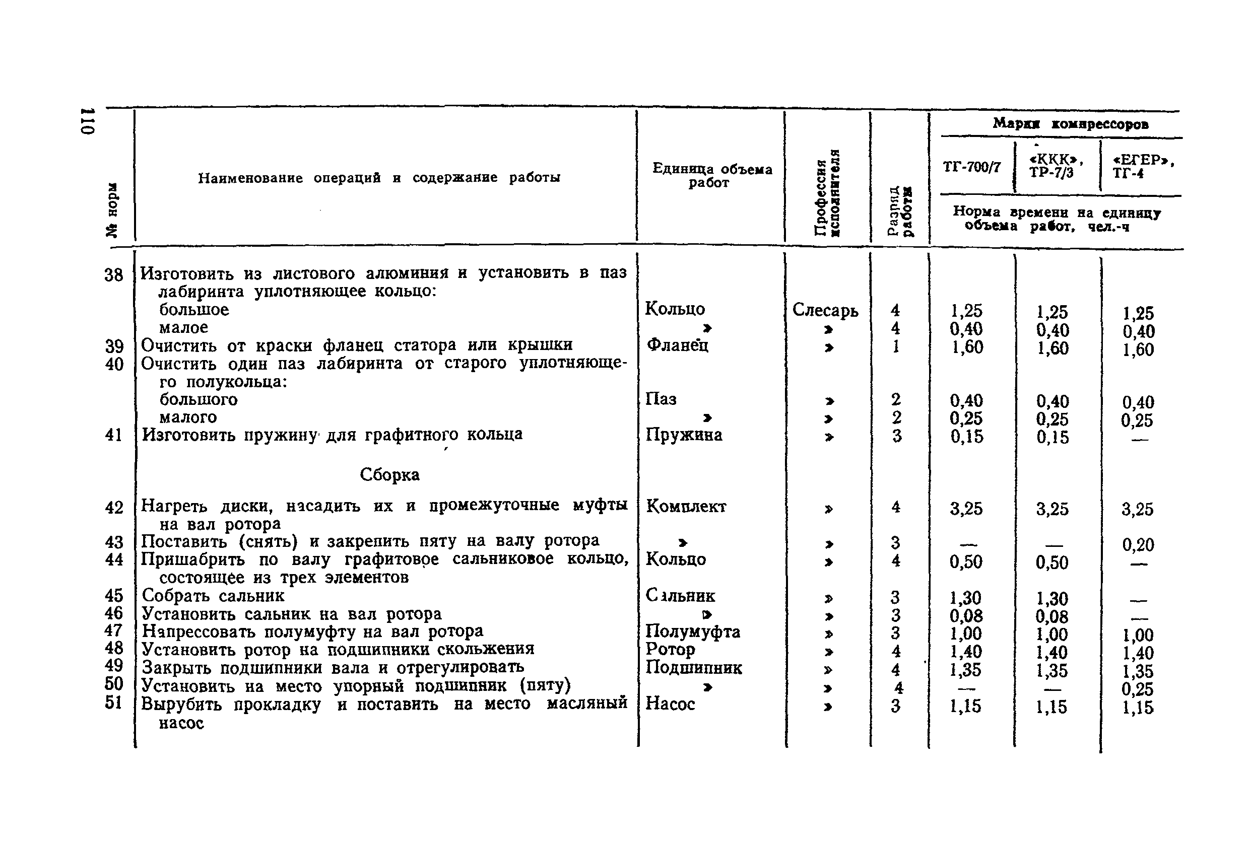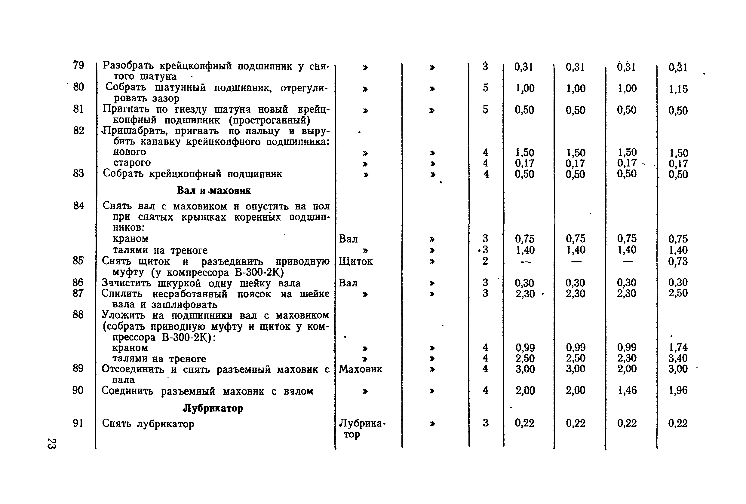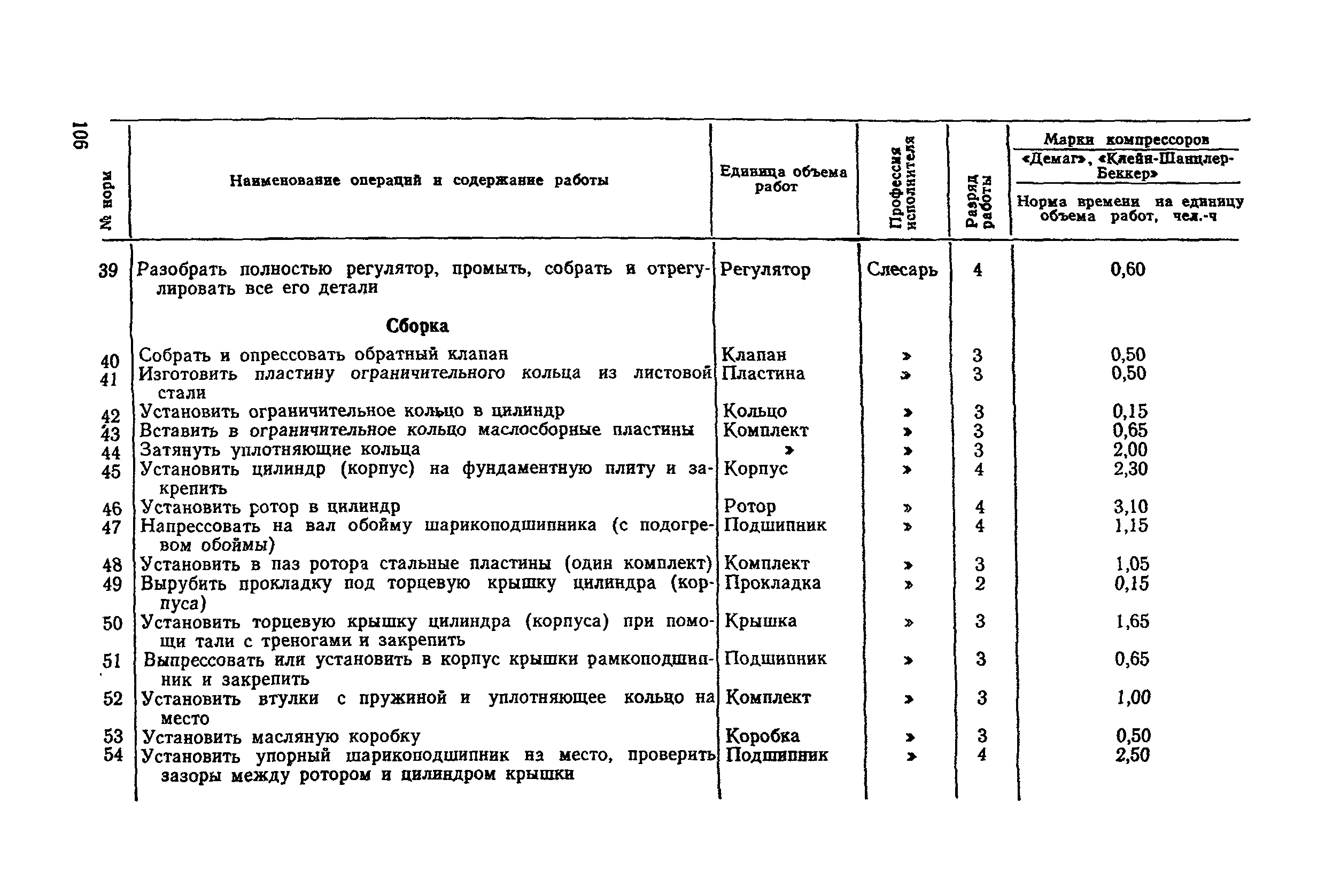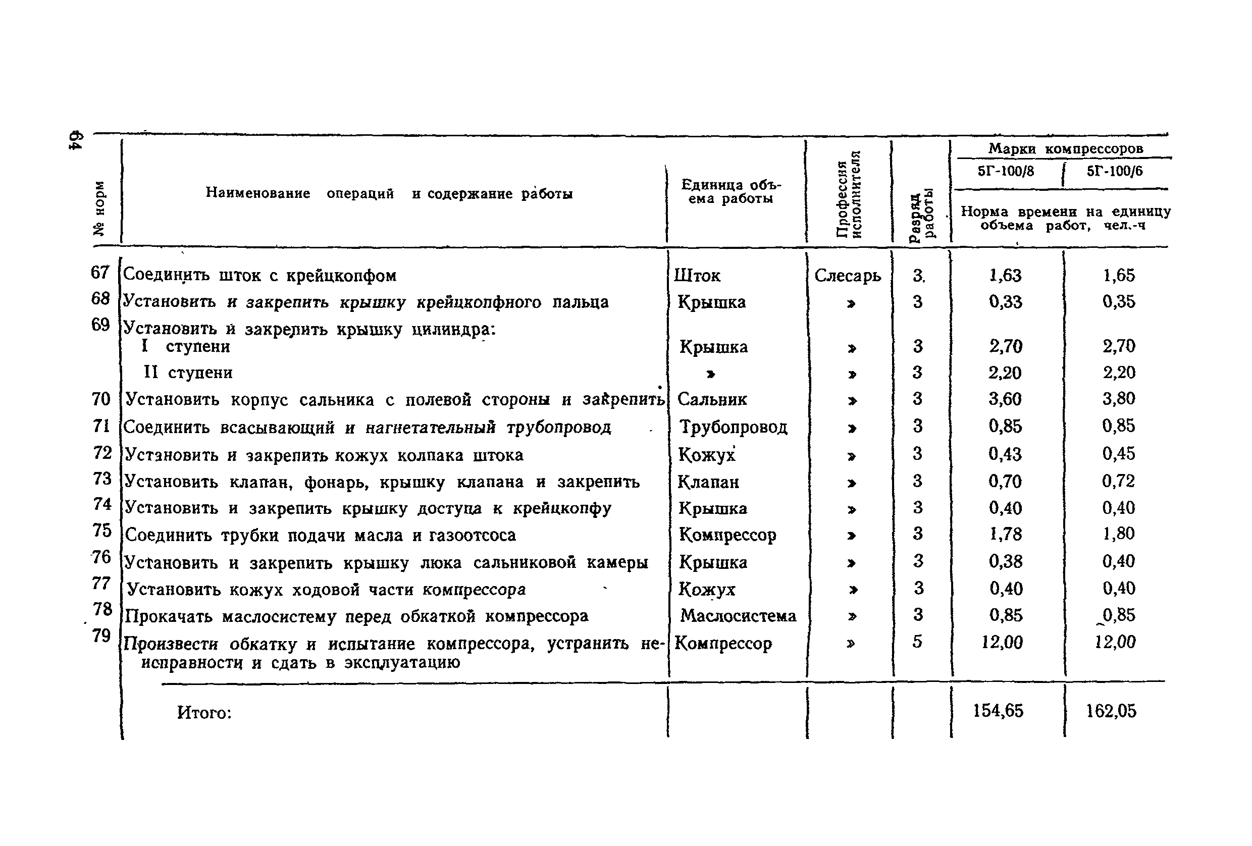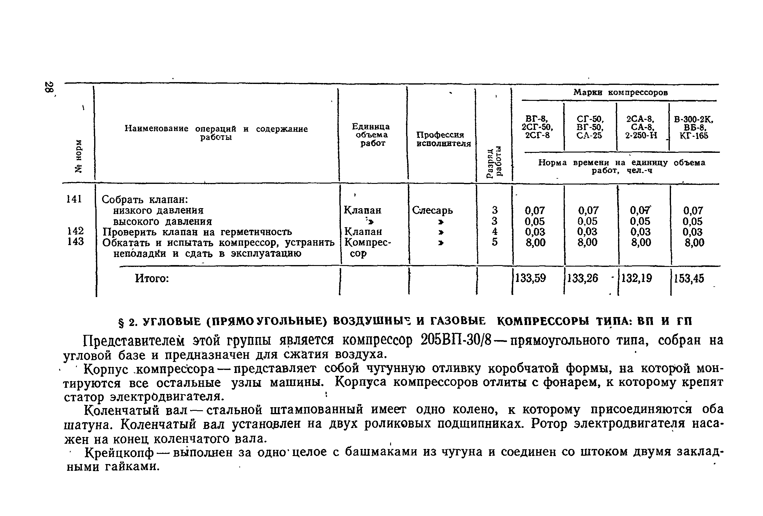 Типовые нормы времени на ремонт компрессоров (стационарных воздушных и газовых производительностью до 100 м3/мин)| Статус: | отменен в рф | | Название рус.: | Типовые нормы времени на ремонт компрессоров (стационарных воздушных и газовых производительностью до 100 м3/мин) | | Дата добавления в базу: | 01.09.2013 | | Дата актуализации: | 01.01.2021 | | Дата введения: | 25.06.2020 | | Область применения: | Сборник содержит нормы времени на разборку, сборку и ремонт компрессоров стационарных воздушных и газовых: крейцкопфных, бескрейцкопфных, ротационных и турбокомпрессоров. | | Оглавление: | Общая часть Организация труда Нормативная часть Раздел 1. Крейцкопфные компрессоры 1. Вертикальные двухрядные воздушные компрессоры типа ВГ, СГ, СА, В, ВБ, КГ 2. Угловые (прямоугольные) воздушные и газовые компрессоры типа: ВП и ГП 3. Вертикальные двухрядные воздушные компрессоры высокого давления типа Р. РК, РО, РВ, ЭК 4. Горизонтальные одно- и двухрядные воздушные компрессоры низкого давления типа В, ВГ, АГ, ГМ, АГК, АДК, ЗУГМ, 4УГ, 5УГ 5. Горизонтальные двухрядные газовые компрессоры типа 5Г, ДSV 6. Горизонтальные воздушные компрессоры низкого давления типа 300-2К, 400-2К, 500-2К, 600-2К Раздел II. Бескрейцкопфные компрессоры 7. Вертикальные, одно0 и двухрядные воздушные компрессоры типа В, ЦВ, ВК, КВ, ВКС, ВВК, C 8. Вертикальные одно- и двухрядные, одно- и двухцилиндровые компрессоры типа АВ, ФВ, Г 9. Вертикальные V- и W-образные воздушные компрессоры типа В, АУ, БАУ, ВУ, КС-3М, КСЭ-3М, К-5, КСЭ-5М 10. Вертикальные аммиачные компрессоры типа АВ-100, АУ-200, АУ-300, АУ-400, ДАУ-80, ДАУ-100 Раздел III. Ротационные компрессоры и турбокомпрессоры 11. Ротационные компрессоры типа "Демаг", "Клейн-Шандлер-Беккер" 12. Турбокомпрессоры типа ТГ-700/7, "ККК", ТР-7/3. "ЕГЕР", ТГ-4 | | Разработан: | НИИ труда Госкомтруда СССР ЦБНТ