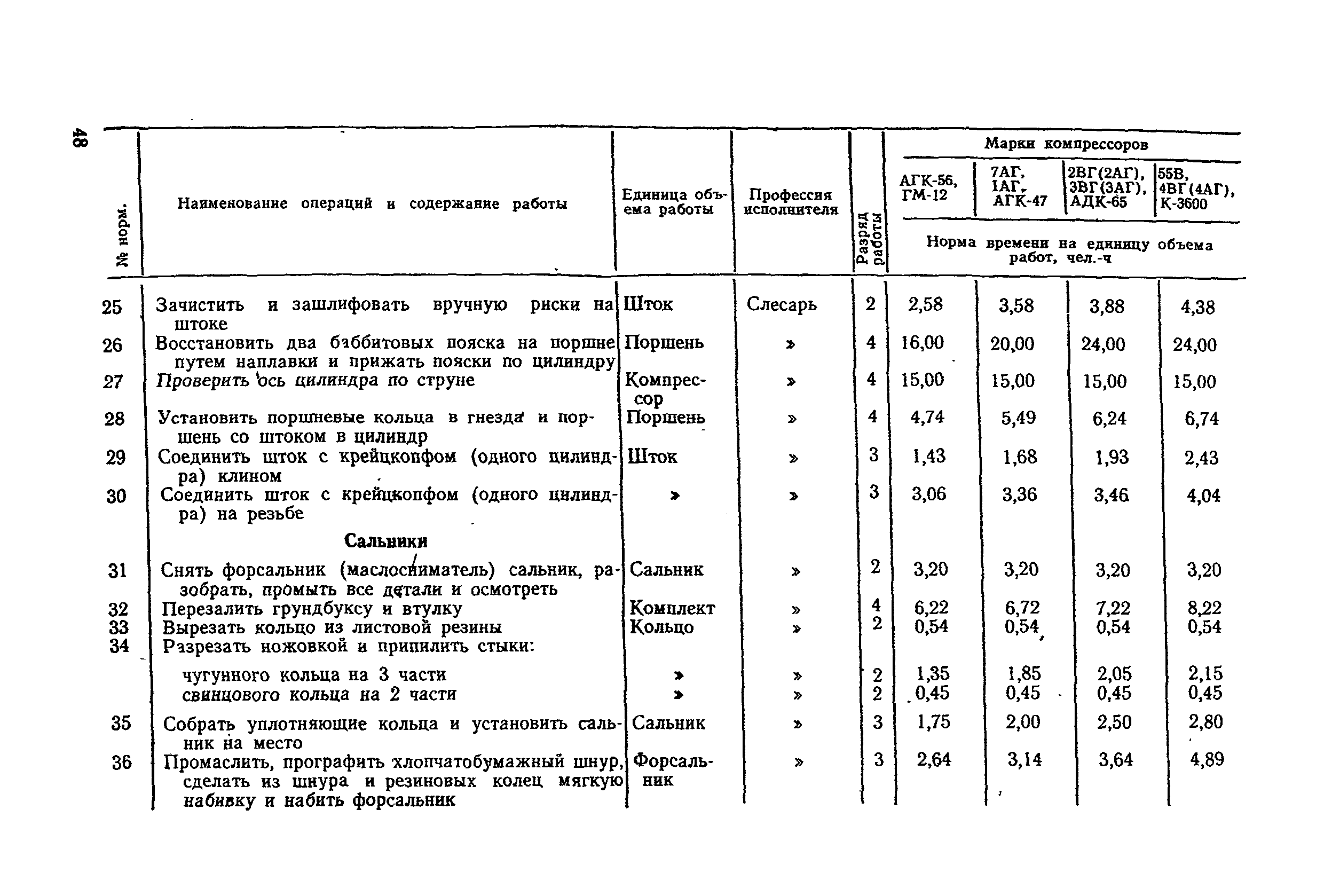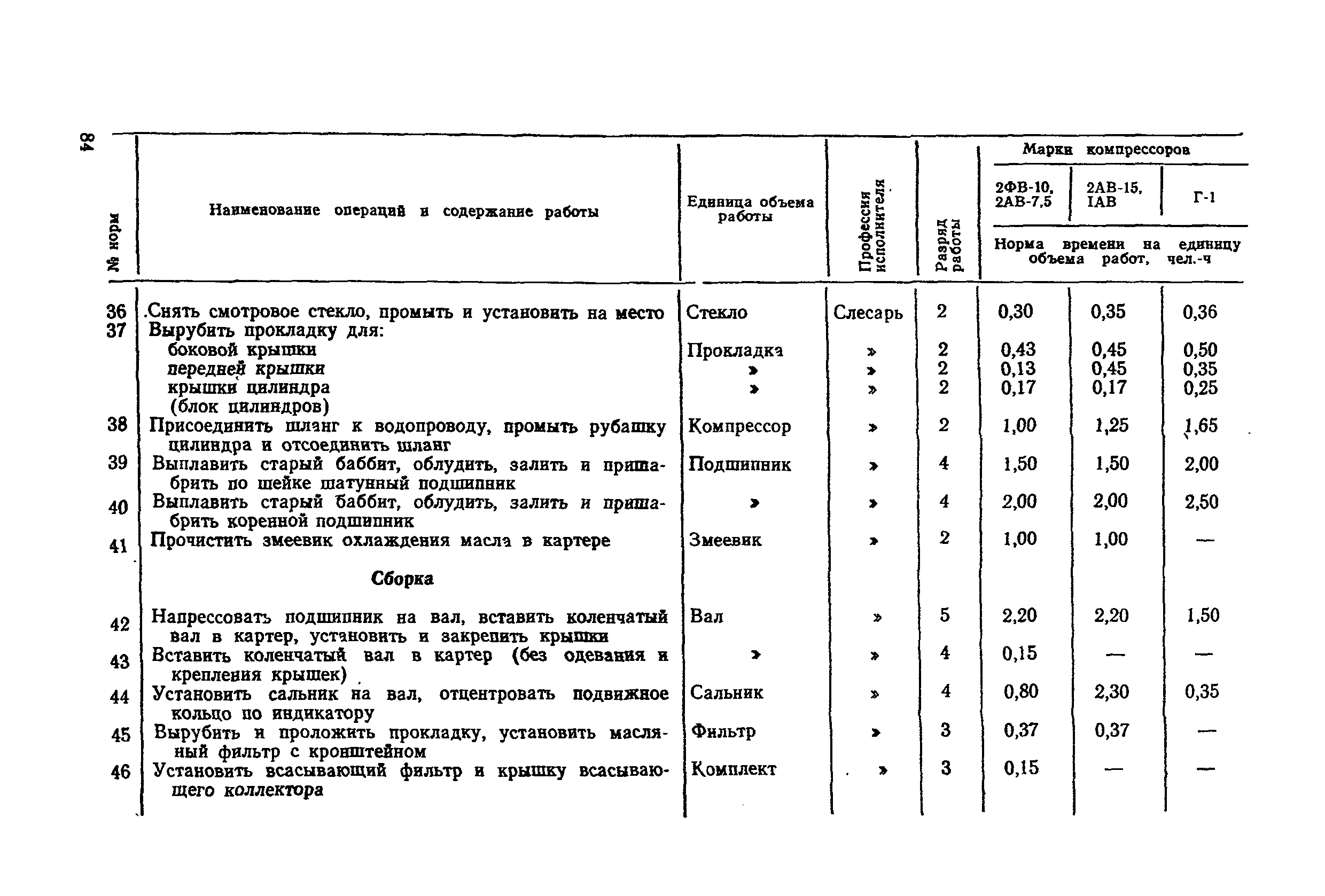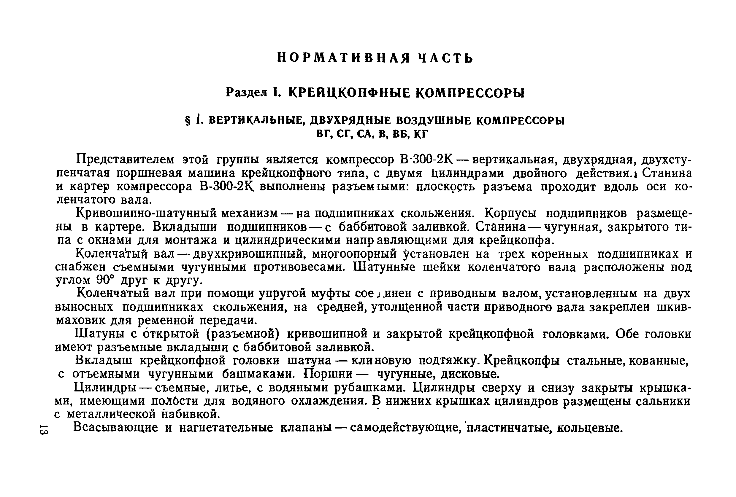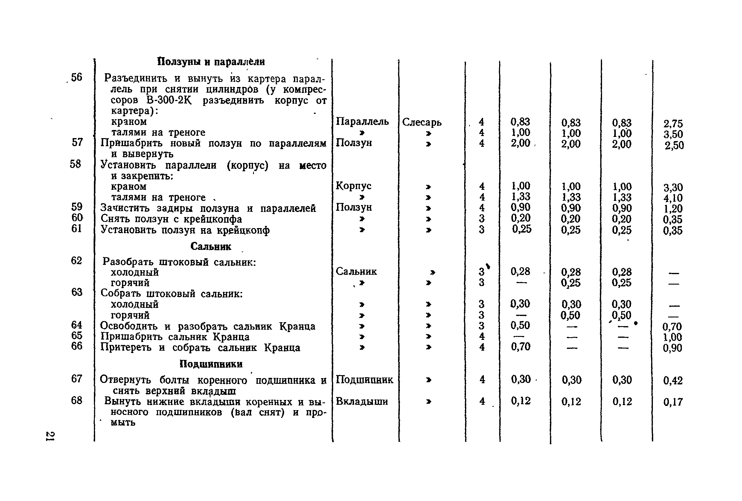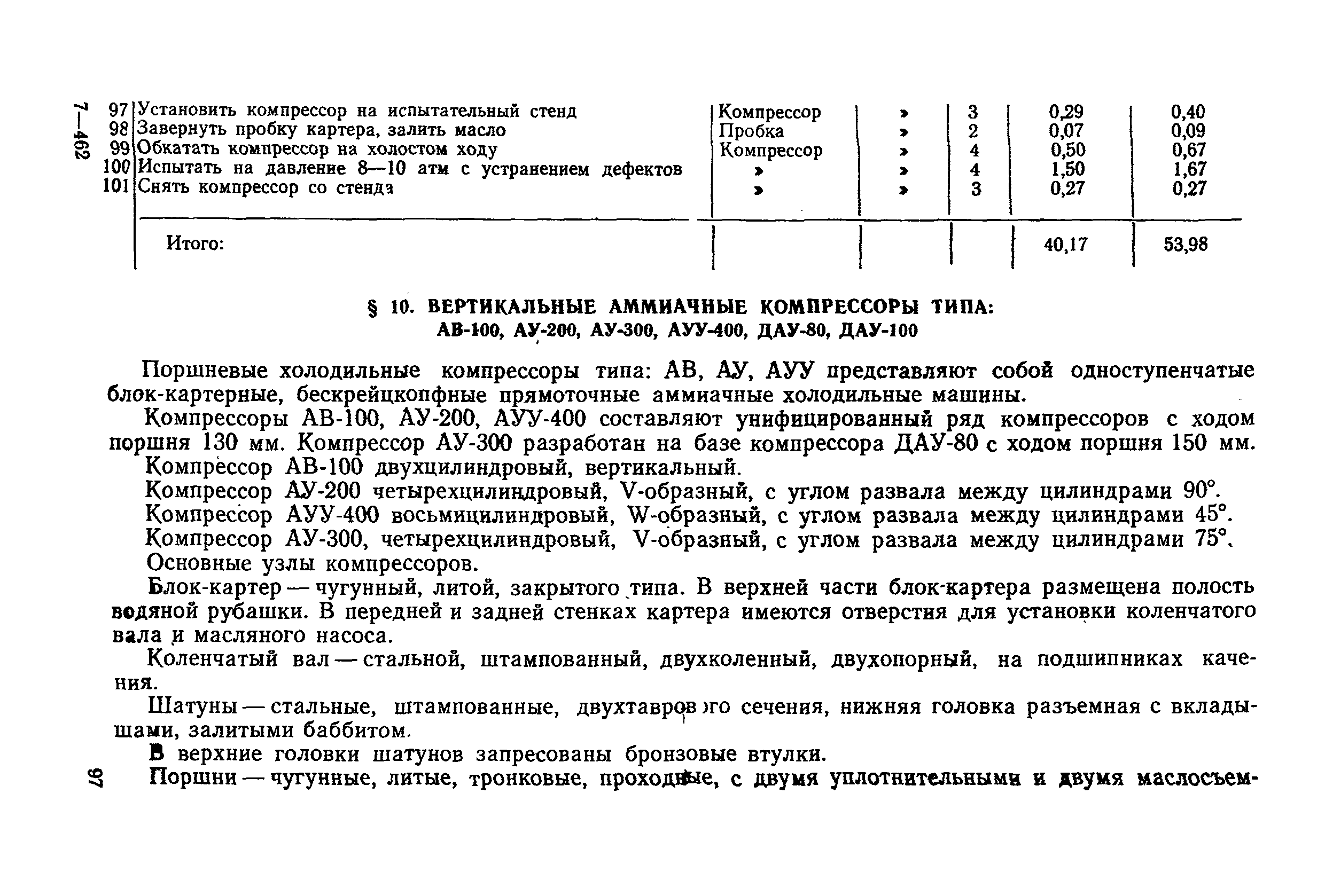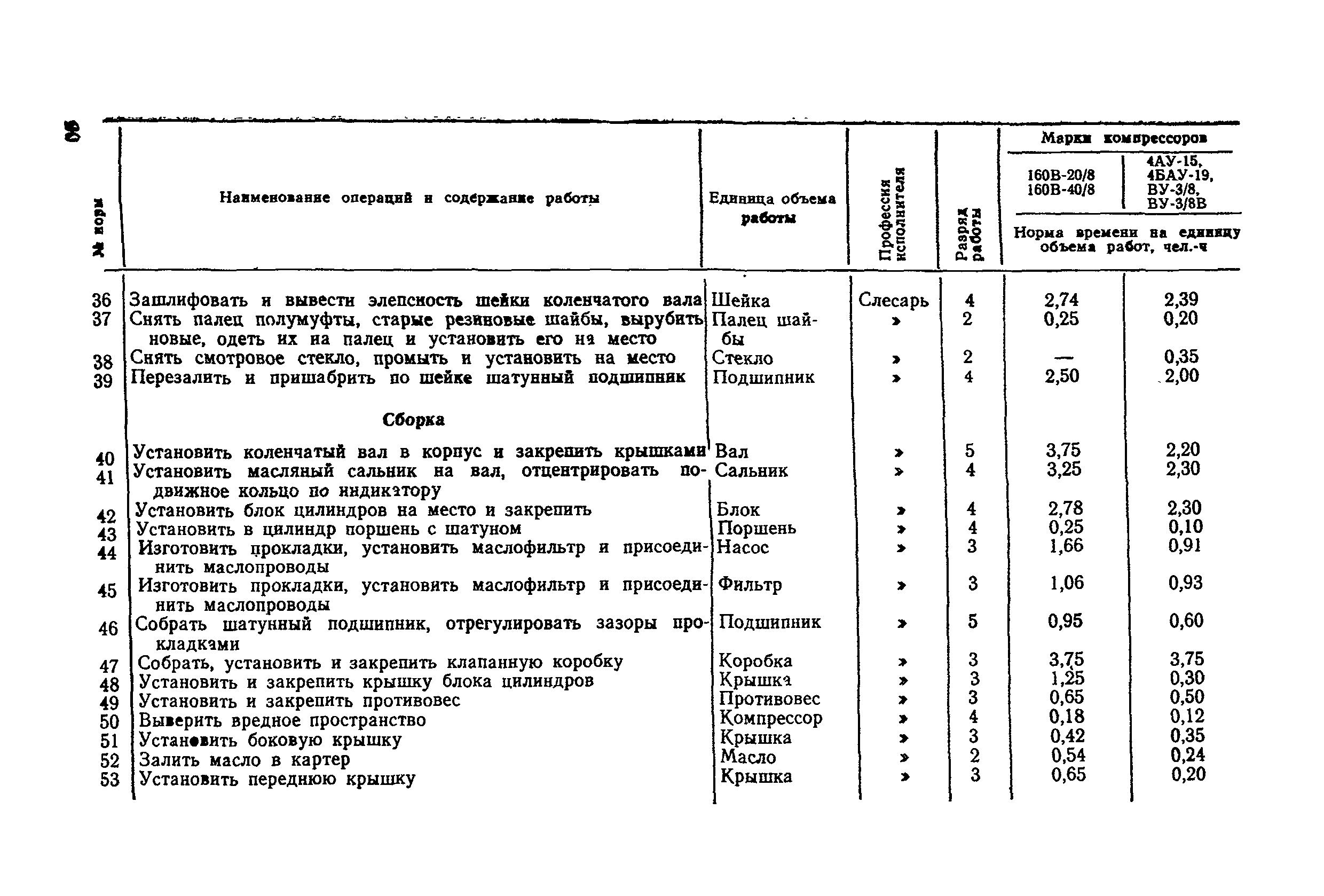 Типовые нормы времени на ремонт компрессоров (стационарных воздушных и газовых производительностью до 100 м3/мин)| Статус: | отменен в рф | | Название рус.: | Типовые нормы времени на ремонт компрессоров (стационарных воздушных и газовых производительностью до 100 м3/мин) | | Дата добавления в базу: | 01.09.2013 | | Дата актуализации: | 01.01.2021 | | Дата введения: | 25.06.2020 | | Область применения: | Сборник содержит нормы времени на разборку, сборку и ремонт компрессоров стационарных воздушных и газовых: крейцкопфных, бескрейцкопфных, ротационных и турбокомпрессоров. | | Оглавление: | Общая часть Организация труда Нормативная часть Раздел 1. Крейцкопфные компрессоры 1. Вертикальные двухрядные воздушные компрессоры типа ВГ, СГ, СА, В, ВБ, КГ 2. Угловые (прямоугольные) воздушные и газовые компрессоры типа: ВП и ГП 3. Вертикальные двухрядные воздушные компрессоры высокого давления типа Р. РК, РО, РВ, ЭК 4. Горизонтальные одно- и двухрядные воздушные компрессоры низкого давления типа В, ВГ, АГ, ГМ, АГК, АДК, ЗУГМ, 4УГ, 5УГ 5. Горизонтальные двухрядные газовые компрессоры типа 5Г, ДSV 6. Горизонтальные воздушные компрессоры низкого давления типа 300-2К, 400-2К, 500-2К, 600-2К Раздел II. Бескрейцкопфные компрессоры 7. Вертикальные, одно0 и двухрядные воздушные компрессоры типа В, ЦВ, ВК, КВ, ВКС, ВВК, C 8. Вертикальные одно- и двухрядные, одно- и двухцилиндровые компрессоры типа АВ, ФВ, Г 9. Вертикальные V- и W-образные воздушные компрессоры типа В, АУ, БАУ, ВУ, КС-3М, КСЭ-3М, К-5, КСЭ-5М 10. Вертикальные аммиачные компрессоры типа АВ-100, АУ-200, АУ-300, АУ-400, ДАУ-80, ДАУ-100 Раздел III. Ротационные компрессоры и турбокомпрессоры 11. Ротационные компрессоры типа "Демаг", "Клейн-Шандлер-Беккер" 12. Турбокомпрессоры типа ТГ-700/7, "ККК", ТР-7/3. "ЕГЕР", ТГ-4 | | Разработан: | НИИ труда Госкомтруда СССР ЦБНТ