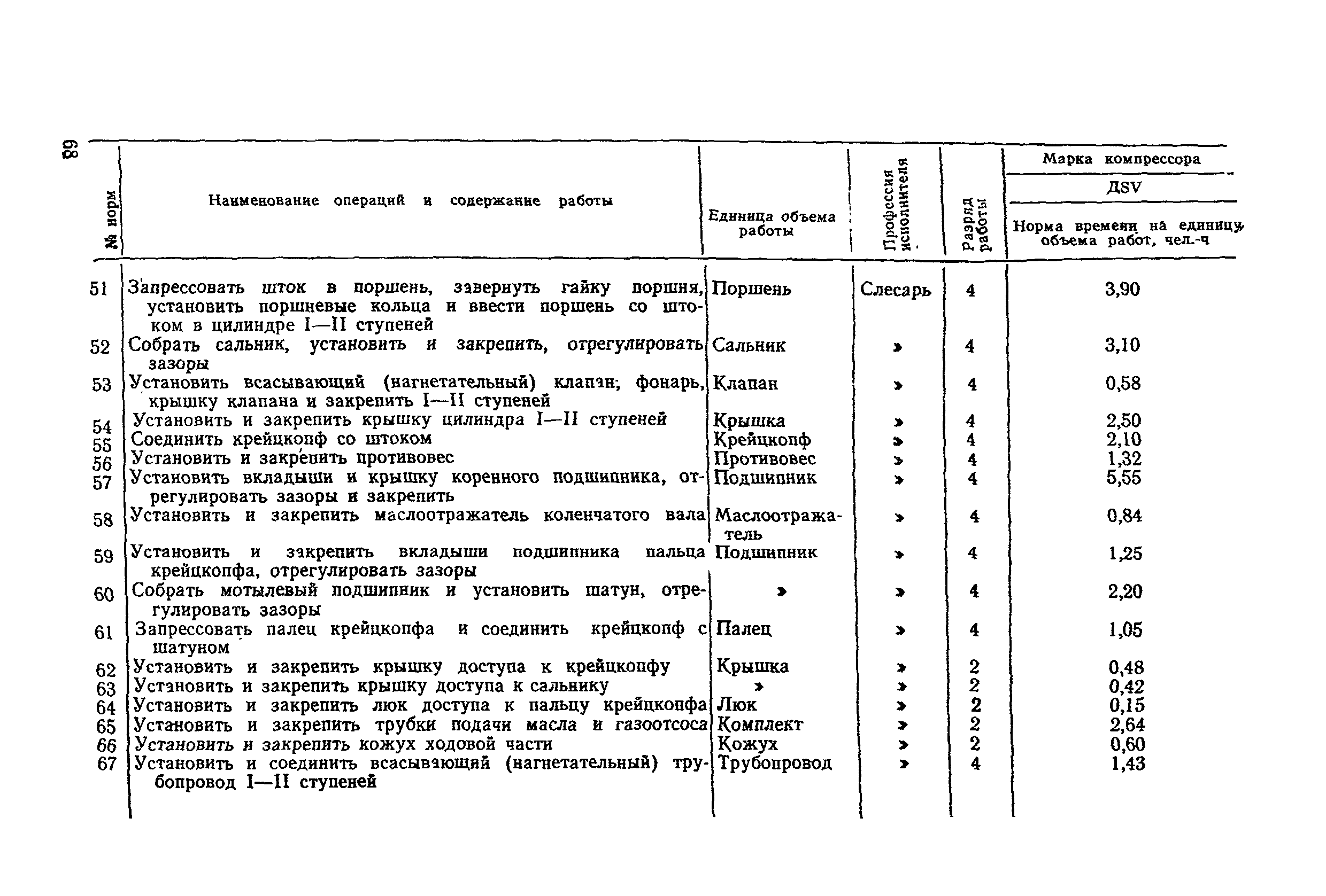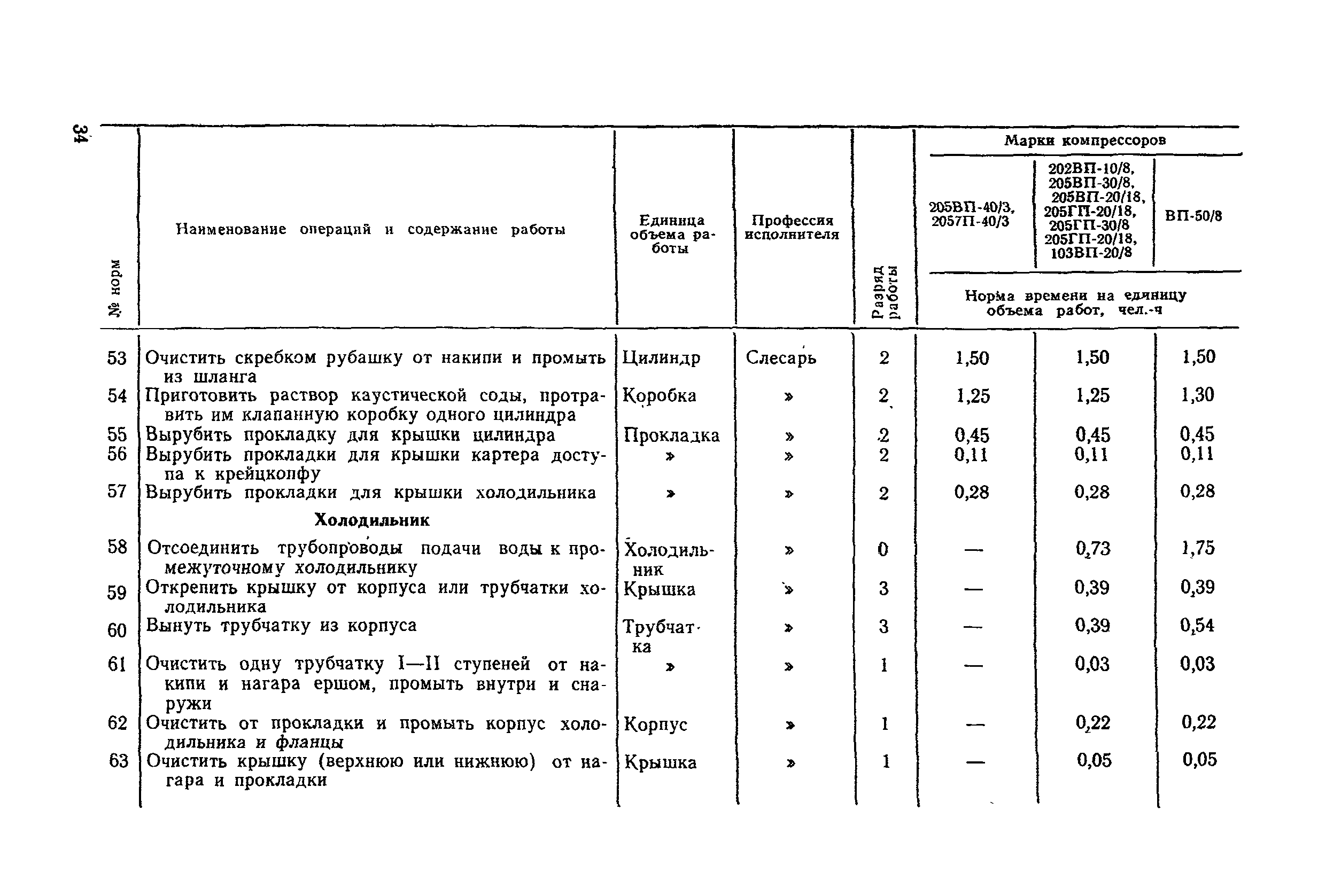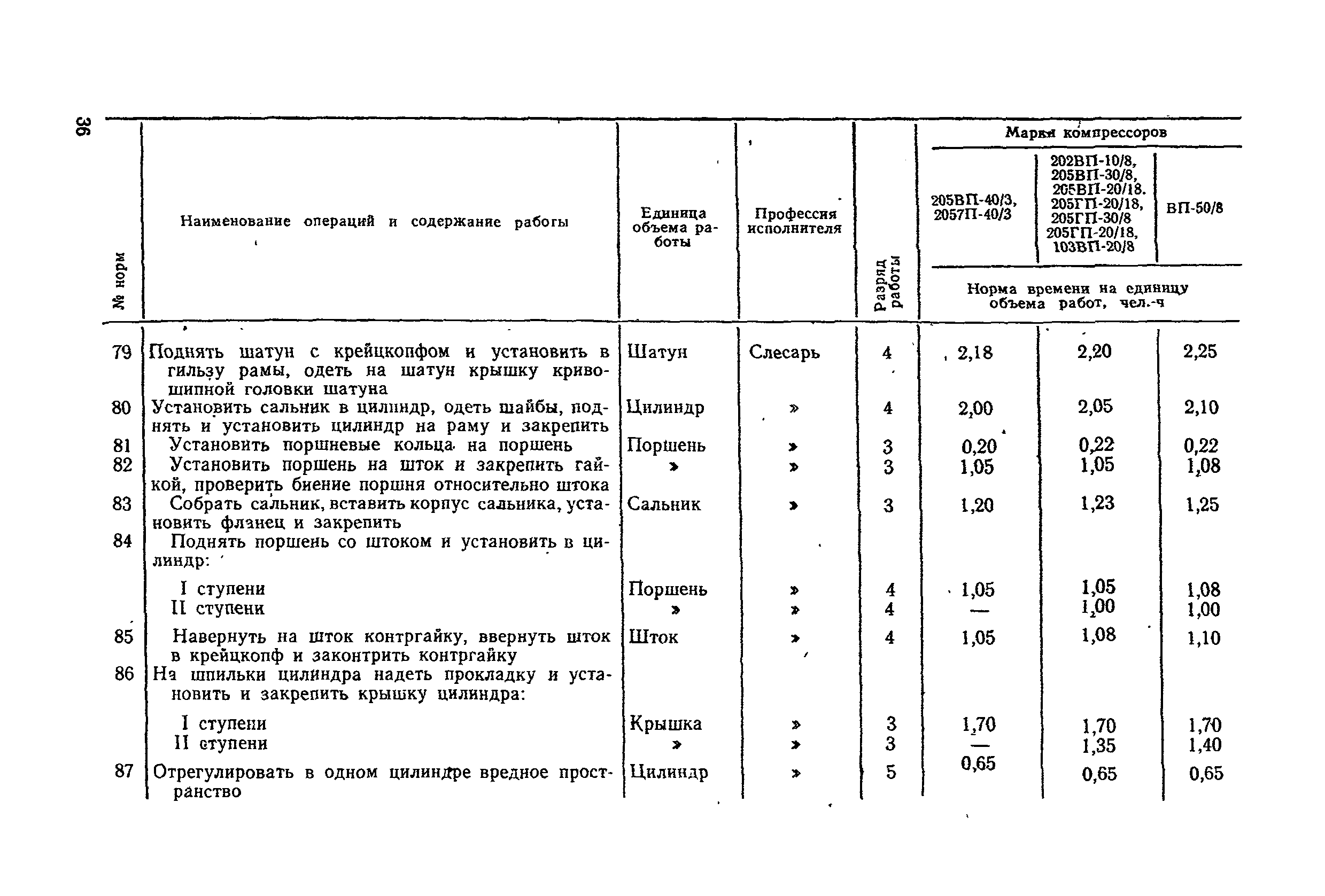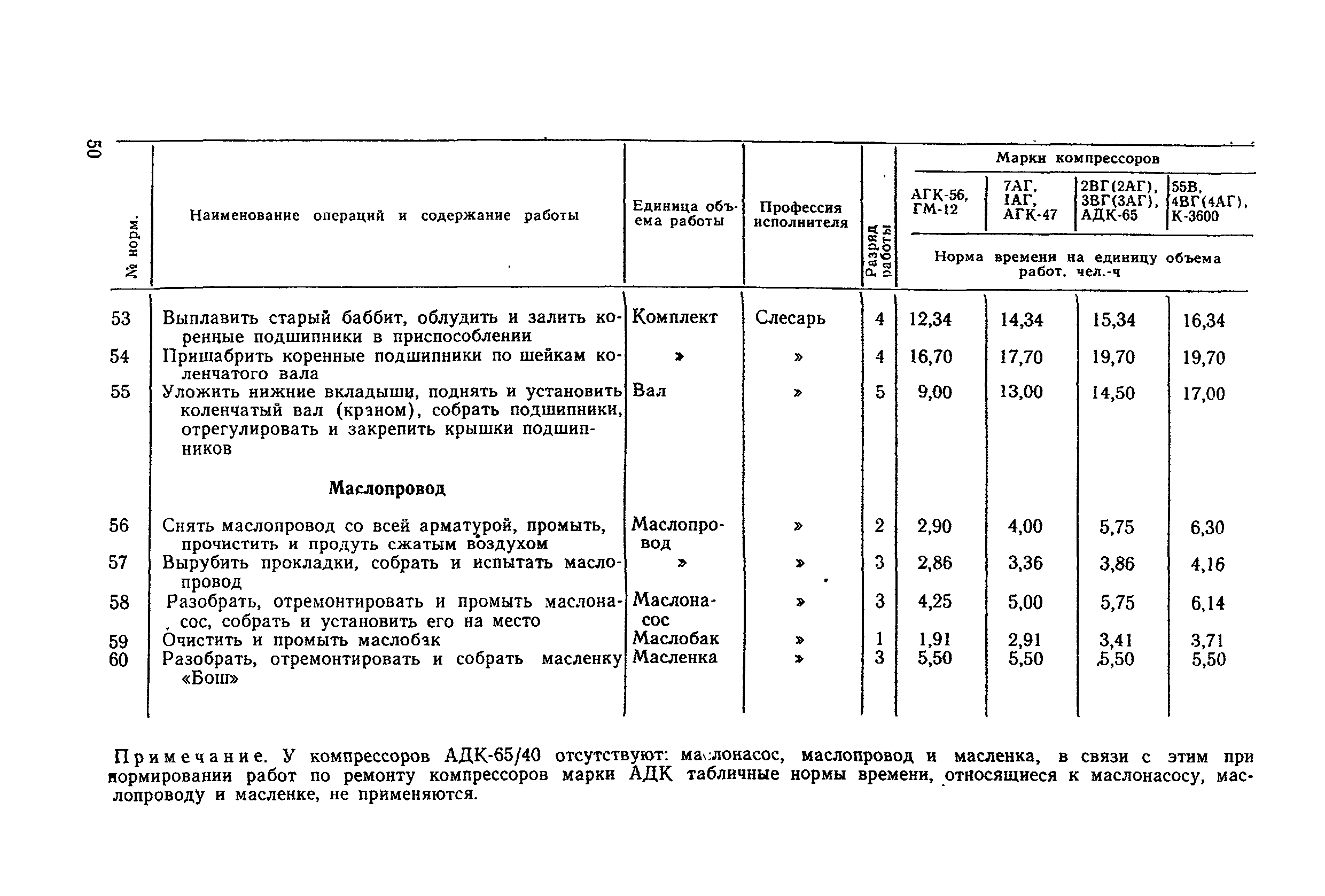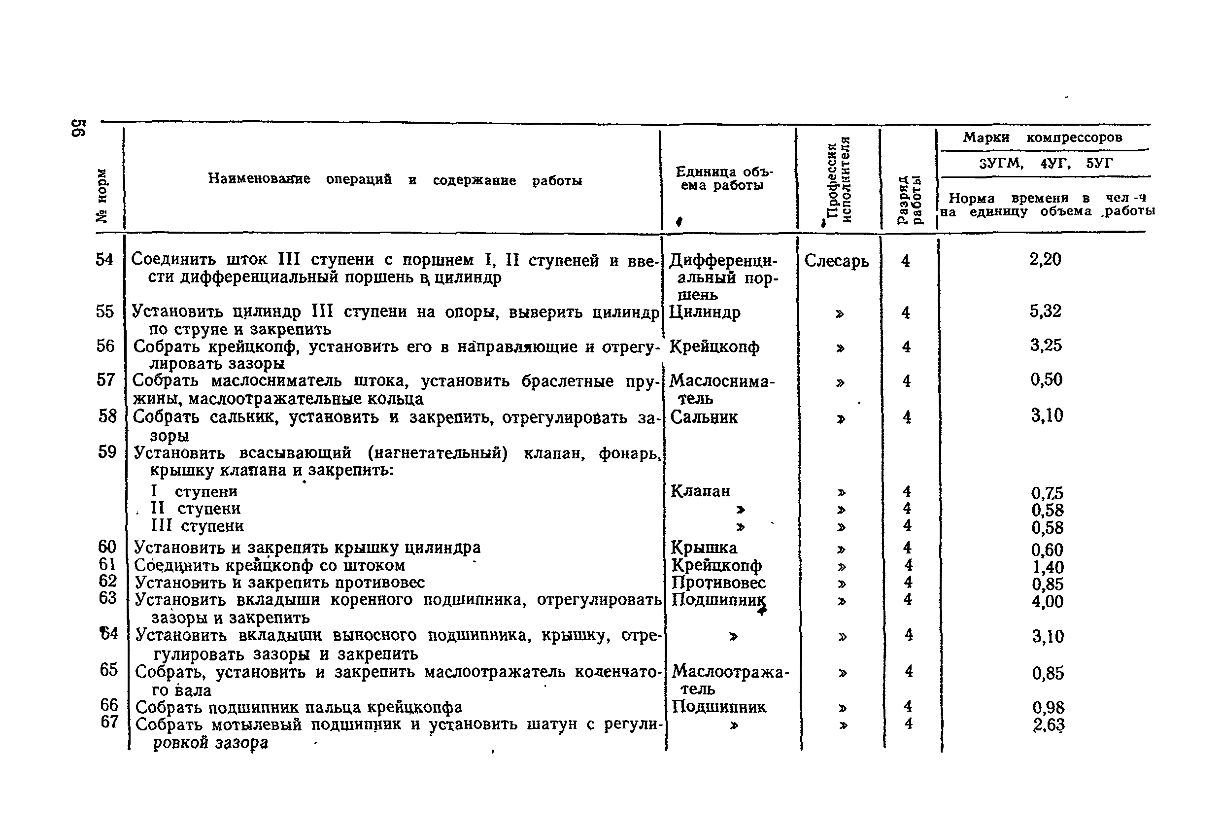 Типовые нормы времени на ремонт компрессоров (стационарных воздушных и газовых производительностью до 100 м3/мин)| Статус: | отменен в рф | | Название рус.: | Типовые нормы времени на ремонт компрессоров (стационарных воздушных и газовых производительностью до 100 м3/мин) | | Дата добавления в базу: | 01.09.2013 | | Дата актуализации: | 01.01.2021 | | Дата введения: | 25.06.2020 | | Область применения: | Сборник содержит нормы времени на разборку, сборку и ремонт компрессоров стационарных воздушных и газовых: крейцкопфных, бескрейцкопфных, ротационных и турбокомпрессоров. | | Оглавление: | Общая часть Организация труда Нормативная часть Раздел 1. Крейцкопфные компрессоры 1. Вертикальные двухрядные воздушные компрессоры типа ВГ, СГ, СА, В, ВБ, КГ 2. Угловые (прямоугольные) воздушные и газовые компрессоры типа: ВП и ГП 3. Вертикальные двухрядные воздушные компрессоры высокого давления типа Р. РК, РО, РВ, ЭК 4. Горизонтальные одно- и двухрядные воздушные компрессоры низкого давления типа В, ВГ, АГ, ГМ, АГК, АДК, ЗУГМ, 4УГ, 5УГ 5. Горизонтальные двухрядные газовые компрессоры типа 5Г, ДSV 6. Горизонтальные воздушные компрессоры низкого давления типа 300-2К, 400-2К, 500-2К, 600-2К Раздел II. Бескрейцкопфные компрессоры 7. Вертикальные, одно0 и двухрядные воздушные компрессоры типа В, ЦВ, ВК, КВ, ВКС, ВВК, C 8. Вертикальные одно- и двухрядные, одно- и двухцилиндровые компрессоры типа АВ, ФВ, Г 9. Вертикальные V- и W-образные воздушные компрессоры типа В, АУ, БАУ, ВУ, КС-3М, КСЭ-3М, К-5, КСЭ-5М 10. Вертикальные аммиачные компрессоры типа АВ-100, АУ-200, АУ-300, АУ-400, ДАУ-80, ДАУ-100 Раздел III. Ротационные компрессоры и турбокомпрессоры 11. Ротационные компрессоры типа "Демаг", "Клейн-Шандлер-Беккер" 12. Турбокомпрессоры типа ТГ-700/7, "ККК", ТР-7/3. "ЕГЕР", ТГ-4 | | Разработан: | НИИ труда Госкомтруда СССР ЦБНТ