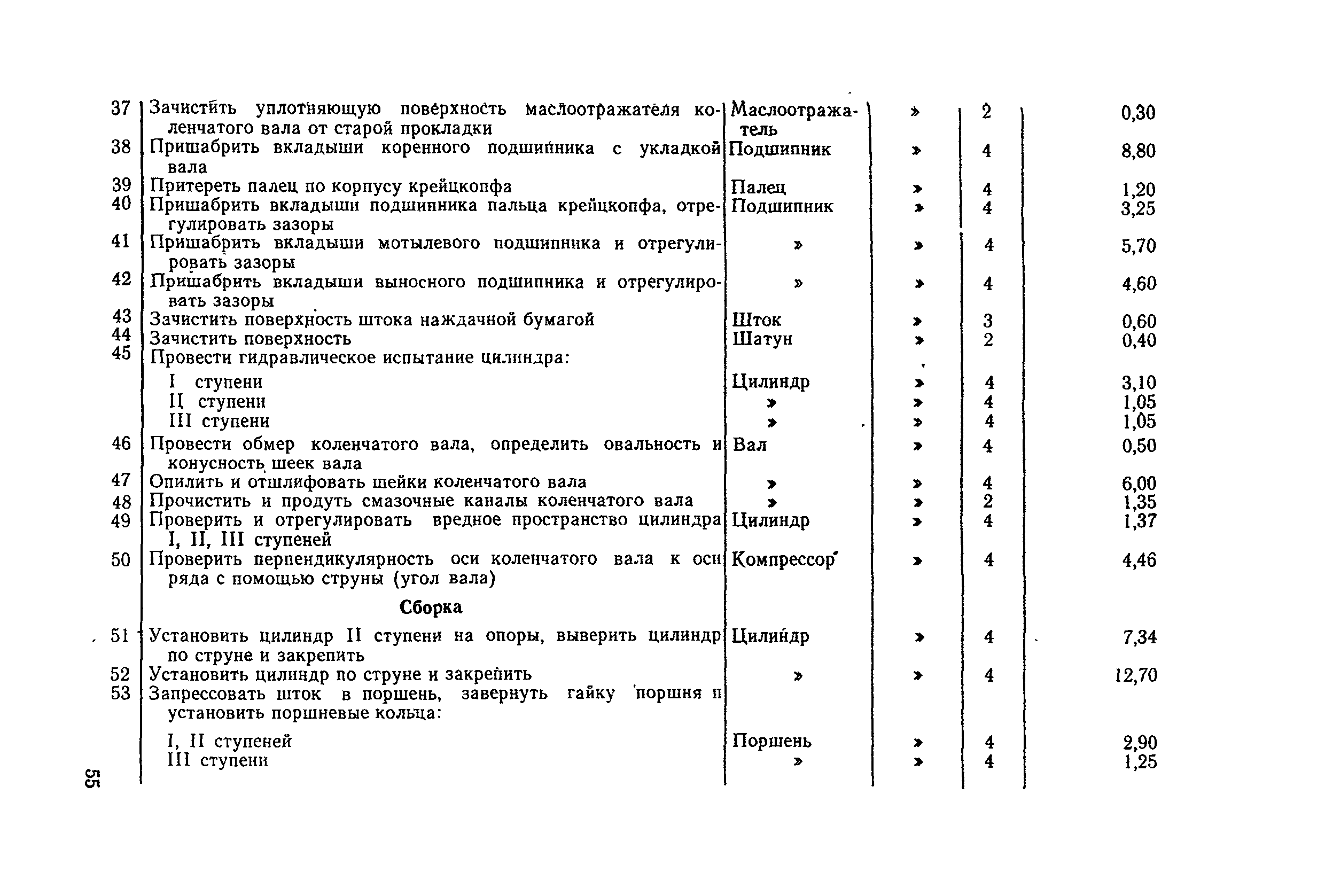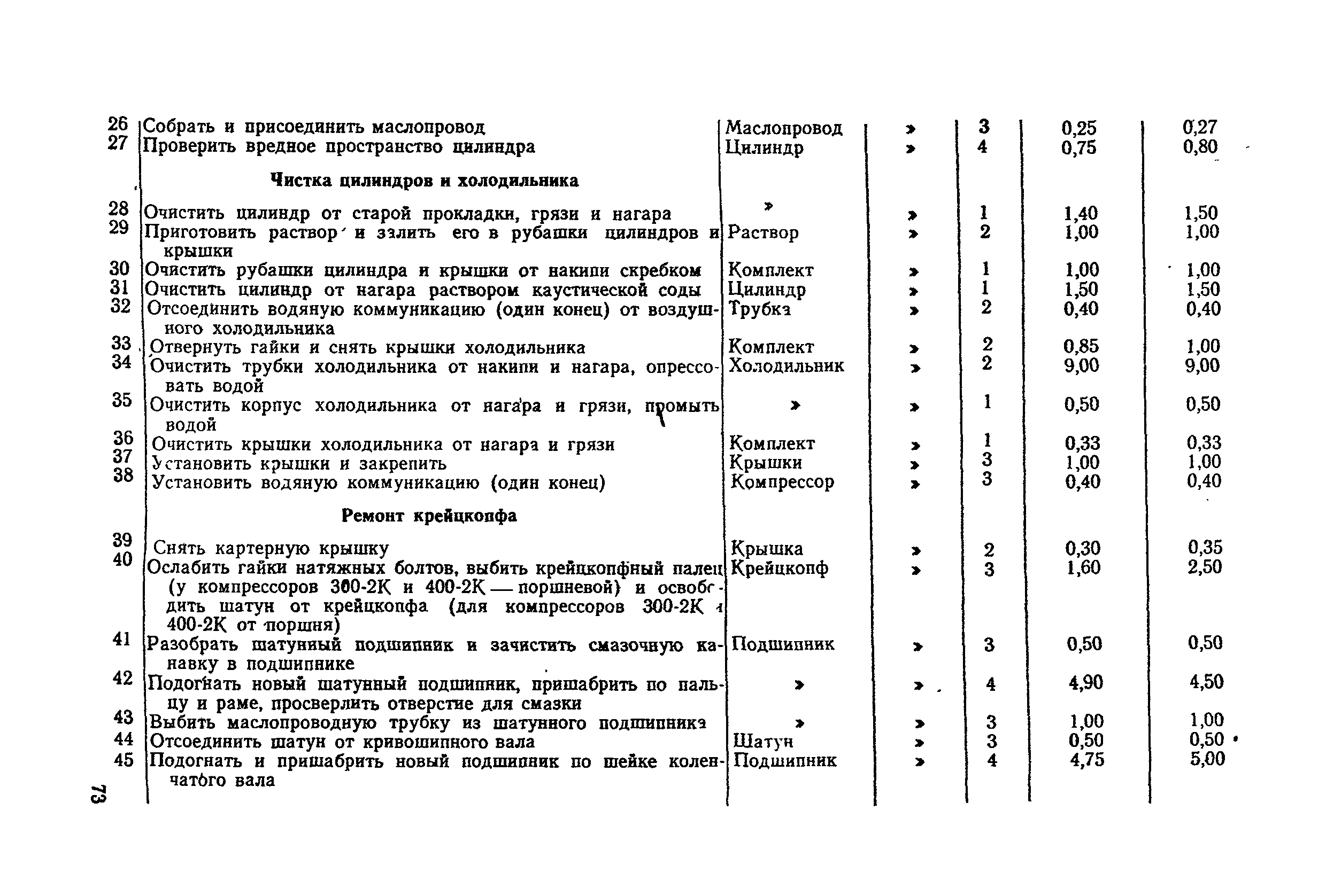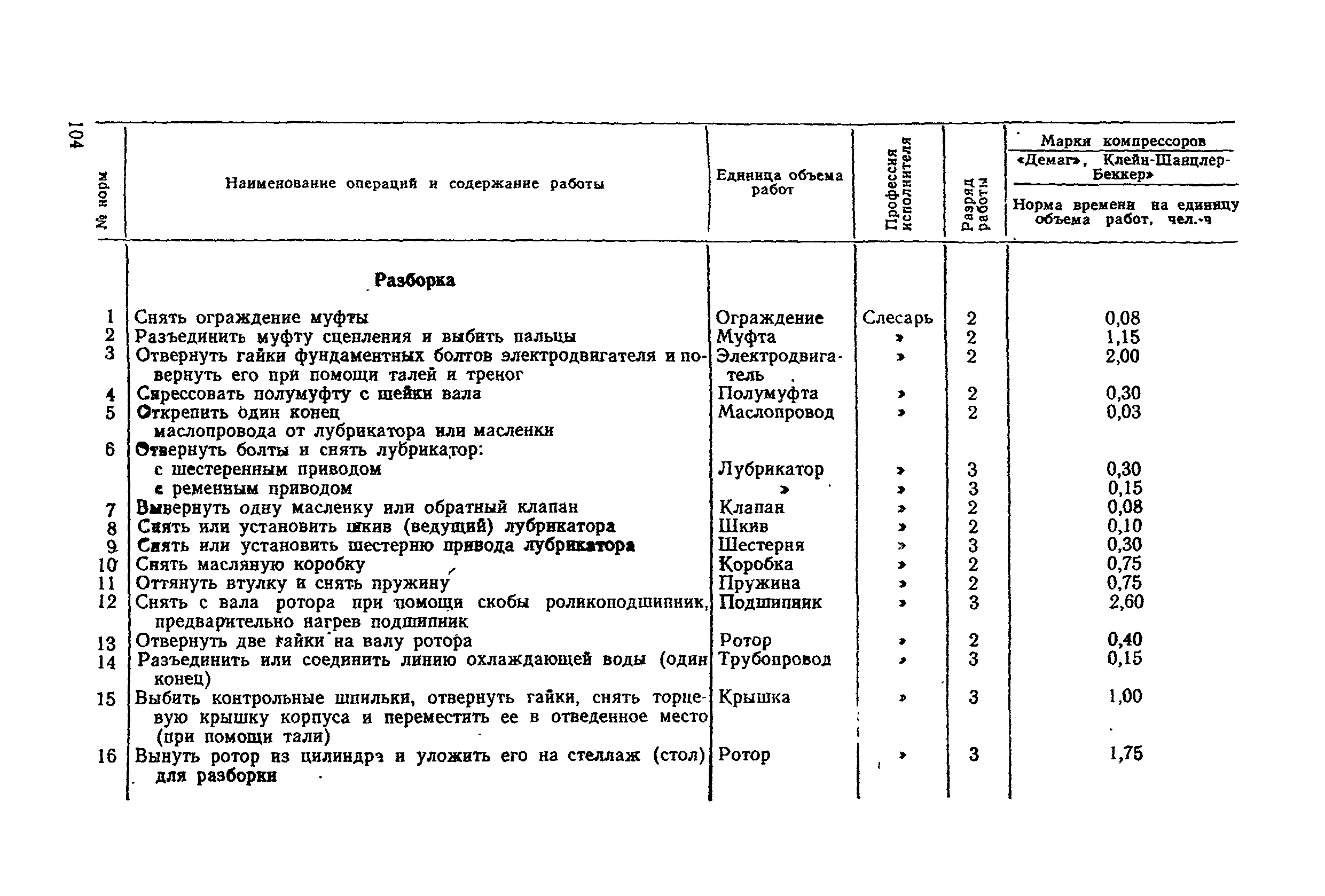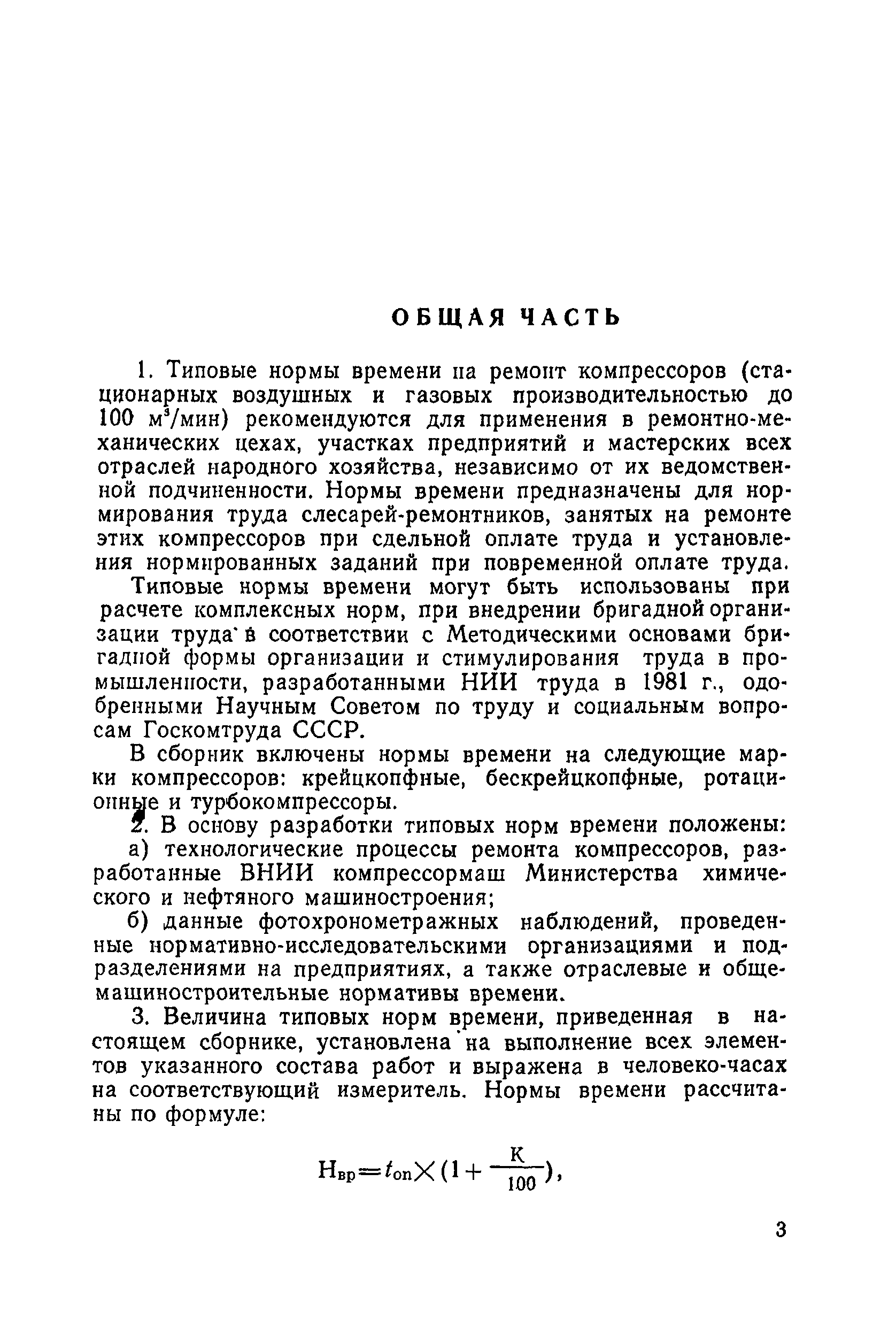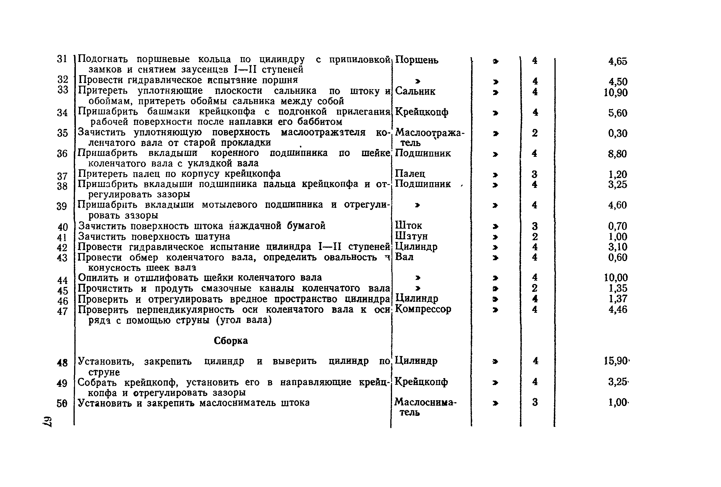 Типовые нормы времени на ремонт компрессоров (стационарных воздушных и газовых производительностью до 100 м3/мин)| Статус: | отменен в рф | | Название рус.: | Типовые нормы времени на ремонт компрессоров (стационарных воздушных и газовых производительностью до 100 м3/мин) | | Дата добавления в базу: | 01.09.2013 | | Дата актуализации: | 01.01.2021 | | Дата введения: | 25.06.2020 | | Область применения: | Сборник содержит нормы времени на разборку, сборку и ремонт компрессоров стационарных воздушных и газовых: крейцкопфных, бескрейцкопфных, ротационных и турбокомпрессоров. | | Оглавление: | Общая часть Организация труда Нормативная часть Раздел 1. Крейцкопфные компрессоры 1. Вертикальные двухрядные воздушные компрессоры типа ВГ, СГ, СА, В, ВБ, КГ 2. Угловые (прямоугольные) воздушные и газовые компрессоры типа: ВП и ГП 3. Вертикальные двухрядные воздушные компрессоры высокого давления типа Р. РК, РО, РВ, ЭК 4. Горизонтальные одно- и двухрядные воздушные компрессоры низкого давления типа В, ВГ, АГ, ГМ, АГК, АДК, ЗУГМ, 4УГ, 5УГ 5. Горизонтальные двухрядные газовые компрессоры типа 5Г, ДSV 6. Горизонтальные воздушные компрессоры низкого давления типа 300-2К, 400-2К, 500-2К, 600-2К Раздел II. Бескрейцкопфные компрессоры 7. Вертикальные, одно0 и двухрядные воздушные компрессоры типа В, ЦВ, ВК, КВ, ВКС, ВВК, C 8. Вертикальные одно- и двухрядные, одно- и двухцилиндровые компрессоры типа АВ, ФВ, Г 9. Вертикальные V- и W-образные воздушные компрессоры типа В, АУ, БАУ, ВУ, КС-3М, КСЭ-3М, К-5, КСЭ-5М 10. Вертикальные аммиачные компрессоры типа АВ-100, АУ-200, АУ-300, АУ-400, ДАУ-80, ДАУ-100 Раздел III. Ротационные компрессоры и турбокомпрессоры 11. Ротационные компрессоры типа "Демаг", "Клейн-Шандлер-Беккер" 12. Турбокомпрессоры типа ТГ-700/7, "ККК", ТР-7/3. "ЕГЕР", ТГ-4 | | Разработан: | НИИ труда Госкомтруда СССР ЦБНТ