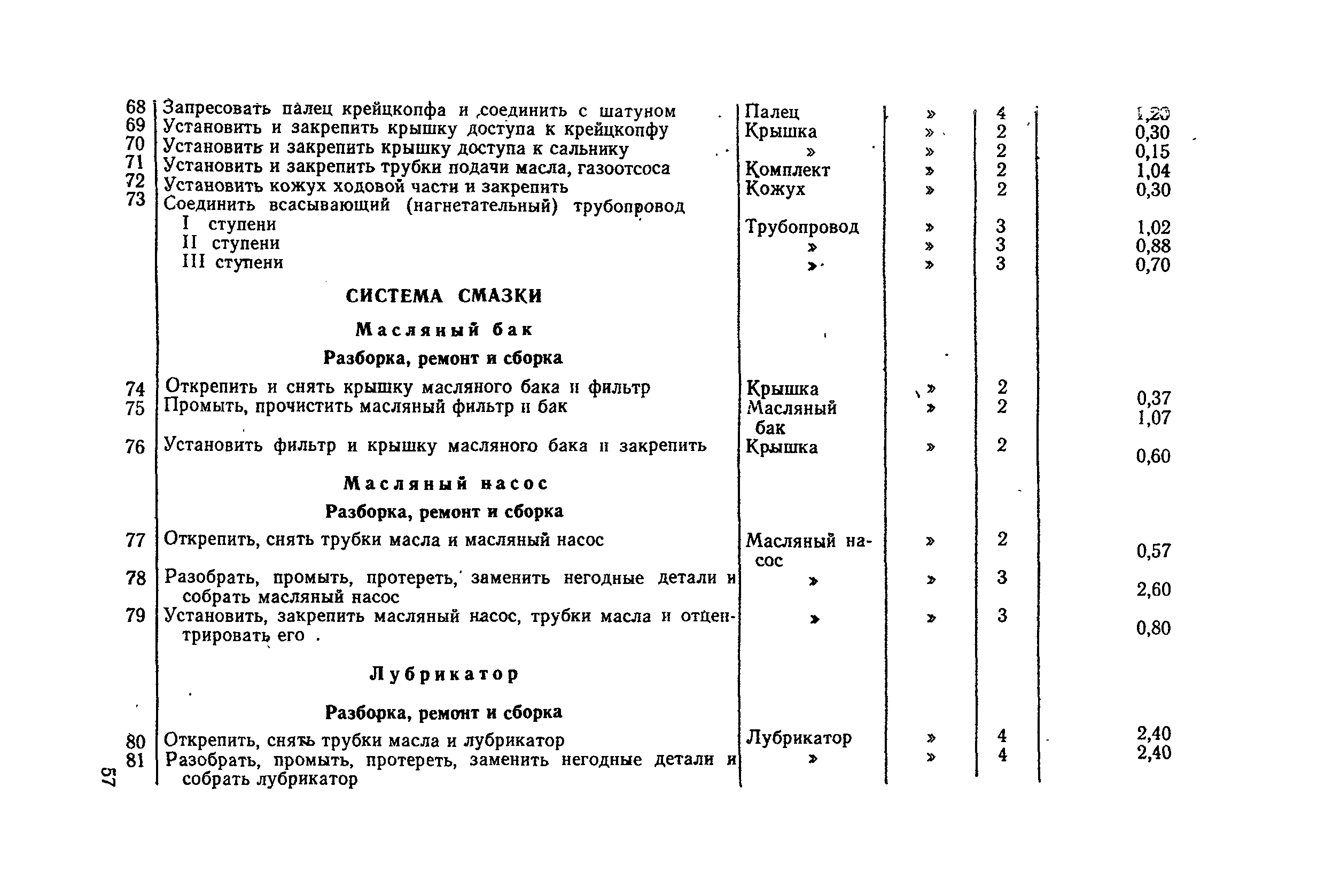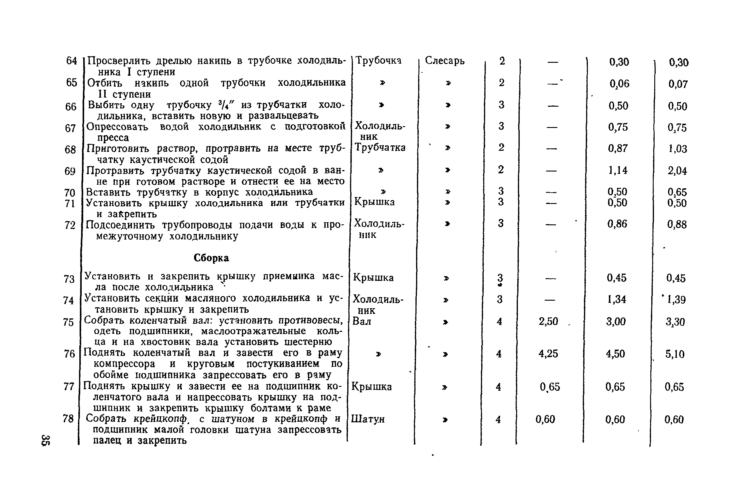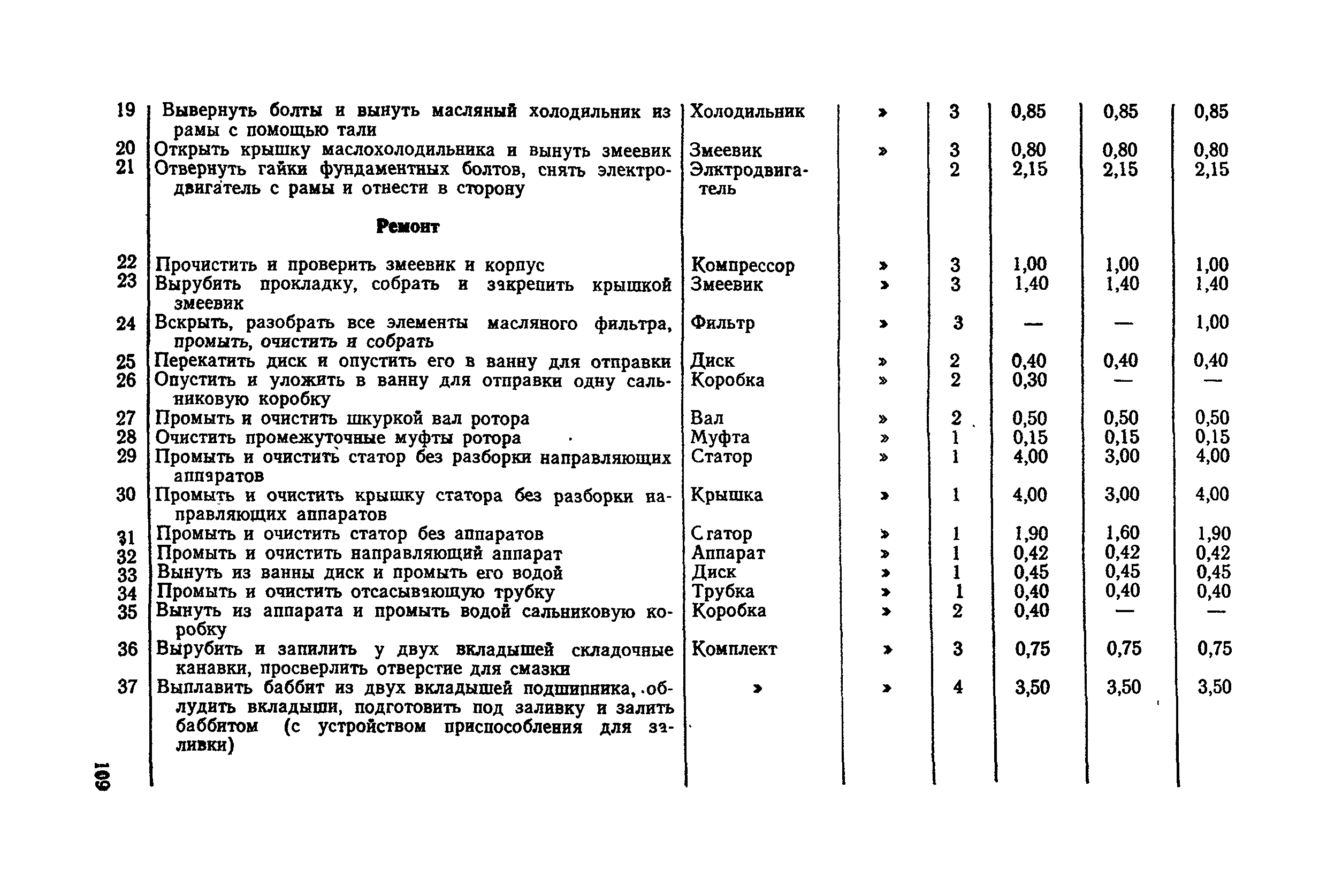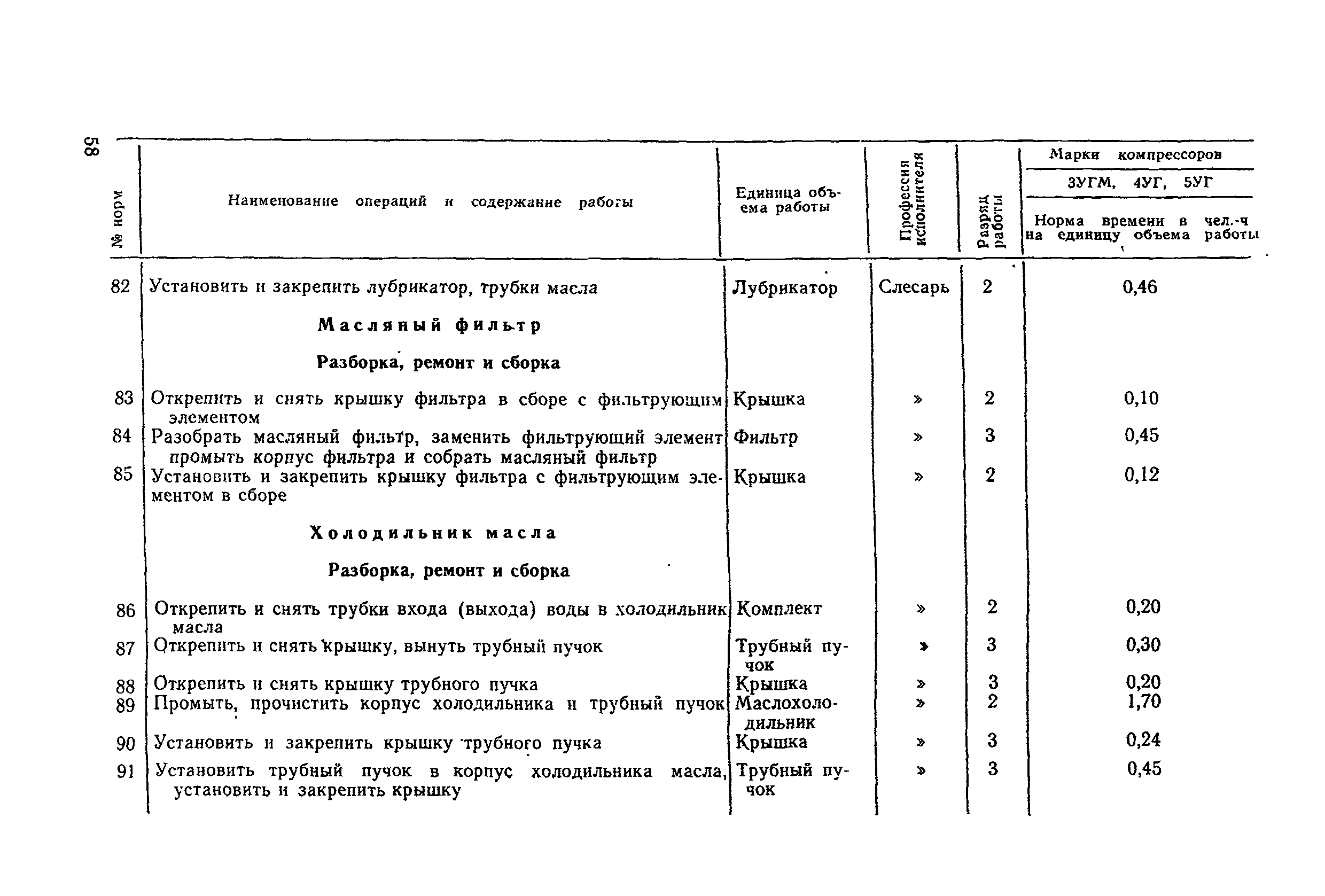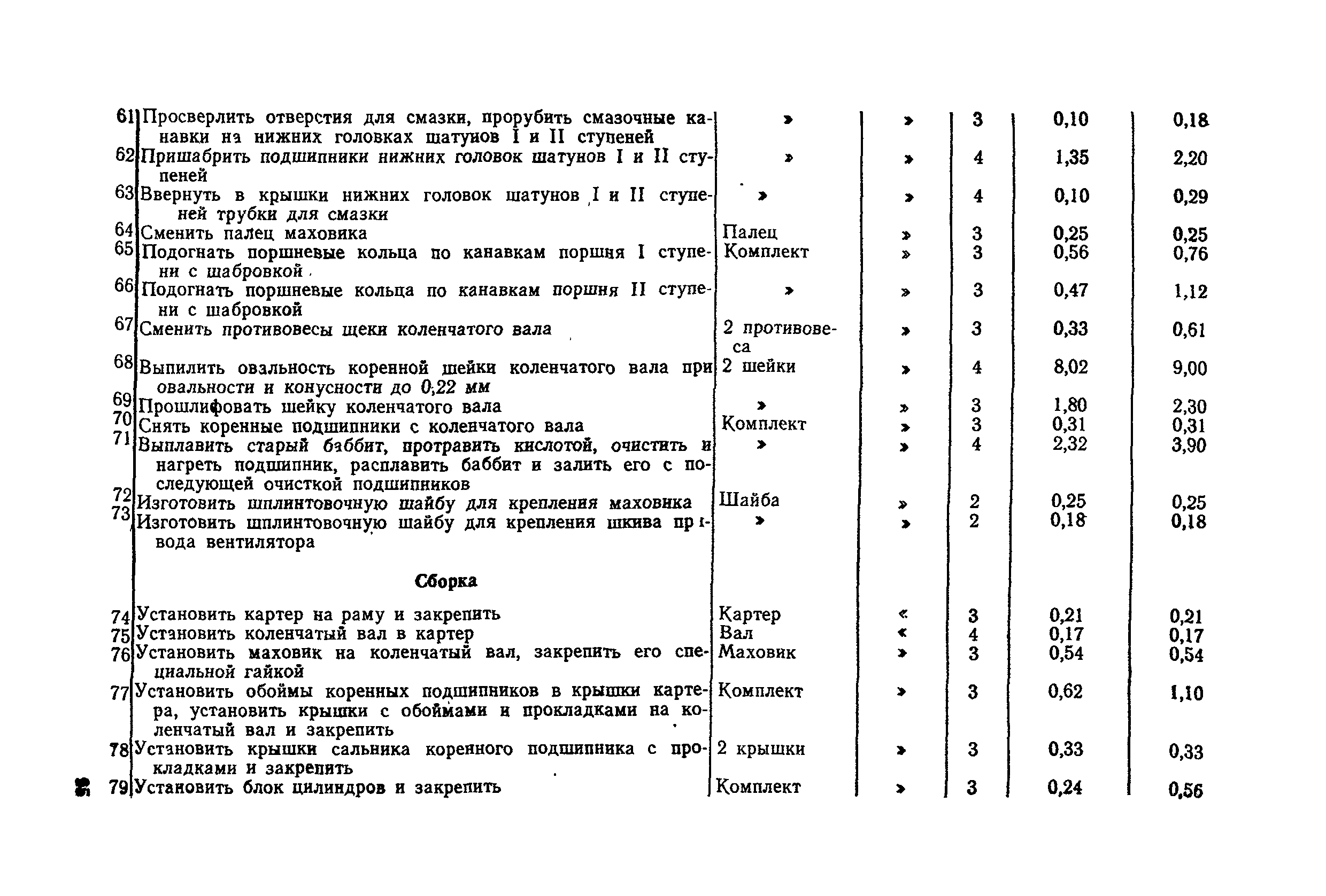 Типовые нормы времени на ремонт компрессоров (стационарных воздушных и газовых производительностью до 100 м3/мин)| Статус: | отменен в рф | | Название рус.: | Типовые нормы времени на ремонт компрессоров (стационарных воздушных и газовых производительностью до 100 м3/мин) | | Дата добавления в базу: | 01.09.2013 | | Дата актуализации: | 01.01.2021 | | Дата введения: | 25.06.2020 | | Область применения: | Сборник содержит нормы времени на разборку, сборку и ремонт компрессоров стационарных воздушных и газовых: крейцкопфных, бескрейцкопфных, ротационных и турбокомпрессоров. | | Оглавление: | Общая часть Организация труда Нормативная часть Раздел 1. Крейцкопфные компрессоры 1. Вертикальные двухрядные воздушные компрессоры типа ВГ, СГ, СА, В, ВБ, КГ 2. Угловые (прямоугольные) воздушные и газовые компрессоры типа: ВП и ГП 3. Вертикальные двухрядные воздушные компрессоры высокого давления типа Р. РК, РО, РВ, ЭК 4. Горизонтальные одно- и двухрядные воздушные компрессоры низкого давления типа В, ВГ, АГ, ГМ, АГК, АДК, ЗУГМ, 4УГ, 5УГ 5. Горизонтальные двухрядные газовые компрессоры типа 5Г, ДSV 6. Горизонтальные воздушные компрессоры низкого давления типа 300-2К, 400-2К, 500-2К, 600-2К Раздел II. Бескрейцкопфные компрессоры 7. Вертикальные, одно0 и двухрядные воздушные компрессоры типа В, ЦВ, ВК, КВ, ВКС, ВВК, C 8. Вертикальные одно- и двухрядные, одно- и двухцилиндровые компрессоры типа АВ, ФВ, Г 9. Вертикальные V- и W-образные воздушные компрессоры типа В, АУ, БАУ, ВУ, КС-3М, КСЭ-3М, К-5, КСЭ-5М 10. Вертикальные аммиачные компрессоры типа АВ-100, АУ-200, АУ-300, АУ-400, ДАУ-80, ДАУ-100 Раздел III. Ротационные компрессоры и турбокомпрессоры 11. Ротационные компрессоры типа "Демаг", "Клейн-Шандлер-Беккер" 12. Турбокомпрессоры типа ТГ-700/7, "ККК", ТР-7/3. "ЕГЕР", ТГ-4 | | Разработан: | НИИ труда Госкомтруда СССР ЦБНТ