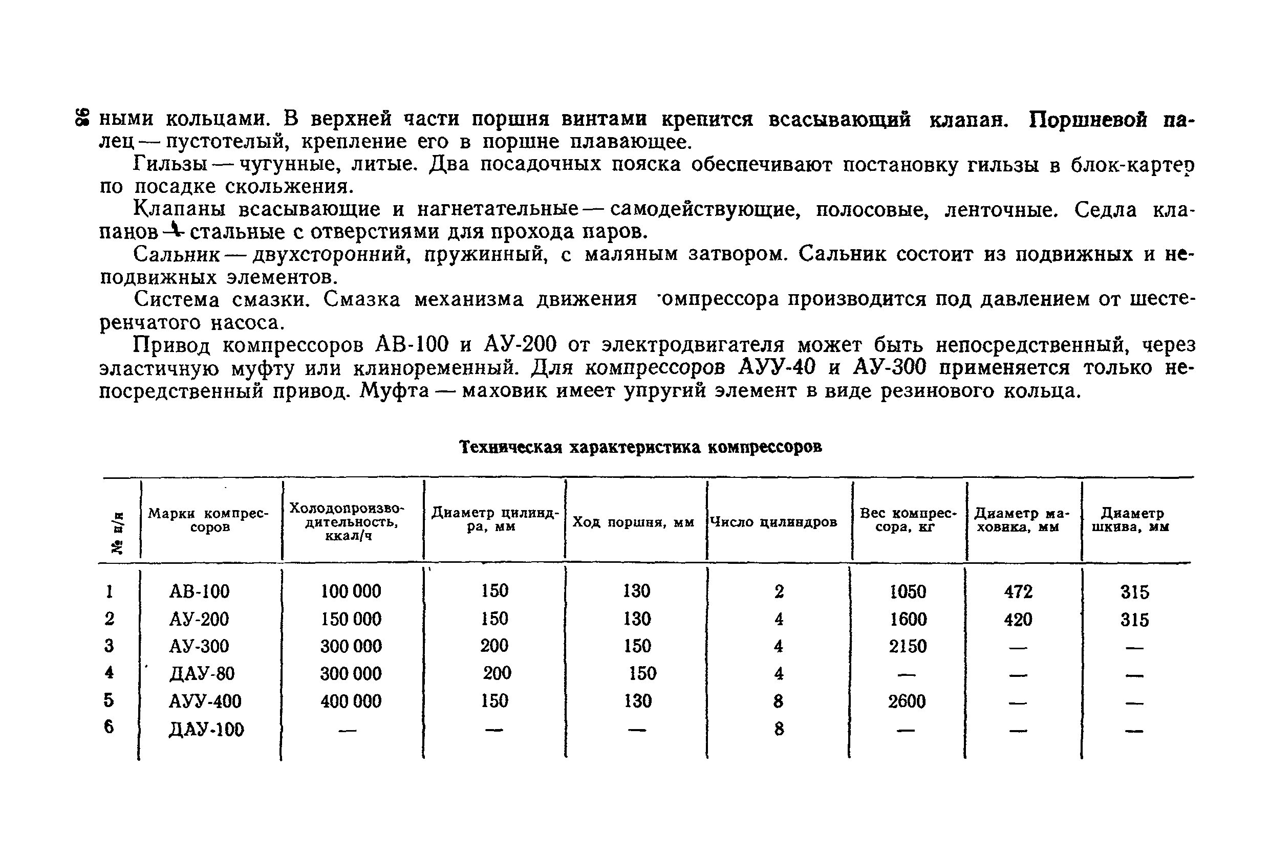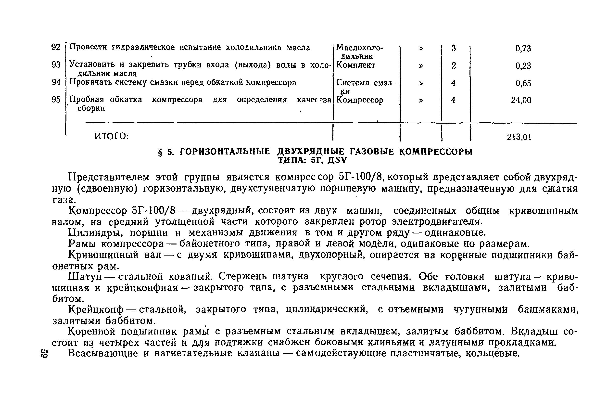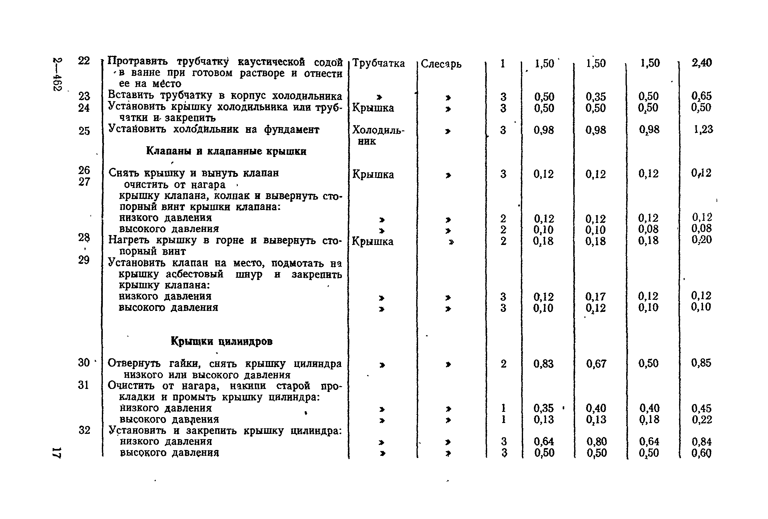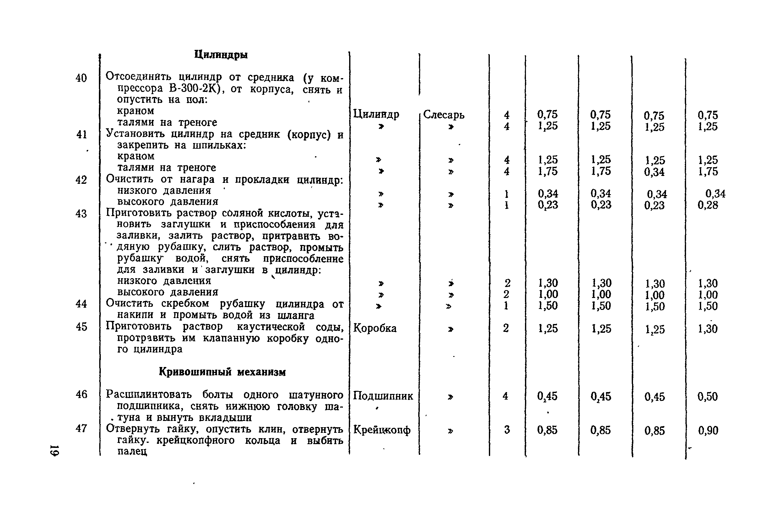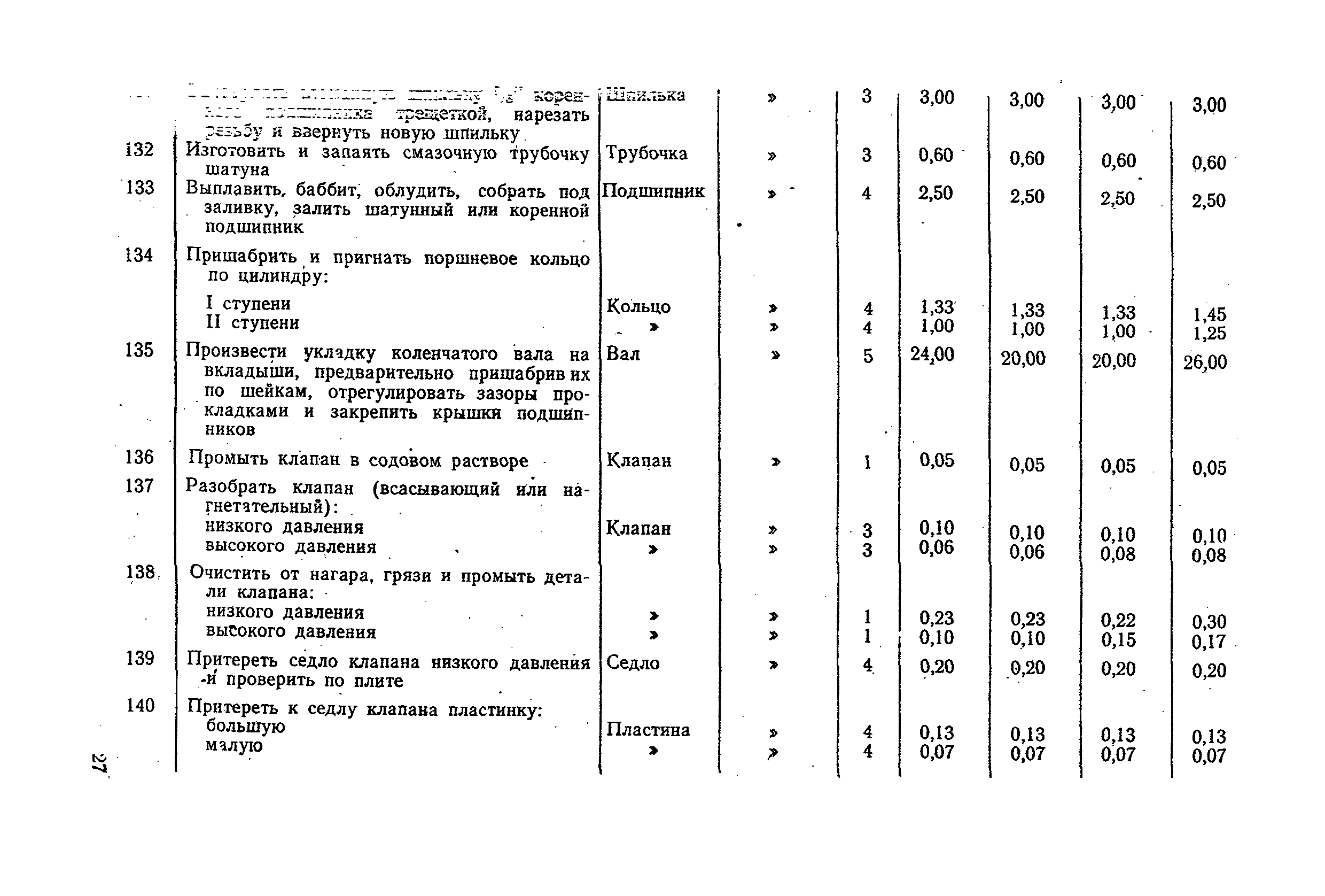 Типовые нормы времени на ремонт компрессоров (стационарных воздушных и газовых производительностью до 100 м3/мин)| Статус: | отменен в рф | | Название рус.: | Типовые нормы времени на ремонт компрессоров (стационарных воздушных и газовых производительностью до 100 м3/мин) | | Дата добавления в базу: | 01.09.2013 | | Дата актуализации: | 01.01.2021 | | Дата введения: | 25.06.2020 | | Область применения: | Сборник содержит нормы времени на разборку, сборку и ремонт компрессоров стационарных воздушных и газовых: крейцкопфных, бескрейцкопфных, ротационных и турбокомпрессоров. | | Оглавление: | Общая часть Организация труда Нормативная часть Раздел 1. Крейцкопфные компрессоры 1. Вертикальные двухрядные воздушные компрессоры типа ВГ, СГ, СА, В, ВБ, КГ 2. Угловые (прямоугольные) воздушные и газовые компрессоры типа: ВП и ГП 3. Вертикальные двухрядные воздушные компрессоры высокого давления типа Р. РК, РО, РВ, ЭК 4. Горизонтальные одно- и двухрядные воздушные компрессоры низкого давления типа В, ВГ, АГ, ГМ, АГК, АДК, ЗУГМ, 4УГ, 5УГ 5. Горизонтальные двухрядные газовые компрессоры типа 5Г, ДSV 6. Горизонтальные воздушные компрессоры низкого давления типа 300-2К, 400-2К, 500-2К, 600-2К Раздел II. Бескрейцкопфные компрессоры 7. Вертикальные, одно0 и двухрядные воздушные компрессоры типа В, ЦВ, ВК, КВ, ВКС, ВВК, C 8. Вертикальные одно- и двухрядные, одно- и двухцилиндровые компрессоры типа АВ, ФВ, Г 9. Вертикальные V- и W-образные воздушные компрессоры типа В, АУ, БАУ, ВУ, КС-3М, КСЭ-3М, К-5, КСЭ-5М 10. Вертикальные аммиачные компрессоры типа АВ-100, АУ-200, АУ-300, АУ-400, ДАУ-80, ДАУ-100 Раздел III. Ротационные компрессоры и турбокомпрессоры 11. Ротационные компрессоры типа "Демаг", "Клейн-Шандлер-Беккер" 12. Турбокомпрессоры типа ТГ-700/7, "ККК", ТР-7/3. "ЕГЕР", ТГ-4 | | Разработан: | НИИ труда Госкомтруда СССР ЦБНТ
