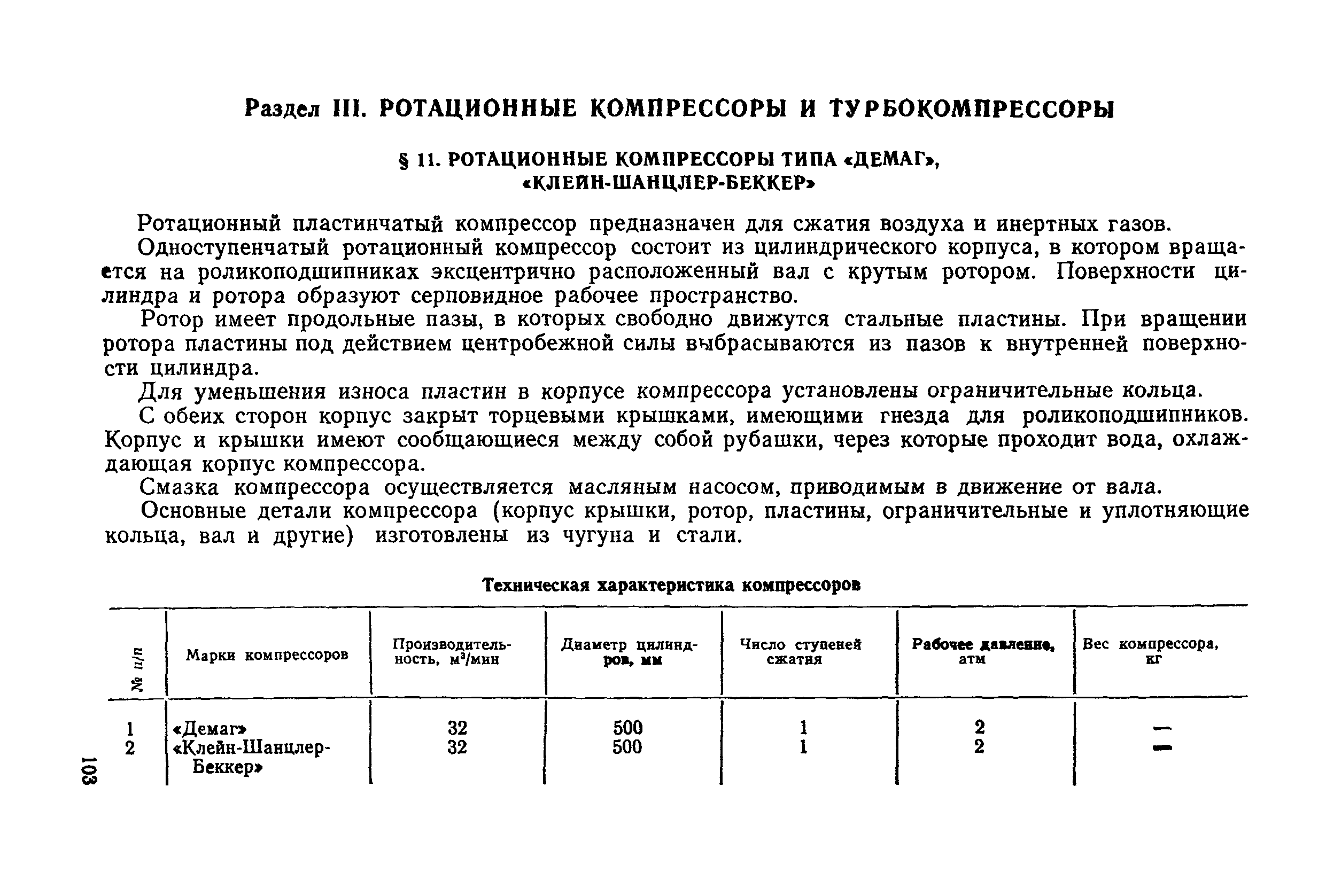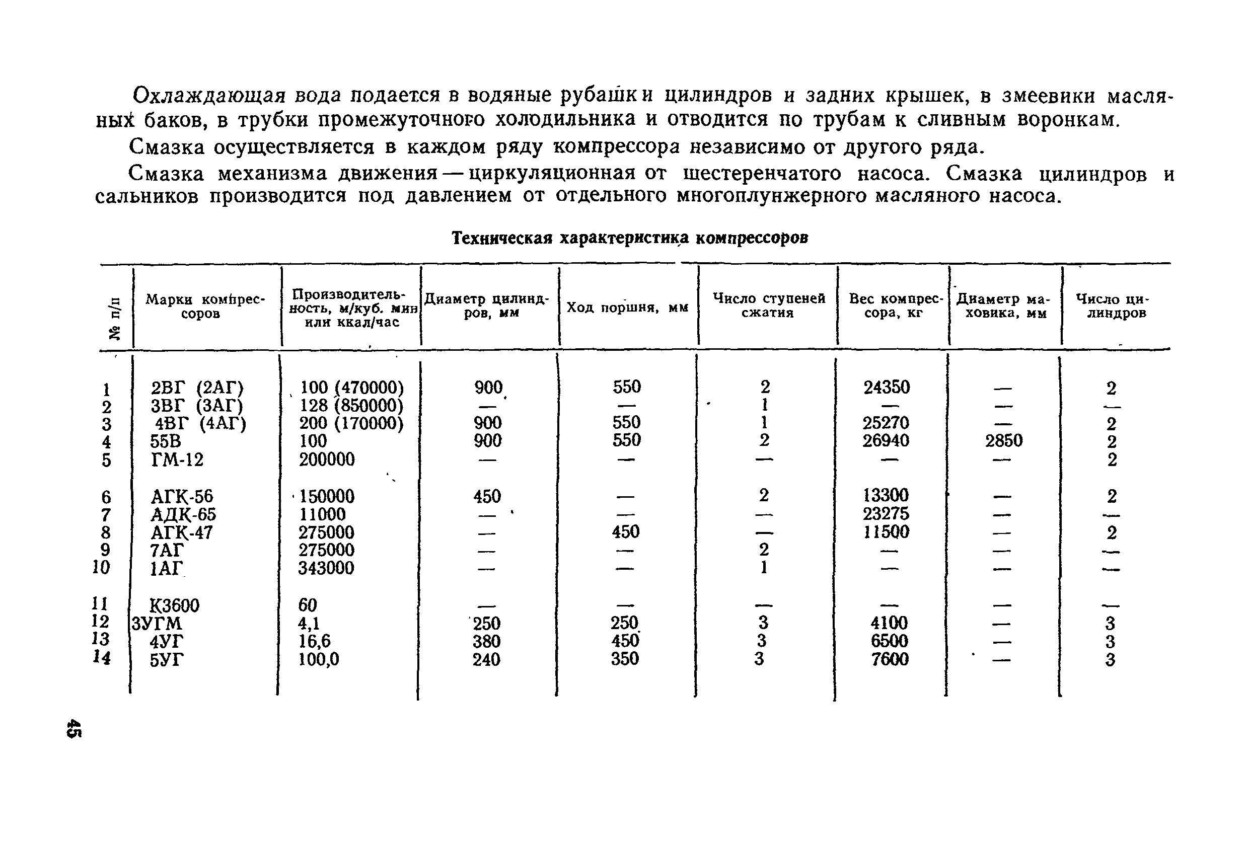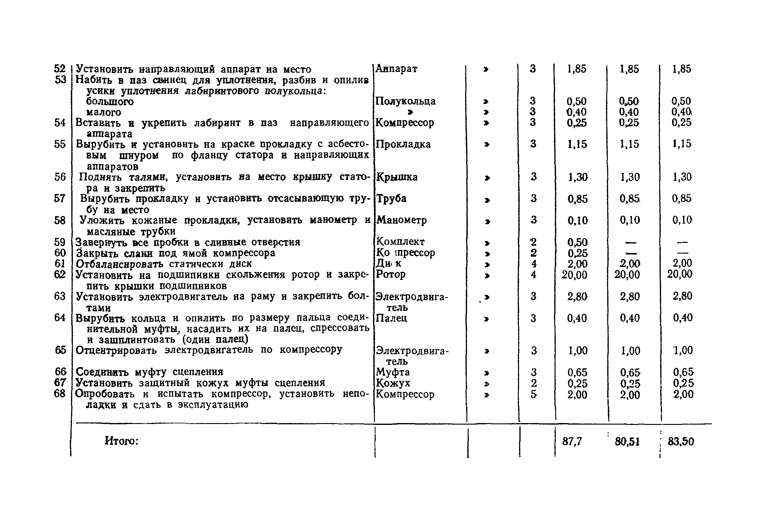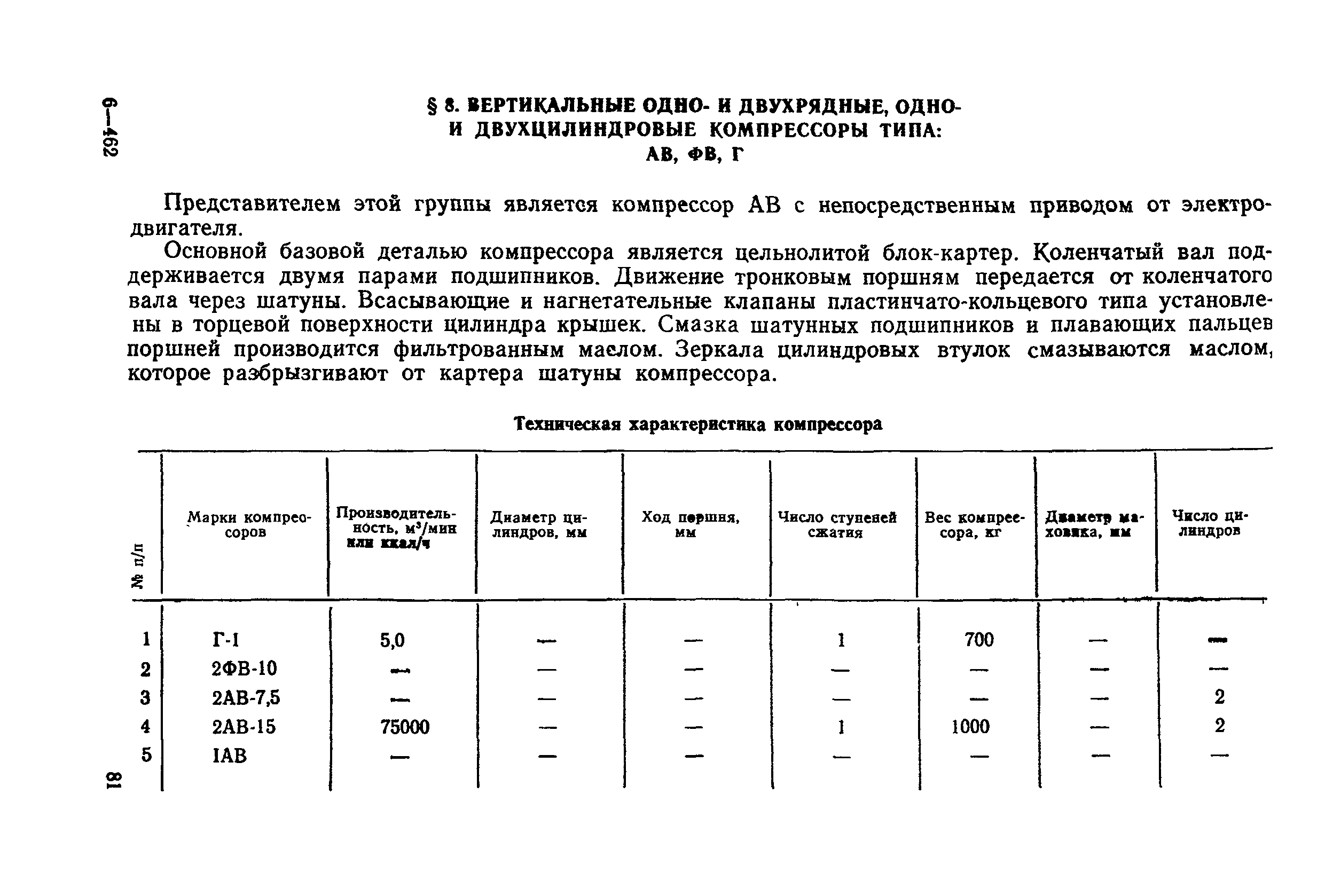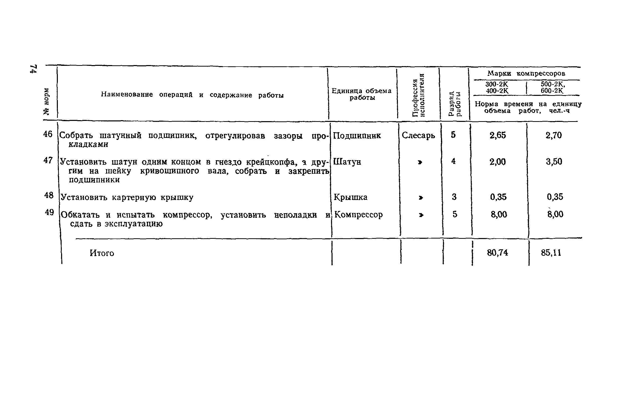 Типовые нормы времени на ремонт компрессоров (стационарных воздушных и газовых производительностью до 100 м3/мин)| Статус: | отменен в рф | | Название рус.: | Типовые нормы времени на ремонт компрессоров (стационарных воздушных и газовых производительностью до 100 м3/мин) | | Дата добавления в базу: | 01.09.2013 | | Дата актуализации: | 01.01.2021 | | Дата введения: | 25.06.2020 | | Область применения: | Сборник содержит нормы времени на разборку, сборку и ремонт компрессоров стационарных воздушных и газовых: крейцкопфных, бескрейцкопфных, ротационных и турбокомпрессоров. | | Оглавление: | Общая часть Организация труда Нормативная часть Раздел 1. Крейцкопфные компрессоры 1. Вертикальные двухрядные воздушные компрессоры типа ВГ, СГ, СА, В, ВБ, КГ 2. Угловые (прямоугольные) воздушные и газовые компрессоры типа: ВП и ГП 3. Вертикальные двухрядные воздушные компрессоры высокого давления типа Р. РК, РО, РВ, ЭК 4. Горизонтальные одно- и двухрядные воздушные компрессоры низкого давления типа В, ВГ, АГ, ГМ, АГК, АДК, ЗУГМ, 4УГ, 5УГ 5. Горизонтальные двухрядные газовые компрессоры типа 5Г, ДSV 6. Горизонтальные воздушные компрессоры низкого давления типа 300-2К, 400-2К, 500-2К, 600-2К Раздел II. Бескрейцкопфные компрессоры 7. Вертикальные, одно0 и двухрядные воздушные компрессоры типа В, ЦВ, ВК, КВ, ВКС, ВВК, C 8. Вертикальные одно- и двухрядные, одно- и двухцилиндровые компрессоры типа АВ, ФВ, Г 9. Вертикальные V- и W-образные воздушные компрессоры типа В, АУ, БАУ, ВУ, КС-3М, КСЭ-3М, К-5, КСЭ-5М 10. Вертикальные аммиачные компрессоры типа АВ-100, АУ-200, АУ-300, АУ-400, ДАУ-80, ДАУ-100 Раздел III. Ротационные компрессоры и турбокомпрессоры 11. Ротационные компрессоры типа "Демаг", "Клейн-Шандлер-Беккер" 12. Турбокомпрессоры типа ТГ-700/7, "ККК", ТР-7/3. "ЕГЕР", ТГ-4 | | Разработан: | НИИ труда Госкомтруда СССР ЦБНТ