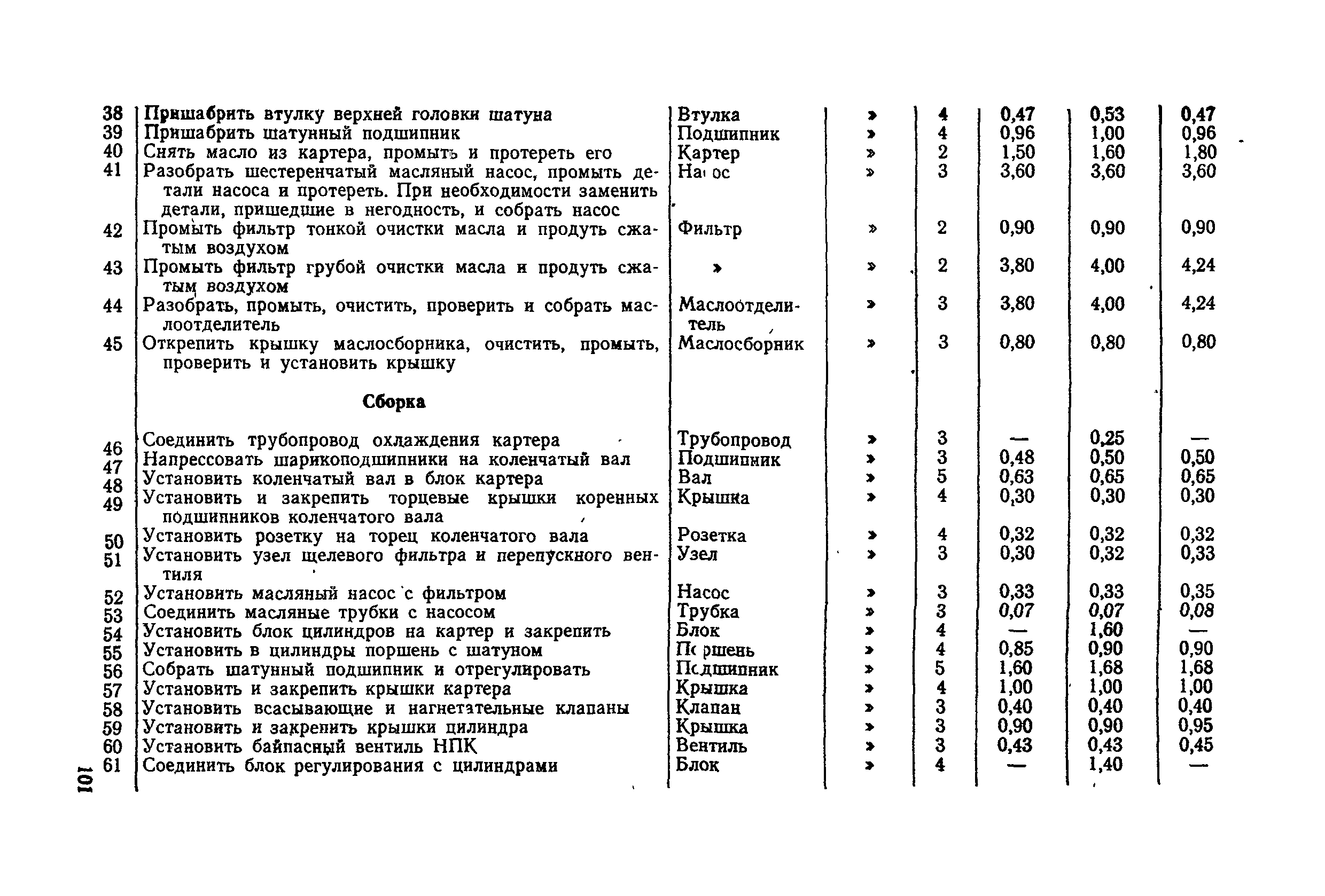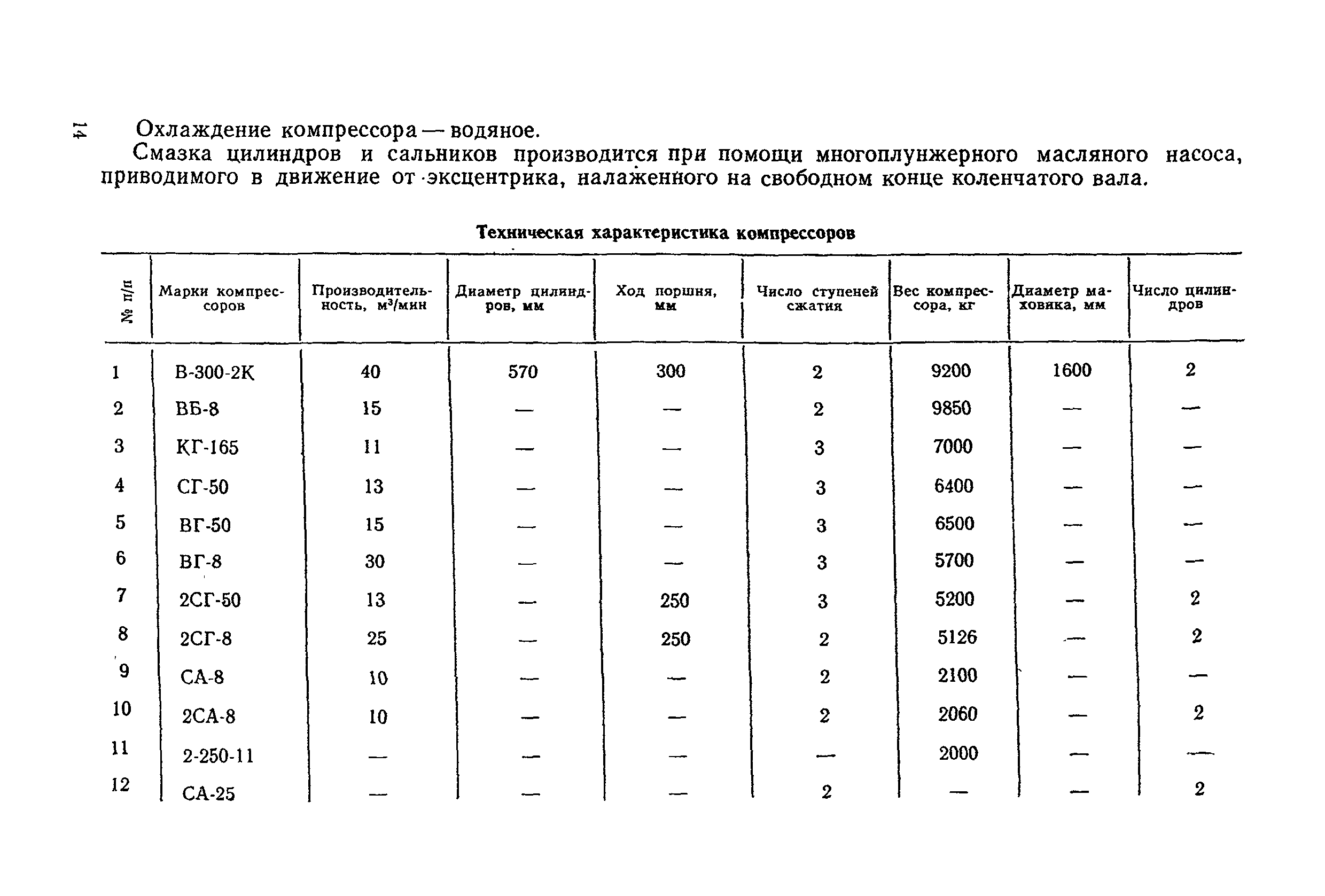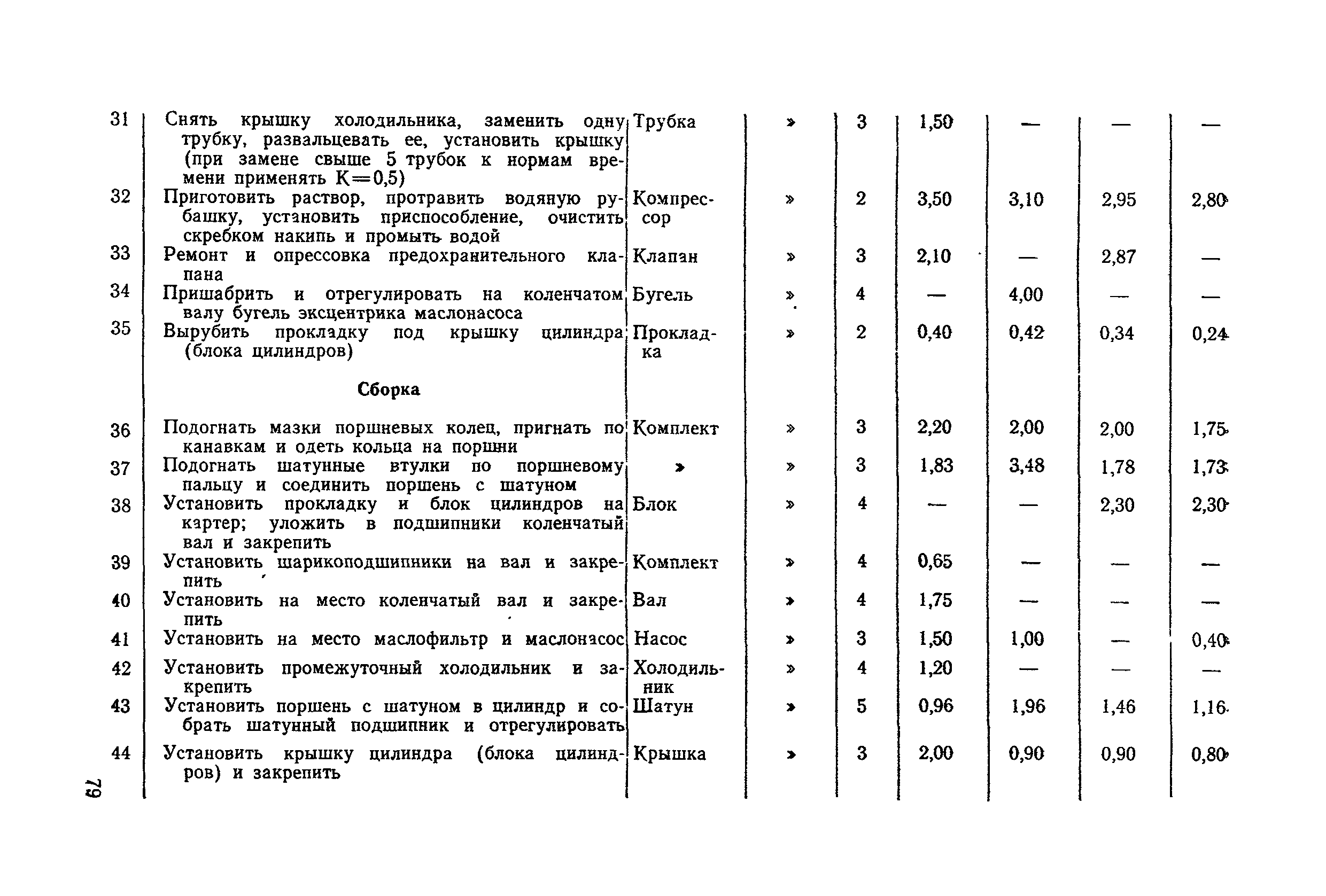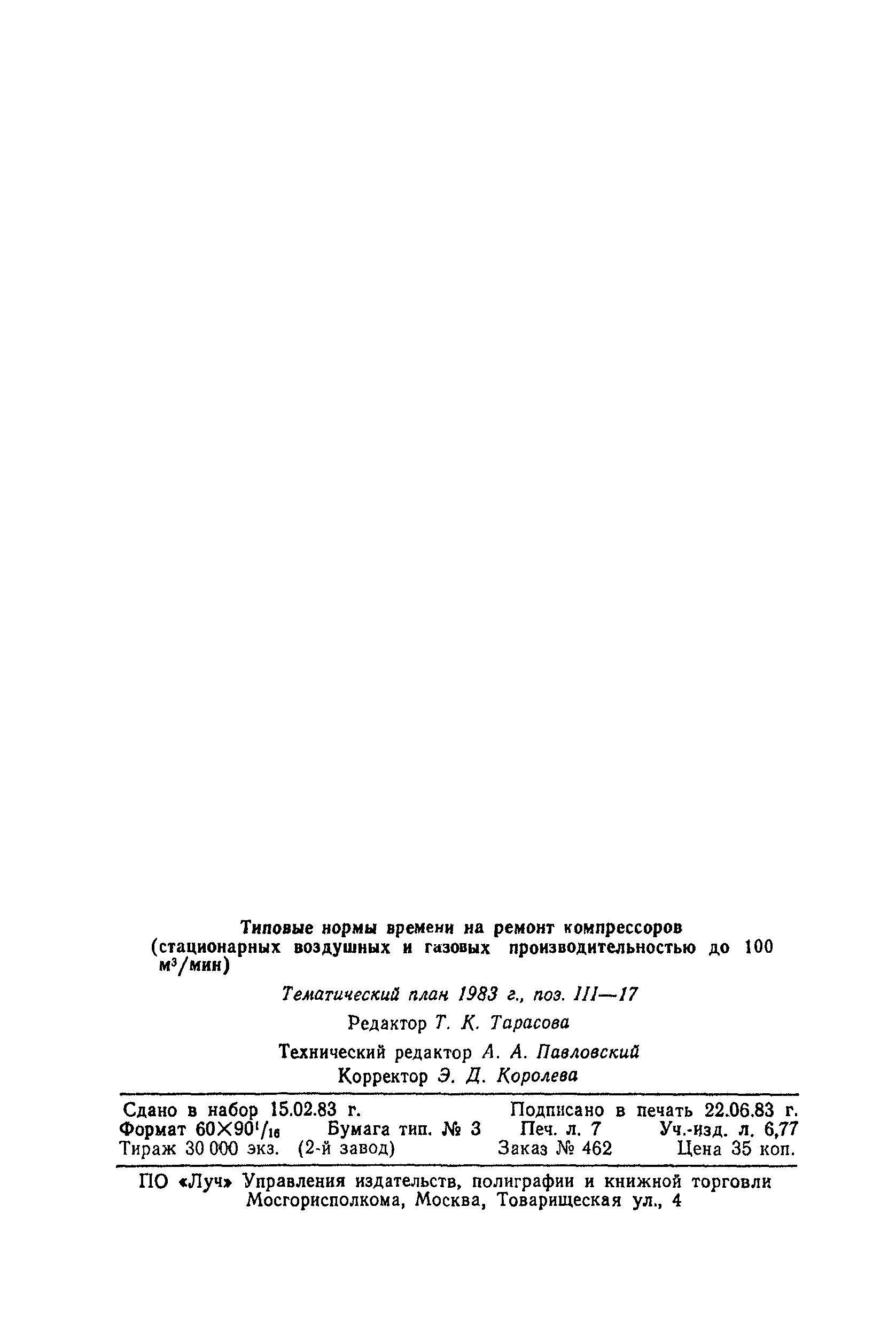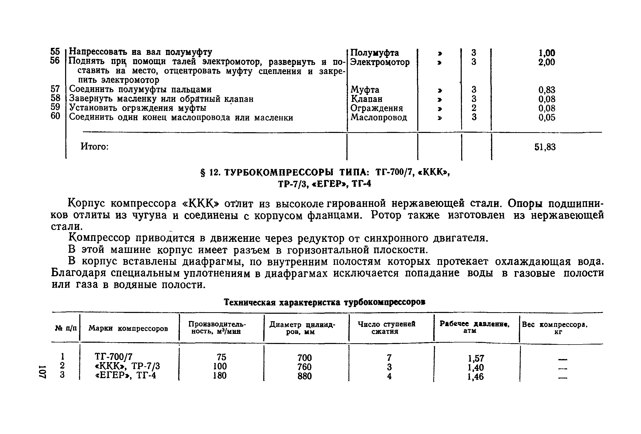 Типовые нормы времени на ремонт компрессоров (стационарных воздушных и газовых производительностью до 100 м3/мин)| Статус: | отменен в рф | | Название рус.: | Типовые нормы времени на ремонт компрессоров (стационарных воздушных и газовых производительностью до 100 м3/мин) | | Дата добавления в базу: | 01.09.2013 | | Дата актуализации: | 01.01.2021 | | Дата введения: | 25.06.2020 | | Область применения: | Сборник содержит нормы времени на разборку, сборку и ремонт компрессоров стационарных воздушных и газовых: крейцкопфных, бескрейцкопфных, ротационных и турбокомпрессоров. | | Оглавление: | Общая часть Организация труда Нормативная часть Раздел 1. Крейцкопфные компрессоры 1. Вертикальные двухрядные воздушные компрессоры типа ВГ, СГ, СА, В, ВБ, КГ 2. Угловые (прямоугольные) воздушные и газовые компрессоры типа: ВП и ГП 3. Вертикальные двухрядные воздушные компрессоры высокого давления типа Р. РК, РО, РВ, ЭК 4. Горизонтальные одно- и двухрядные воздушные компрессоры низкого давления типа В, ВГ, АГ, ГМ, АГК, АДК, ЗУГМ, 4УГ, 5УГ 5. Горизонтальные двухрядные газовые компрессоры типа 5Г, ДSV 6. Горизонтальные воздушные компрессоры низкого давления типа 300-2К, 400-2К, 500-2К, 600-2К Раздел II. Бескрейцкопфные компрессоры 7. Вертикальные, одно0 и двухрядные воздушные компрессоры типа В, ЦВ, ВК, КВ, ВКС, ВВК, C 8. Вертикальные одно- и двухрядные, одно- и двухцилиндровые компрессоры типа АВ, ФВ, Г 9. Вертикальные V- и W-образные воздушные компрессоры типа В, АУ, БАУ, ВУ, КС-3М, КСЭ-3М, К-5, КСЭ-5М 10. Вертикальные аммиачные компрессоры типа АВ-100, АУ-200, АУ-300, АУ-400, ДАУ-80, ДАУ-100 Раздел III. Ротационные компрессоры и турбокомпрессоры 11. Ротационные компрессоры типа "Демаг", "Клейн-Шандлер-Беккер" 12. Турбокомпрессоры типа ТГ-700/7, "ККК", ТР-7/3. "ЕГЕР", ТГ-4 | | Разработан: | НИИ труда Госкомтруда СССР ЦБНТ