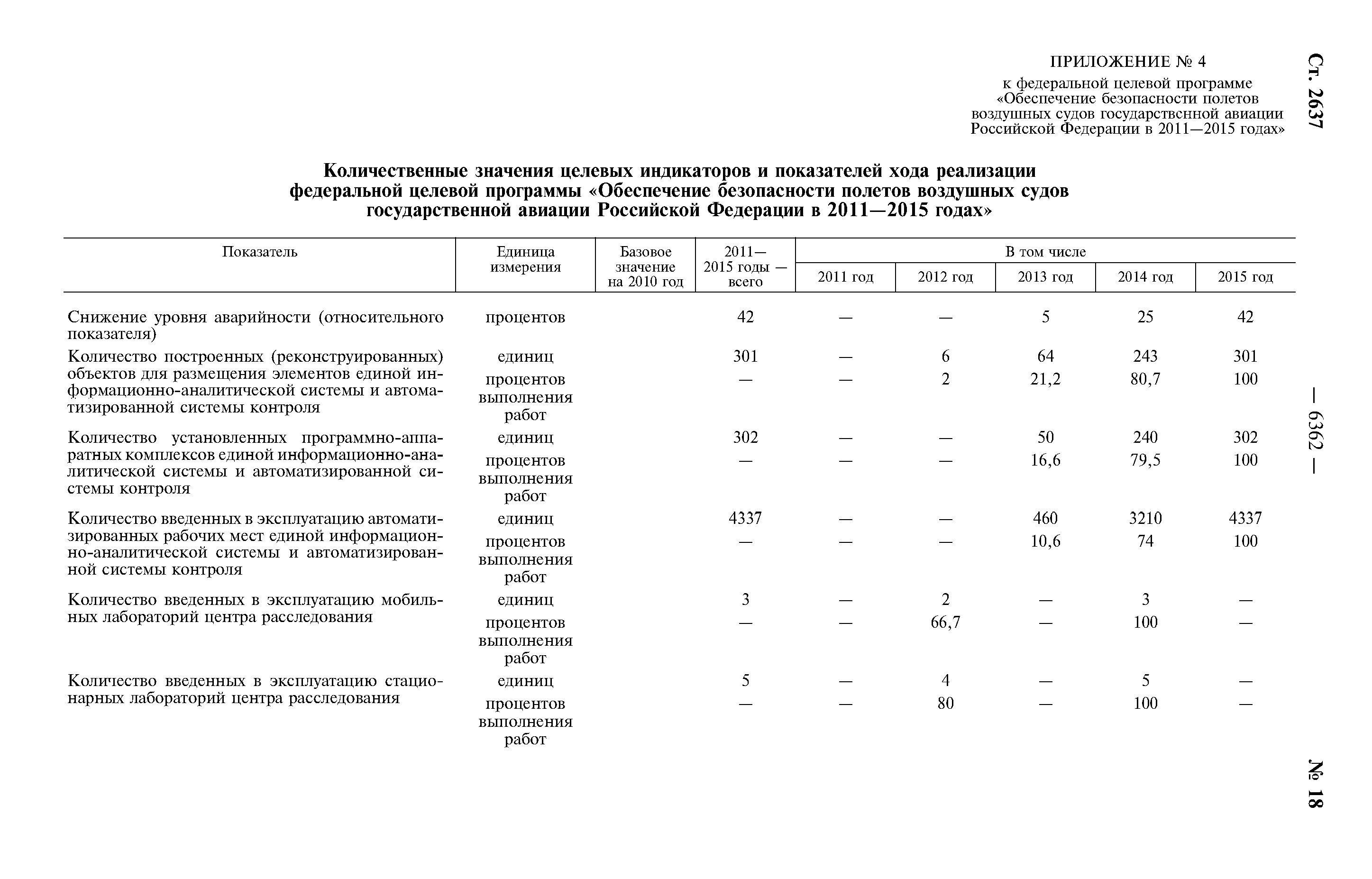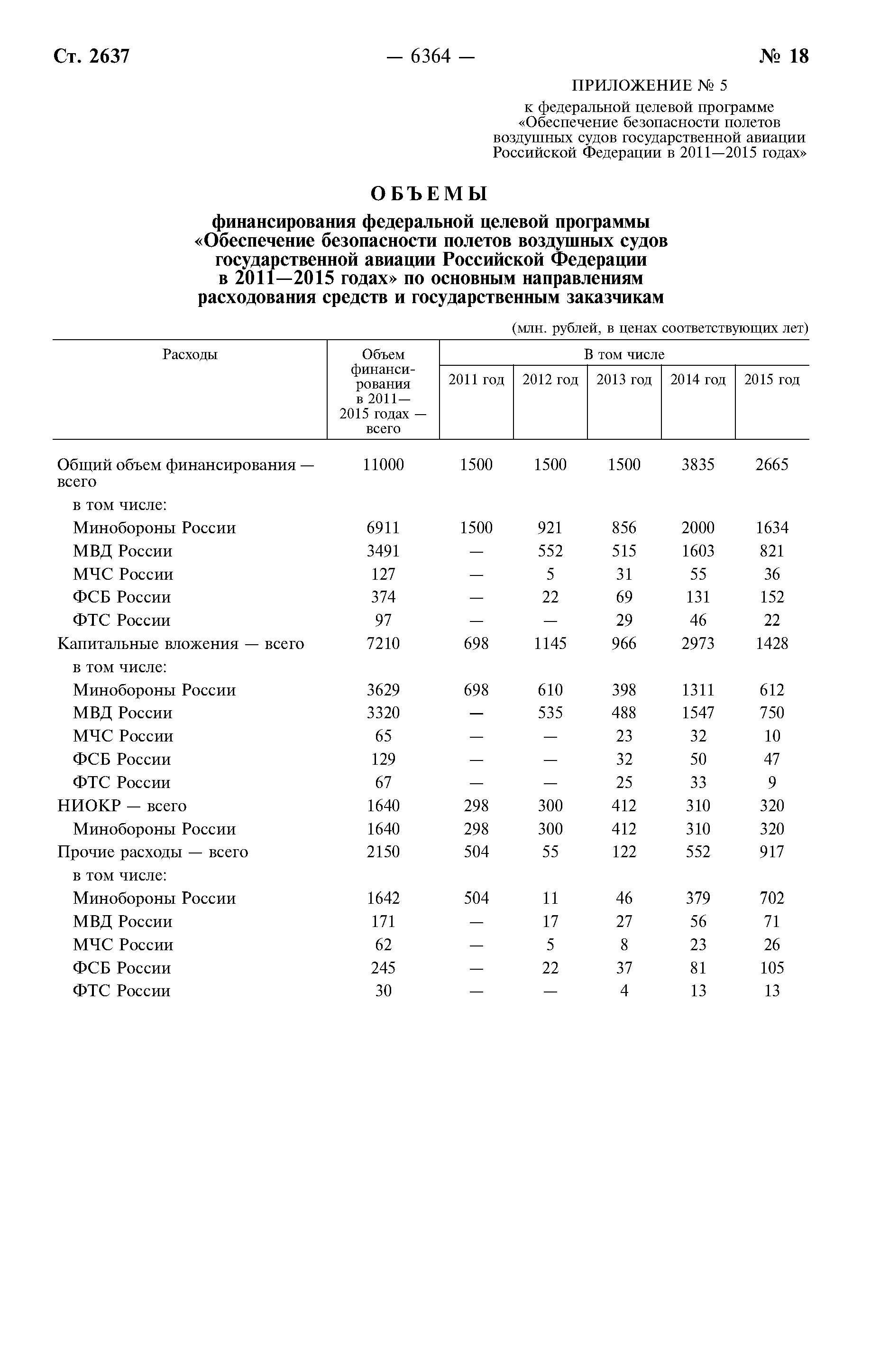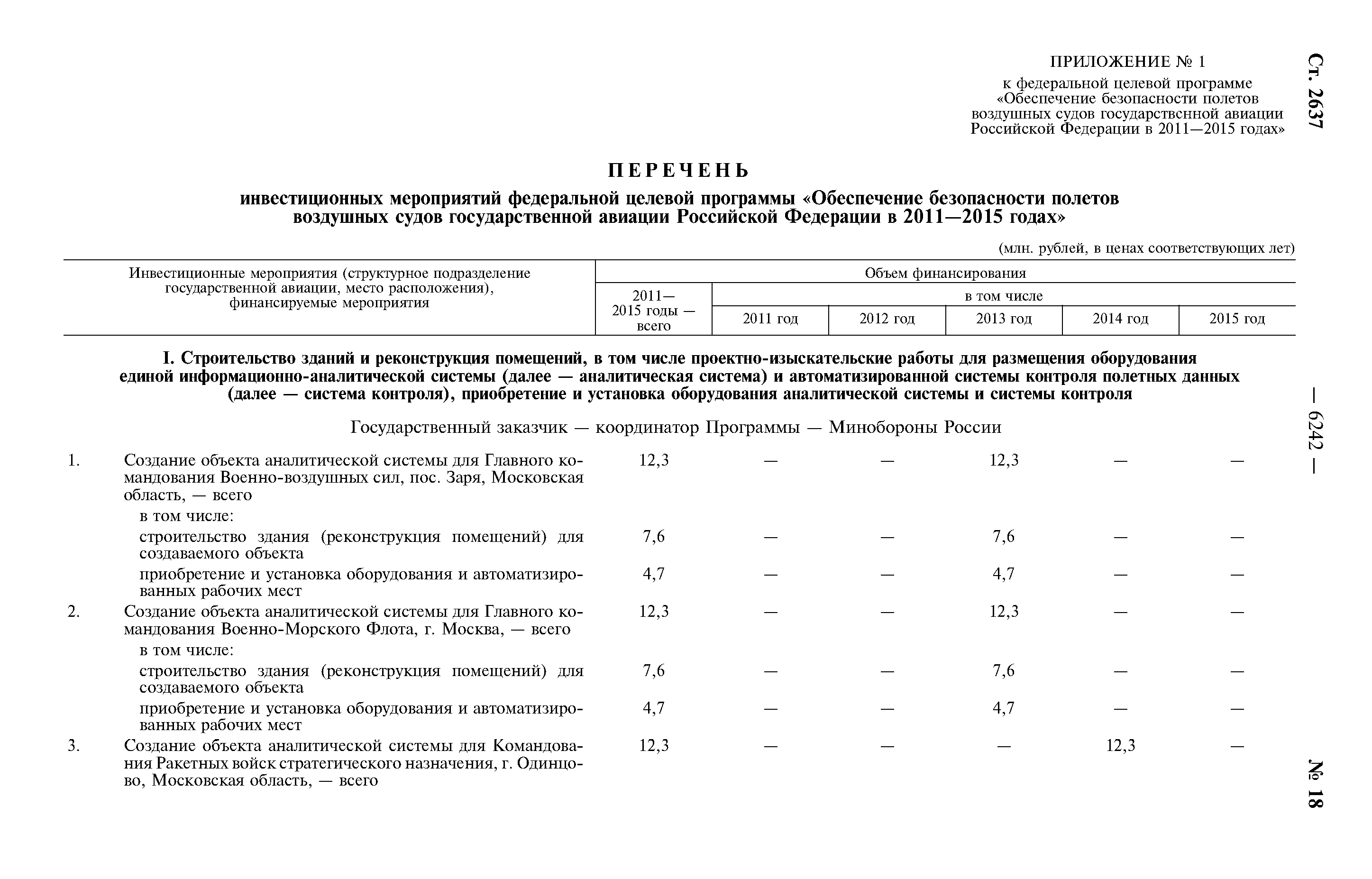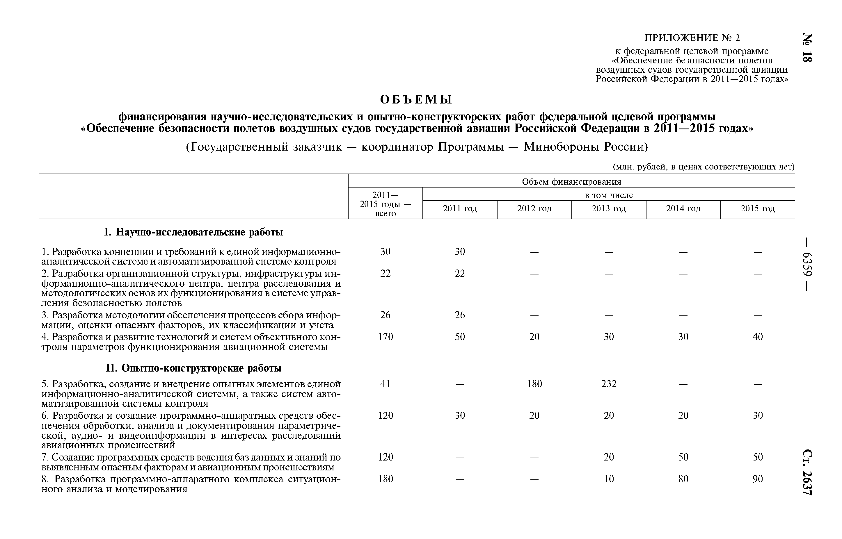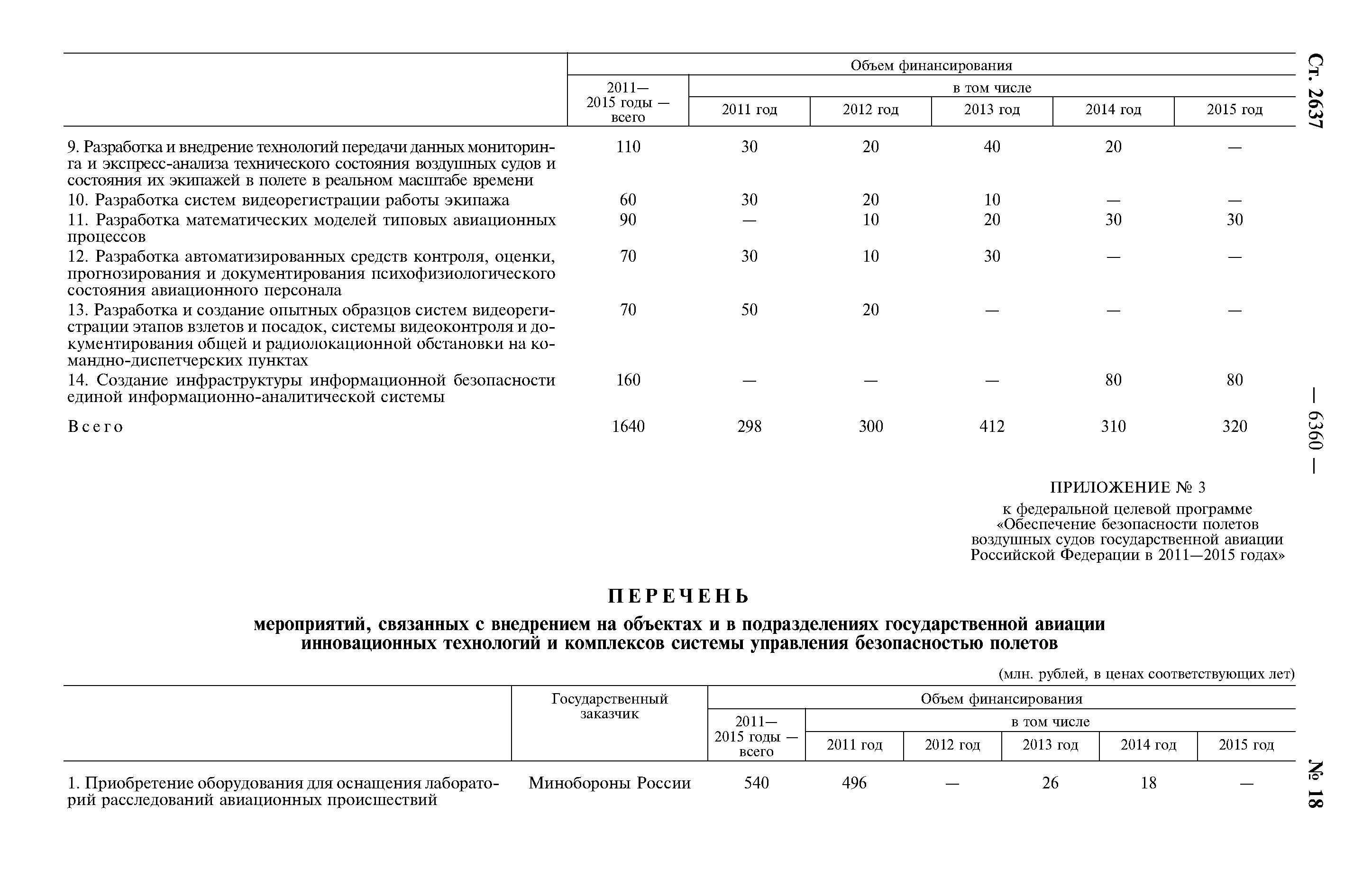 | Оглавление: | Паспорт федеральной целевой программы "Обеспечение безопасности полетов воздушных судов государственной авиации Российской Федерации в 2011- 2015 годах" I. Характеристика проблемы, на решение которой направлена Программа II. Основные цели и задачи Программы с указанием сроков и этапов ее реализации, а также целевых индикаторов и показателей III. Мероприятия Программы IV. Обоснование ресурсного обеспечения Программы V. Механизм реализации Программы, включающий в себя механизм управления Программой и механизм взаимодействия государственных заказчиков Программы VI. Оценка социально-экономической и экологической эффективности Программы Приложение N 1 Перечень инвестиционных мероприятий федеральной целевой программы "Обеспечение безопасности полетов воздушных судов государственной авиации Российской Федерации в 2011 - 2015 годах" Приложение N 2 Объемы финансирования научно-исследовательских и опытно-конструкторских работ федеральной целевой программы "Обеспечение безопасности полетов воздушных судов государственной авиации Российской Федерации в 2011 - 2015 годах" Приложение N 3 Перечень мероприятий, связанных с внедрением на объектах и в подразделениях государственной авиации инновационных технологий и комплексов системы управления безопасностью полетов Приложение N 4 Количественные значения целевых индикаторов и показателей хода реализации федеральной целевой программы "Обеспечение безопасности полетов воздушных судов государственной авиации Российской Федерации в 2011 - 2015 годах" Приложение N 5 Объемы финансирования федеральной целевой программы "Обеспечение безопасности полетов воздушных судов государственной авиации Российской Федерации в 2011 - 2015 годах" по основным направлениям расходования средств и государственным заказчикам |