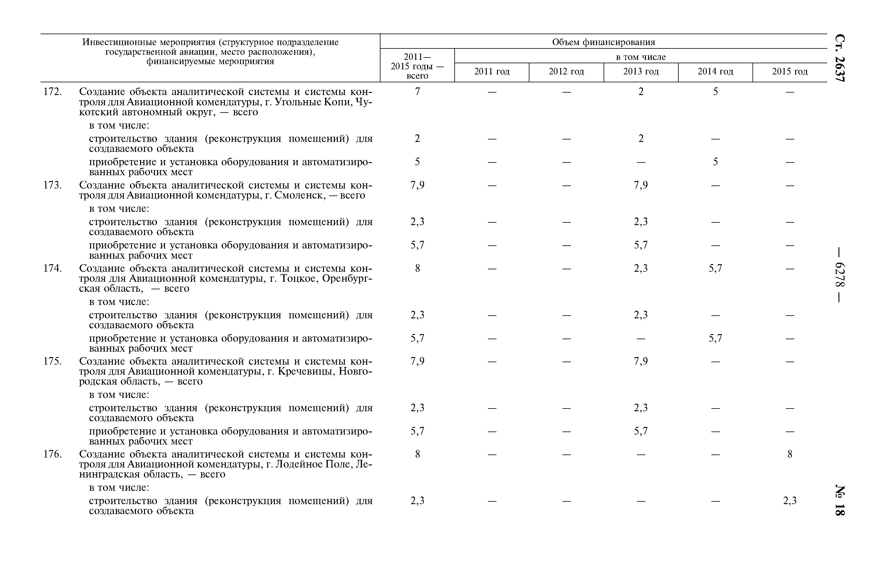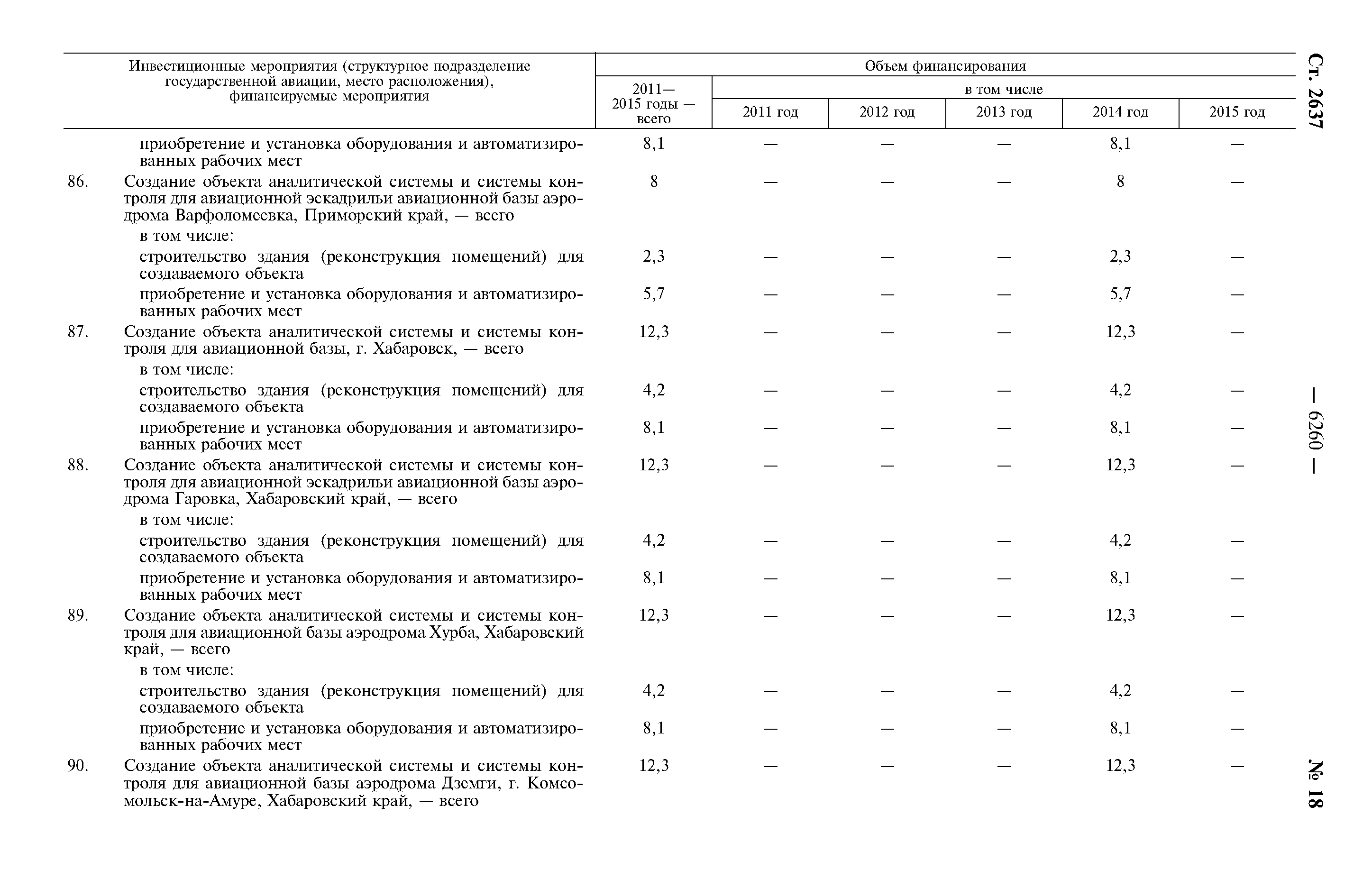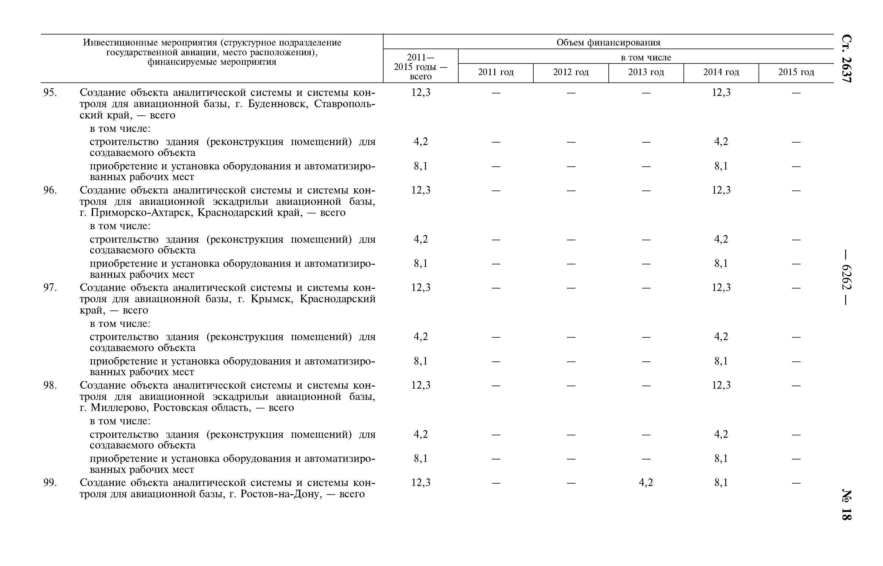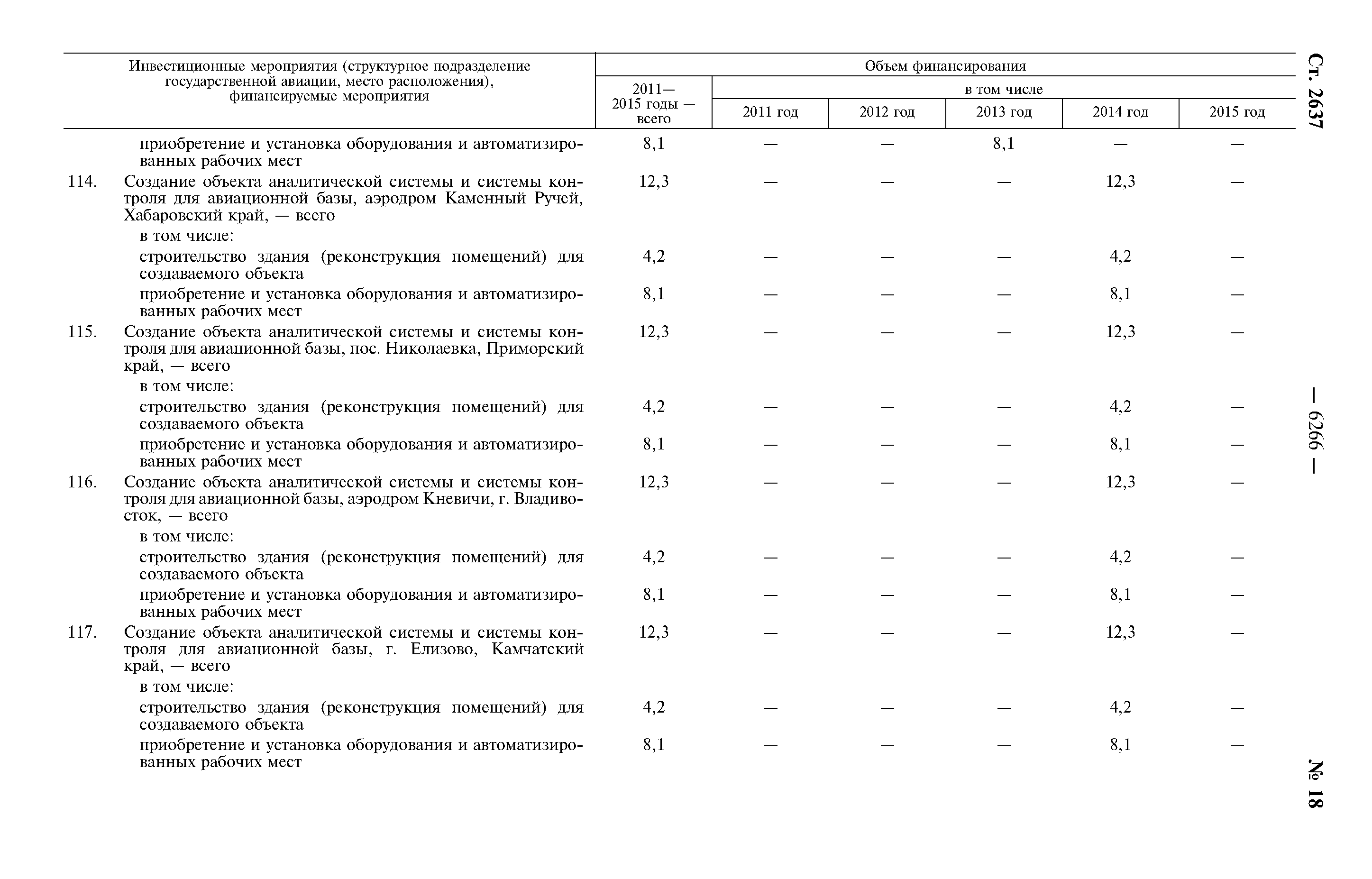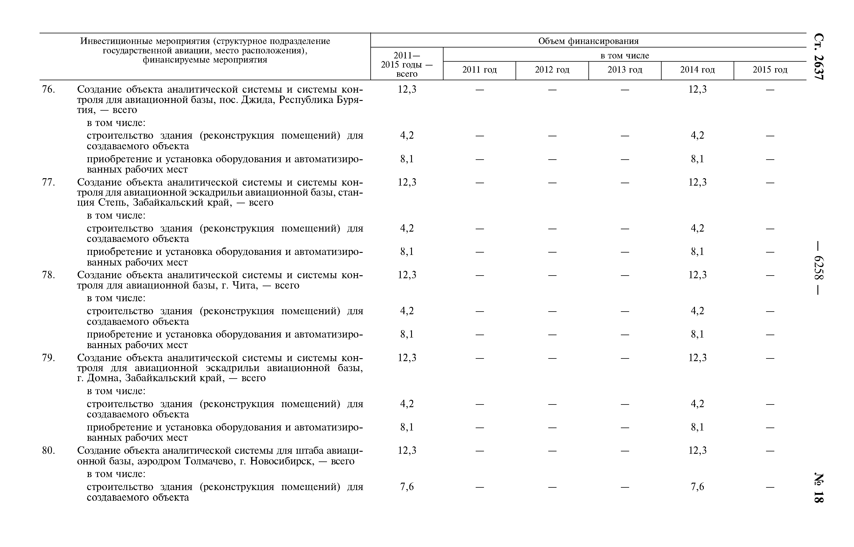| Оглавление: | Паспорт федеральной целевой программы "Обеспечение безопасности полетов воздушных судов государственной авиации Российской Федерации в 2011- 2015 годах" I. Характеристика проблемы, на решение которой направлена Программа II. Основные цели и задачи Программы с указанием сроков и этапов ее реализации, а также целевых индикаторов и показателей III. Мероприятия Программы IV. Обоснование ресурсного обеспечения Программы V. Механизм реализации Программы, включающий в себя механизм управления Программой и механизм взаимодействия государственных заказчиков Программы VI. Оценка социально-экономической и экологической эффективности Программы Приложение N 1 Перечень инвестиционных мероприятий федеральной целевой программы "Обеспечение безопасности полетов воздушных судов государственной авиации Российской Федерации в 2011 - 2015 годах" Приложение N 2 Объемы финансирования научно-исследовательских и опытно-конструкторских работ федеральной целевой программы "Обеспечение безопасности полетов воздушных судов государственной авиации Российской Федерации в 2011 - 2015 годах" Приложение N 3 Перечень мероприятий, связанных с внедрением на объектах и в подразделениях государственной авиации инновационных технологий и комплексов системы управления безопасностью полетов Приложение N 4 Количественные значения целевых индикаторов и показателей хода реализации федеральной целевой программы "Обеспечение безопасности полетов воздушных судов государственной авиации Российской Федерации в 2011 - 2015 годах" Приложение N 5 Объемы финансирования федеральной целевой программы "Обеспечение безопасности полетов воздушных судов государственной авиации Российской Федерации в 2011 - 2015 годах" по основным направлениям расходования средств и государственным заказчикам |