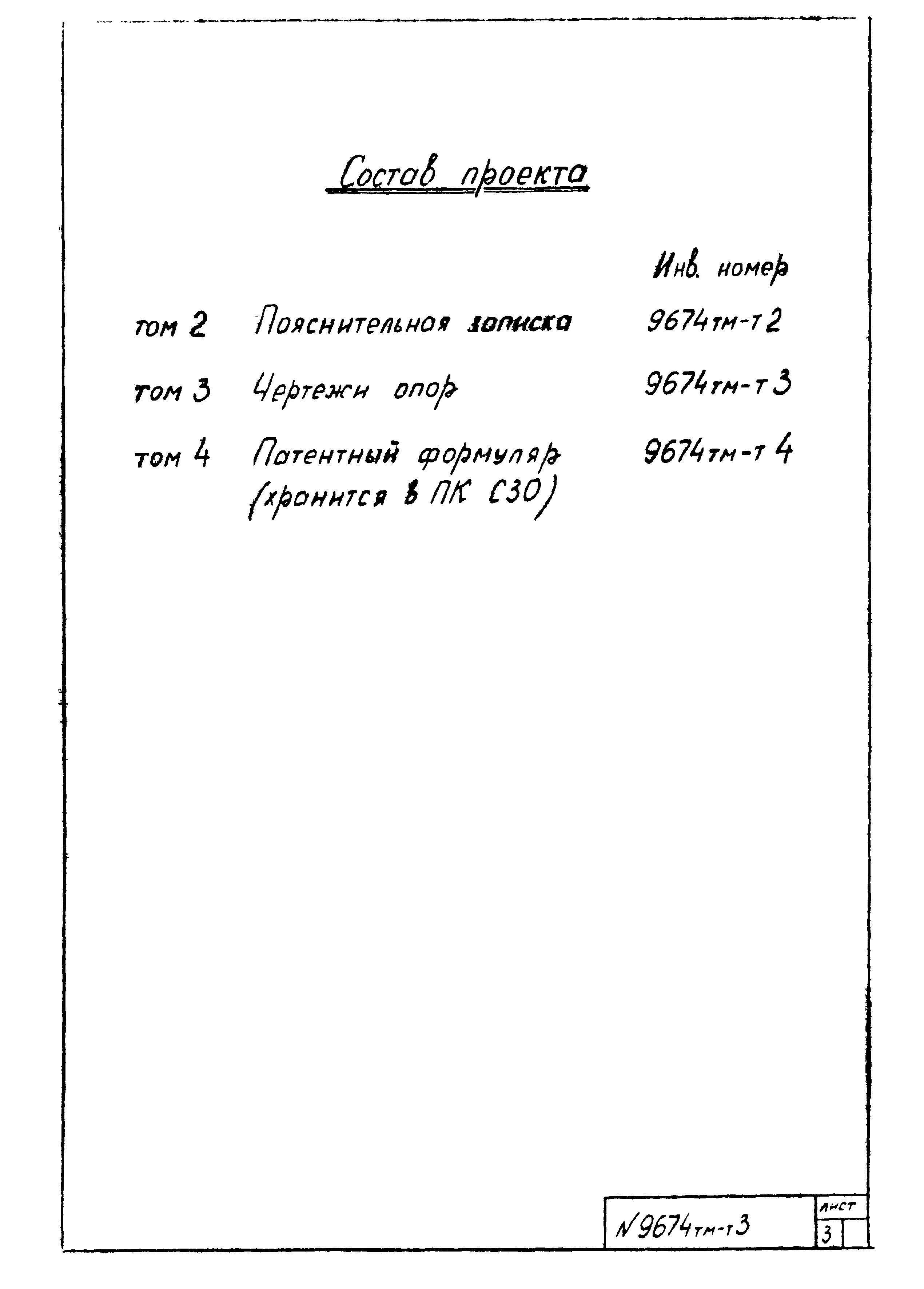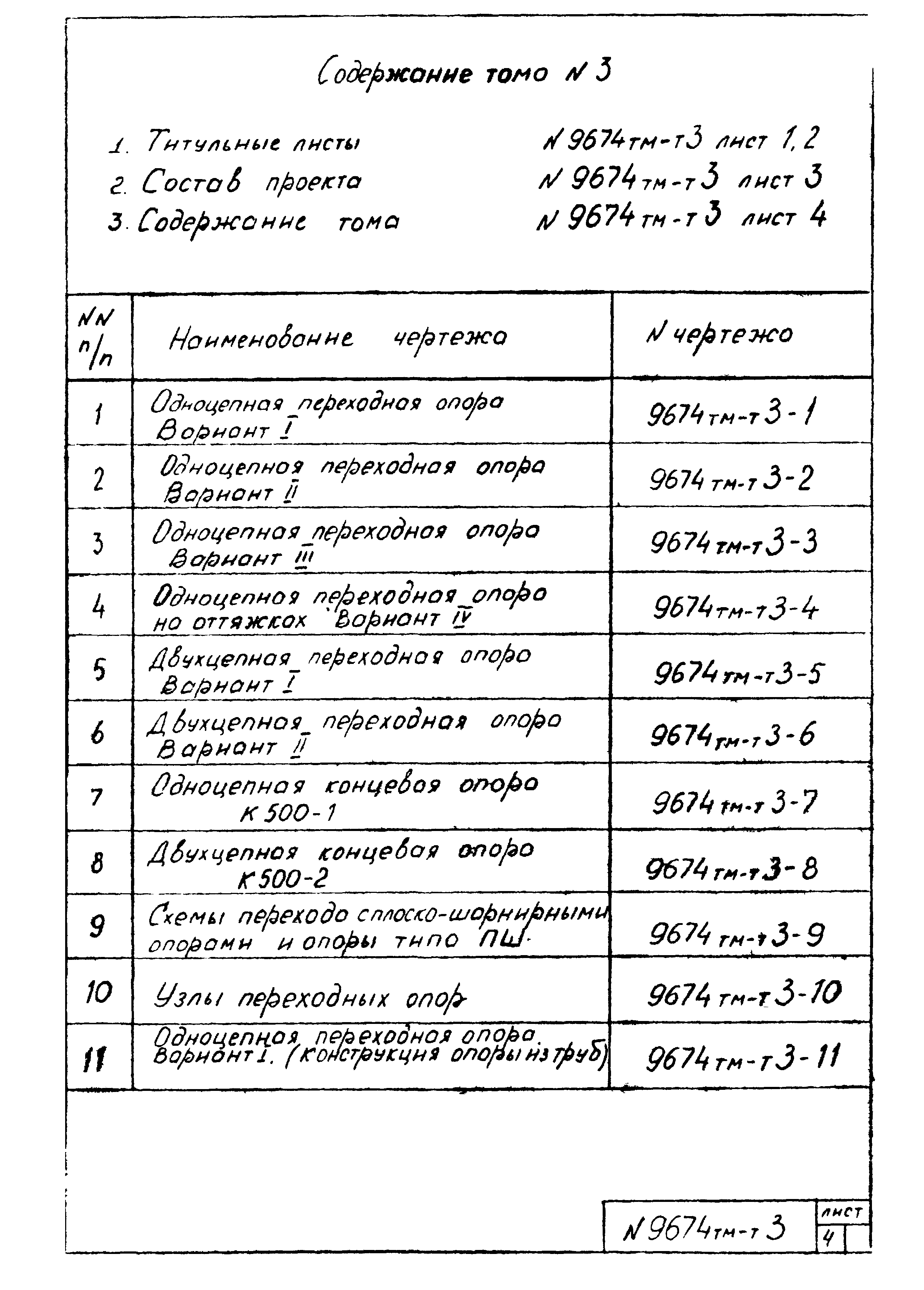 | Оглавление: | 9674ТМ-Т3-1 Одноцепная переходная опора. Вариант 1 9674ТМ-Т3-2 Одноцепная переходная опора. Вариант 2 9674ТМ-Т3-3 Одноцепная переходная опора. Вариант 3 9674ТМ-Т3-4 Одноцепная переходная опора. Вариант 4 9674ТМ-Т3-5 Двухцепная переходная опора. Вариант 1 9674ТМ-Т3-6 Двухцепная переходная опора. Вариант 2 9674ТМ-Т3-7 Одноцепная концевая опора К500-1 9674ТМ-Т3-8 Двухцепная концевая опора К500-2 9674ТМ-Т3-9 Схемы перехода с плоско-шарнирными опорами и опоры типа ПШ 9674ТМ-Т3-10 Узлы переходных опор 9674ТМ-Т3-11 Одноцепная переходная опора. Вариант 1 (конструкция опоры из труб) |