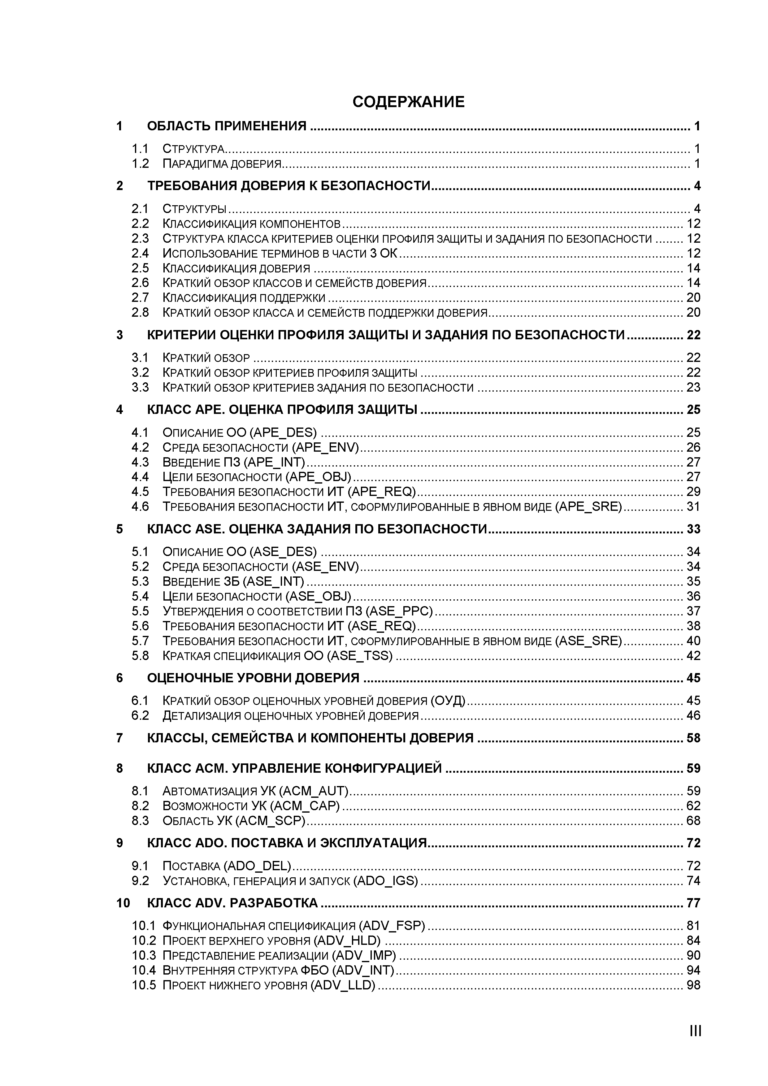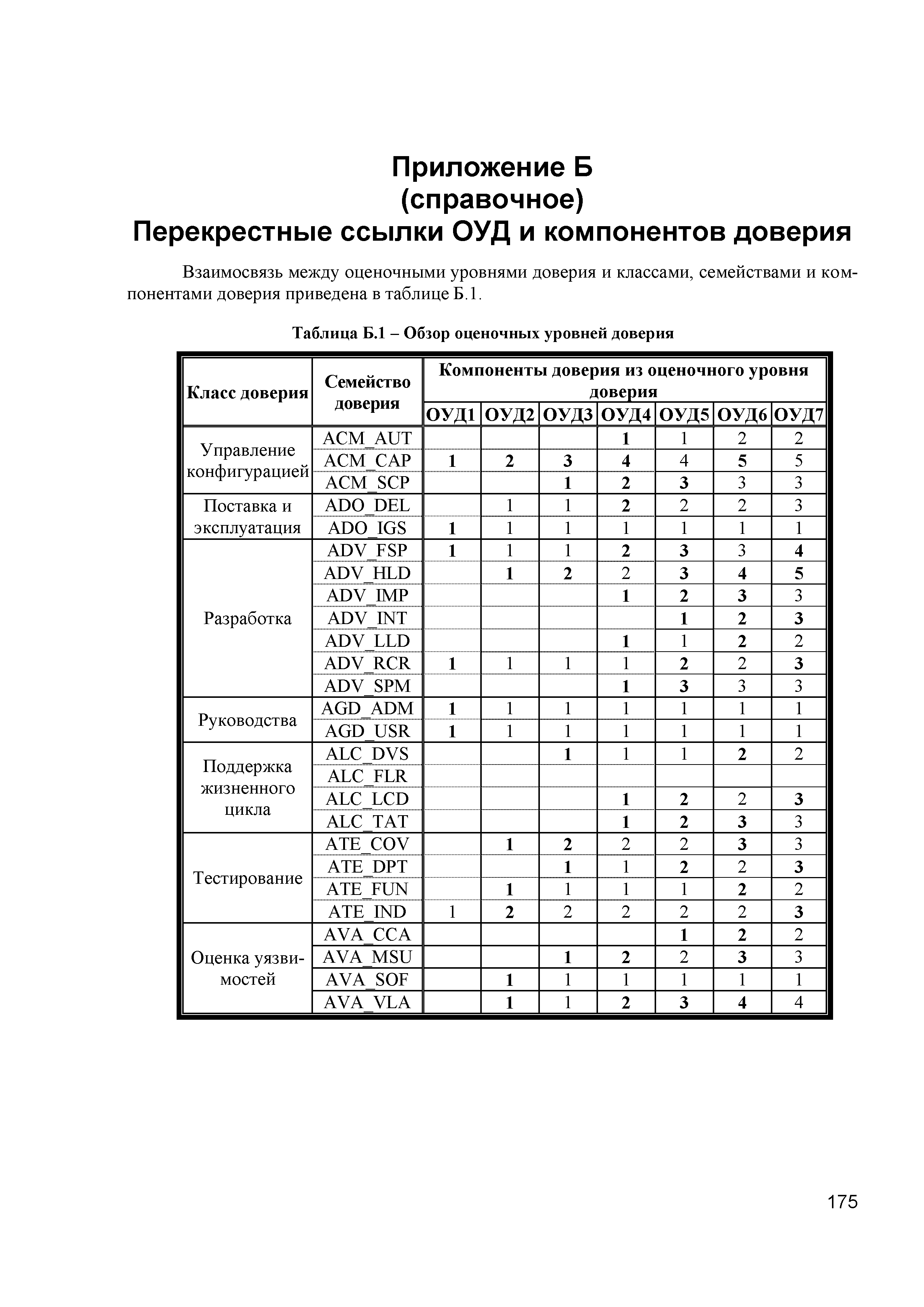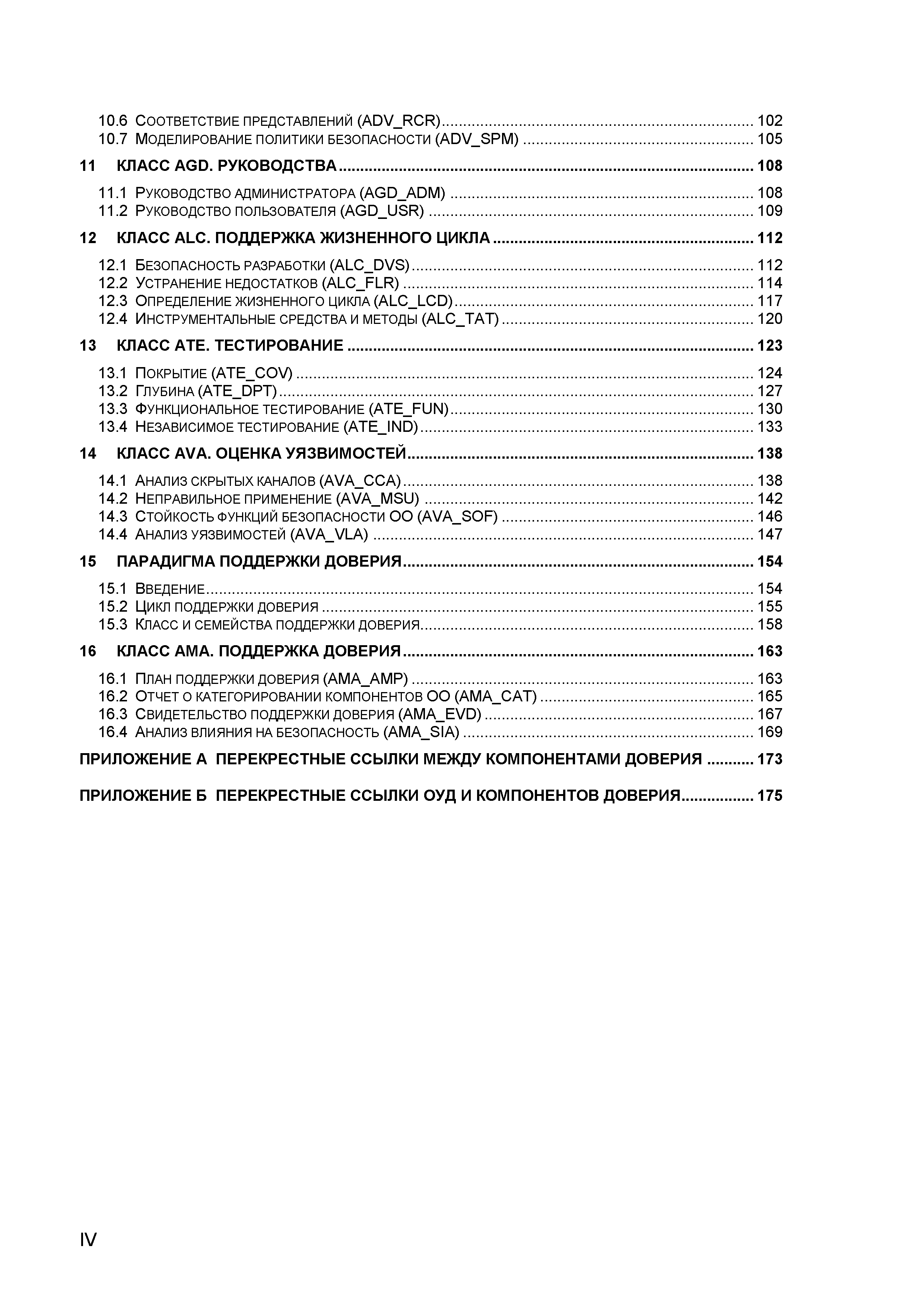 | Оглавление: | 1 Область применения 2 Требования доверия к безопасности 3 Критерии оценки профиля защиты и задания по безопасности 4 Класс АРЕ. Оценка профиля защиты 5 Класс ASE. Оценка задания по безопасности 6 Оценочные уровни доверия 7 Классы, семейства и компоненты доверия 8 Класс АСМ. Управление конфигурацией 9 Класс ADO. Поставка и эксплуатация 10 Класс ADV. Разработка 11 Класс AGD. Руководства 12 Класс ALC. Поддержка жизненного цикла 13 Класс ATE. Тестирование 14 Класс AVA. Оценка уязвимостей 15 Парадигма поддержки доверия 16 Класс AMA. Поддержка доверия Приложение А. Перекрестные ссылки между компонентами доверия Приложение Б. Перекрестные ссылки ОУД и компонентов доверия |