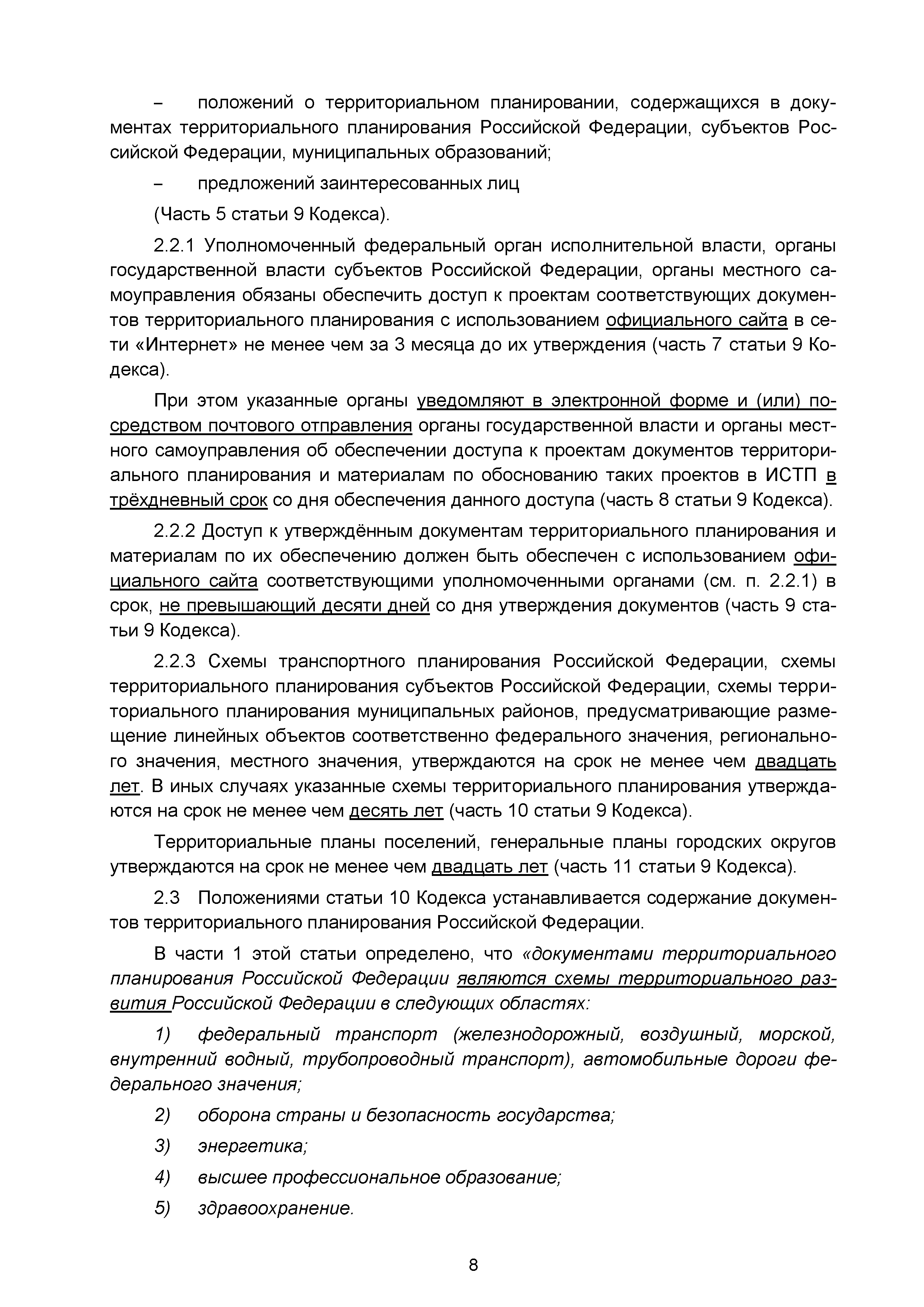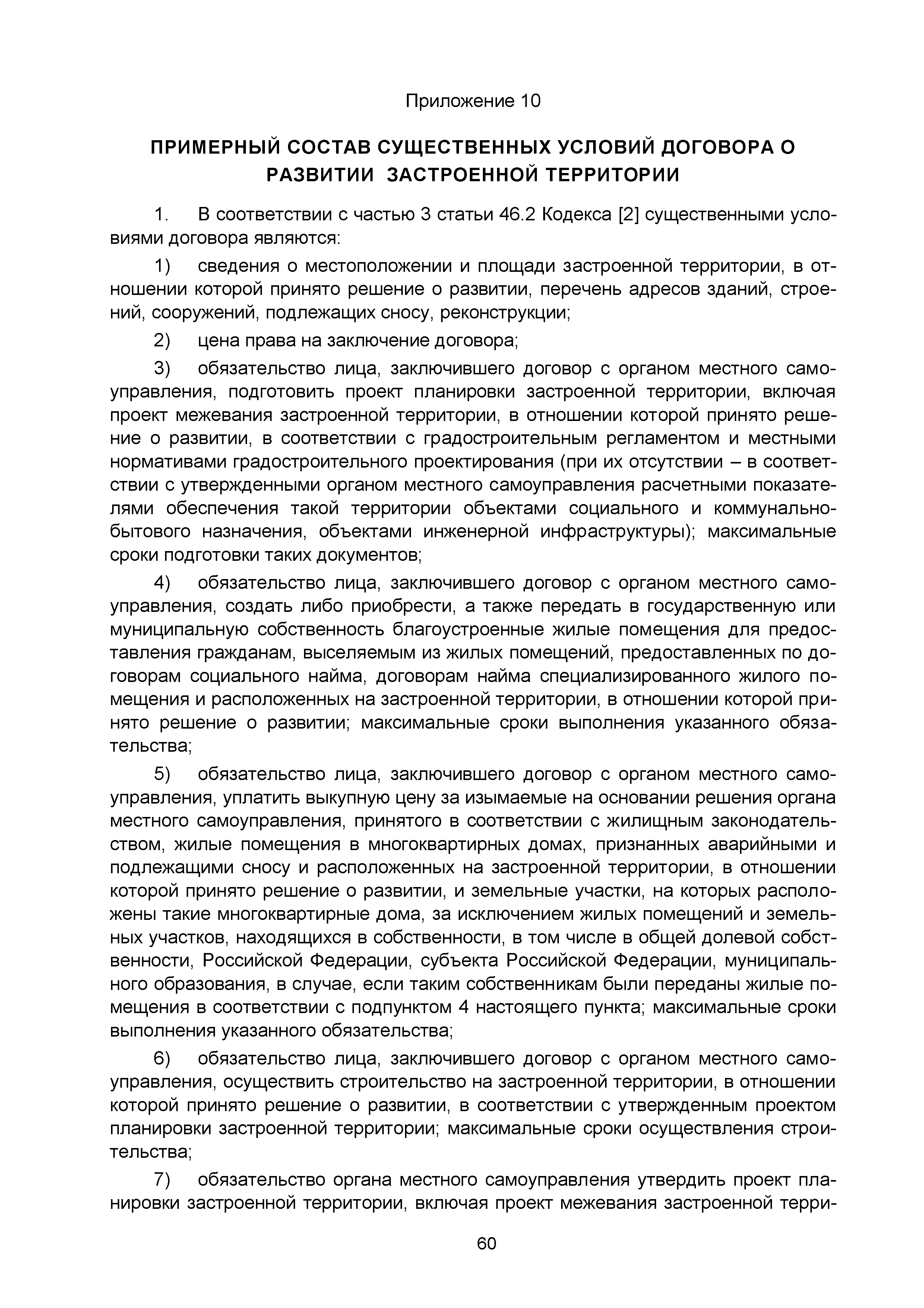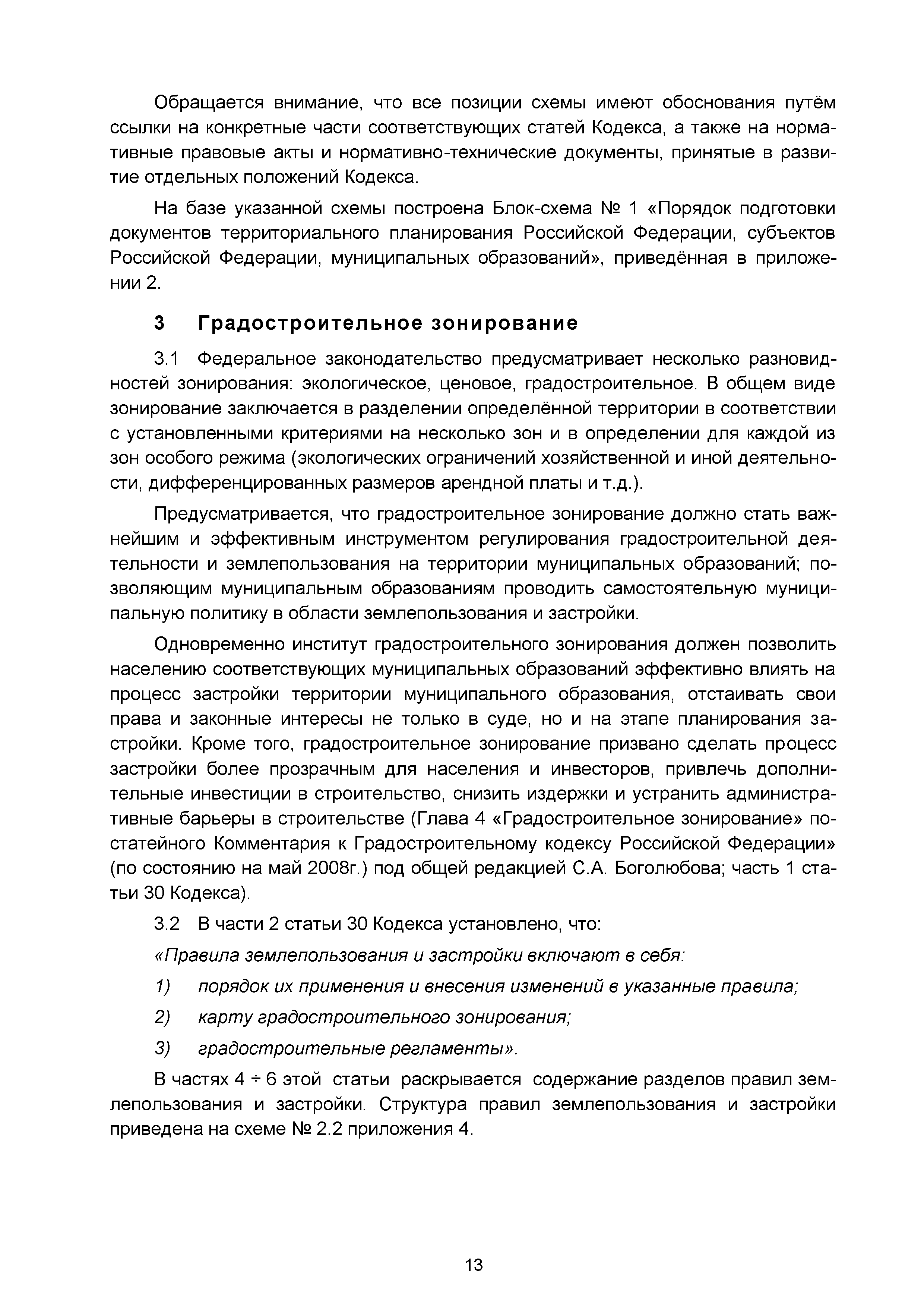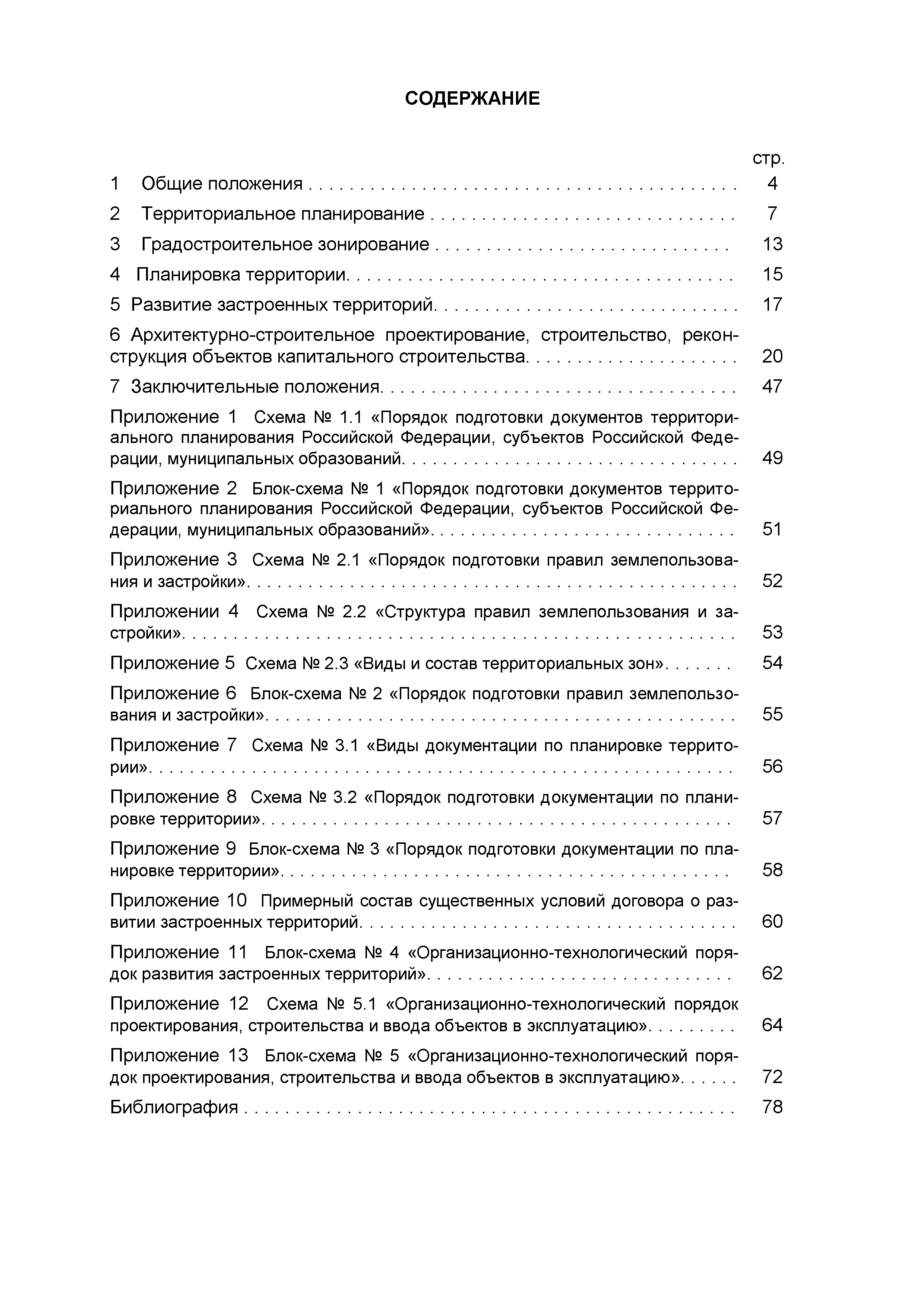 | Оглавление: | 1 Общие положения 2 Территориальное планирование 3 Градостроительное зонирование 4 Планировка территории 5 Развитие застроенных территорий 6 Архитектурно-строительное проектирование, строительство, реконструкция объектов капитального строительства 7 Заключительные положения Приложение 1. Схема № 1.1 «Порядок подготовки документов территориального планирования Российской Федерации, субъектов Российской Федерации, муниципальных образований Приложение 2. Блок-схема № 1 «Порядок подготовки документов территориального планирования Российской Федерации, субъектов Российской Федерации, муниципальных образований» Приложение 3. Схема № 2.1 «Порядок подготовки правил землепользования и застройки» Приложении 4. Схема № 2.2 «Структура правил землепользования и застройки» Приложение 5. Схема № 2.3 «Виды и состав территориальных зон» Приложение 6. Блок-схема № 2 «Порядок подготовки правил землепользования и застройки» Приложение 7. Схема № 3.1 «Виды документации по планировке территории» Приложение 8. Схема № 3.2 «Порядок подготовки документации по планировке территории» Приложение 9. Блок-схема № 3 «Порядок подготовки документации по планировке территории» Приложение 10. Примерный состав существенных условий договора о развитии застроенных территорий Приложение 11. Блок-схема № 4 «Организационно-технологический порядок развития застроенных территорий» Приложение 12. Схема № 5.1 «Организационно-технологический порядок проектирования, строительства и ввода объектов в эксплуатацию» Приложение 13. Блок-схема № 5 «Организационно-технологический порядок проектирования, строительства и ввода объектов в эксплуатацию» Библиография |