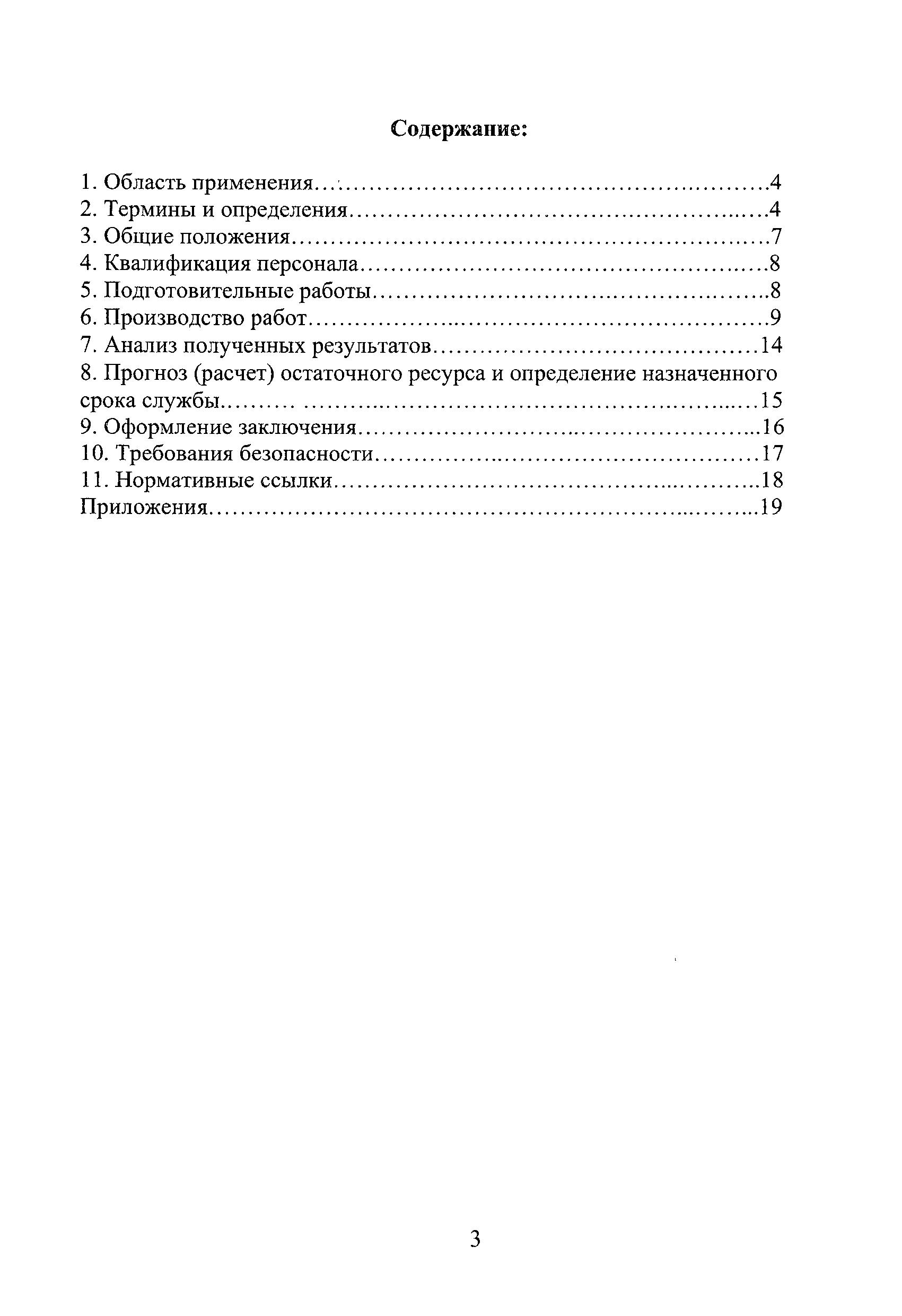 | Оглавление: | 1 Область применения 2 Термины и определения 3 Общие положения 4 Квалификация персонала 5 Подготовительные работы 6 Производство работ 7 Анализ полученных результатов 8 Прогноз (расчет) остаточного ресурса и определение назначенного срока службы 9 Оформление заключения 10 Требования безопасности 11 Нормативные ссылки Приложения |
